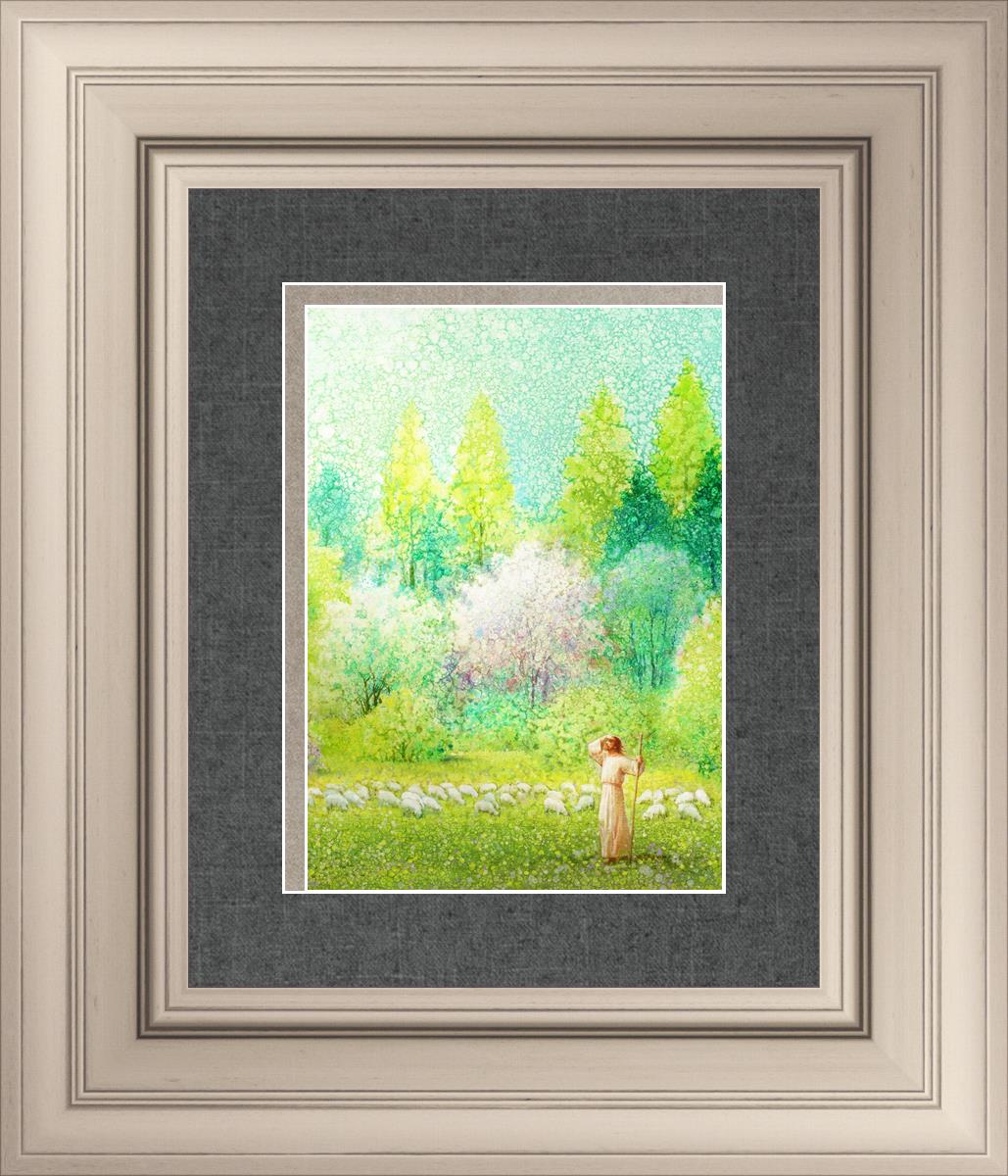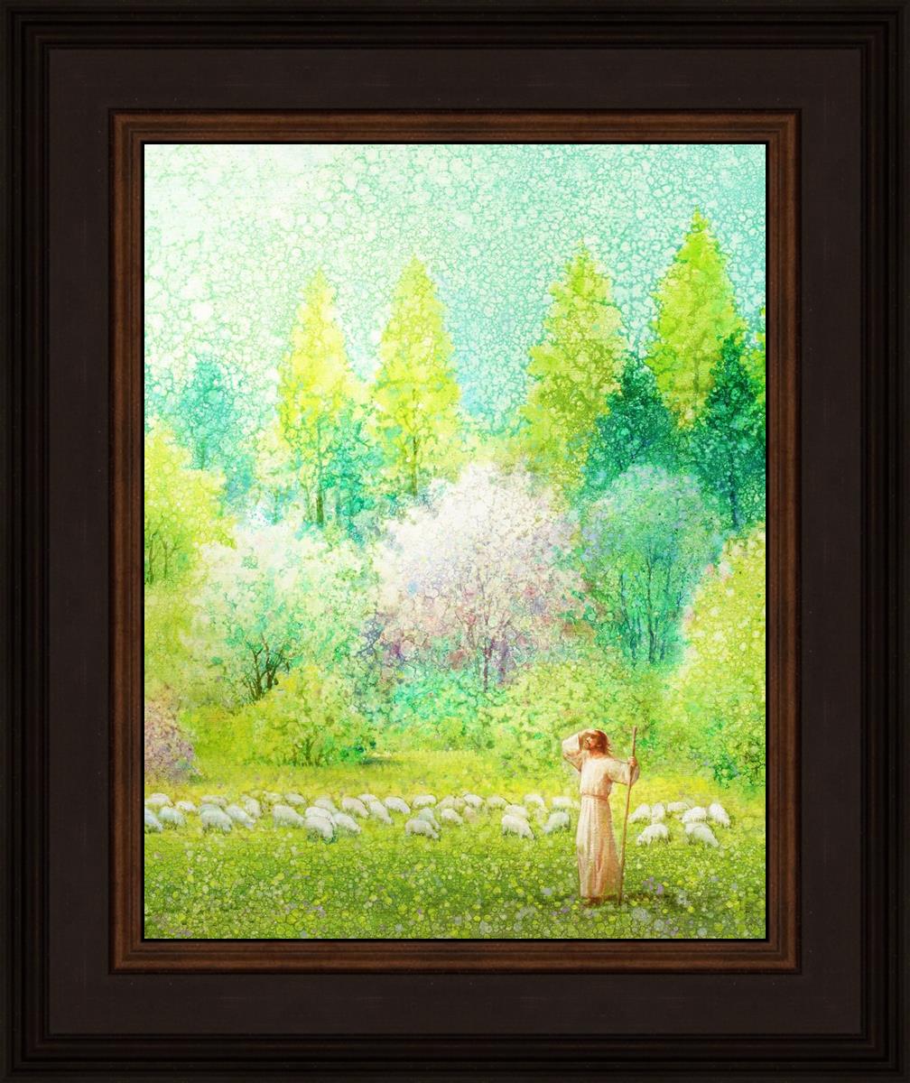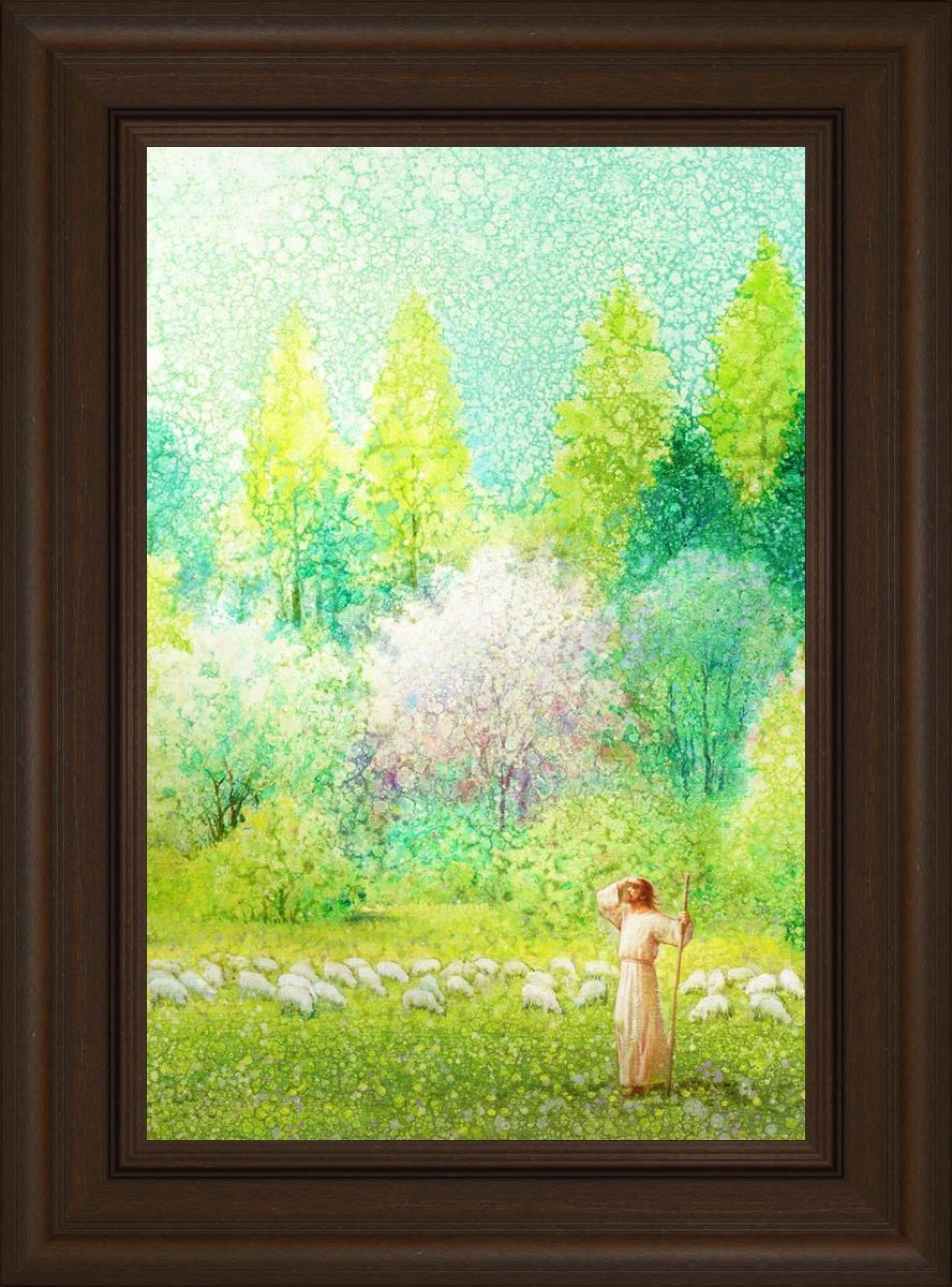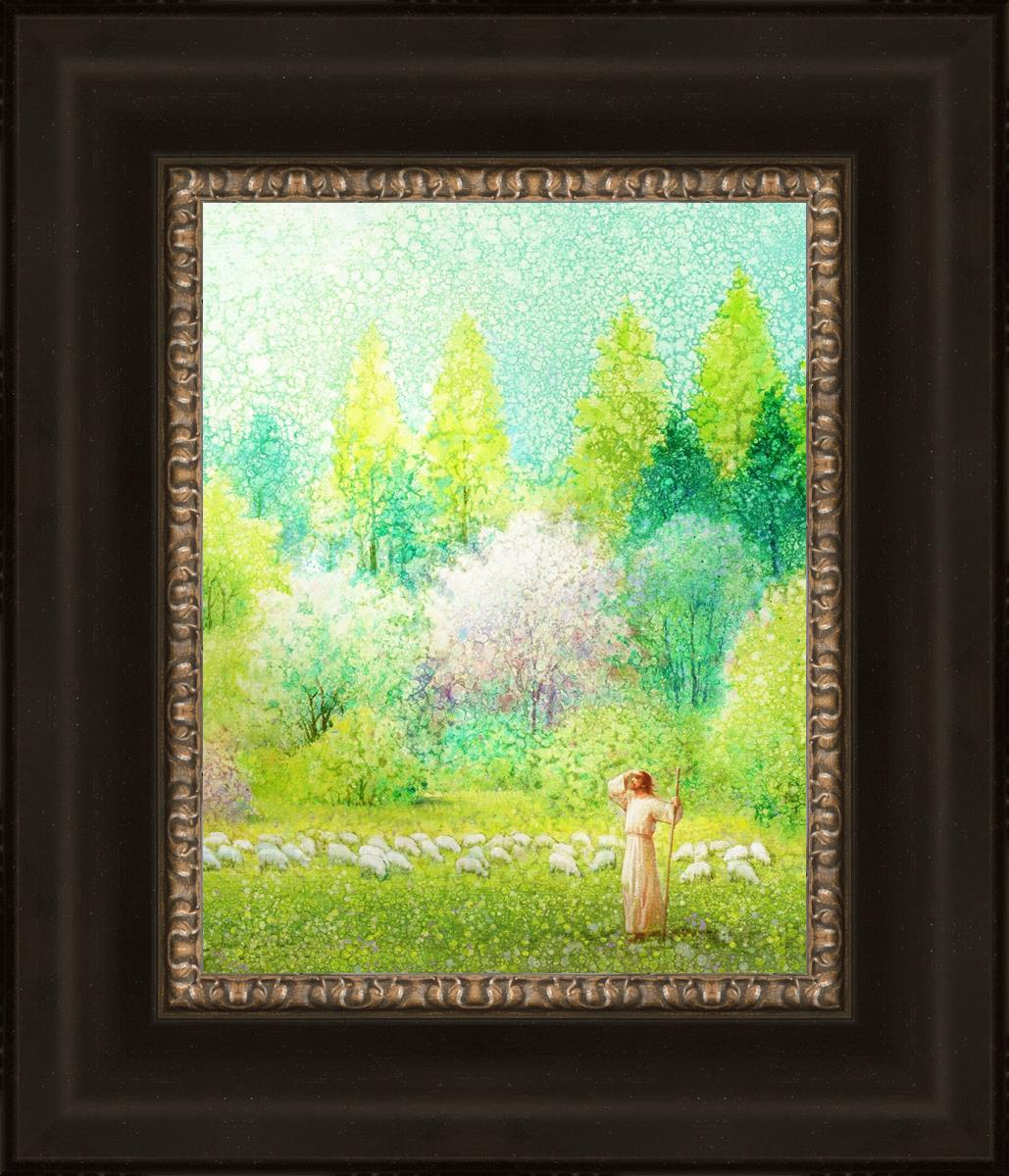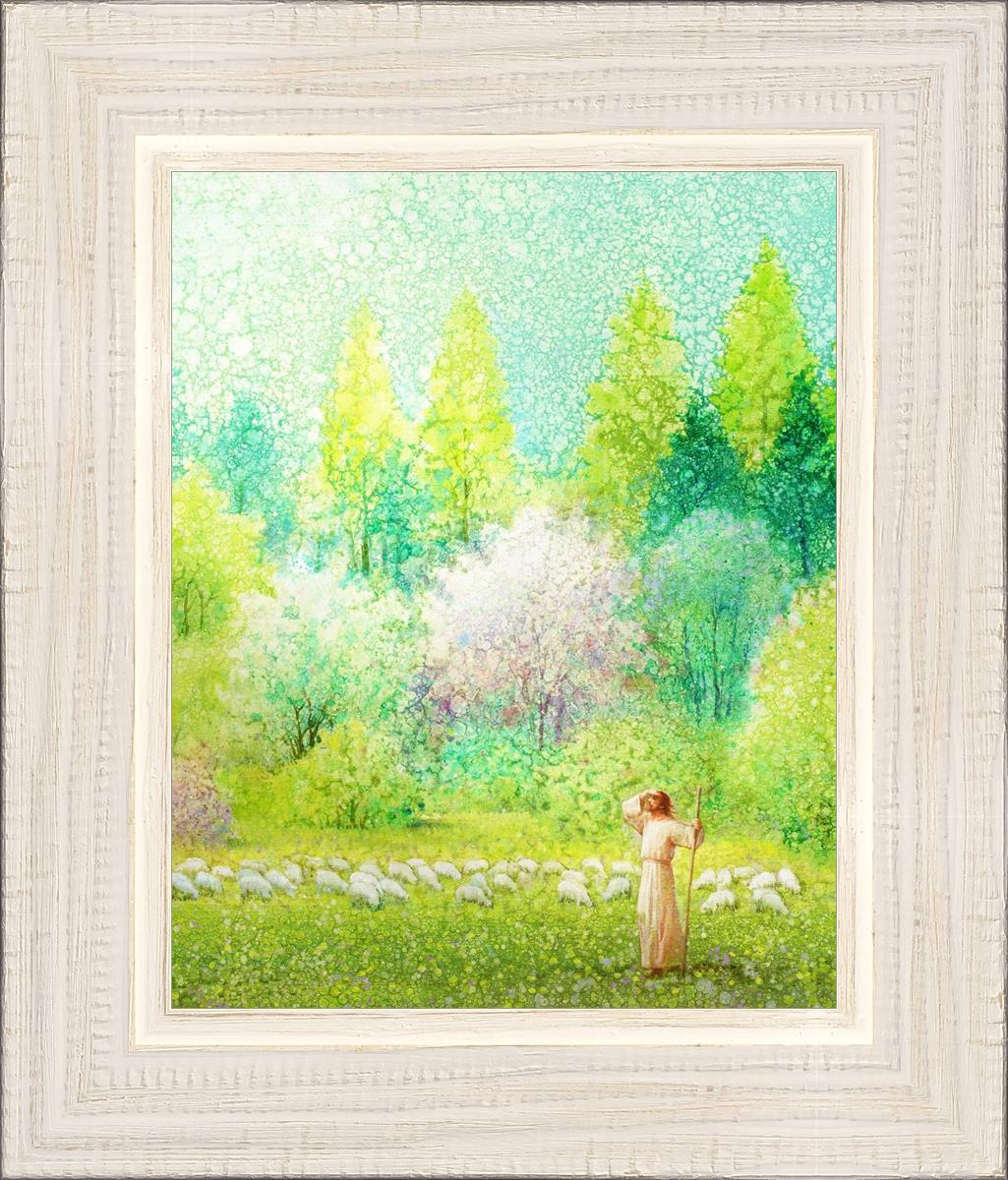 In this artwork, Jesus Christ stands tall in the midst of a lush green field, His hand shielding His eyes from the brilliance of the sun, as if carefully surveying the landscape. With His staff in hand, He exudes a sense of gentle authority and leadership, guiding those who follow Him. The surrounding flock of sheep symbolize the faithful, with the peaceful field serving as a representation of spiritual growth and the promise of safety. He Shall Find What is Lost reminds us of hope, divine care, and the unending search for what is lost, bringing a powerful sense of comfort and assurance.