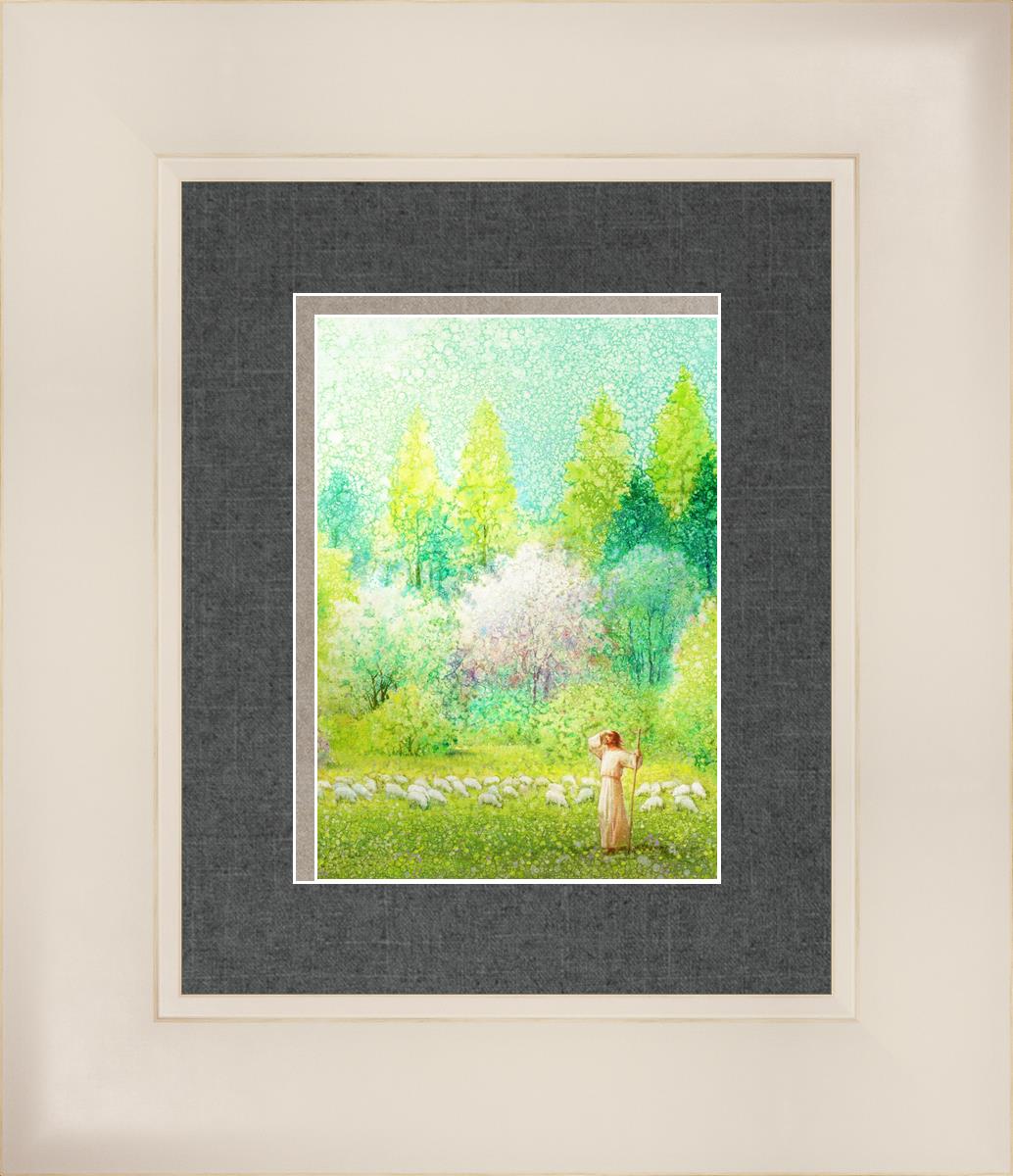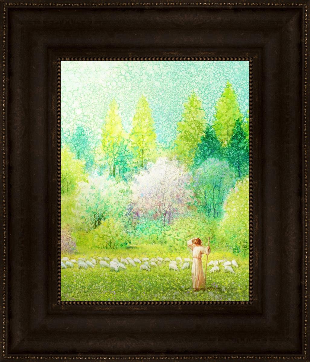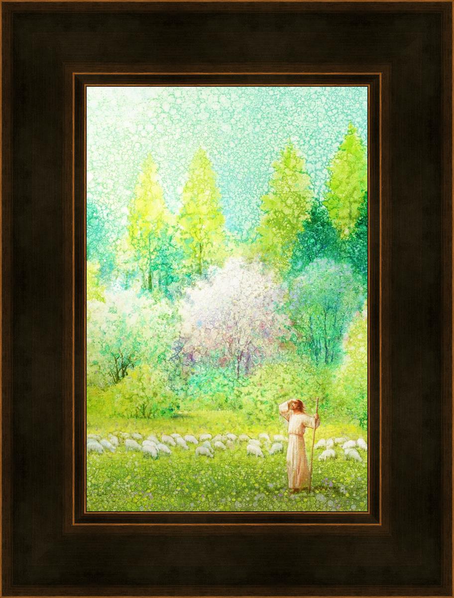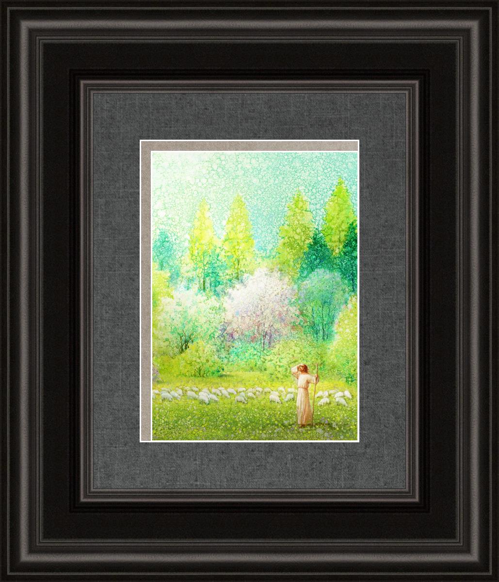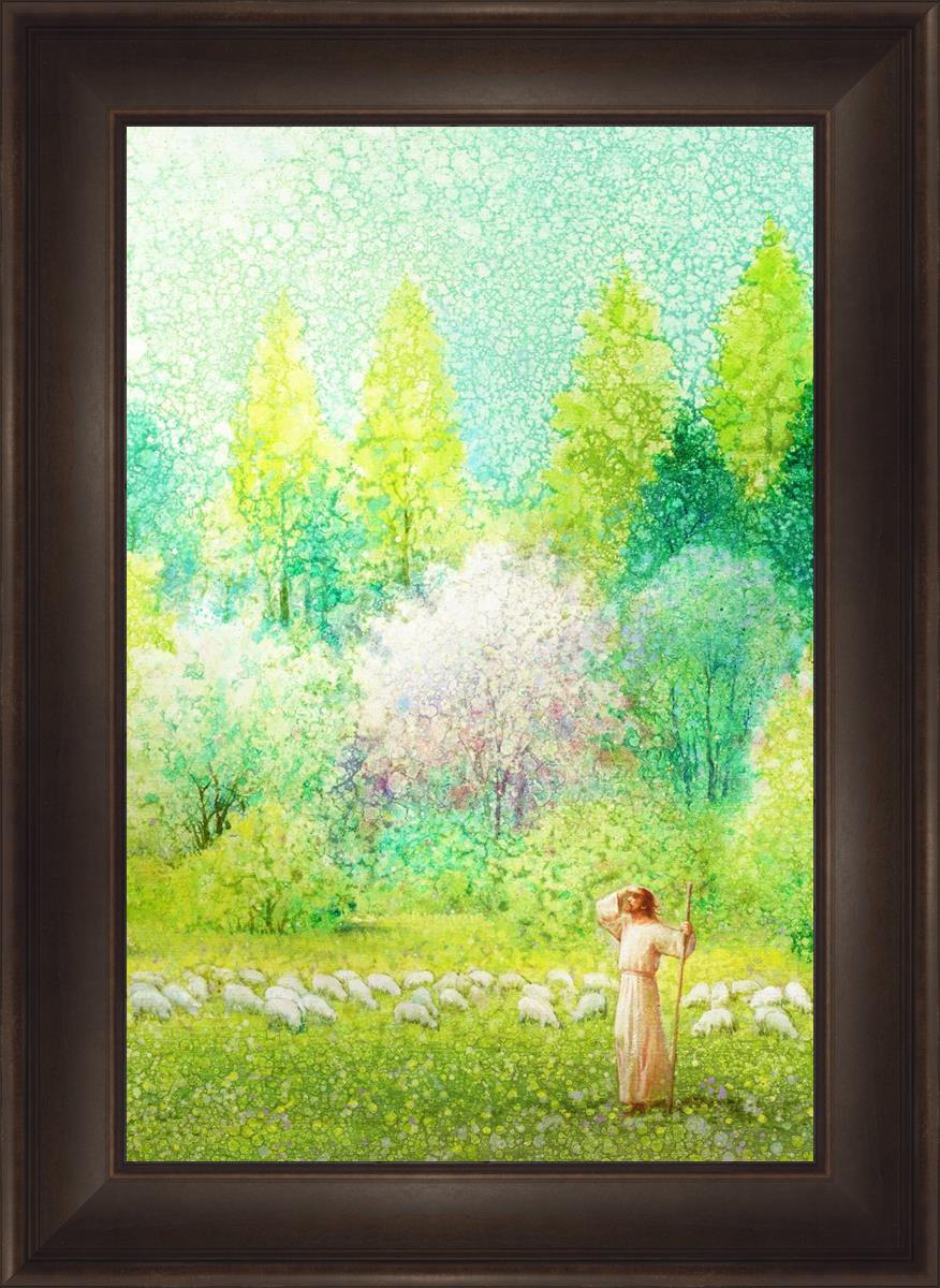 In this artwork, Jesus Christ stands tall in the midst of a lush green field, His hand shielding His eyes from the brilliance of the sun, as if carefully surveying the landscape. With His staff in hand, He exudes a sense of gentle authority and leadership, guiding those who follow Him. The surrounding flock of sheep symbolize the faithful, with the peaceful field serving as a representation of spiritual growth and the promise of safety. He Shall Find What is Lost reminds us of hope, divine care, and the unending search for what is lost, bringing a powerful sense of comfort and assurance.