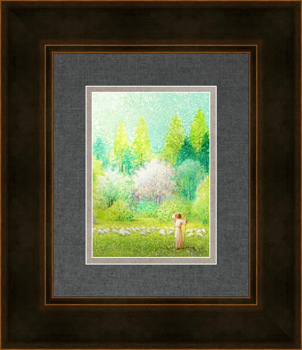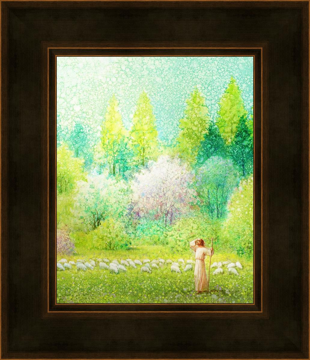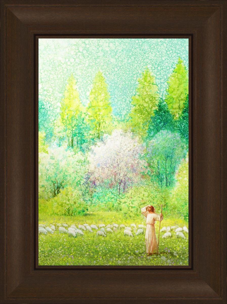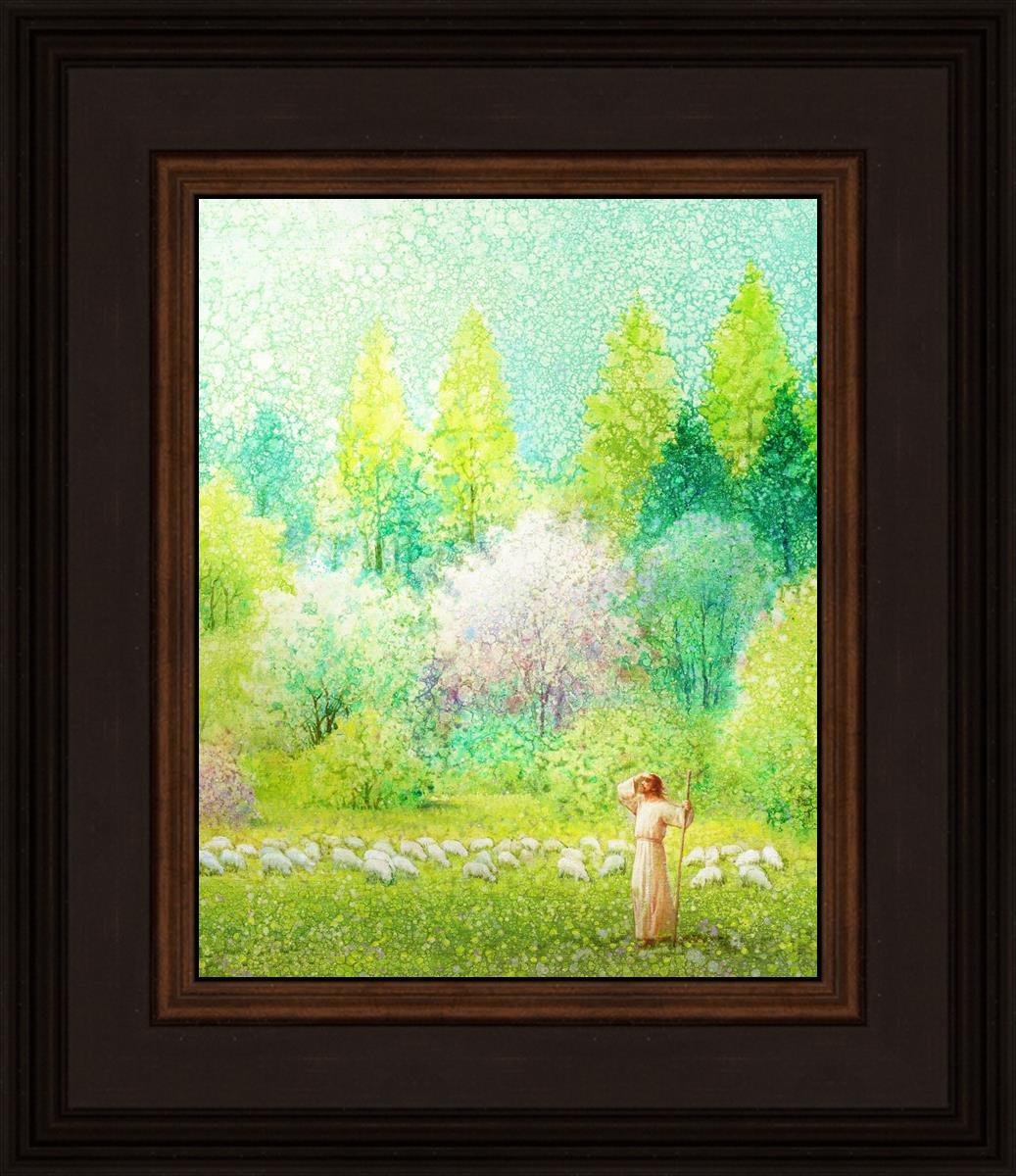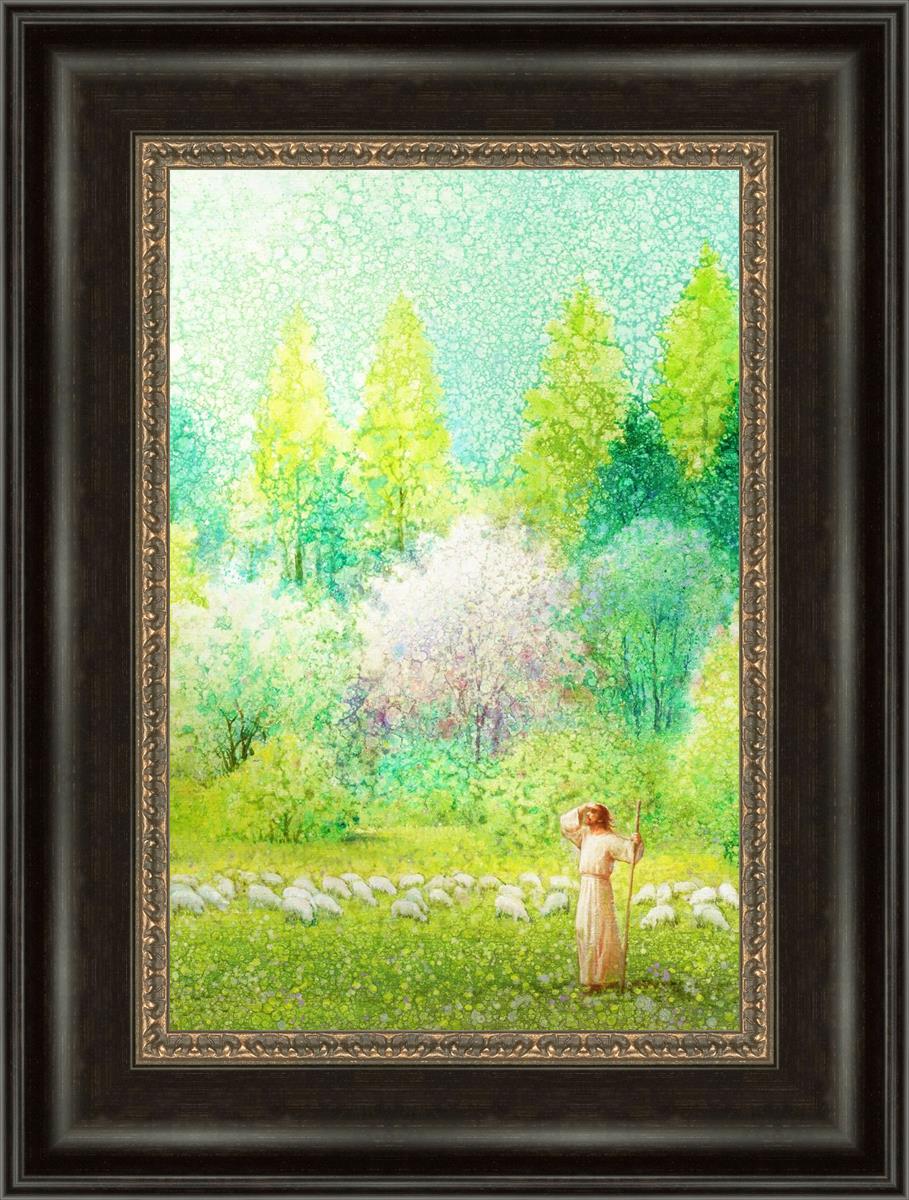 In this artwork, Jesus Christ stands tall in the midst of a lush green field, His hand shielding His eyes from the brilliance of the sun, as if carefully surveying the landscape. With His staff in hand, He exudes a sense of gentle authority and leadership, guiding those who follow Him. The surrounding flock of sheep symbolize the faithful, with the peaceful field serving as a representation of spiritual growth and the promise of safety. He Shall Find What is Lost reminds us of hope, divine care, and the unending search for what is lost, bringing a powerful sense of comfort and assurance.