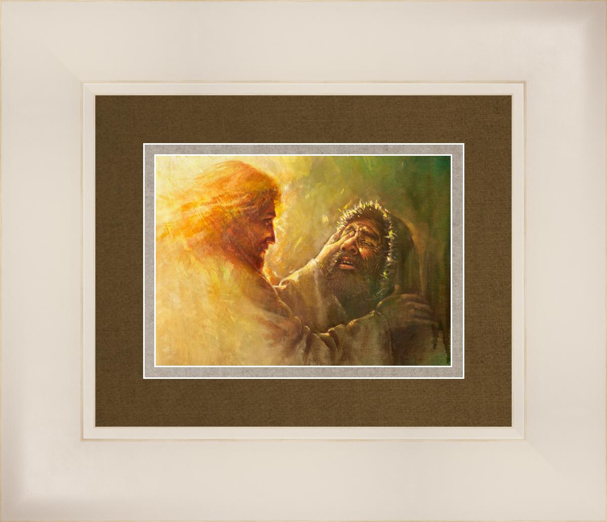 This painting depicts Jesus Christ healing a blind man, with one hand gently placed on the man's shoulder, offering both physical and emotional support, while His other hand tenderly covers the man's eyes to restore his sight. The bond between them is filled with grace, representing not just the physical healing of blindness, but also the spiritual awakening that faith brings. Healing the Blind Man invites viewers to reflect on the transformative power of faith and divine healing.