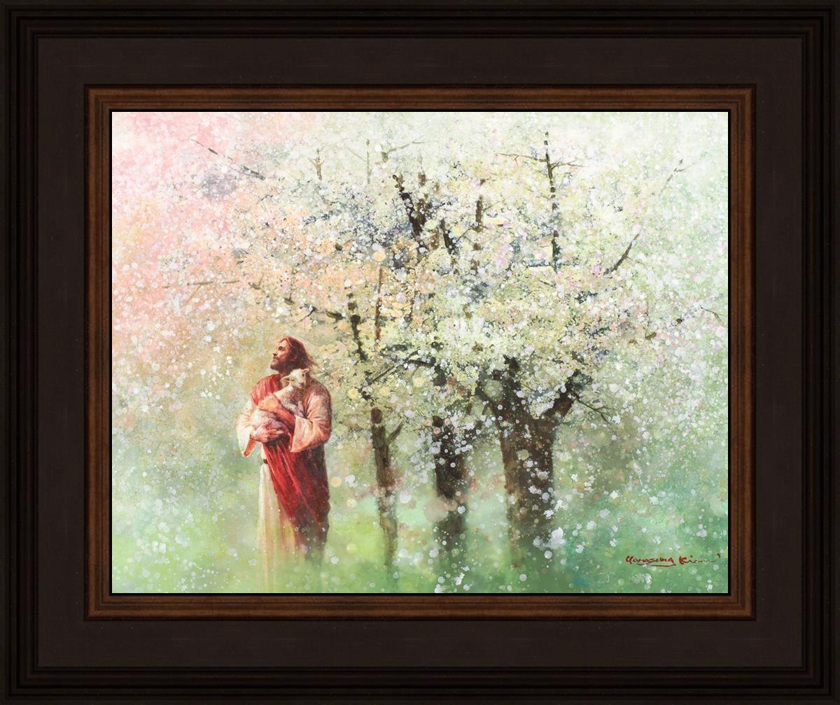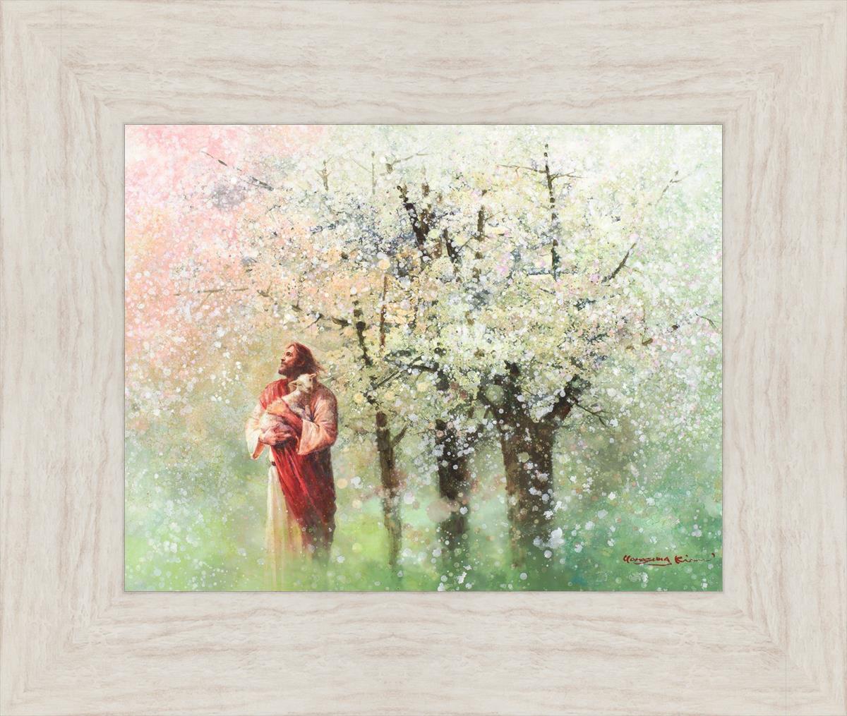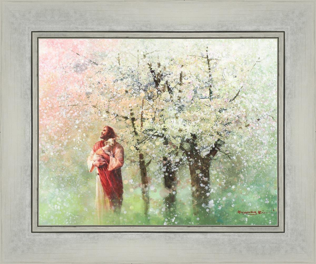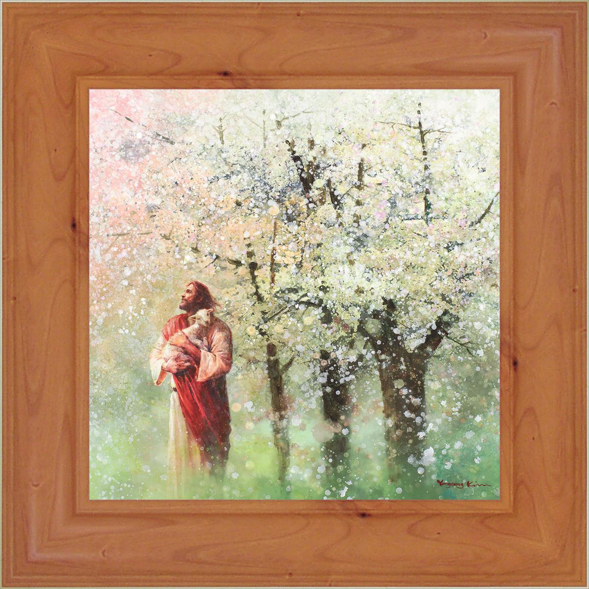 In this painting, Jesus Christ is depicted in a deep red robe, holding a lamb close to His chest with a gentle, protective embrace. Surrounding Him is a blossom tree, its soft pastel colors symbolizing purity, renewal, and the blossoming of hope. The delicate flowers of the tree serve as a visual representation of the promise of eternal life through Christ. A gentle light bathes both Jesus and the lamb, enhancing the warmth and serenity of the scene. Heavenly Blossoms invites viewers to reflect on the themes of compassion, protection, and divine love.