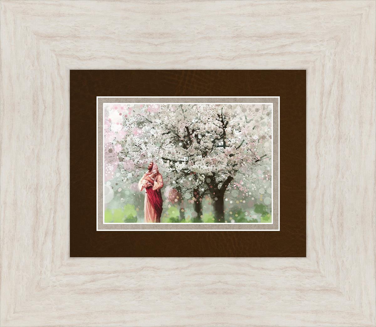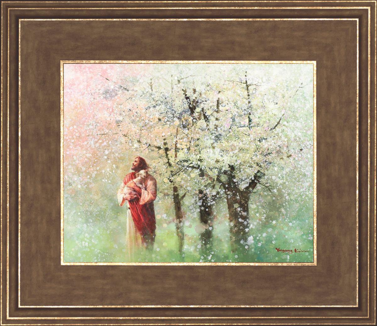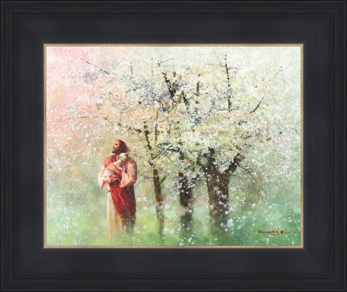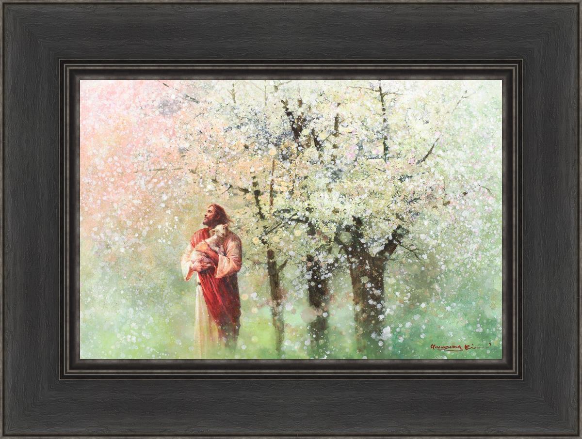 In this painting, Jesus Christ is depicted in a deep red robe, holding a lamb close to His chest with a gentle, protective embrace. Surrounding Him is a blossom tree, its soft pastel colors symbolizing purity, renewal, and the blossoming of hope. The delicate flowers of the tree serve as a visual representation of the promise of eternal life through Christ. A gentle light bathes both Jesus and the lamb, enhancing the warmth and serenity of the scene. Heavenly Blossoms invites viewers to reflect on the themes of compassion, protection, and divine love.