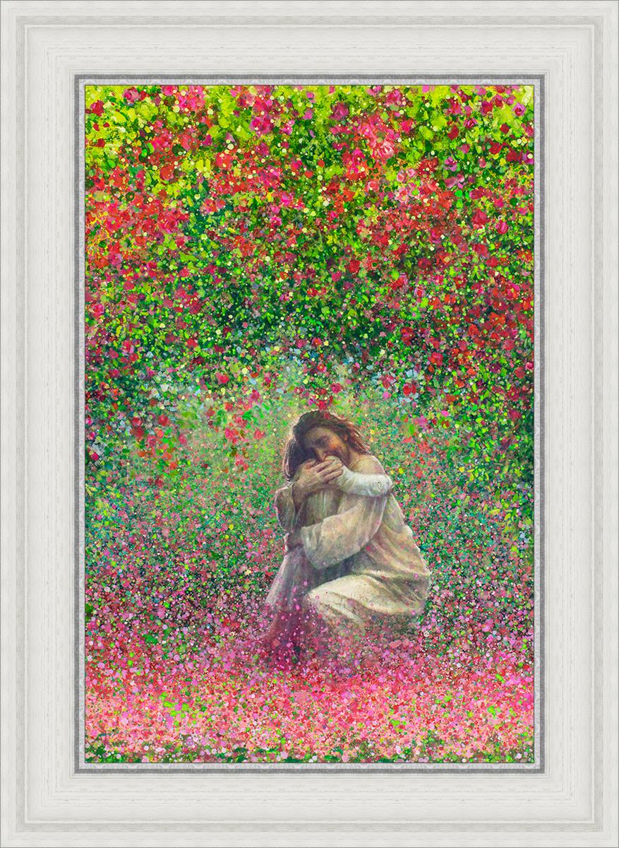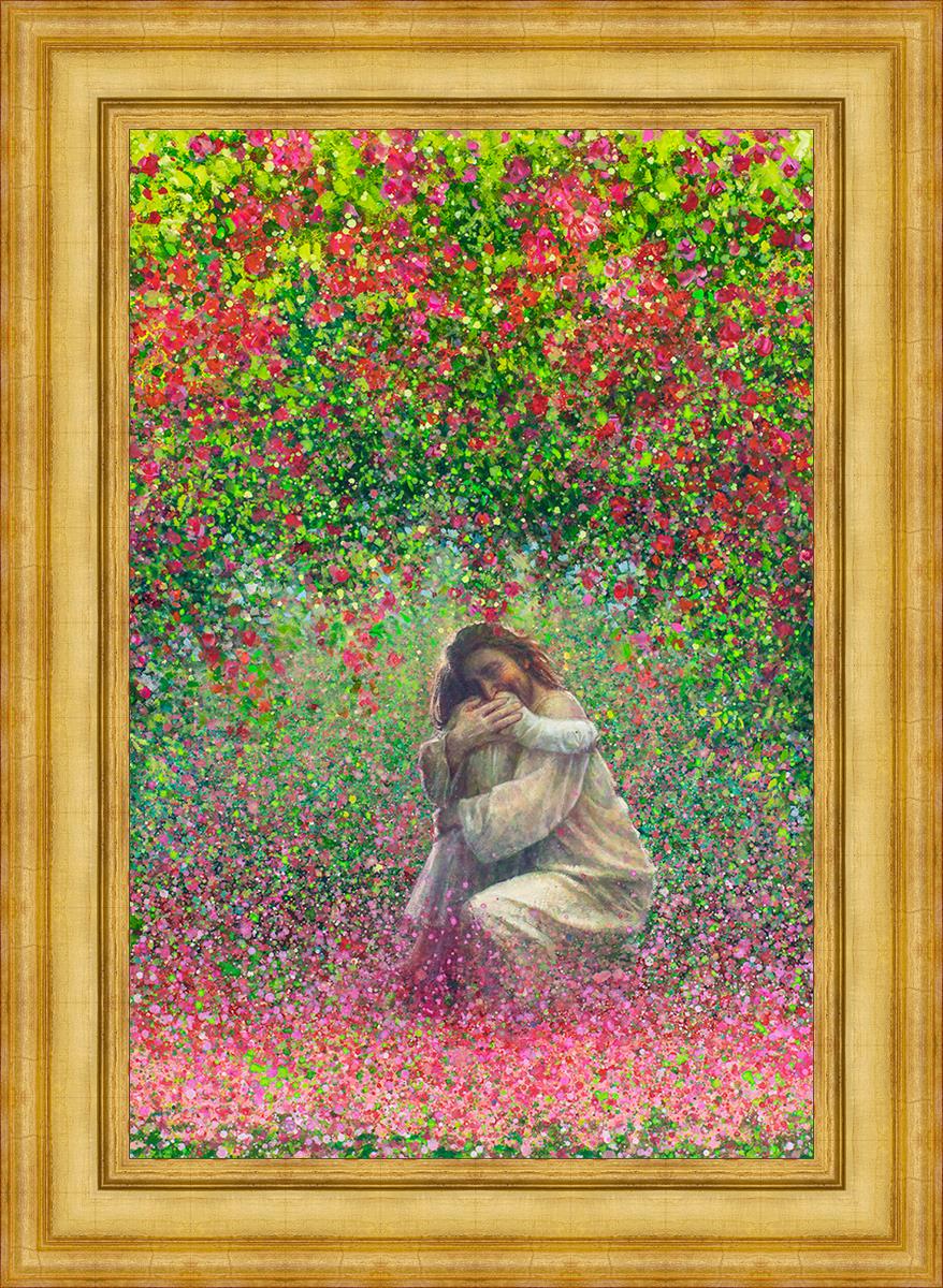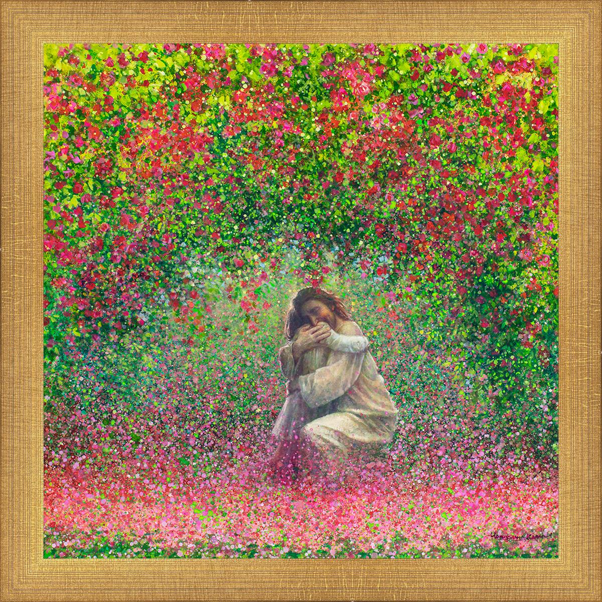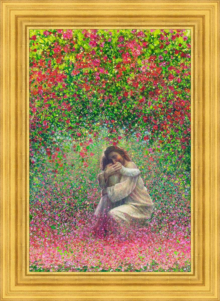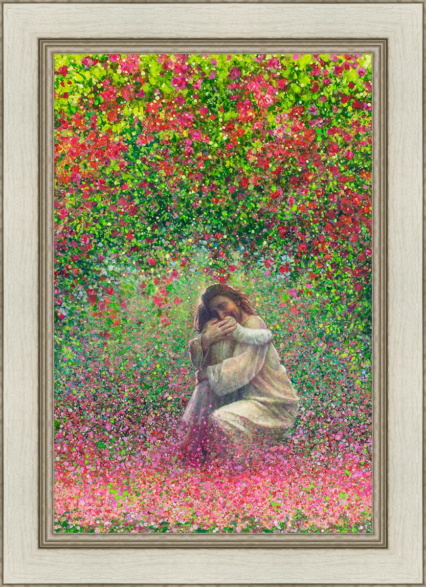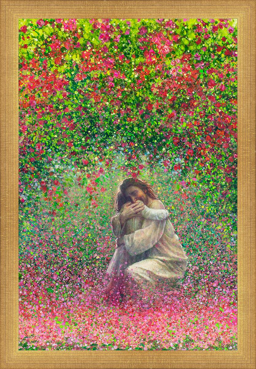 This painting is framed by a canopy of fragrant blossoms, their rich colors forming a beautiful, vibrant backdrop. In the center, Jesus Christ gently holds a little child, wrapping her in His protective embrace. His gentle, yet strong presence offers both reassurance and comfort, as His divine touch offers a profound sense of safety and peace. Here in My Arms invites viewers to reflect on the boundless love and protection Jesus offers to all His children.