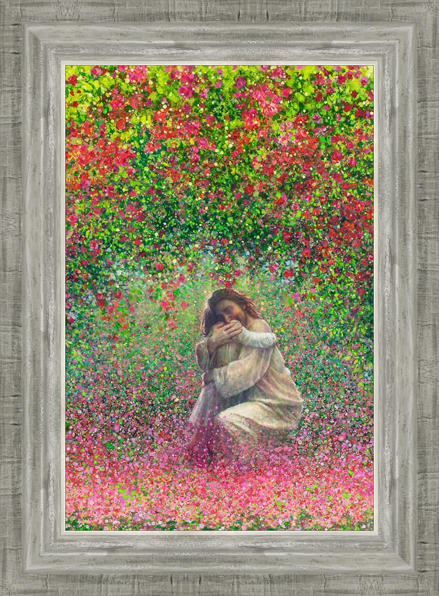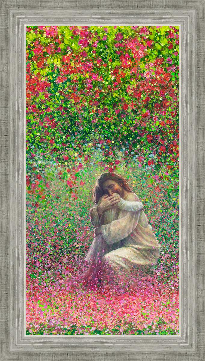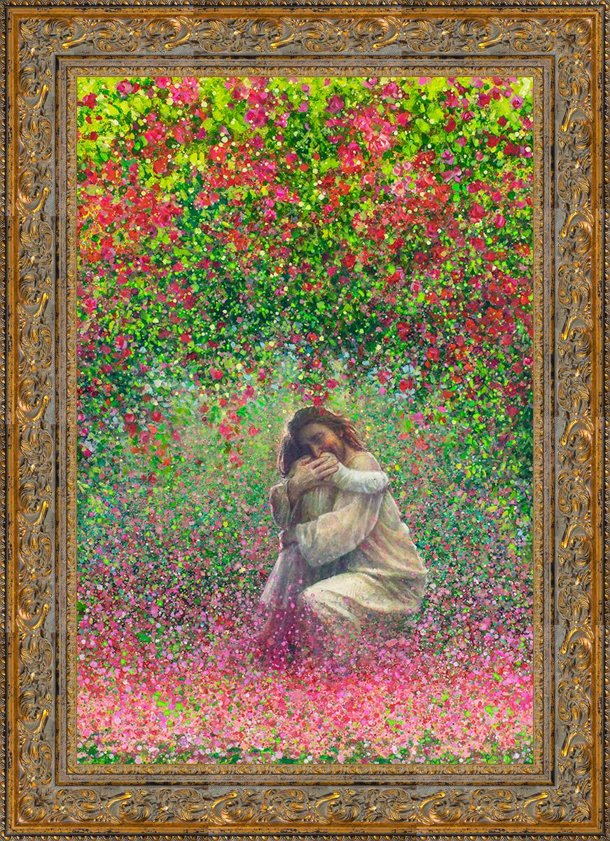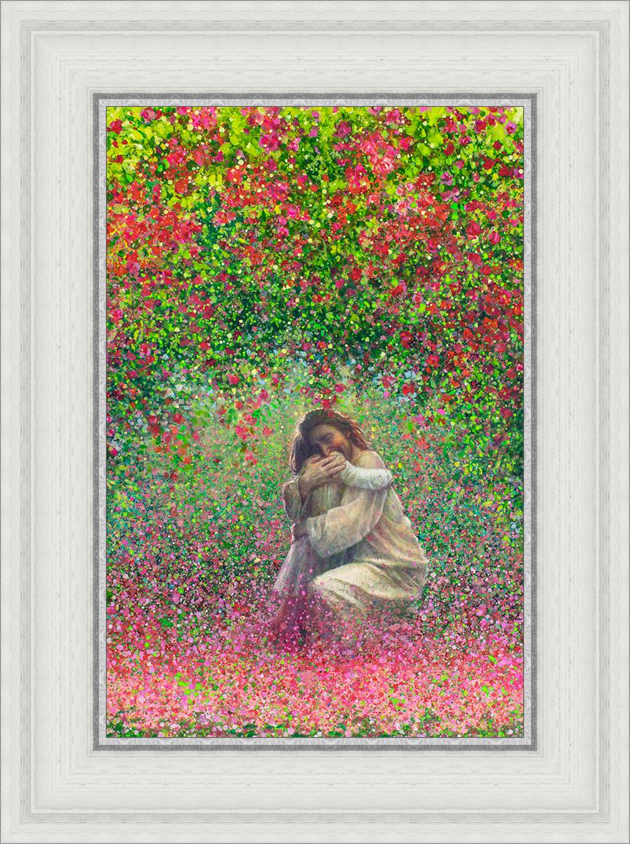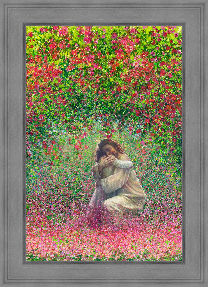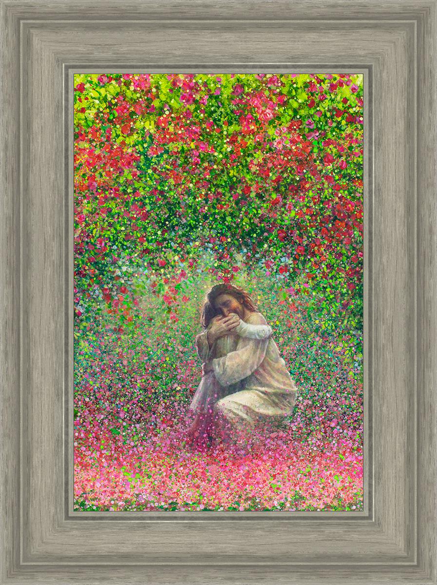This painting is framed by a canopy of fragrant blossoms, their rich colors forming a beautiful, vibrant backdrop. In the center, Jesus Christ gently holds a little child, wrapping her in His protective embrace. His gentle, yet strong presence offers both reassurance and comfort, as His divine touch offers a profound sense of safety and peace. Here in My Arms invites viewers to reflect on the boundless love and protection Jesus offers to all His children.