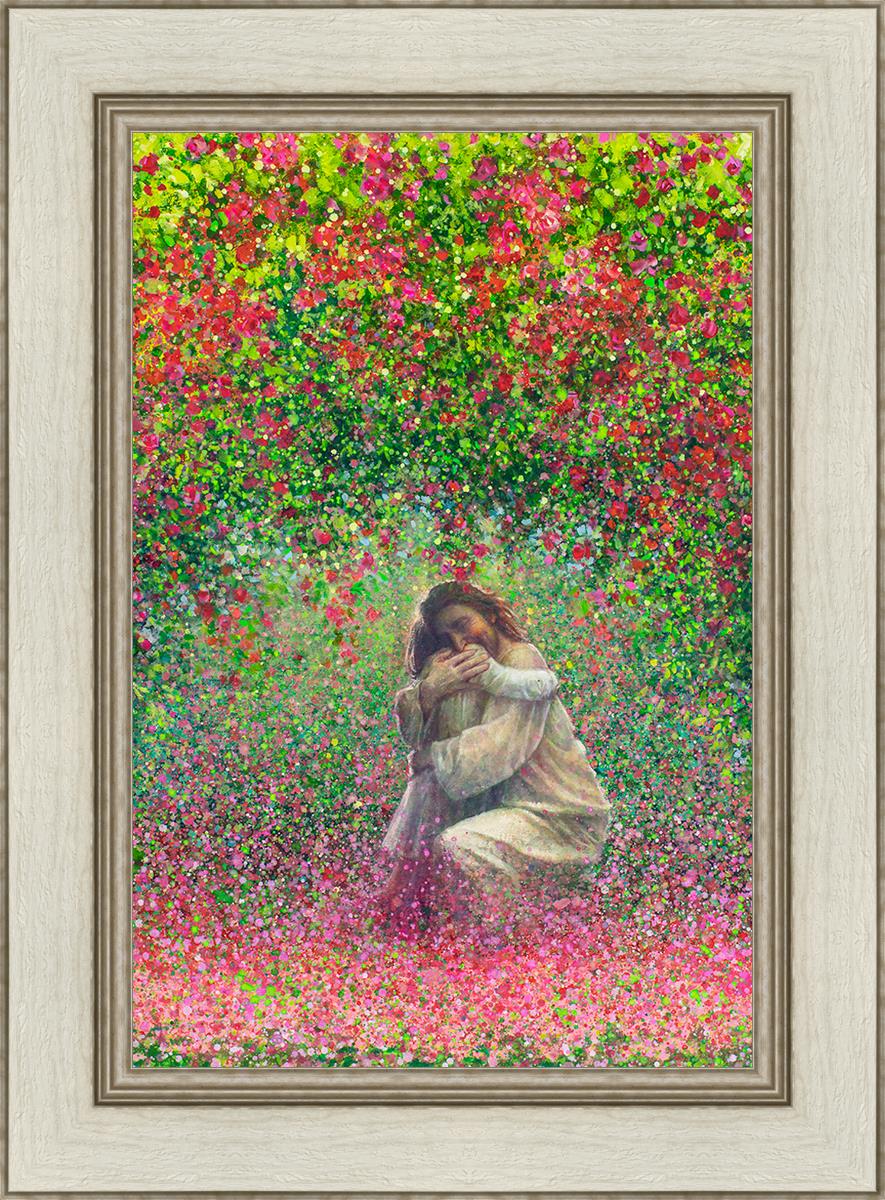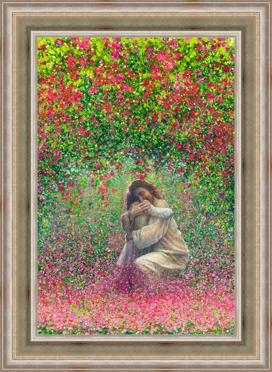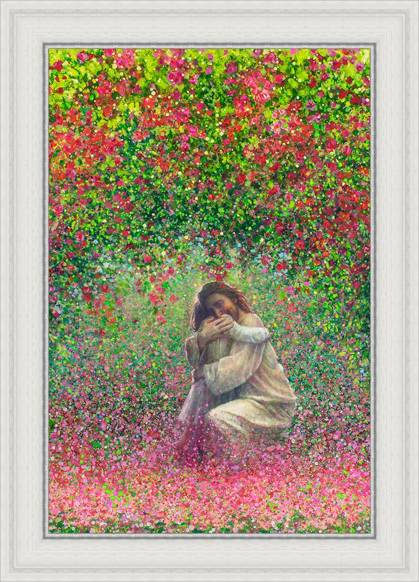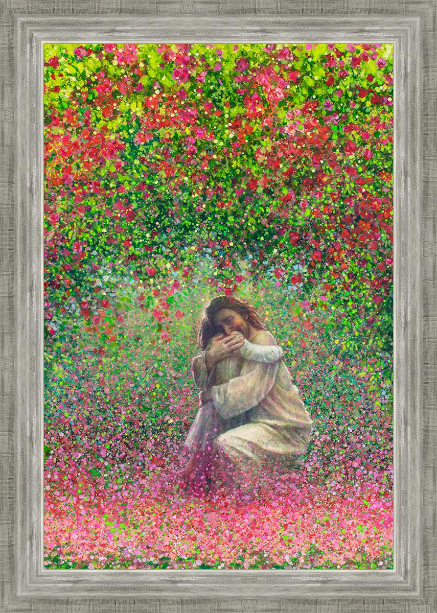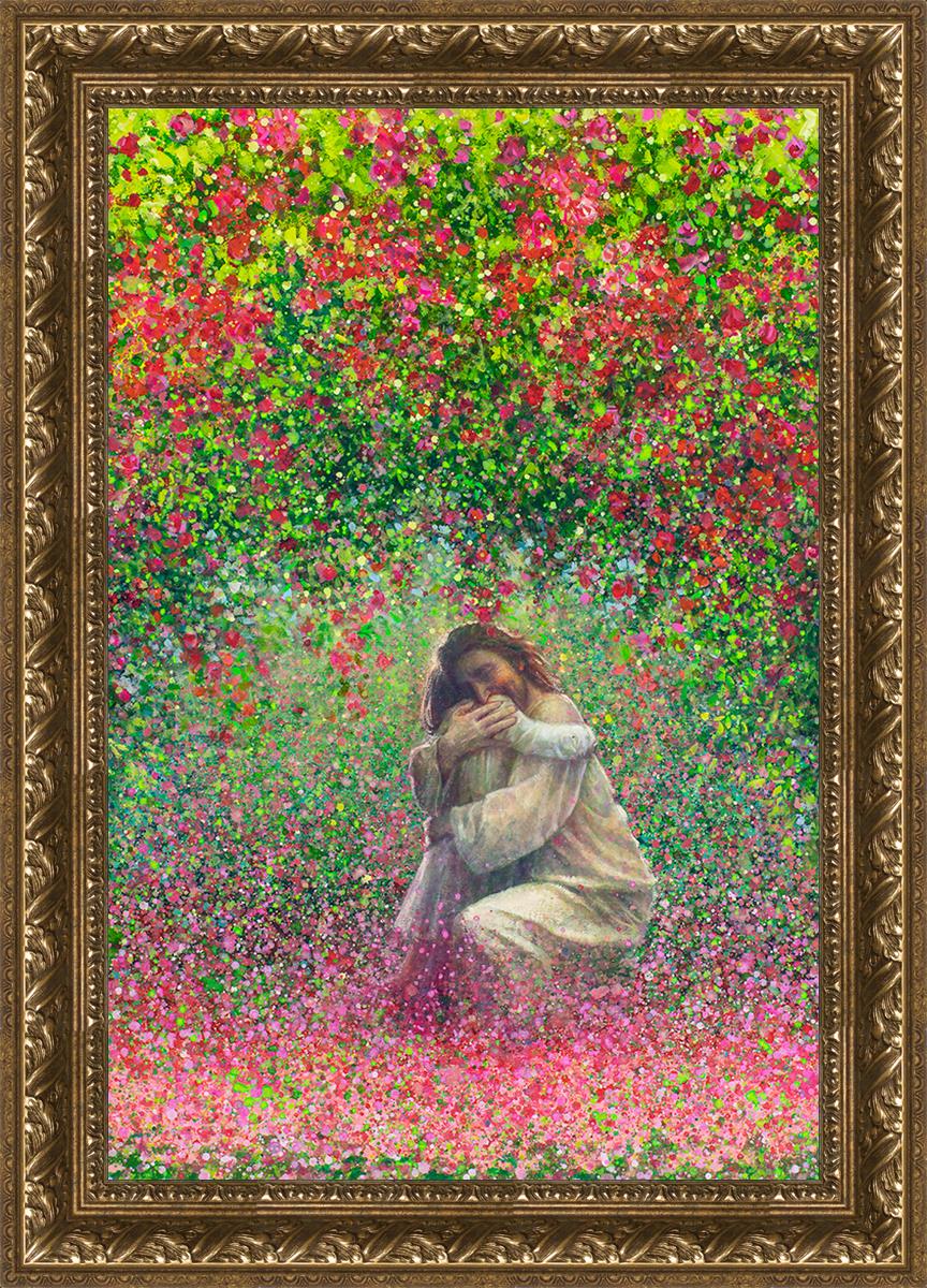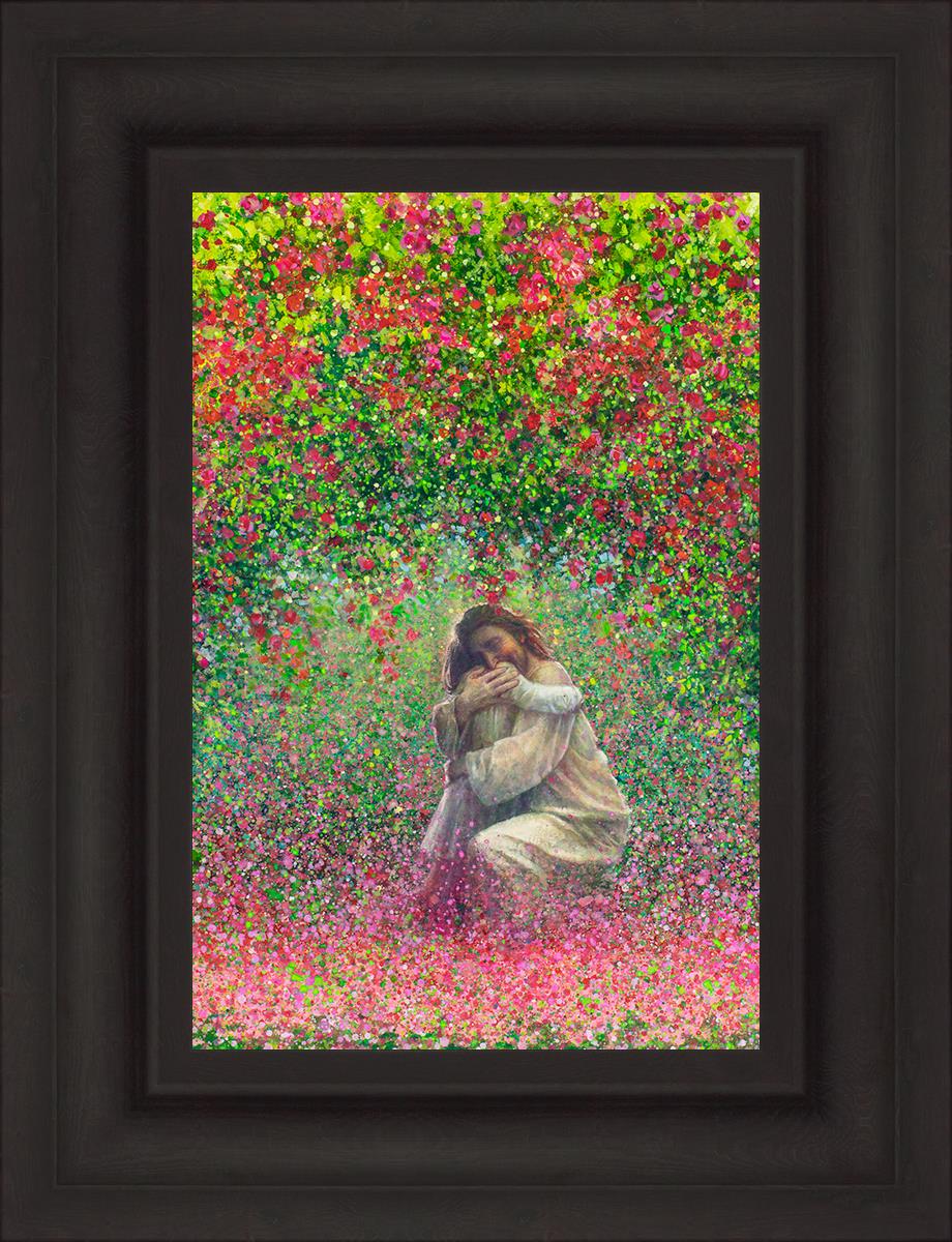 This painting is framed by a canopy of fragrant blossoms, their rich colors forming a beautiful, vibrant backdrop. In the center, Jesus Christ gently holds a little child, wrapping her in His protective embrace. His gentle, yet strong presence offers both reassurance and comfort, as His divine touch offers a profound sense of safety and peace. Here in My Arms invites viewers to reflect on the boundless love and protection Jesus offers to all His children.