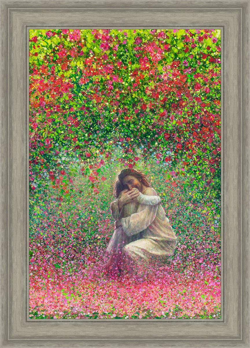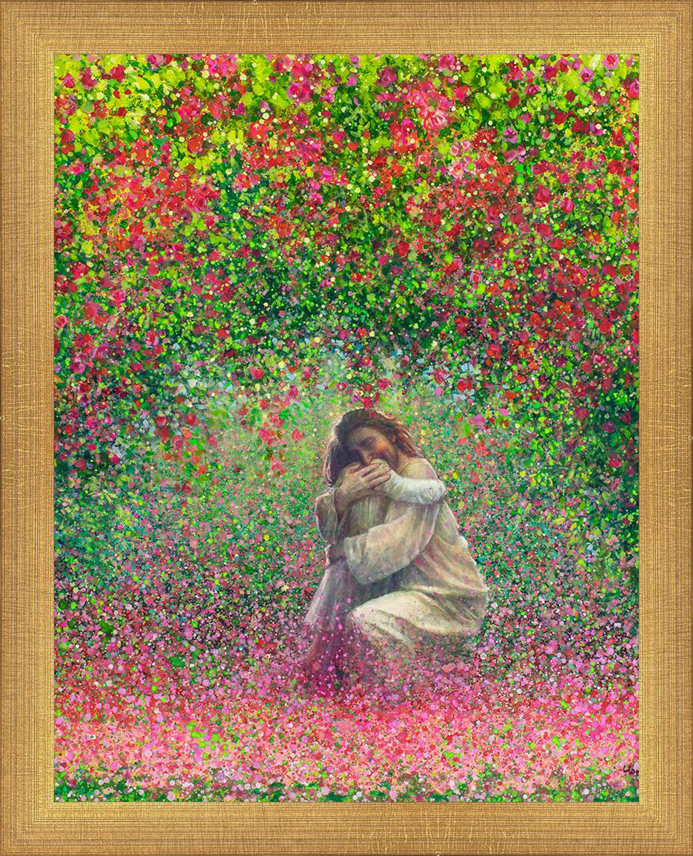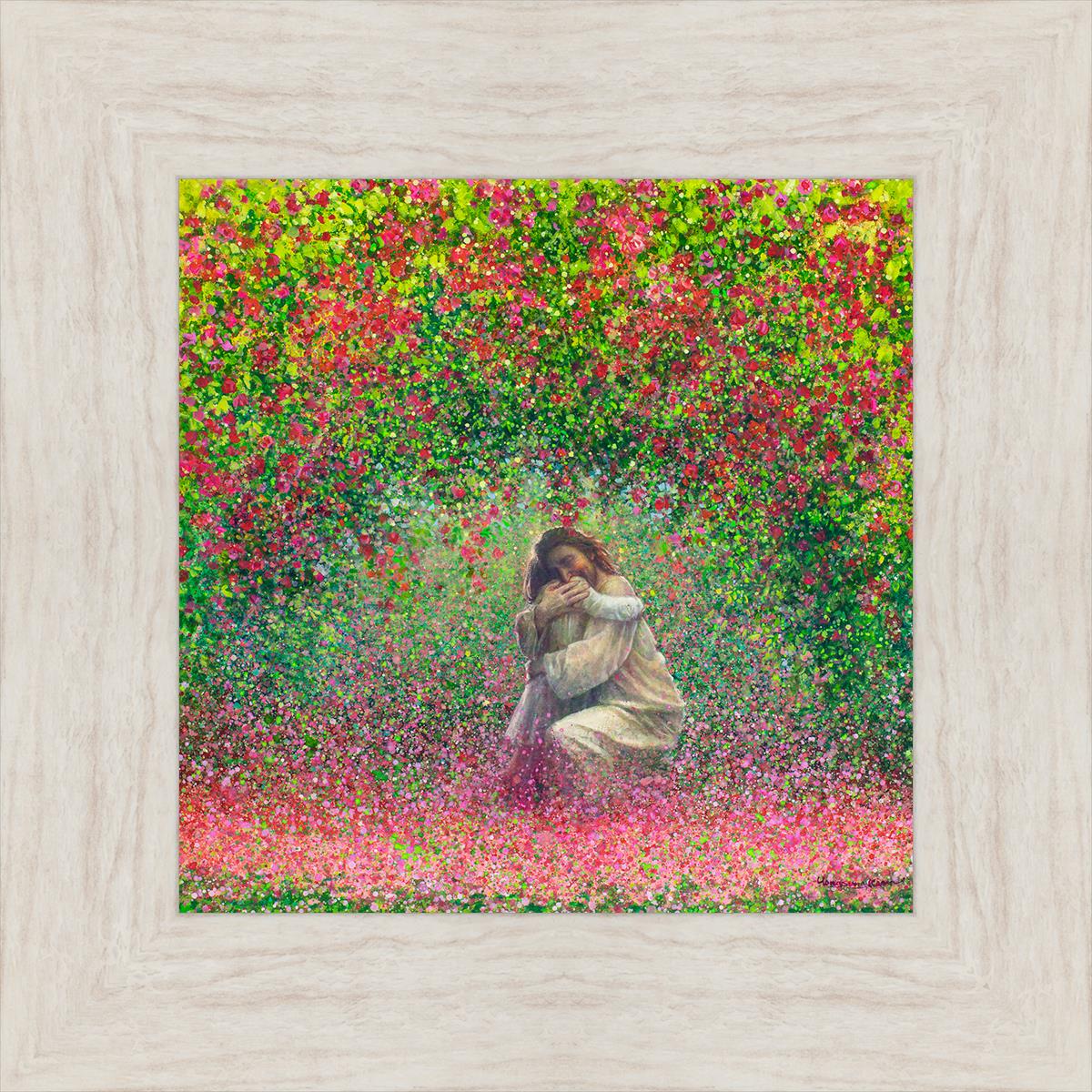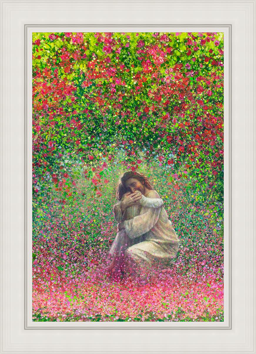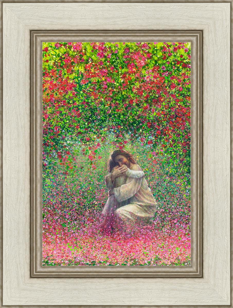 This painting is framed by a canopy of fragrant blossoms, their rich colors forming a beautiful, vibrant backdrop. In the center, Jesus Christ gently holds a little child, wrapping her in His protective embrace. His gentle, yet strong presence offers both reassurance and comfort, as His divine touch offers a profound sense of safety and peace. Here in My Arms invites viewers to reflect on the boundless love and protection Jesus offers to all His children.