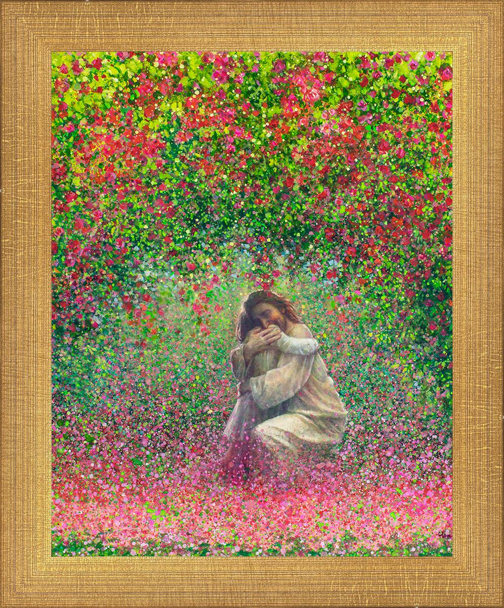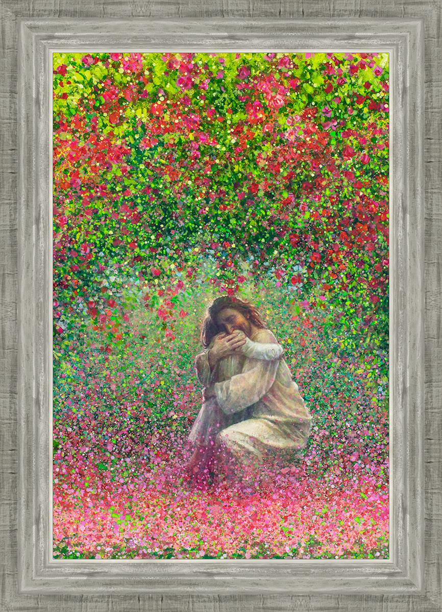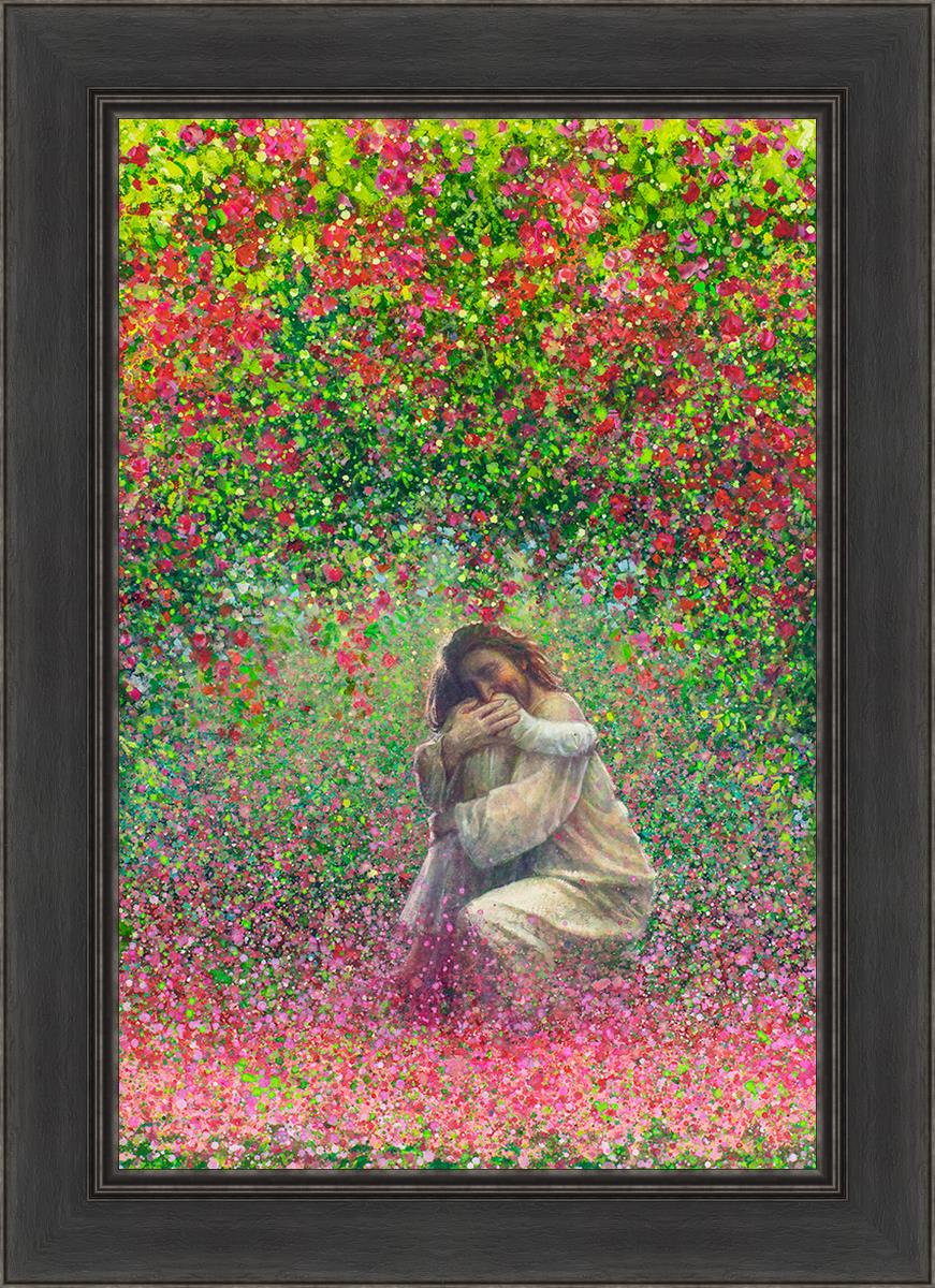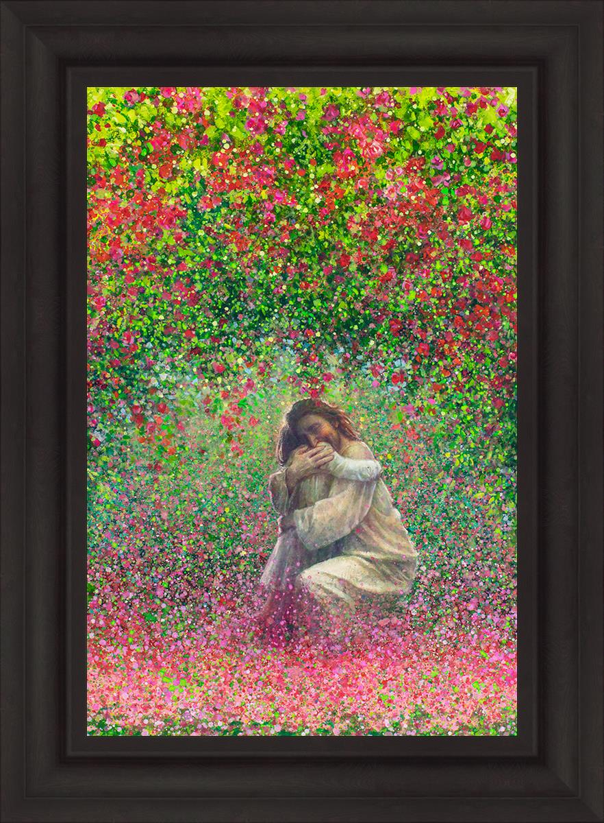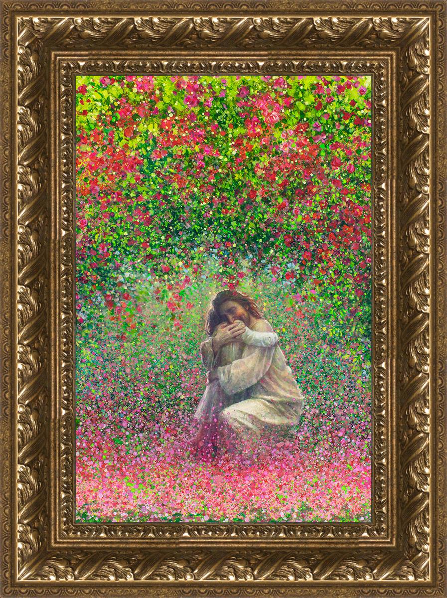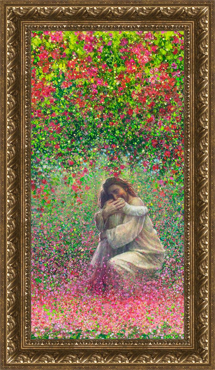 This painting is framed by a canopy of fragrant blossoms, their rich colors forming a beautiful, vibrant backdrop. In the center, Jesus Christ gently holds a little child, wrapping her in His protective embrace. His gentle, yet strong presence offers both reassurance and comfort, as His divine touch offers a profound sense of safety and peace. Here in My Arms invites viewers to reflect on the boundless love and protection Jesus offers to all His children.