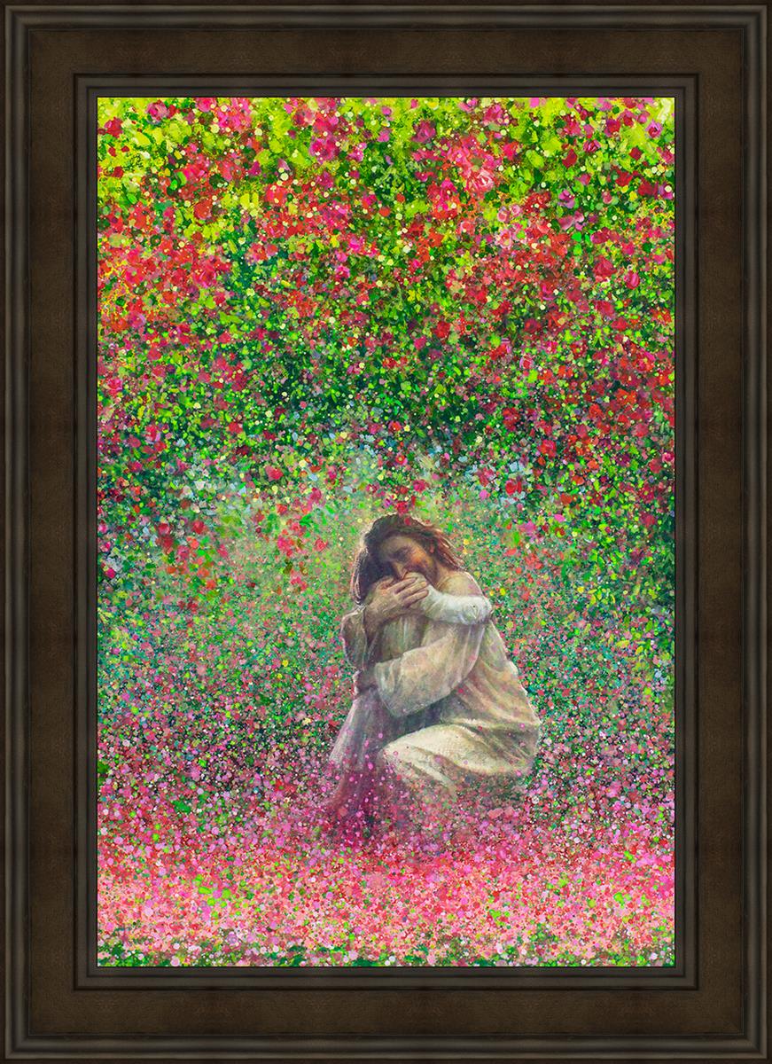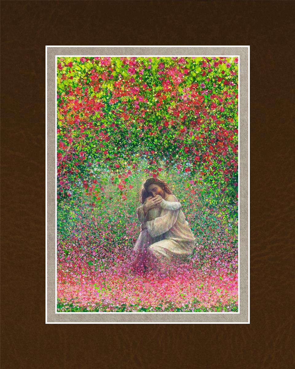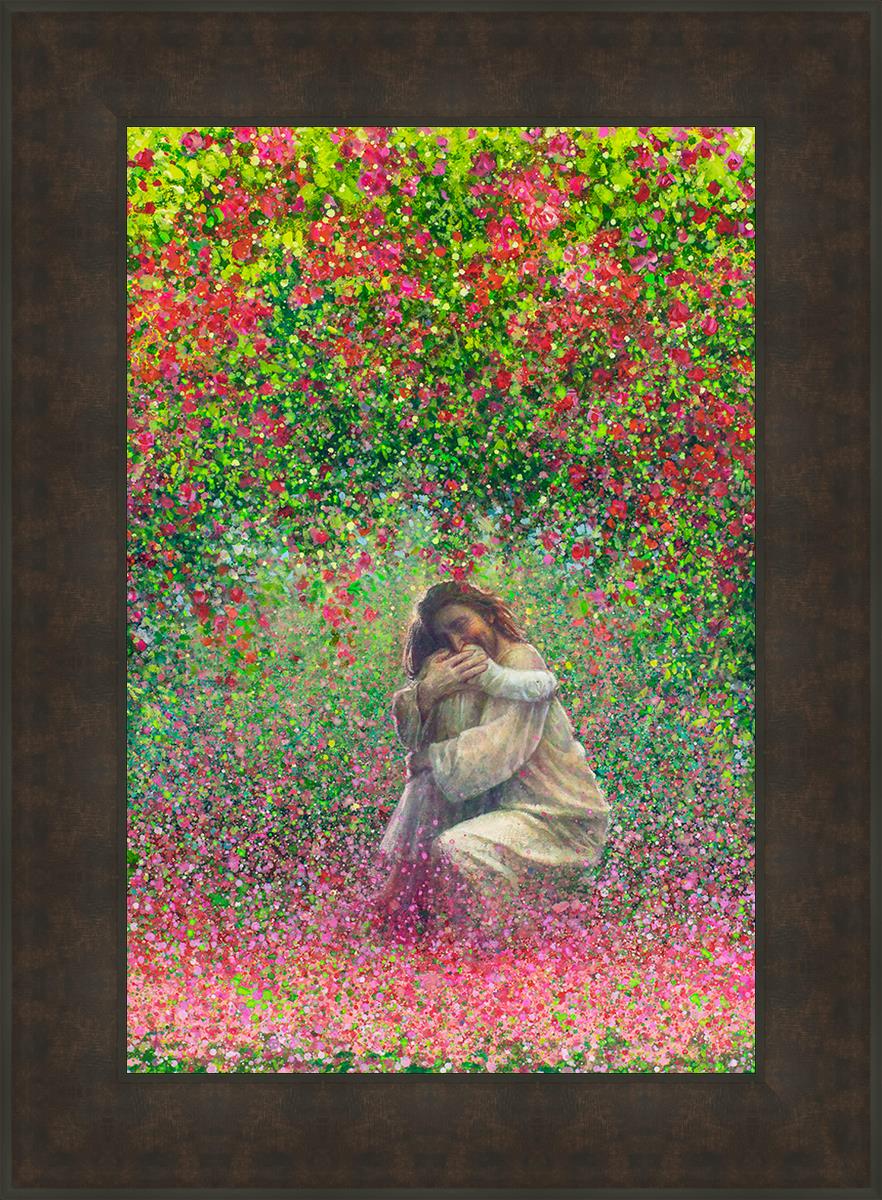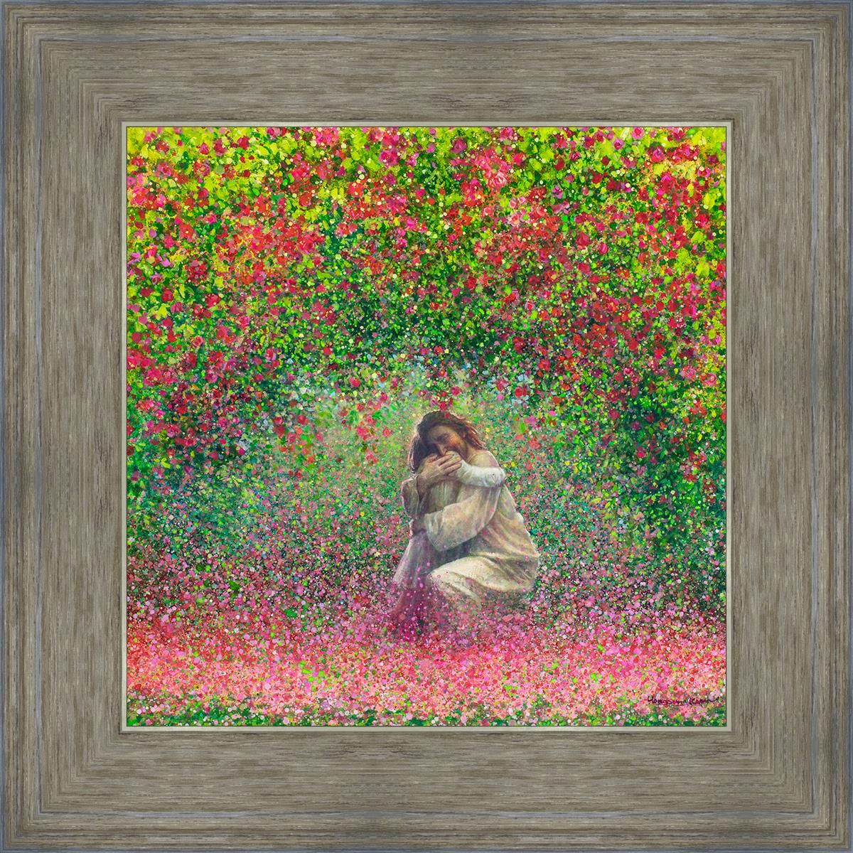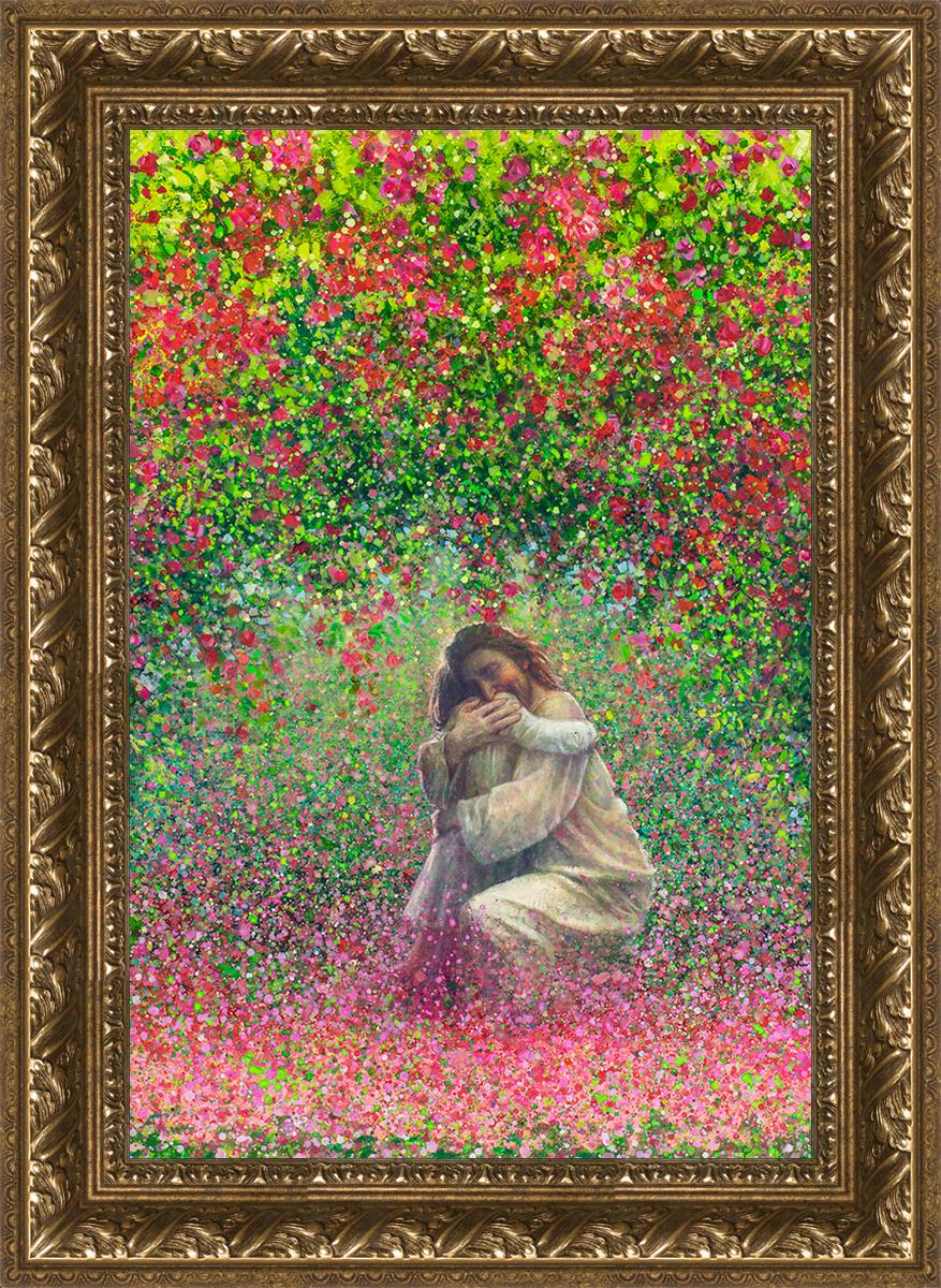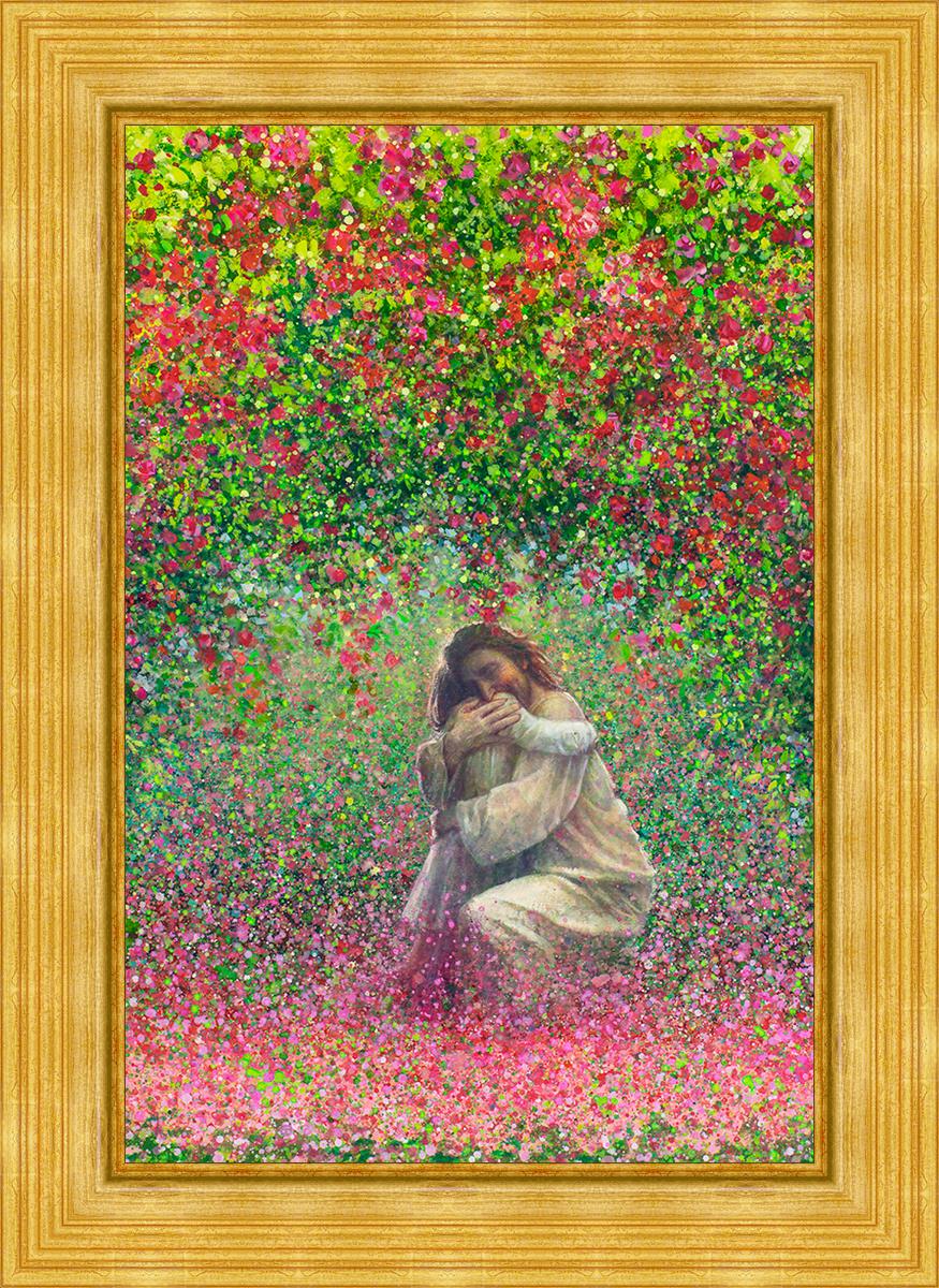 This painting is framed by a canopy of fragrant blossoms, their rich colors forming a beautiful, vibrant backdrop. In the center, Jesus Christ gently holds a little child, wrapping her in His protective embrace. His gentle, yet strong presence offers both reassurance and comfort, as His divine touch offers a profound sense of safety and peace. Here in My Arms invites viewers to reflect on the boundless love and protection Jesus offers to all His children.