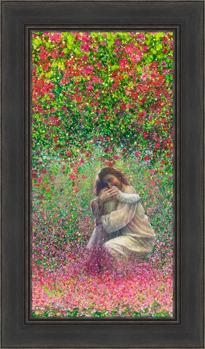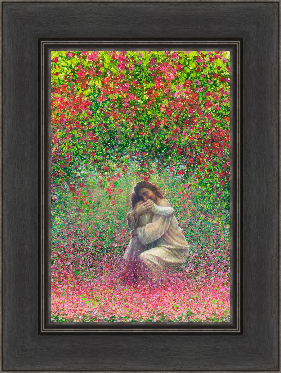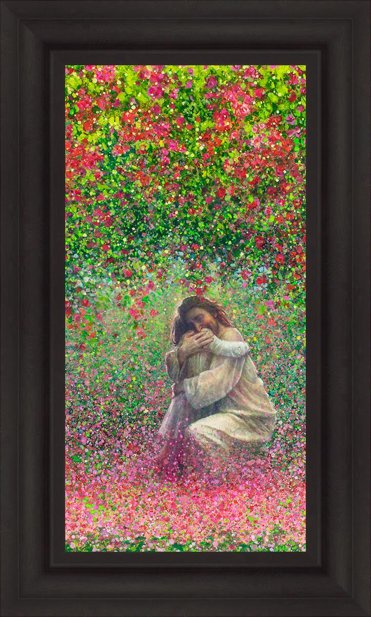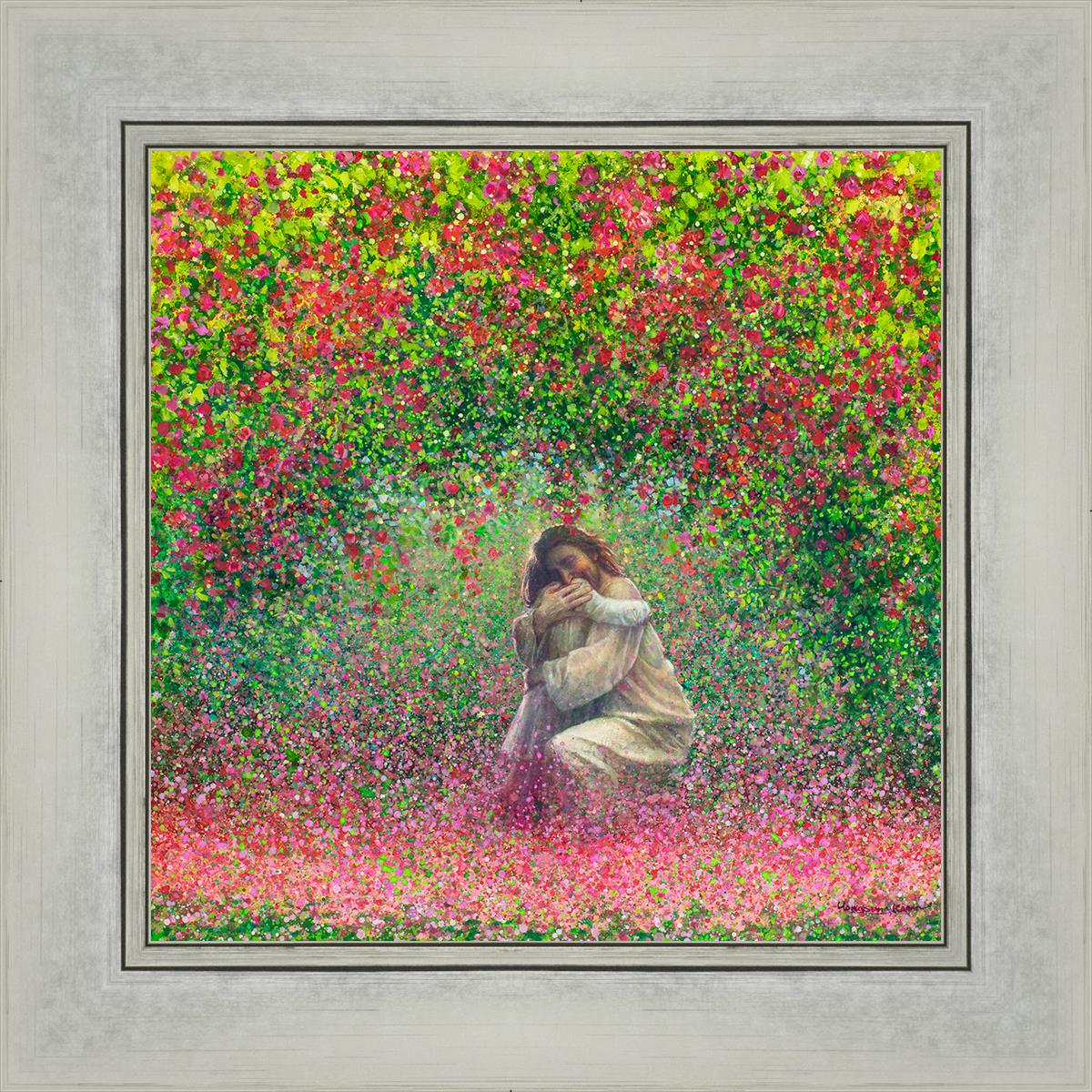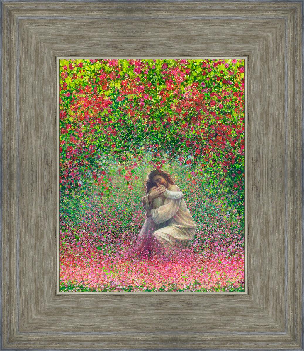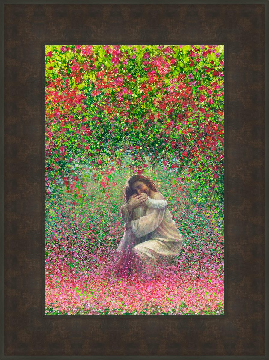 This painting is framed by a canopy of fragrant blossoms, their rich colors forming a beautiful, vibrant backdrop. In the center, Jesus Christ gently holds a little child, wrapping her in His protective embrace. His gentle, yet strong presence offers both reassurance and comfort, as His divine touch offers a profound sense of safety and peace. Here in My Arms invites viewers to reflect on the boundless love and protection Jesus offers to all His children.