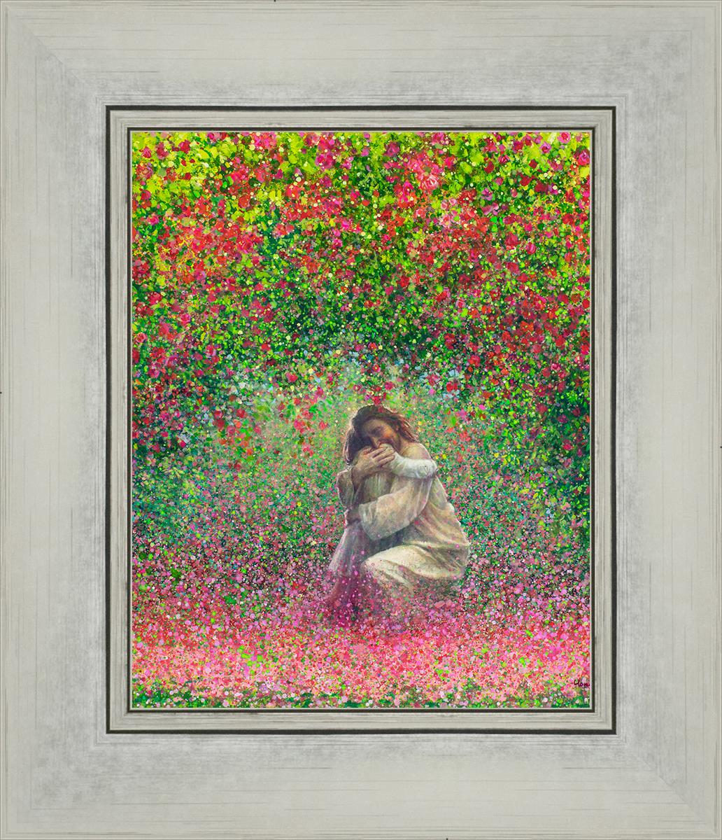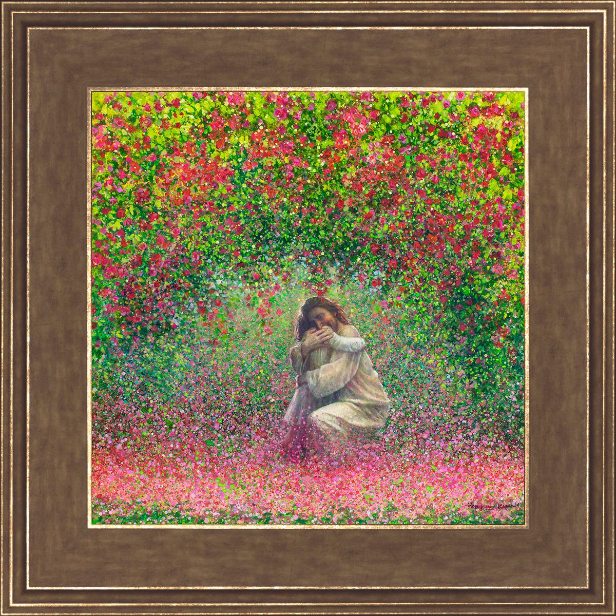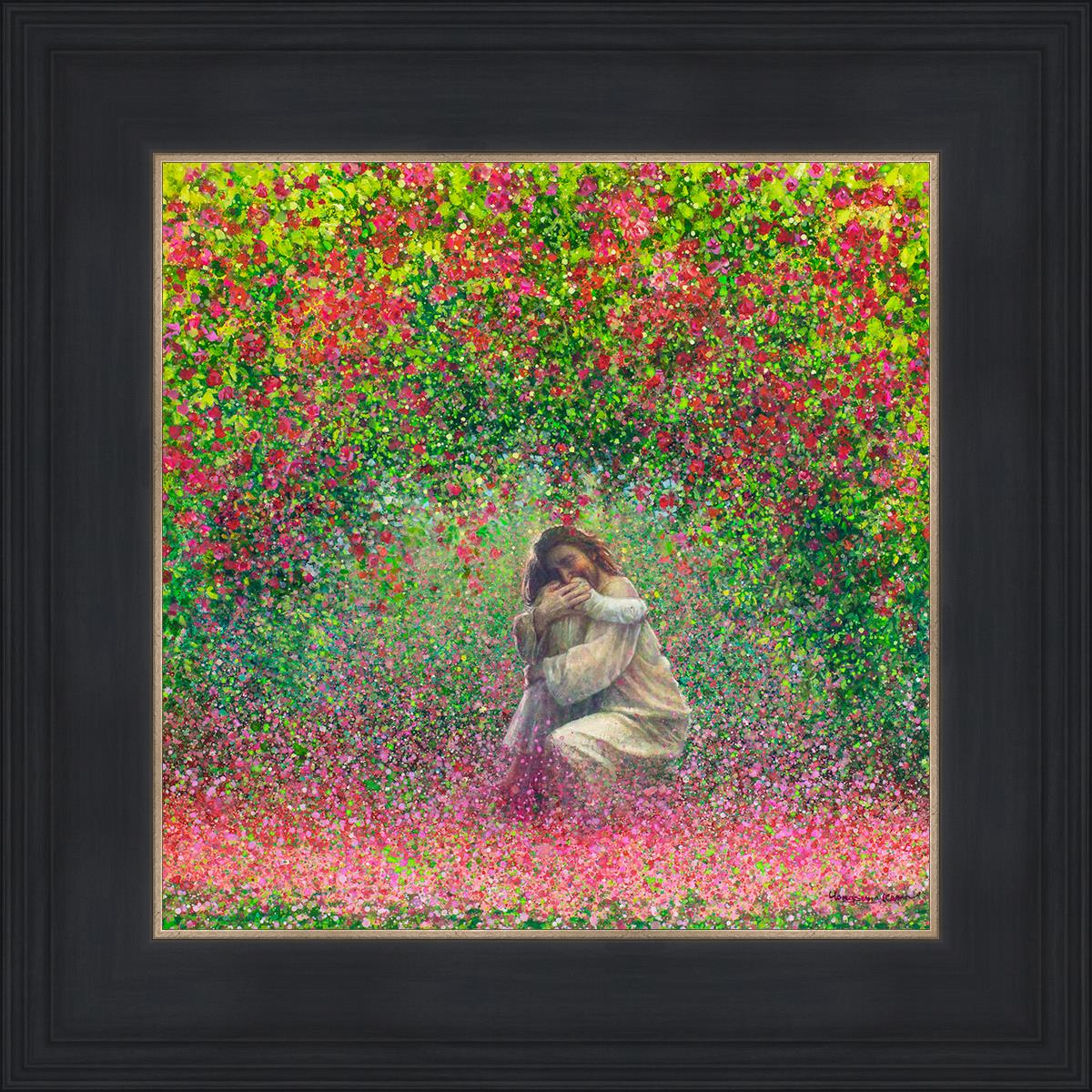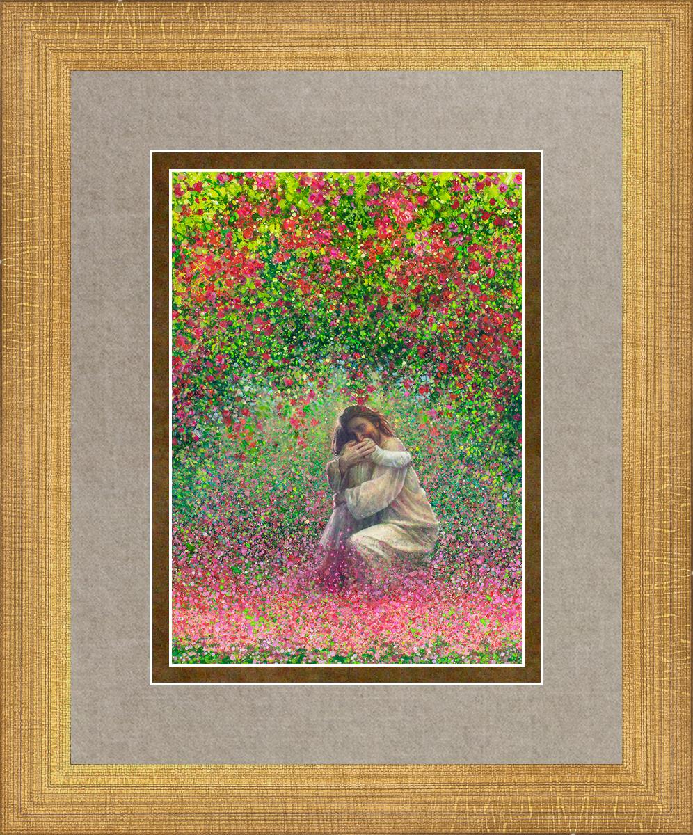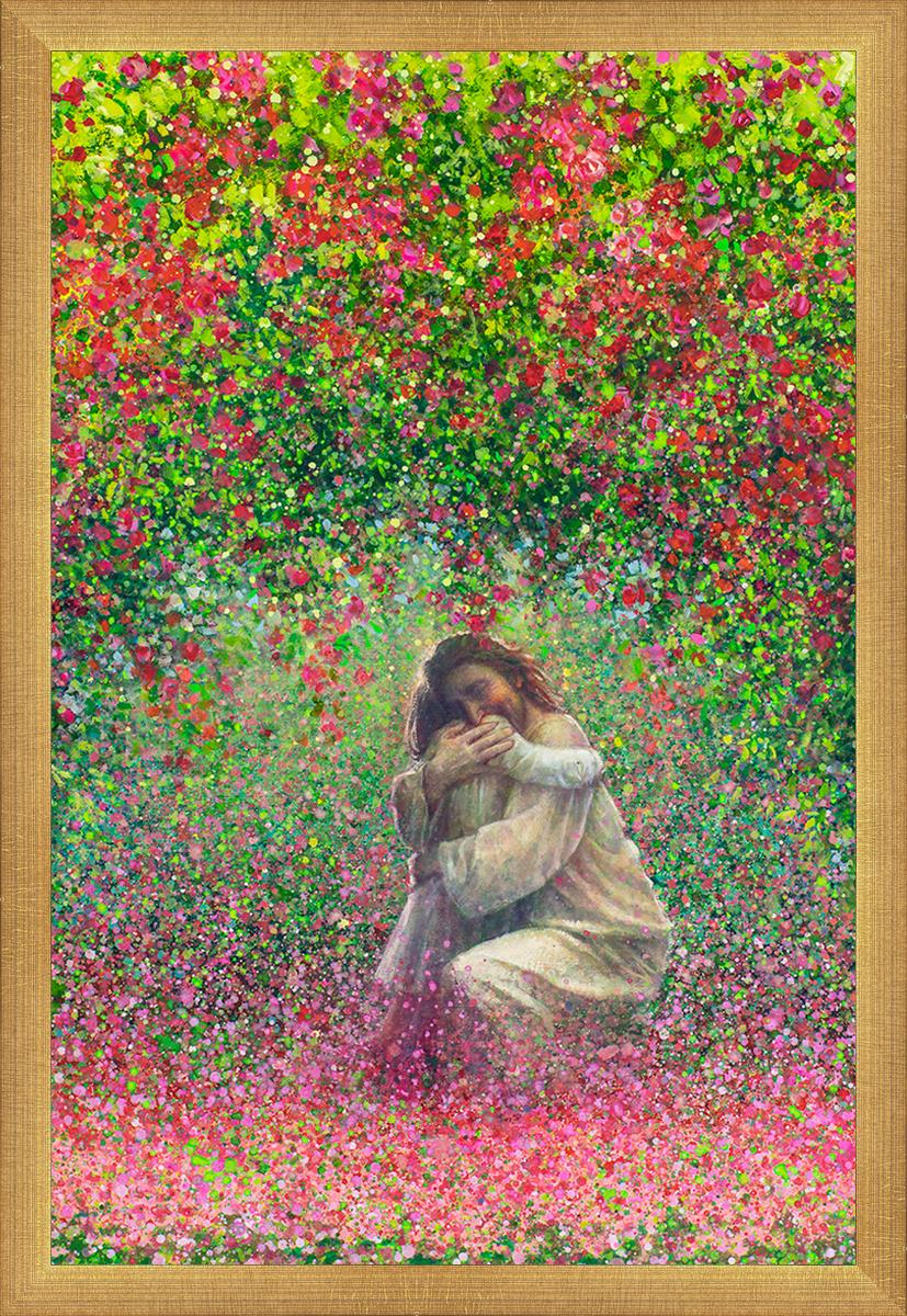 This painting is framed by a canopy of fragrant blossoms, their rich colors forming a beautiful, vibrant backdrop. In the center, Jesus Christ gently holds a little child, wrapping her in His protective embrace. His gentle, yet strong presence offers both reassurance and comfort, as His divine touch offers a profound sense of safety and peace. Here in My Arms invites viewers to reflect on the boundless love and protection Jesus offers to all His children.