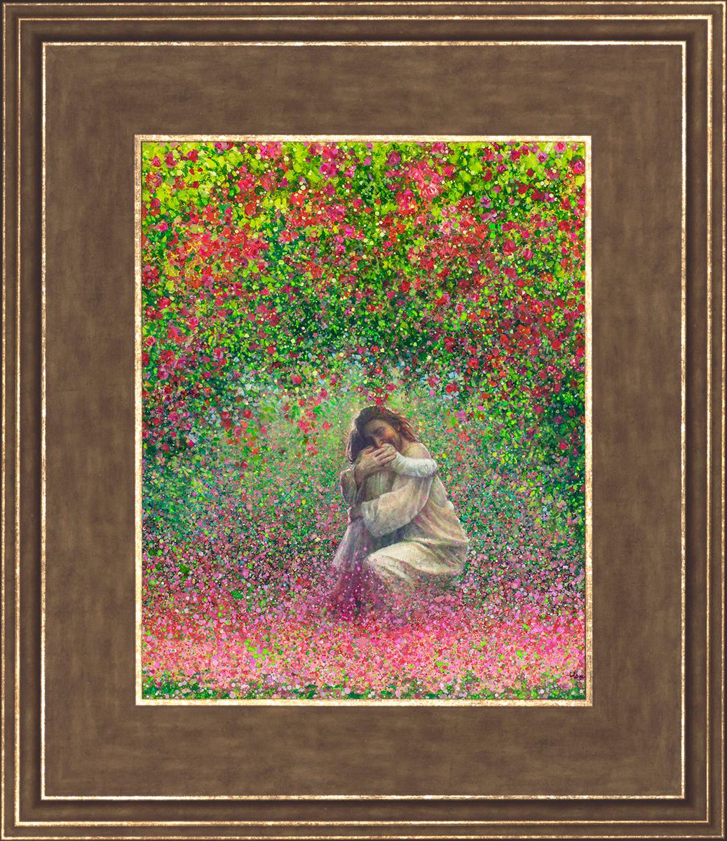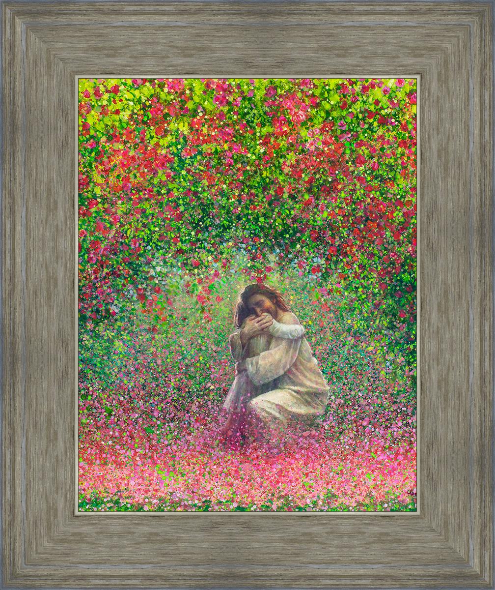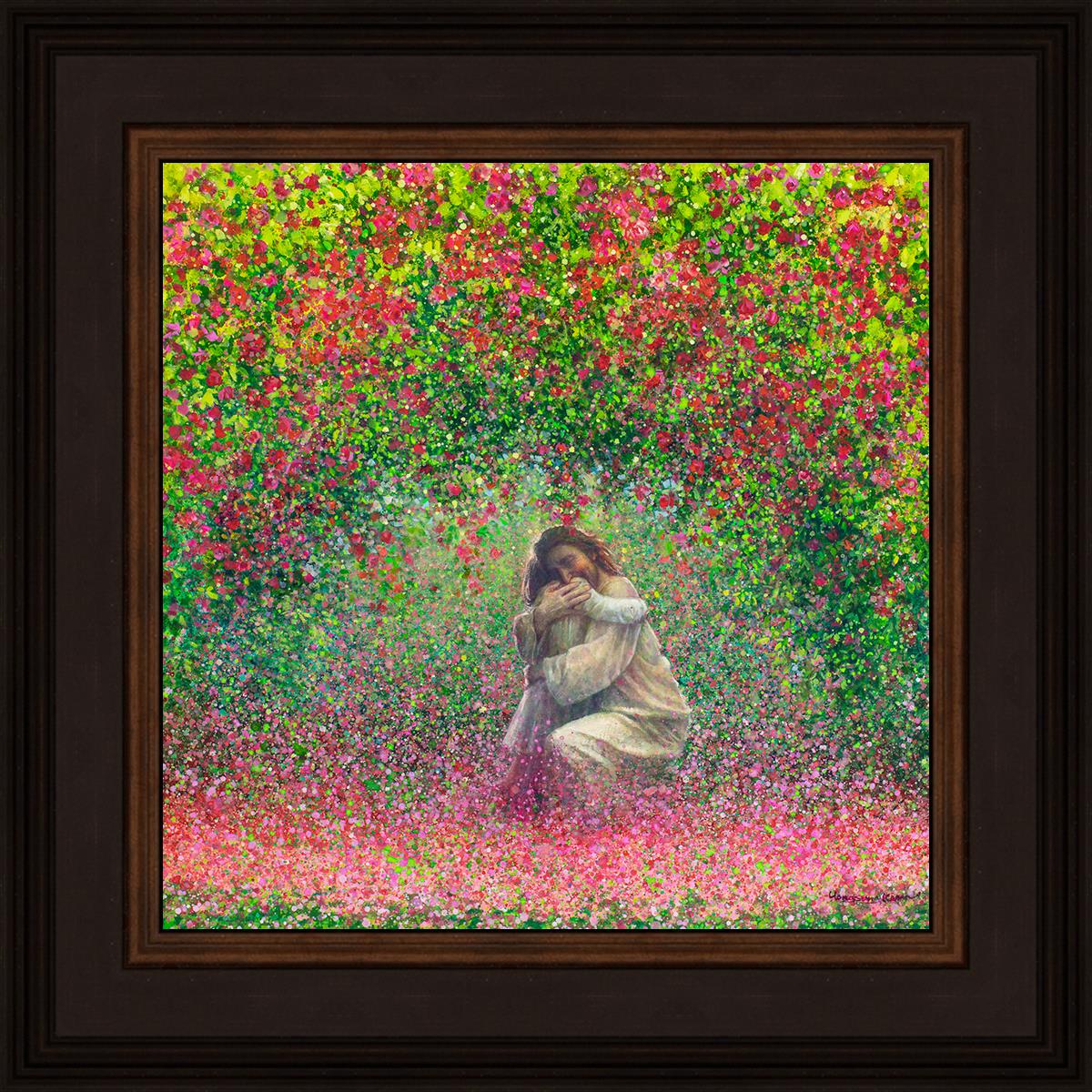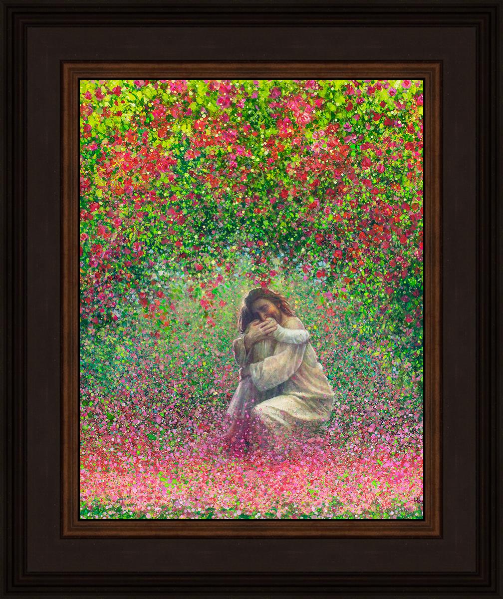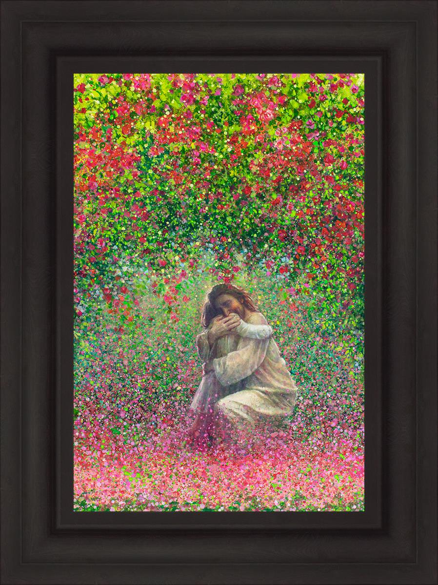 This painting is framed by a canopy of fragrant blossoms, their rich colors forming a beautiful, vibrant backdrop. In the center, Jesus Christ gently holds a little child, wrapping her in His protective embrace. His gentle, yet strong presence offers both reassurance and comfort, as His divine touch offers a profound sense of safety and peace. Here in My Arms invites viewers to reflect on the boundless love and protection Jesus offers to all His children.