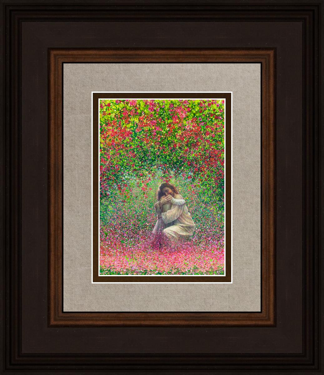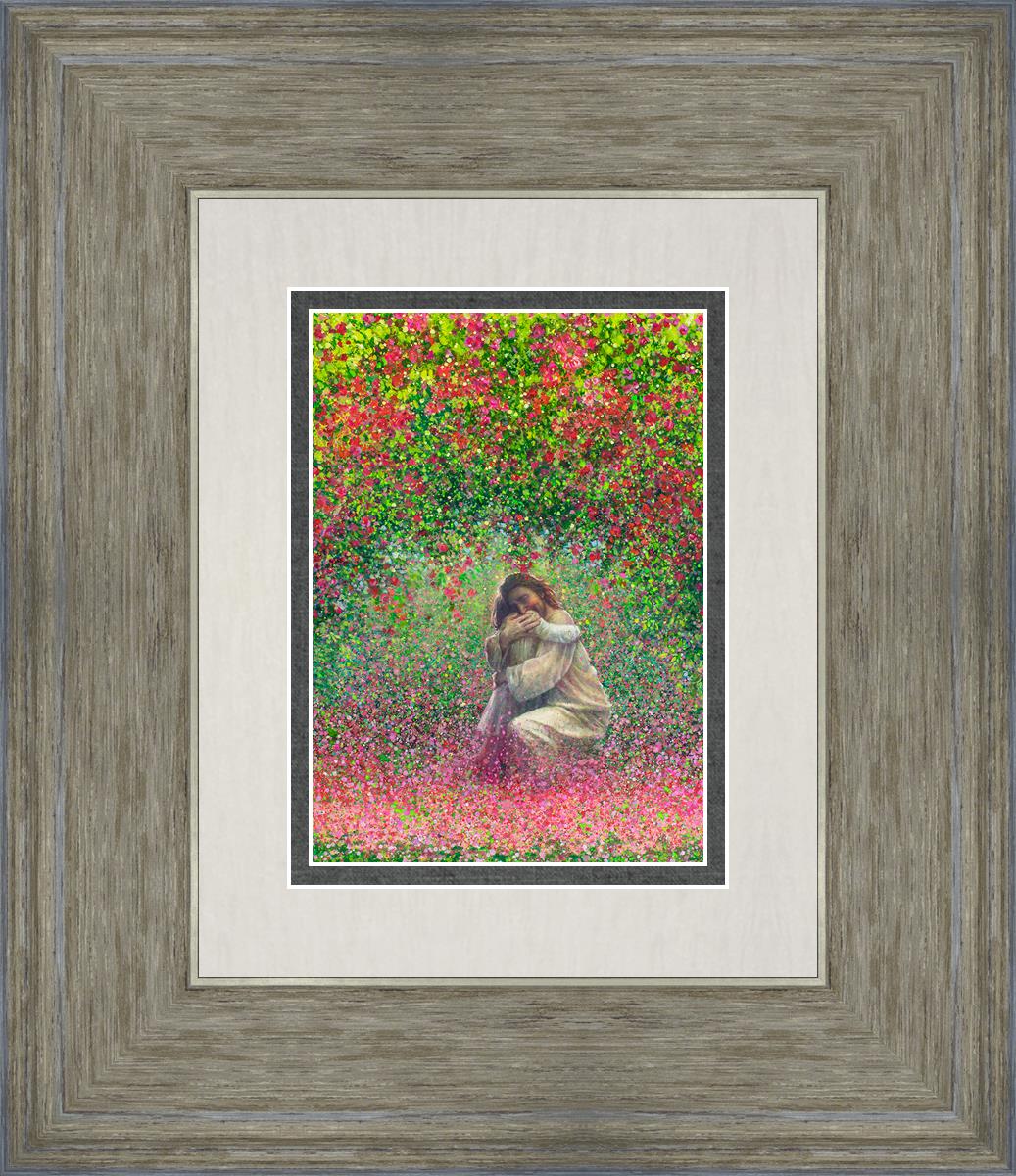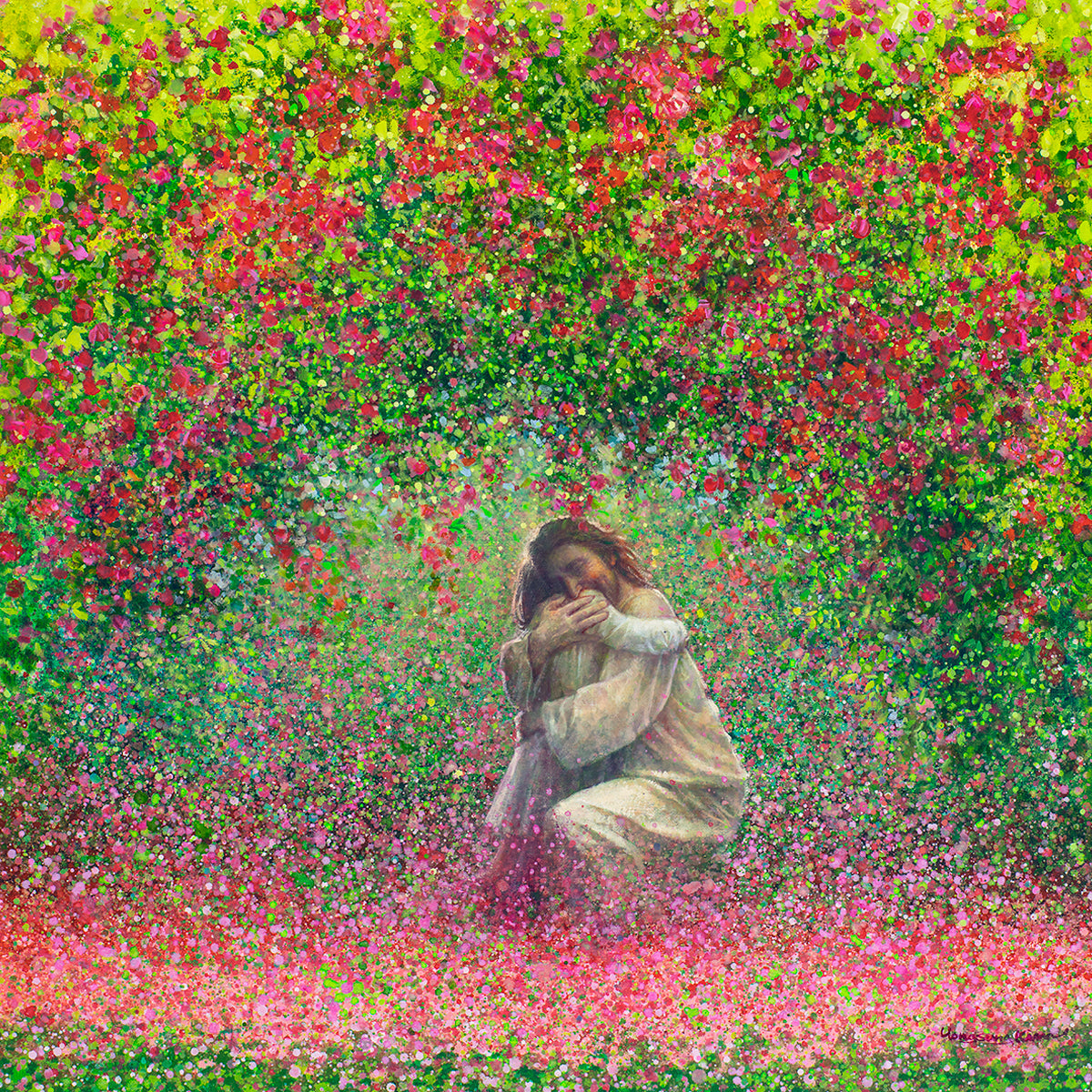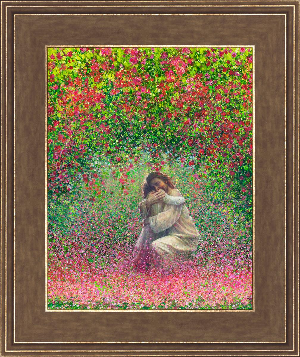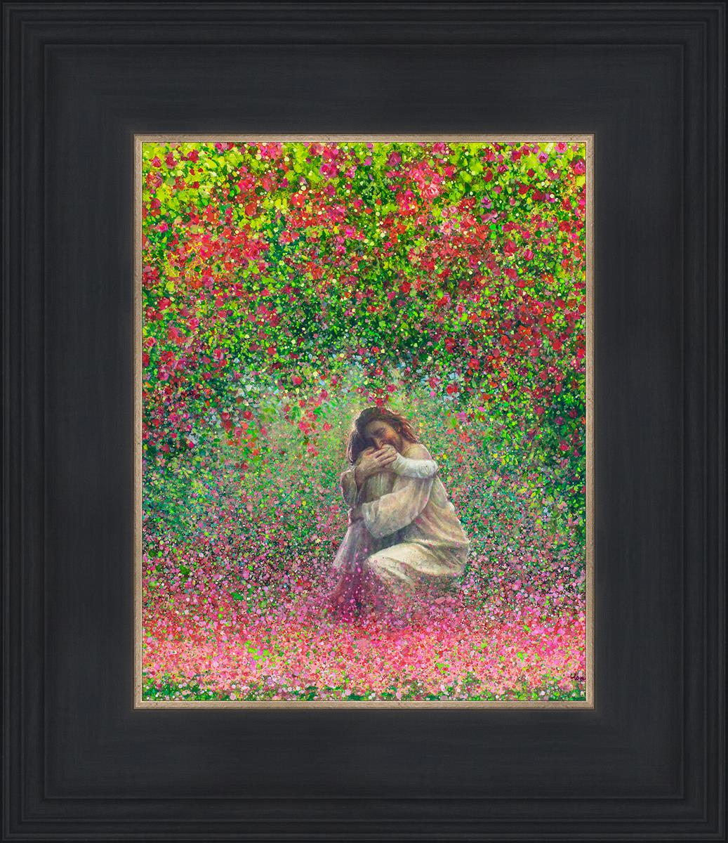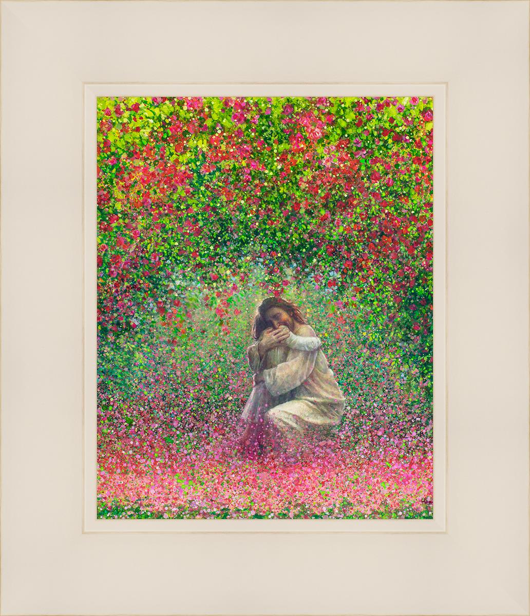 This painting is framed by a canopy of fragrant blossoms, their rich colors forming a beautiful, vibrant backdrop. In the center, Jesus Christ gently holds a little child, wrapping her in His protective embrace. His gentle, yet strong presence offers both reassurance and comfort, as His divine touch offers a profound sense of safety and peace. Here in My Arms invites viewers to reflect on the boundless love and protection Jesus offers to all His children.