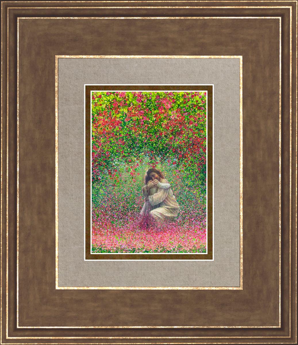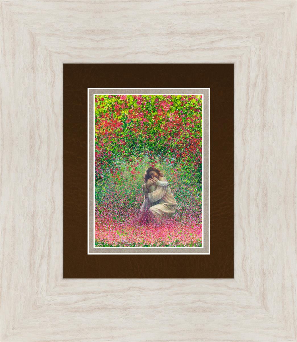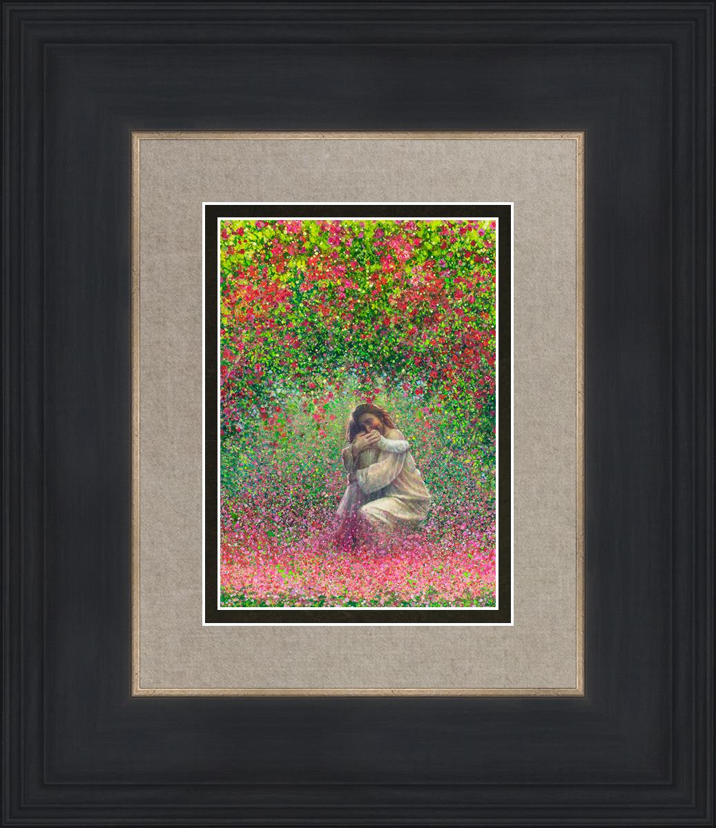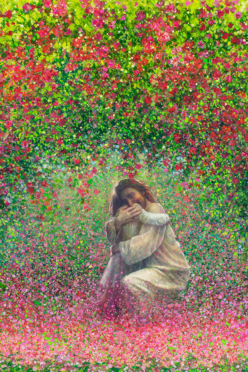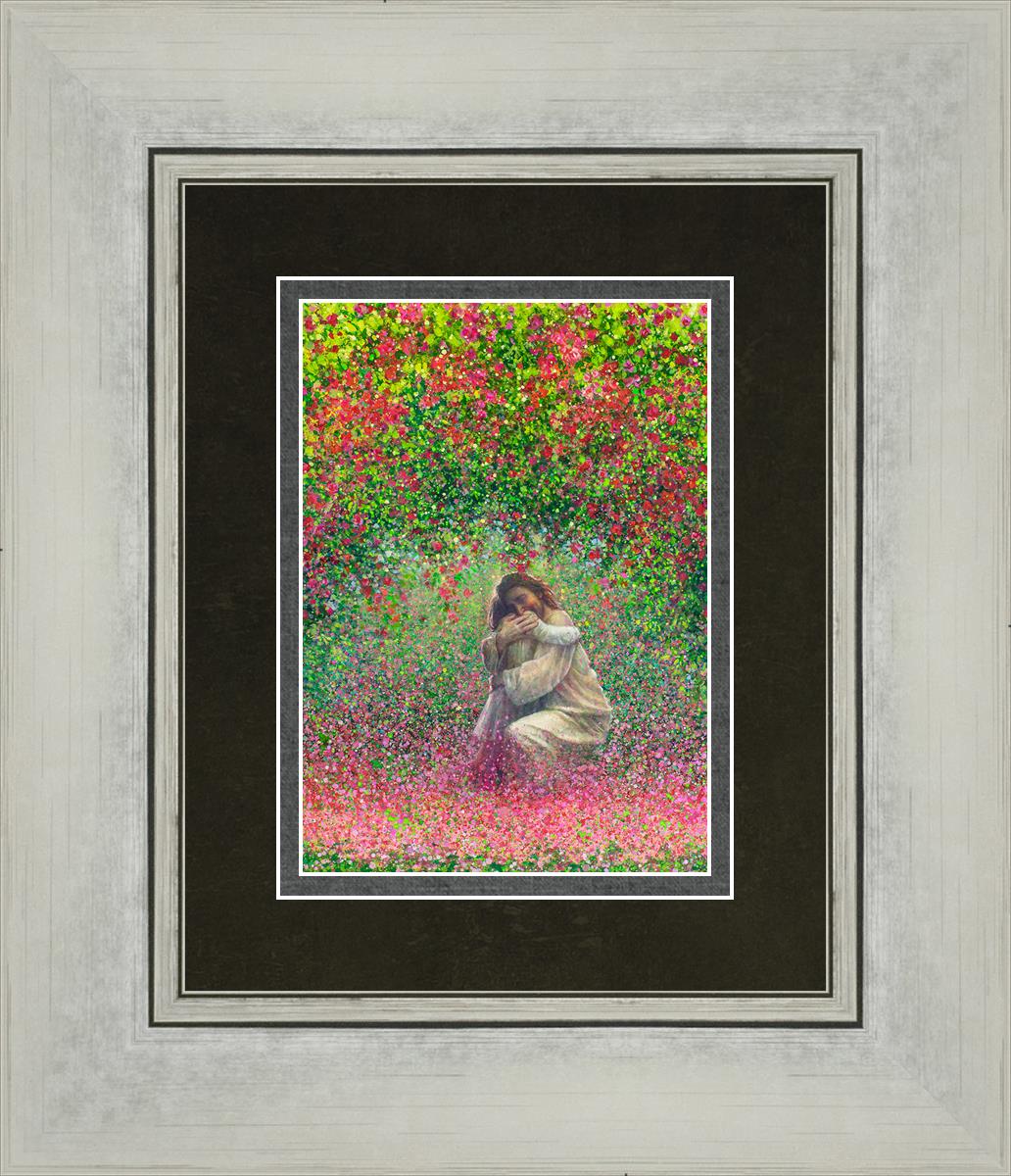 This painting is framed by a canopy of fragrant blossoms, their rich colors forming a beautiful, vibrant backdrop. In the center, Jesus Christ gently holds a little child, wrapping her in His protective embrace. His gentle, yet strong presence offers both reassurance and comfort, as His divine touch offers a profound sense of safety and peace. Here in My Arms invites viewers to reflect on the boundless love and protection Jesus offers to all His children.