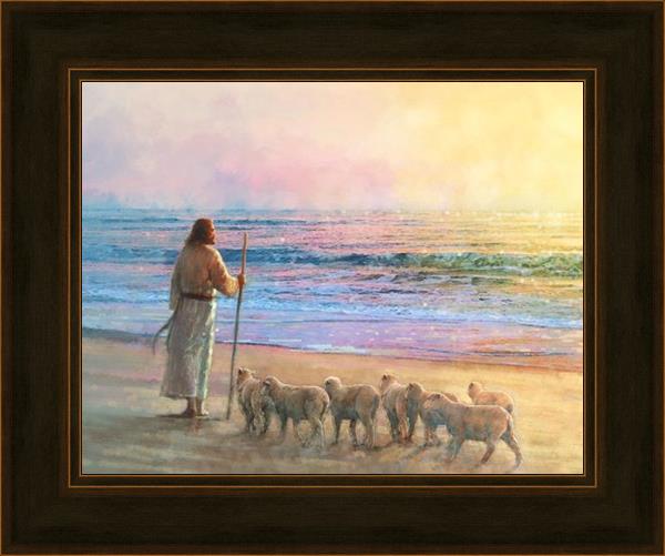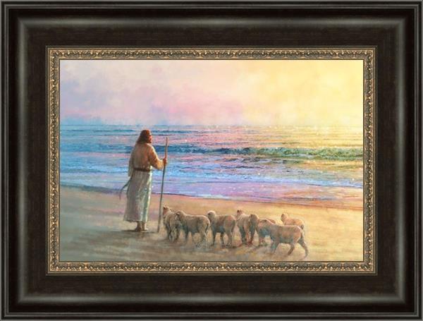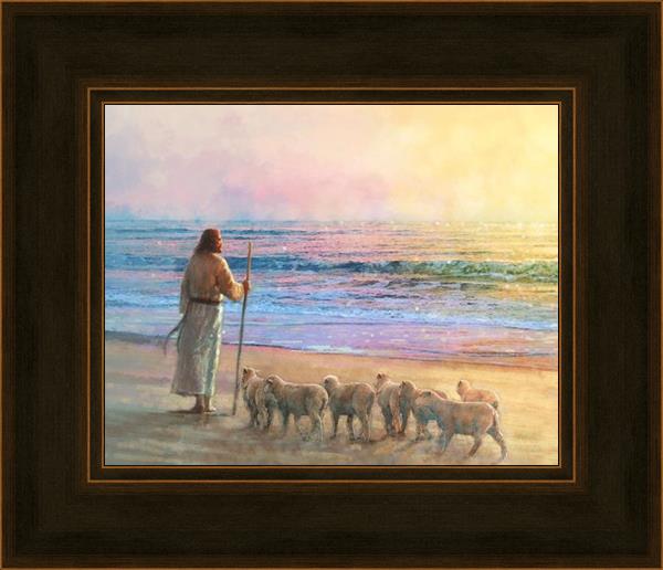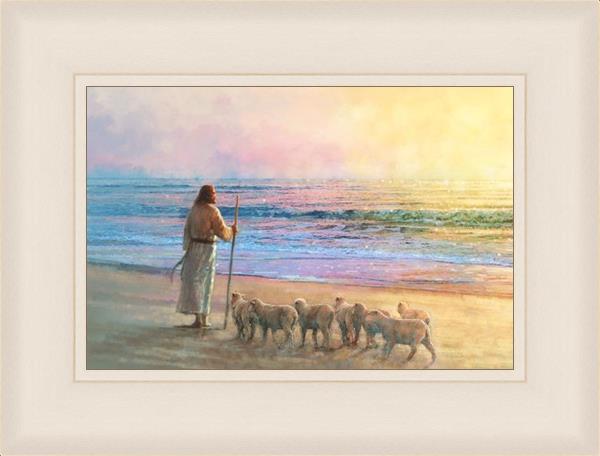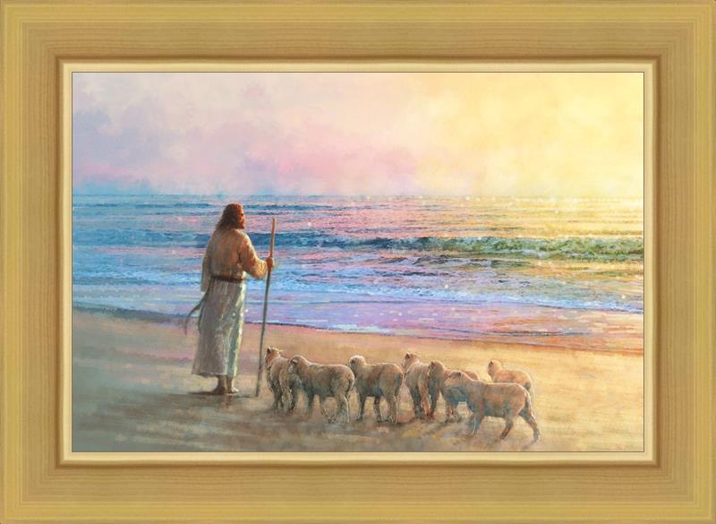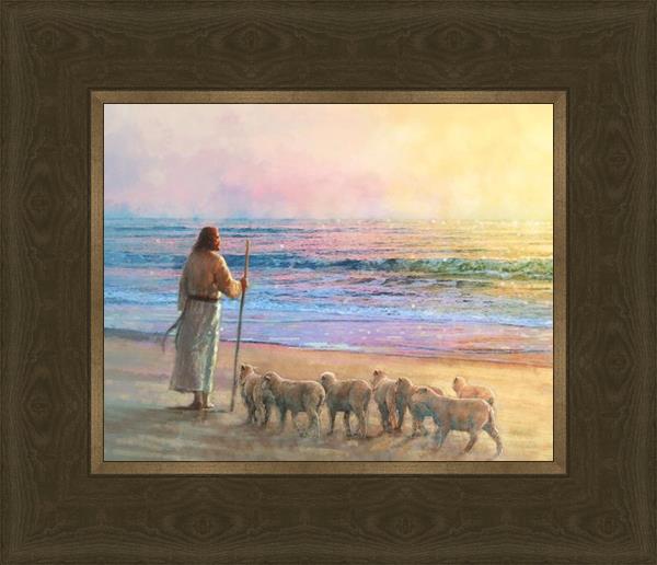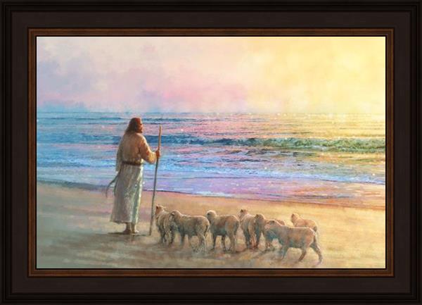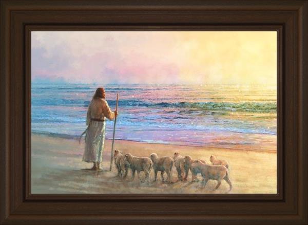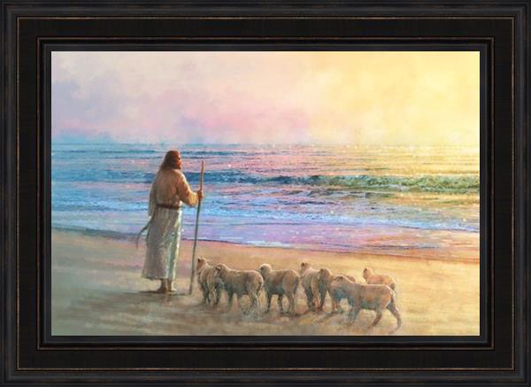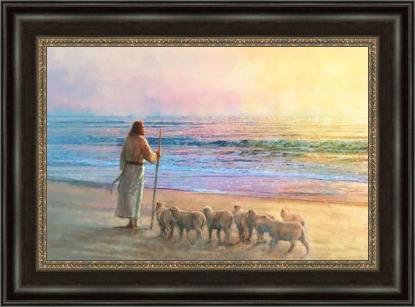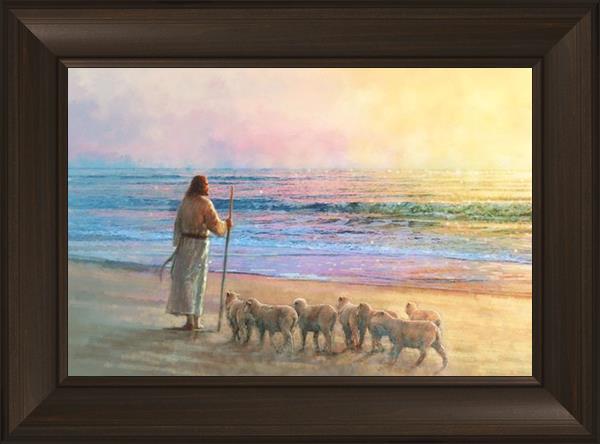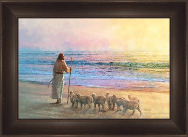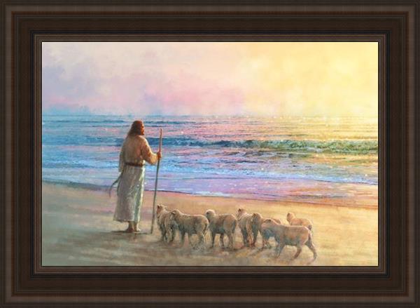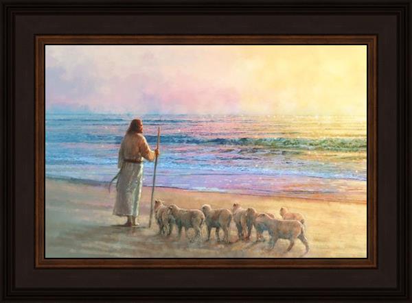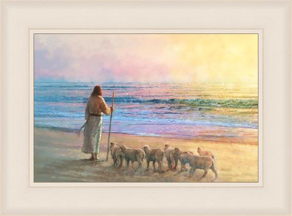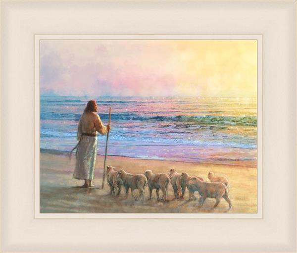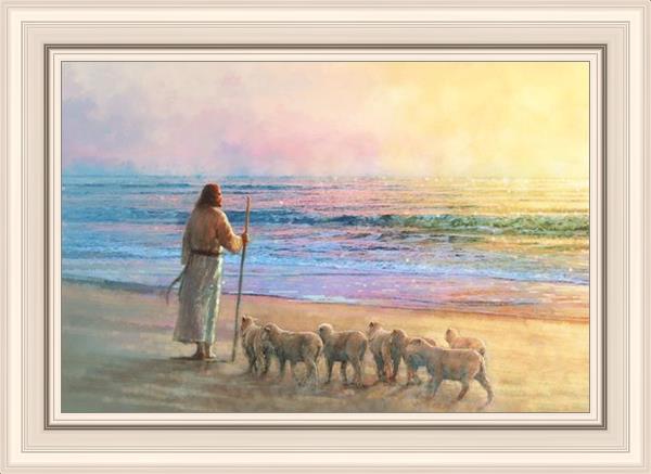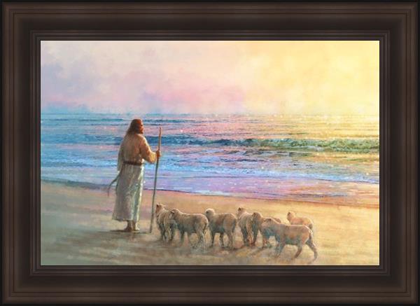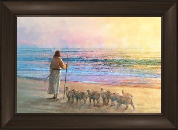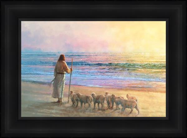 His Fold by Yongsung Kim depicts Jesus holding a staff and standing on the beach with several small lambs looking out over the sea towards sunset. This painting is available in print and canvas.