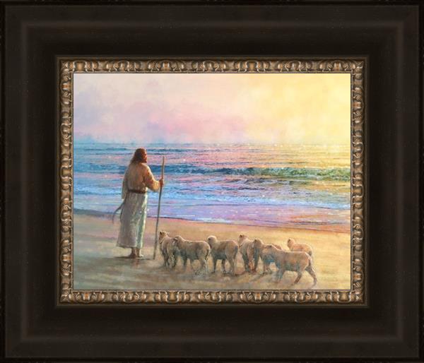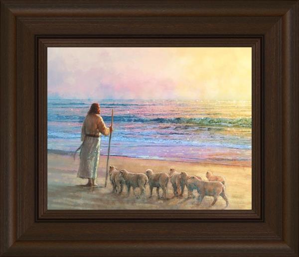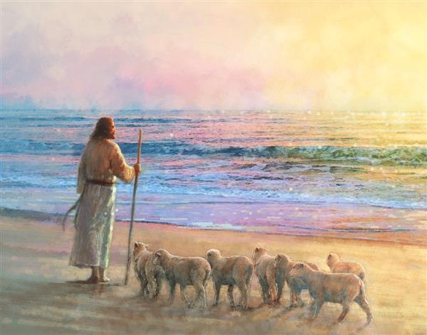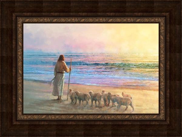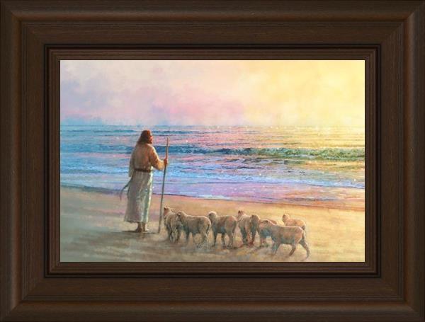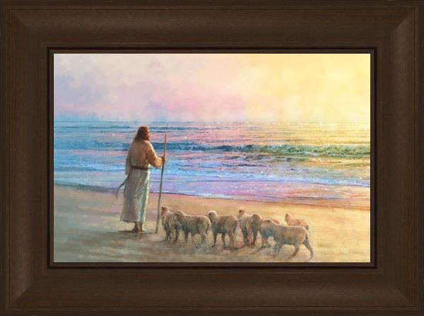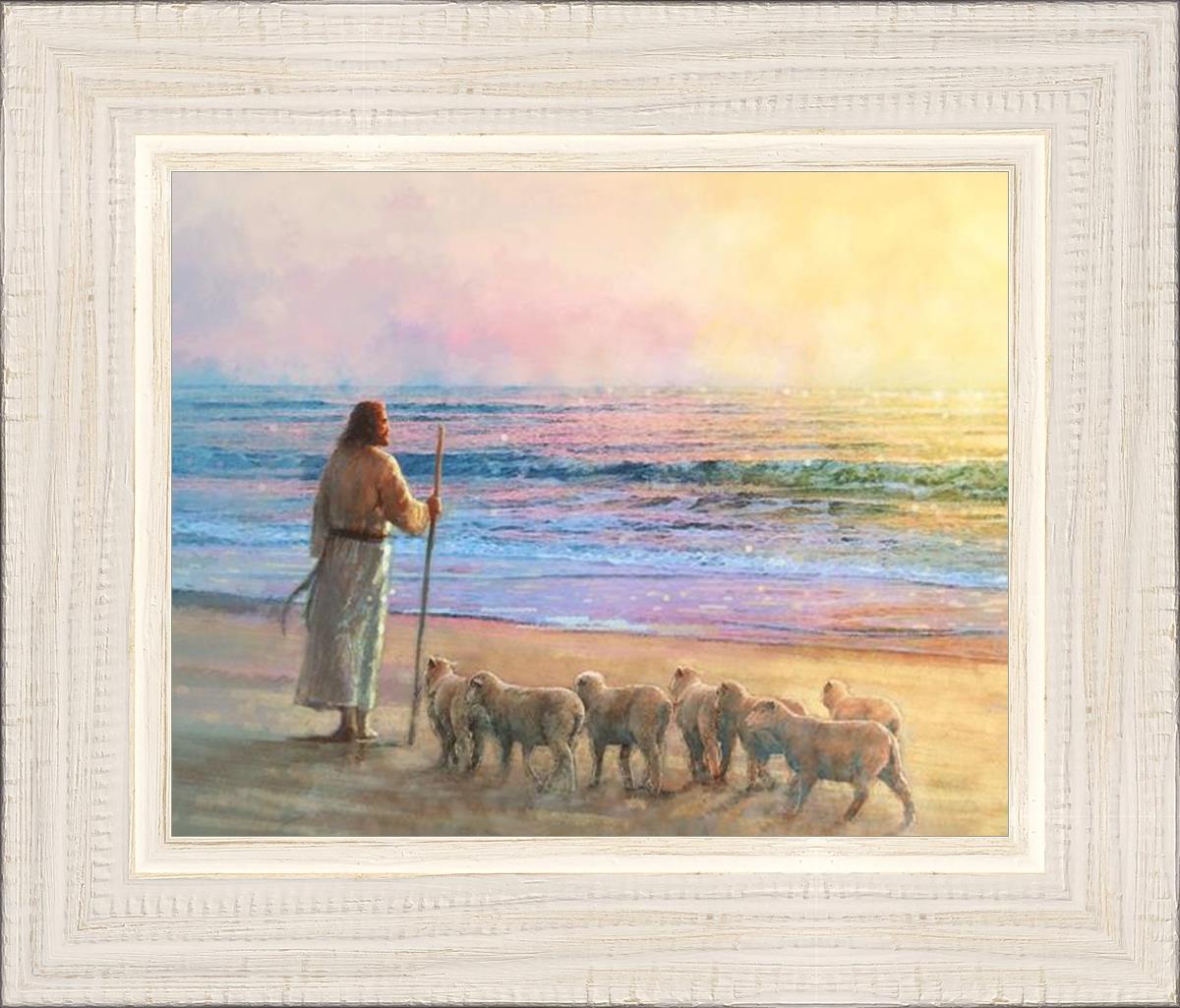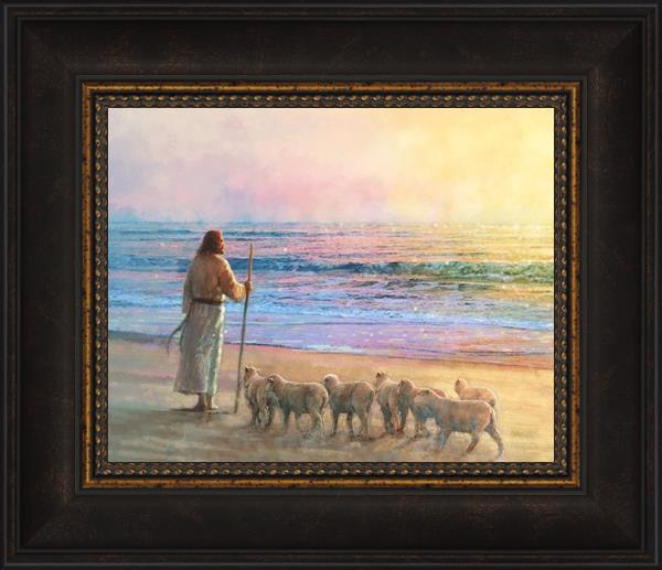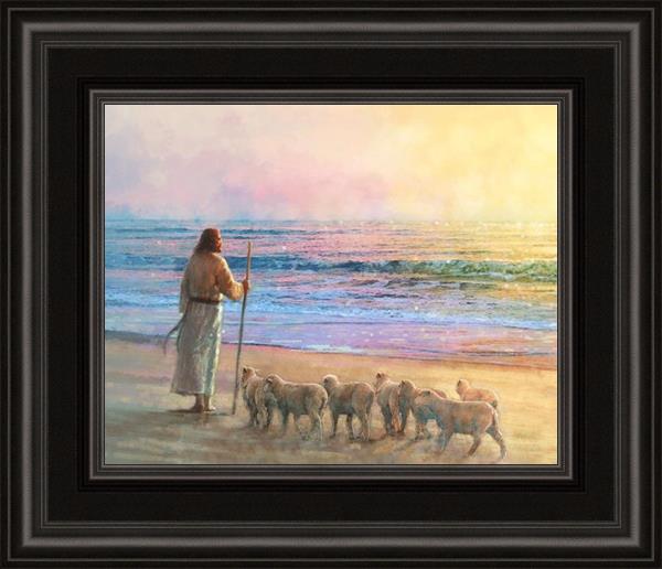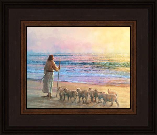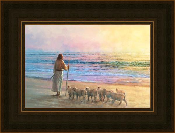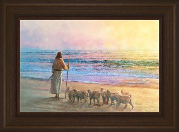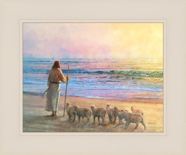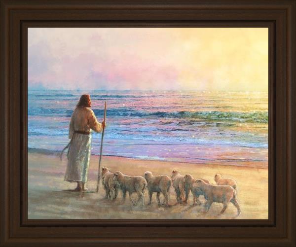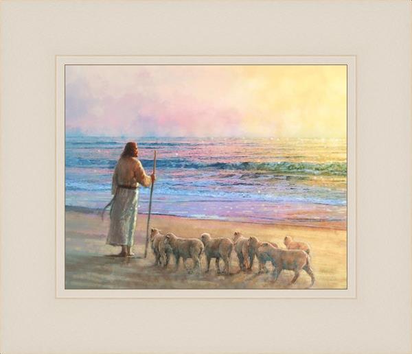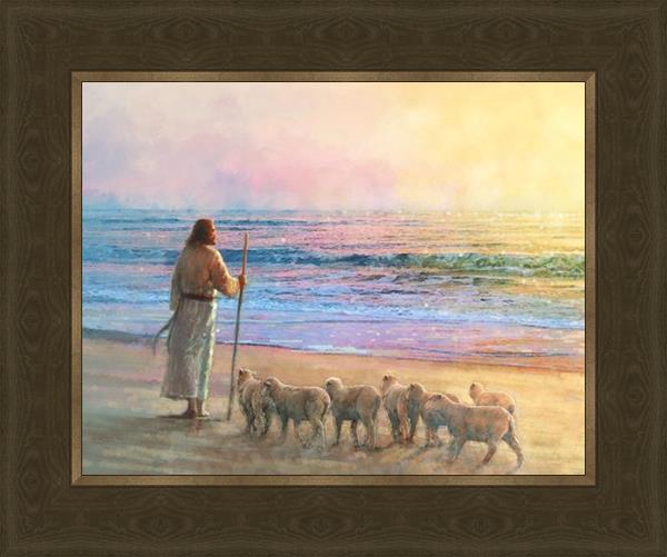His Fold by Yongsung Kim depicts Jesus holding a staff and standing on the beach with several small lambs looking out over the sea towards sunset. This painting is available in print and canvas.