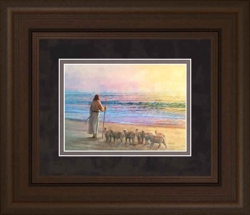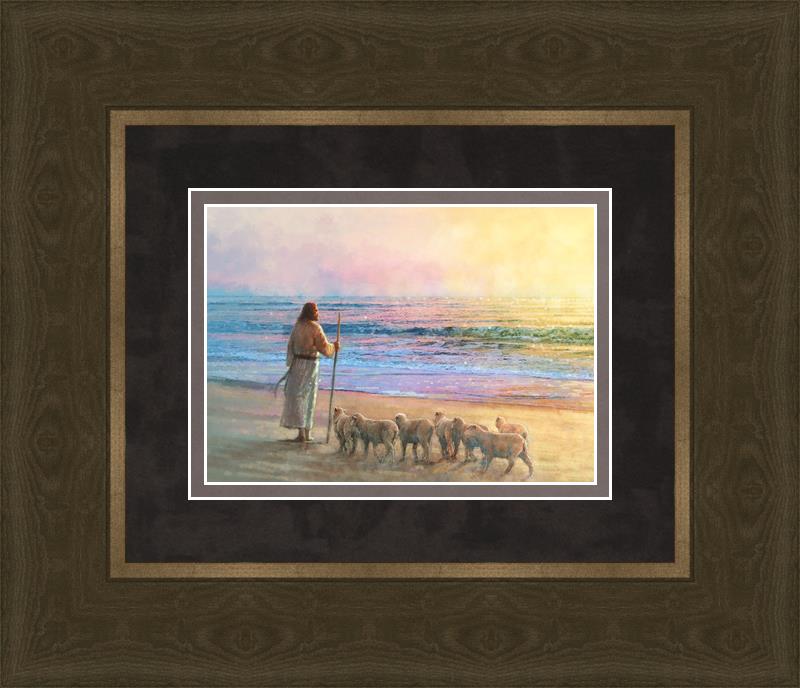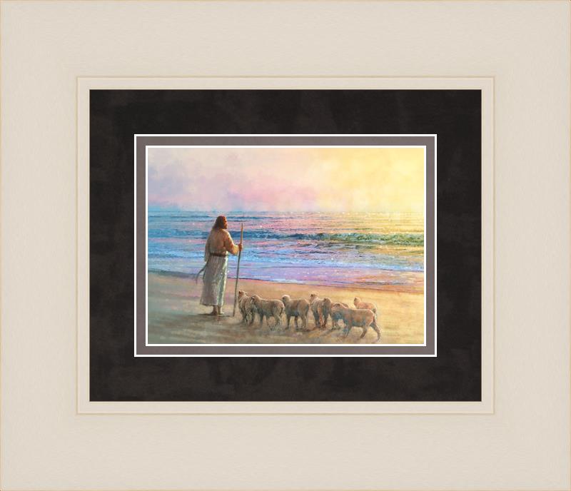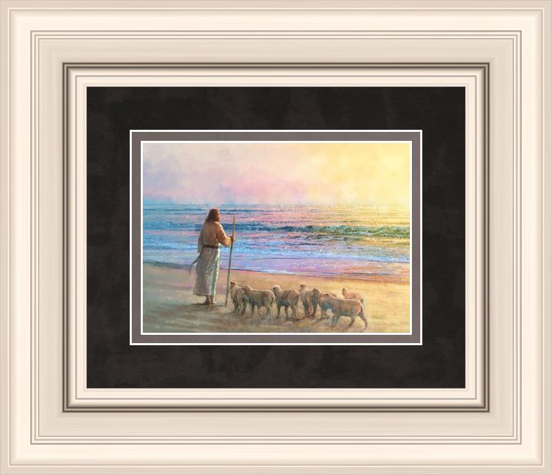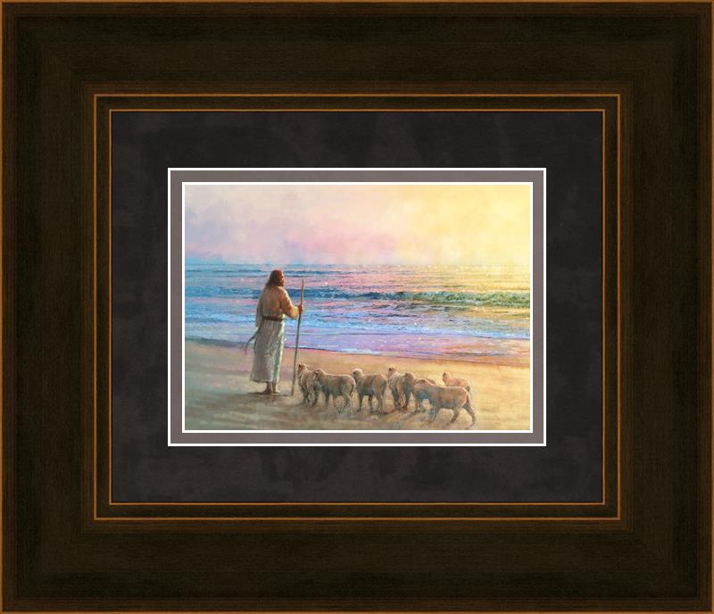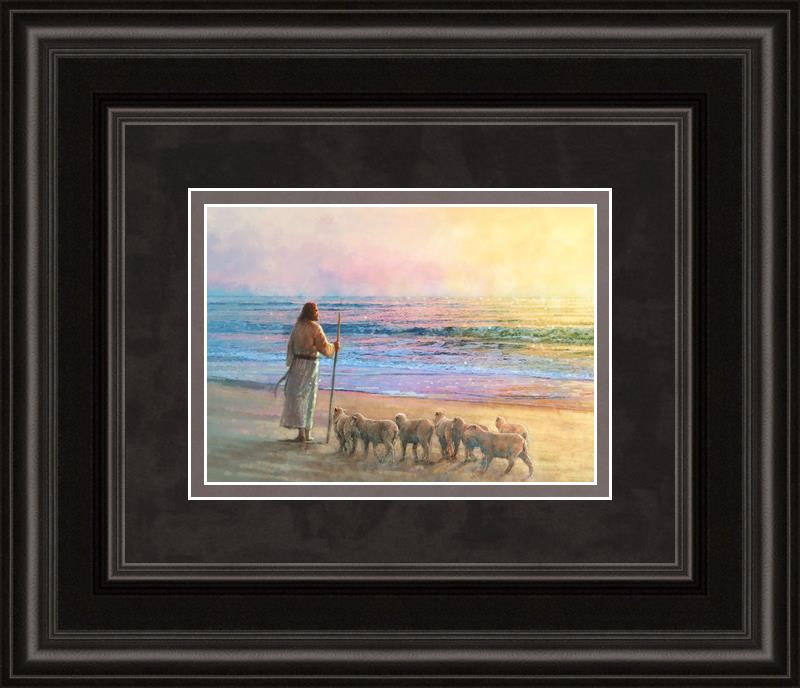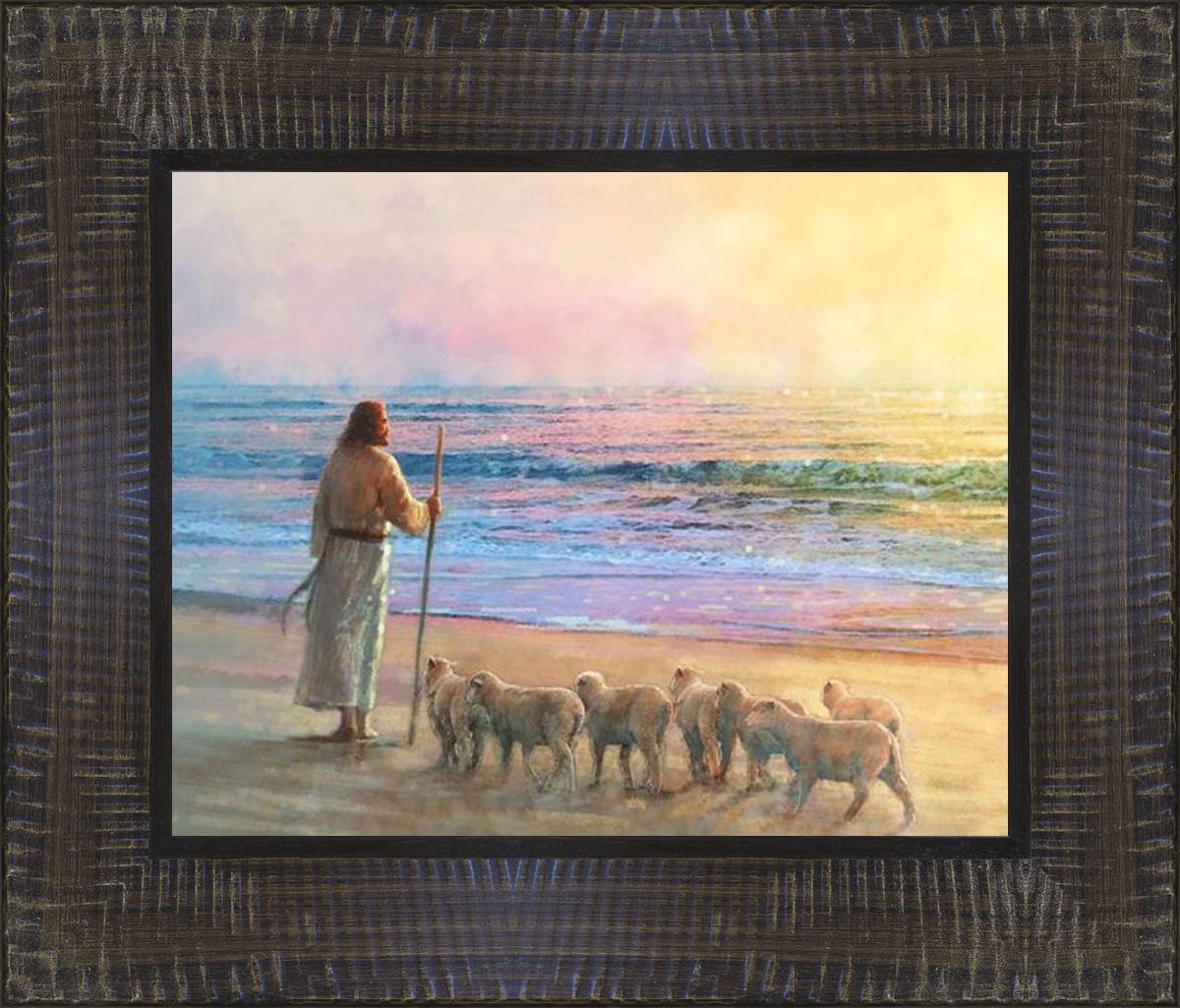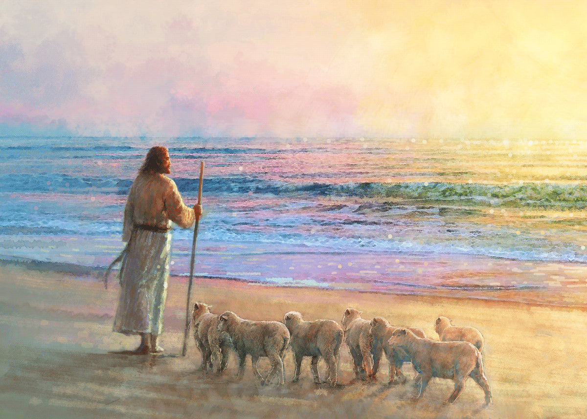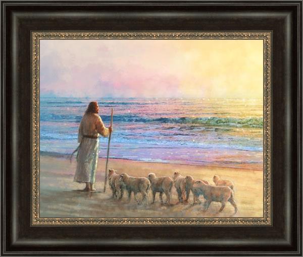 His Fold by Yongsung Kim depicts Jesus holding a staff and standing on the beach with several small lambs looking out over the sea towards sunset. This painting is available in print and canvas.