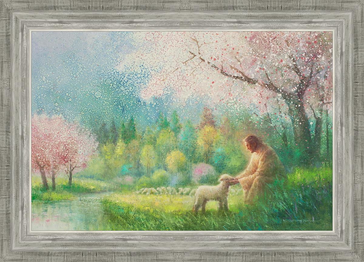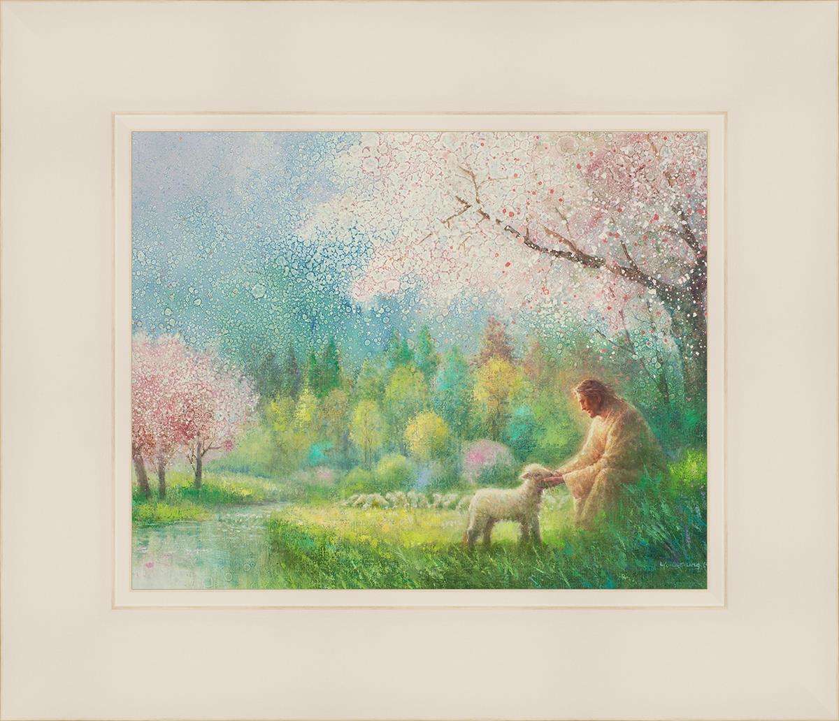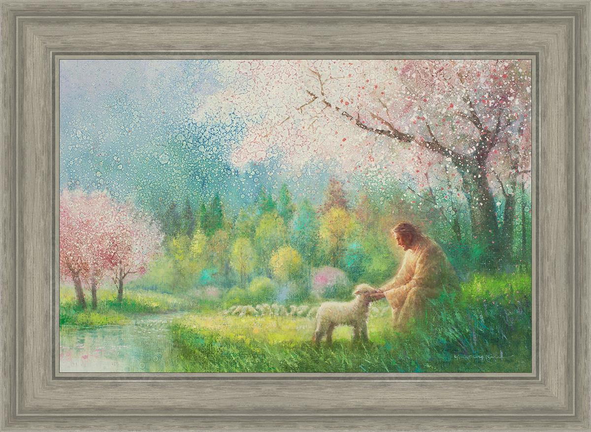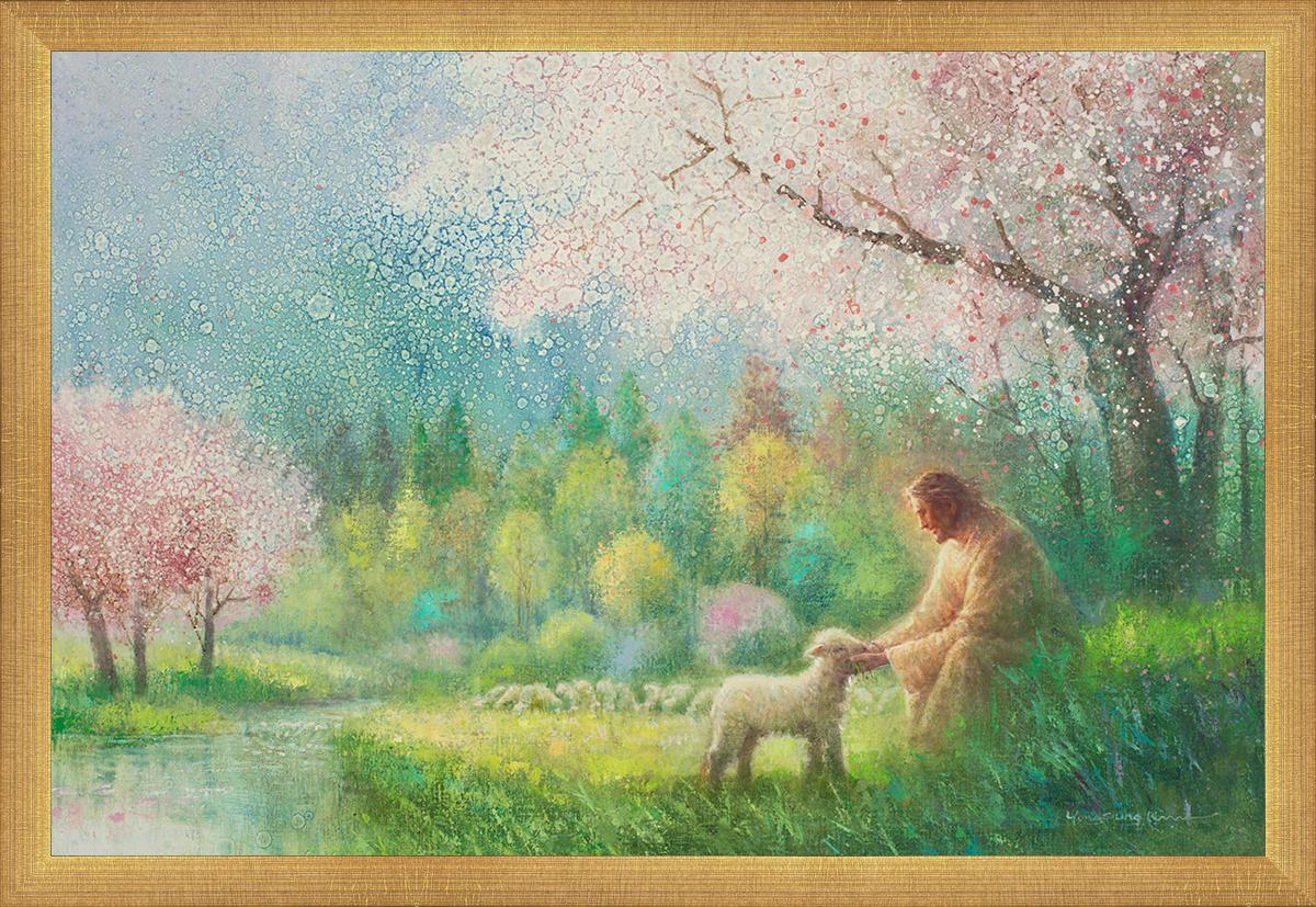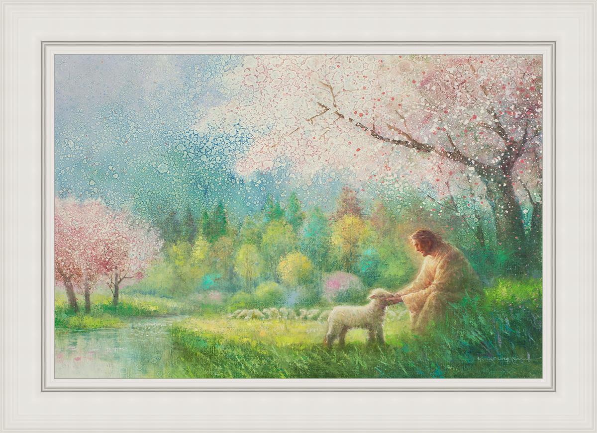 With a compassionate gaze, Jesus sits offering comfort and reassurance to a vulnerable and innocent spring lamb. The surrounding scenery is an explosion of colors and life, where blossoms of every hue blanket the earth, their vibrant petals echoing the joy and renewal of the season. Yongsung Kim invites viewers to find solace and renewal in the tender care of Christ.