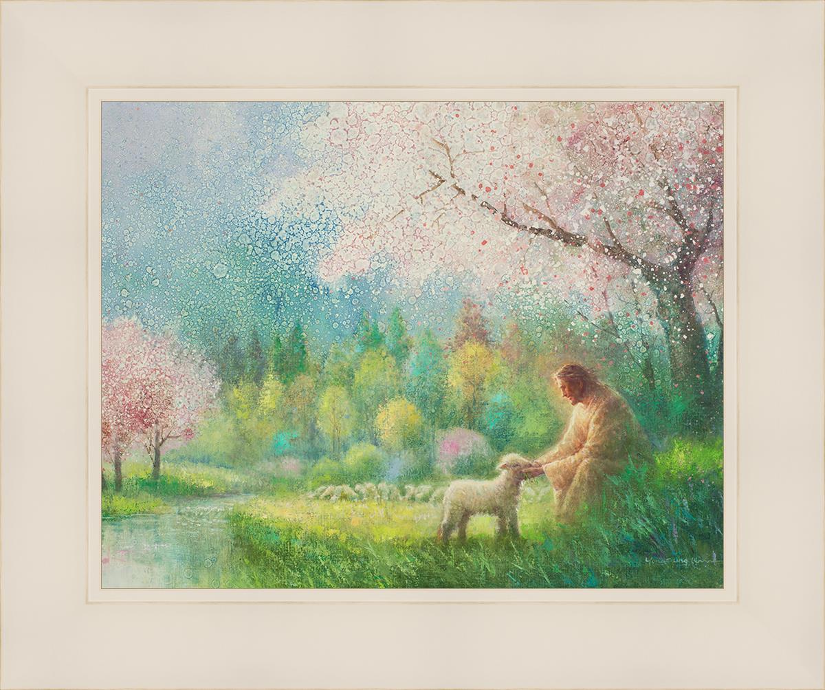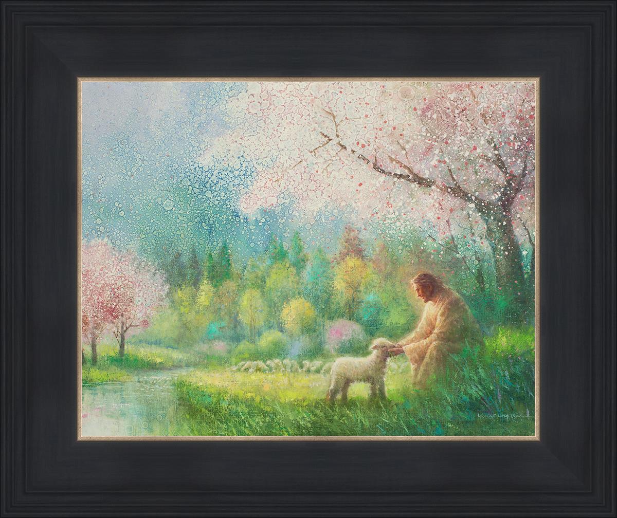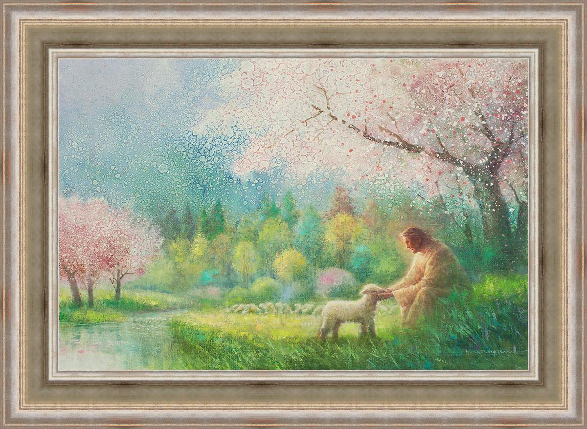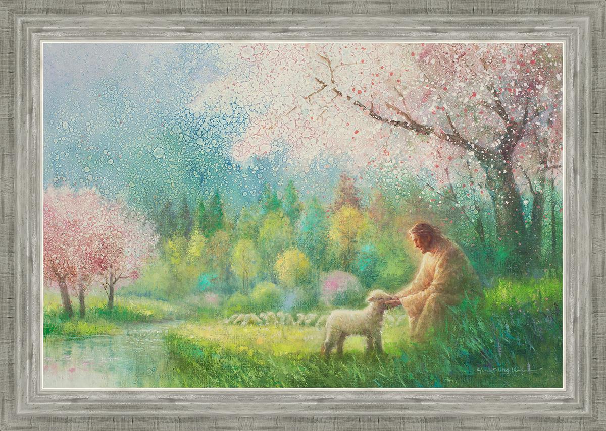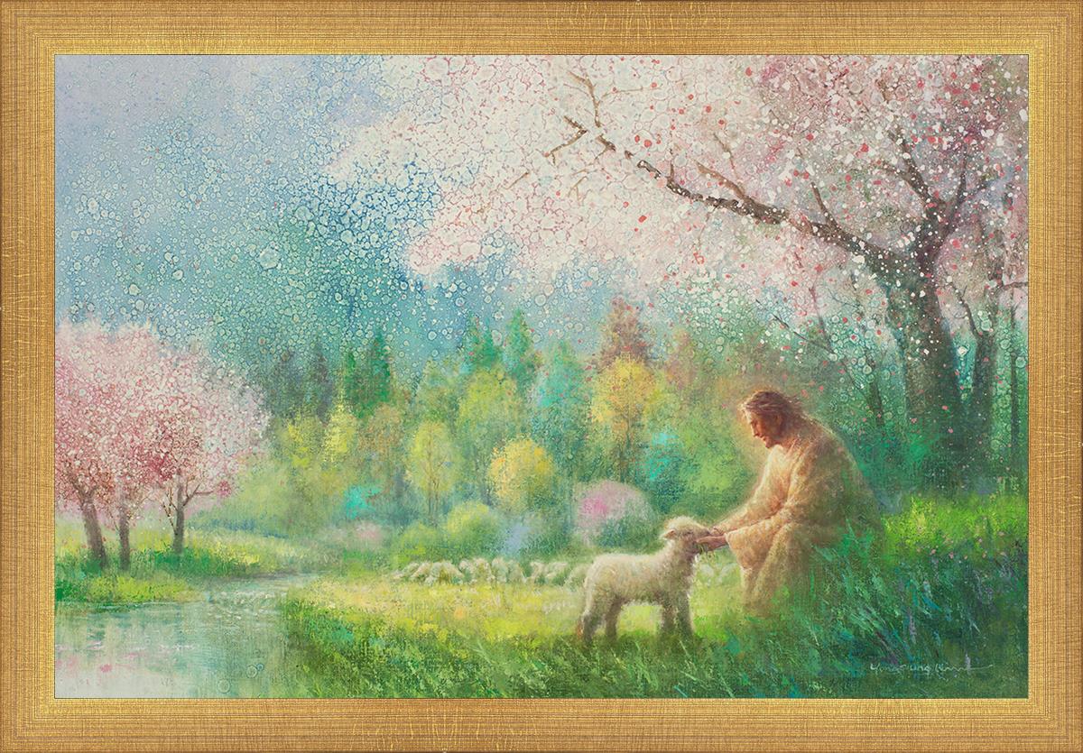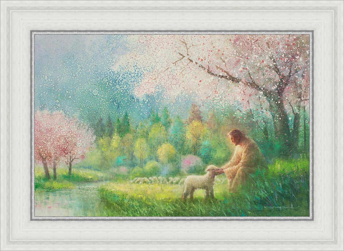 With a compassionate gaze, Jesus sits offering comfort and reassurance to a vulnerable and innocent spring lamb. The surrounding scenery is an explosion of colors and life, where blossoms of every hue blanket the earth, their vibrant petals echoing the joy and renewal of the season. Yongsung Kim invites viewers to find solace and renewal in the tender care of Christ.