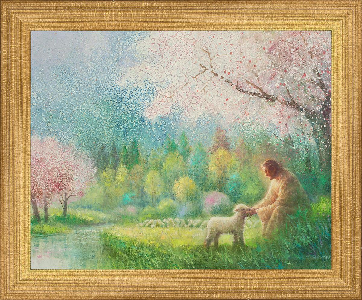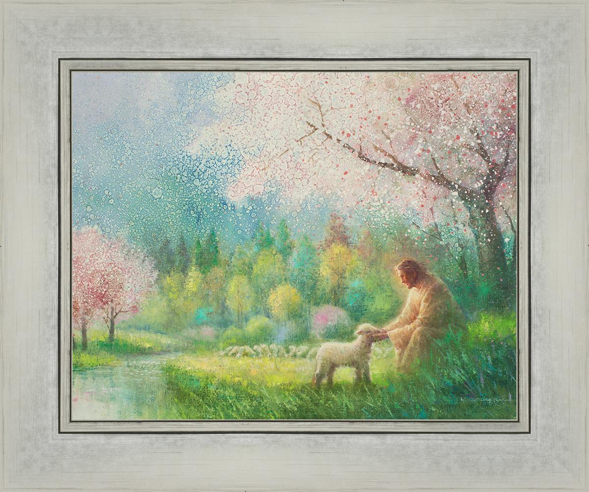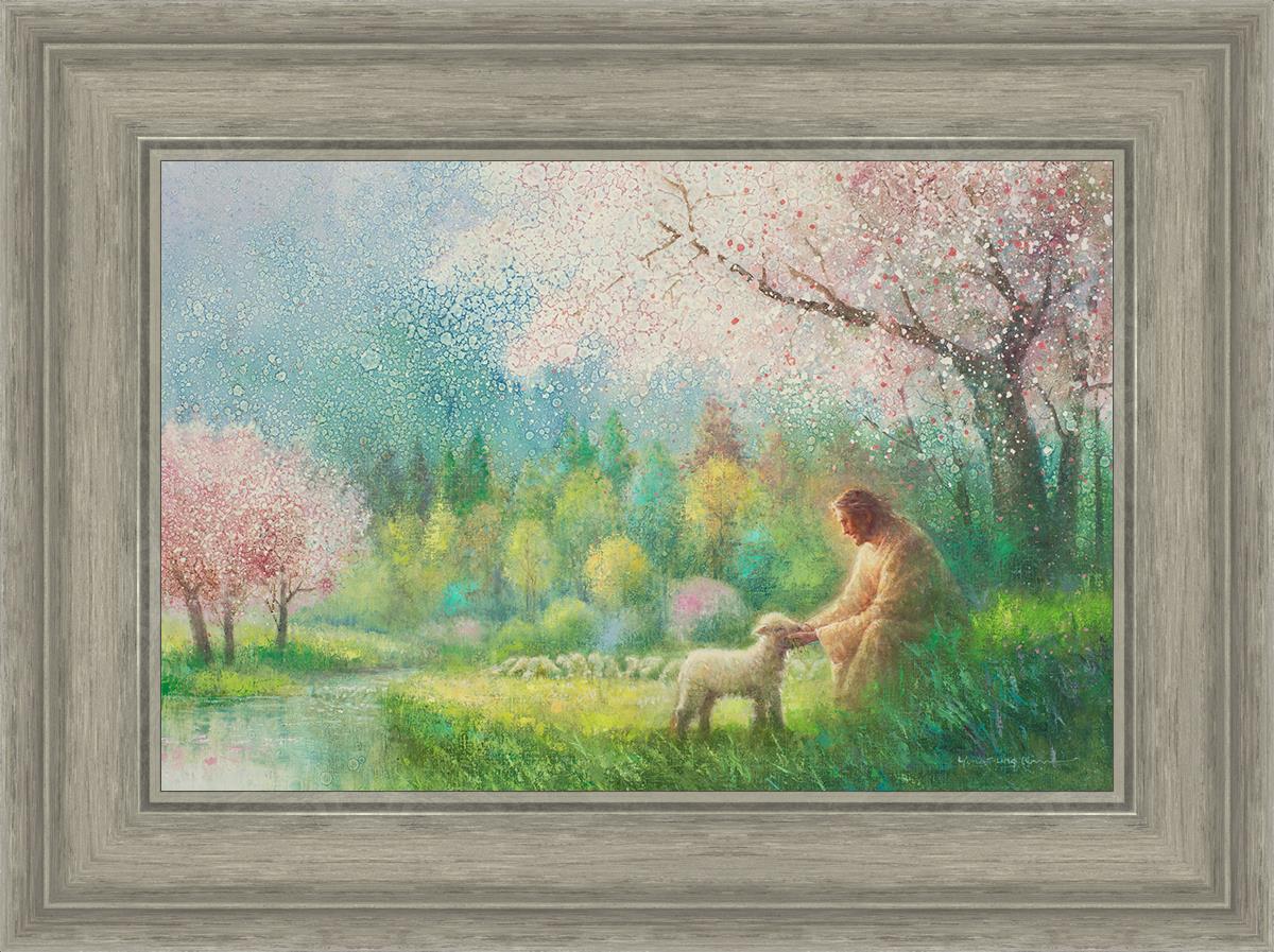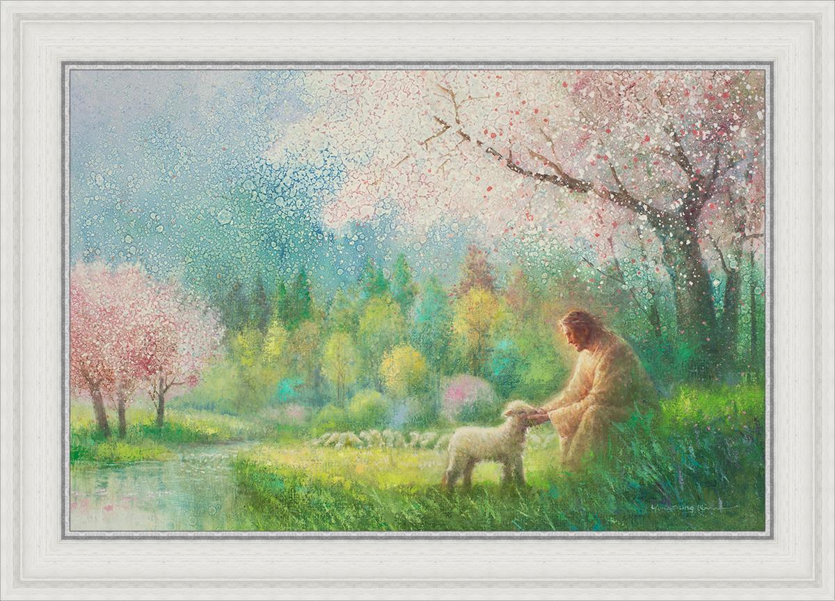 With a compassionate gaze, Jesus sits offering comfort and reassurance to a vulnerable and innocent spring lamb. The surrounding scenery is an explosion of colors and life, where blossoms of every hue blanket the earth, their vibrant petals echoing the joy and renewal of the season. Yongsung Kim invites viewers to find solace and renewal in the tender care of Christ.