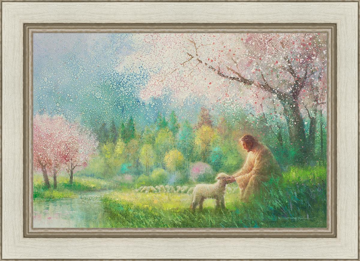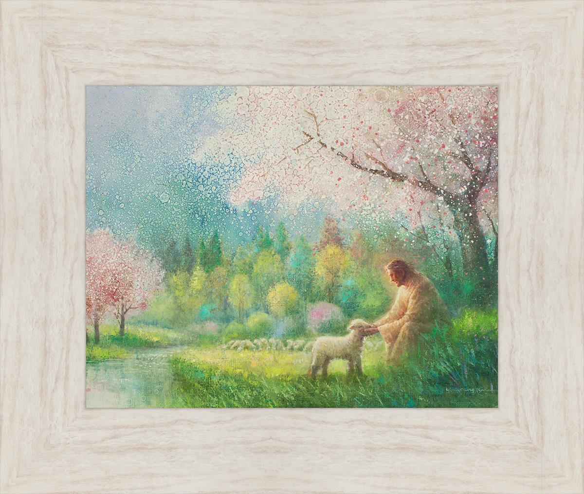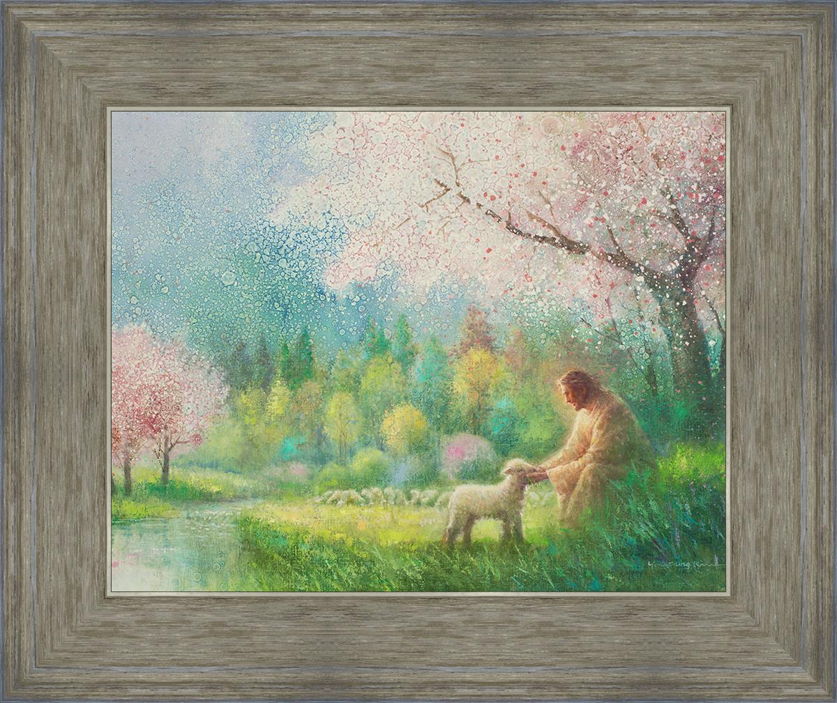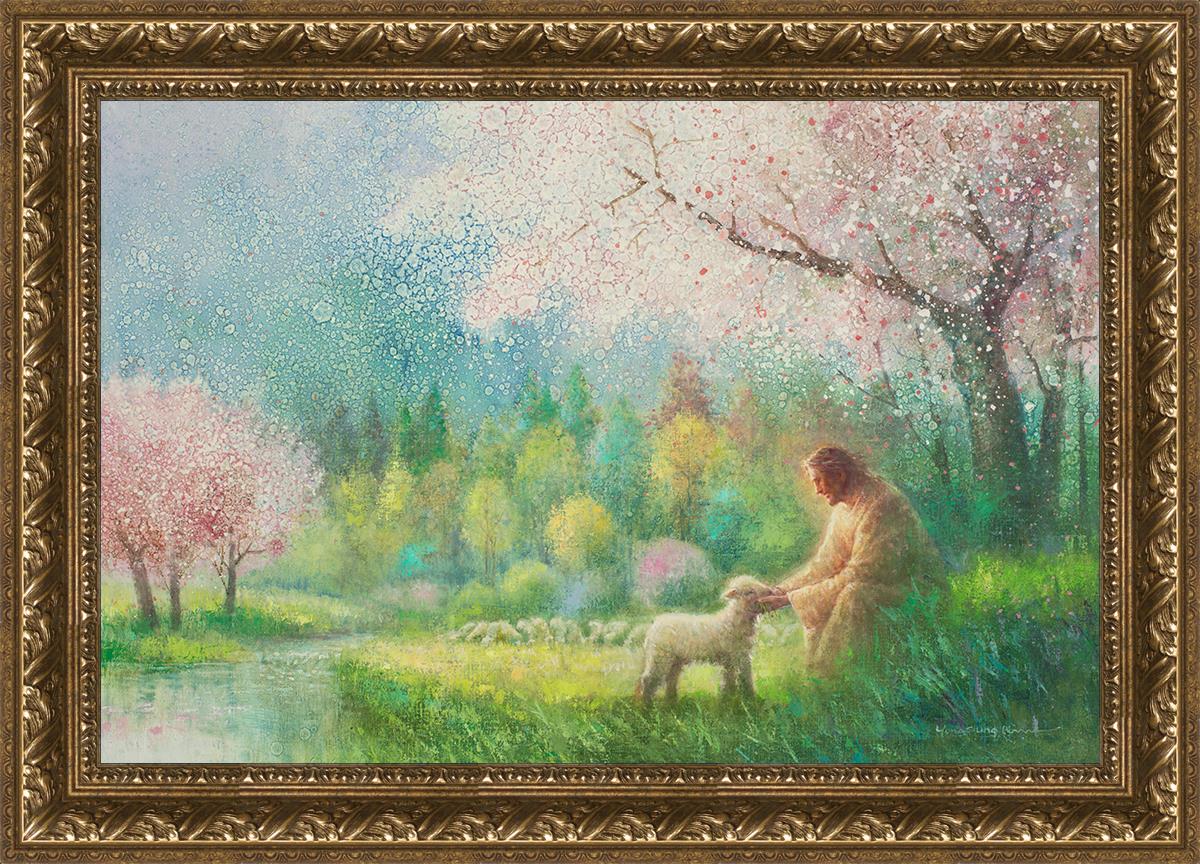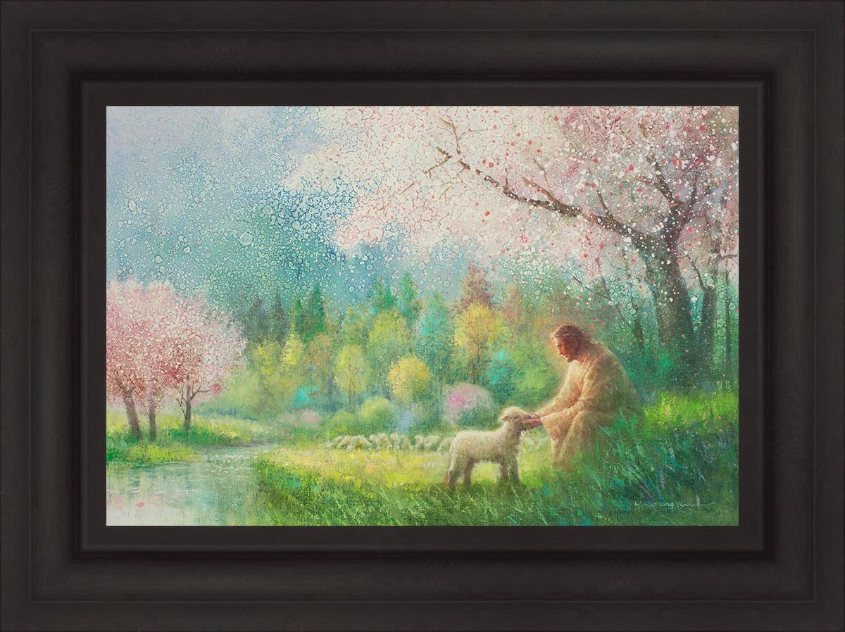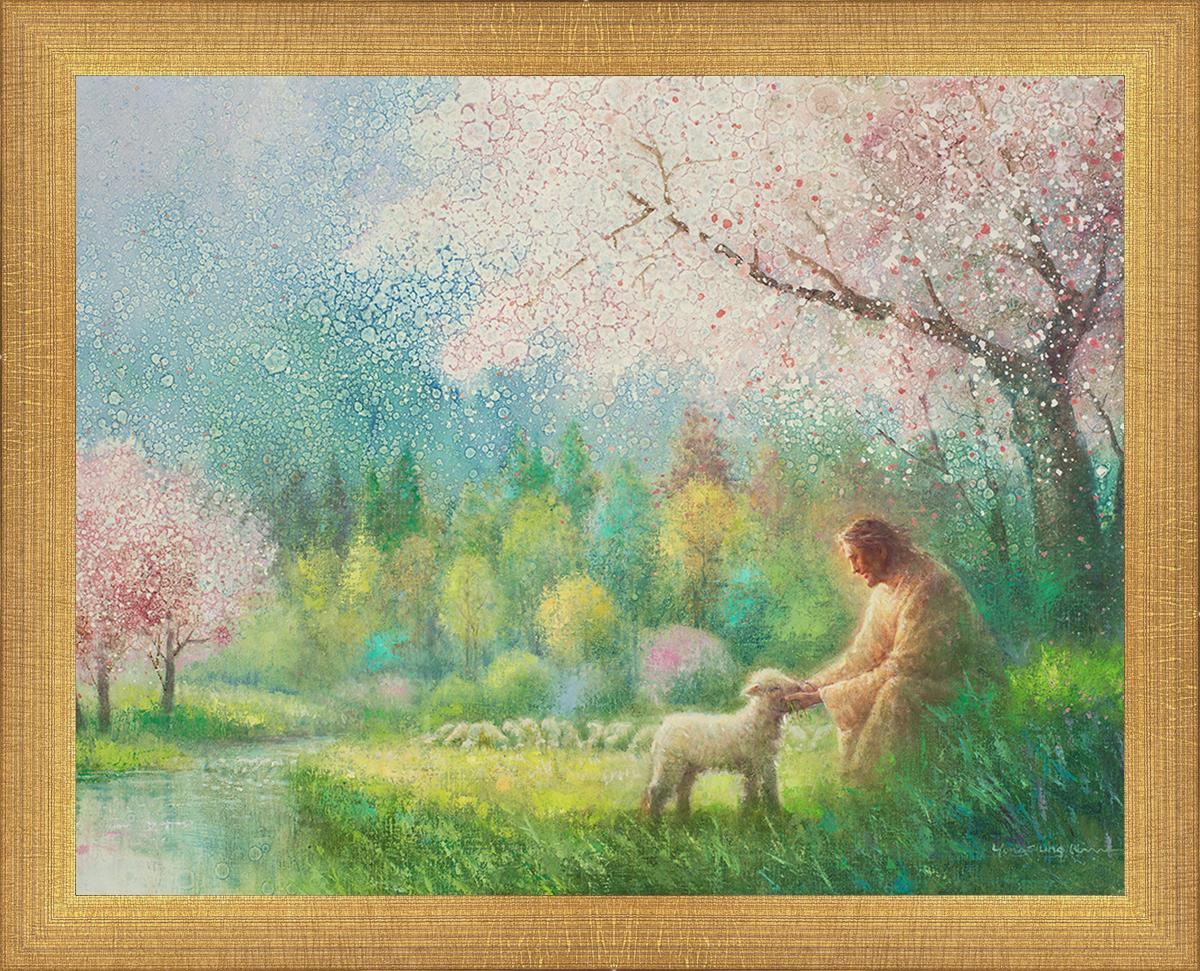 With a compassionate gaze, Jesus sits offering comfort and reassurance to a vulnerable and innocent spring lamb. The surrounding scenery is an explosion of colors and life, where blossoms of every hue blanket the earth, their vibrant petals echoing the joy and renewal of the season. Yongsung Kim invites viewers to find solace and renewal in the tender care of Christ.