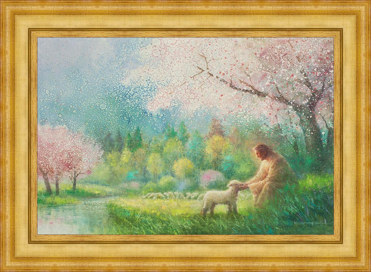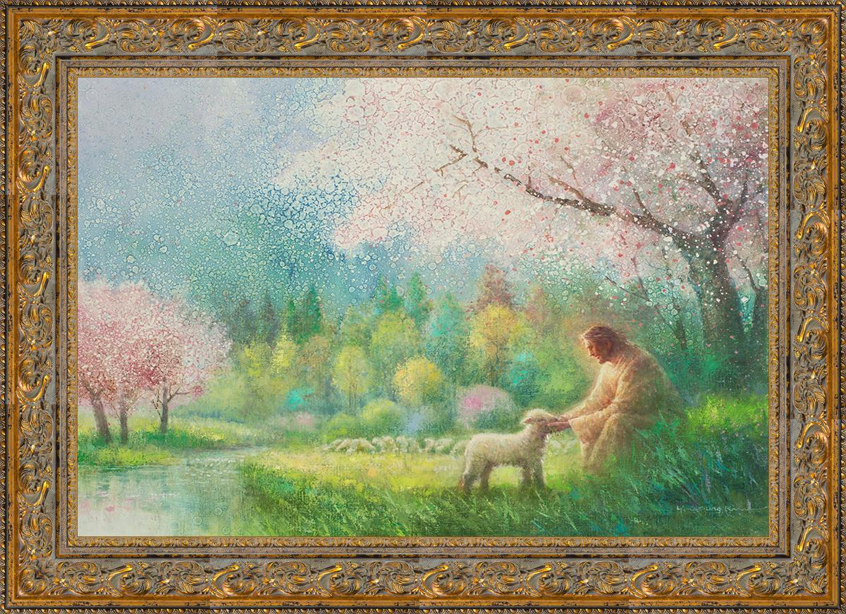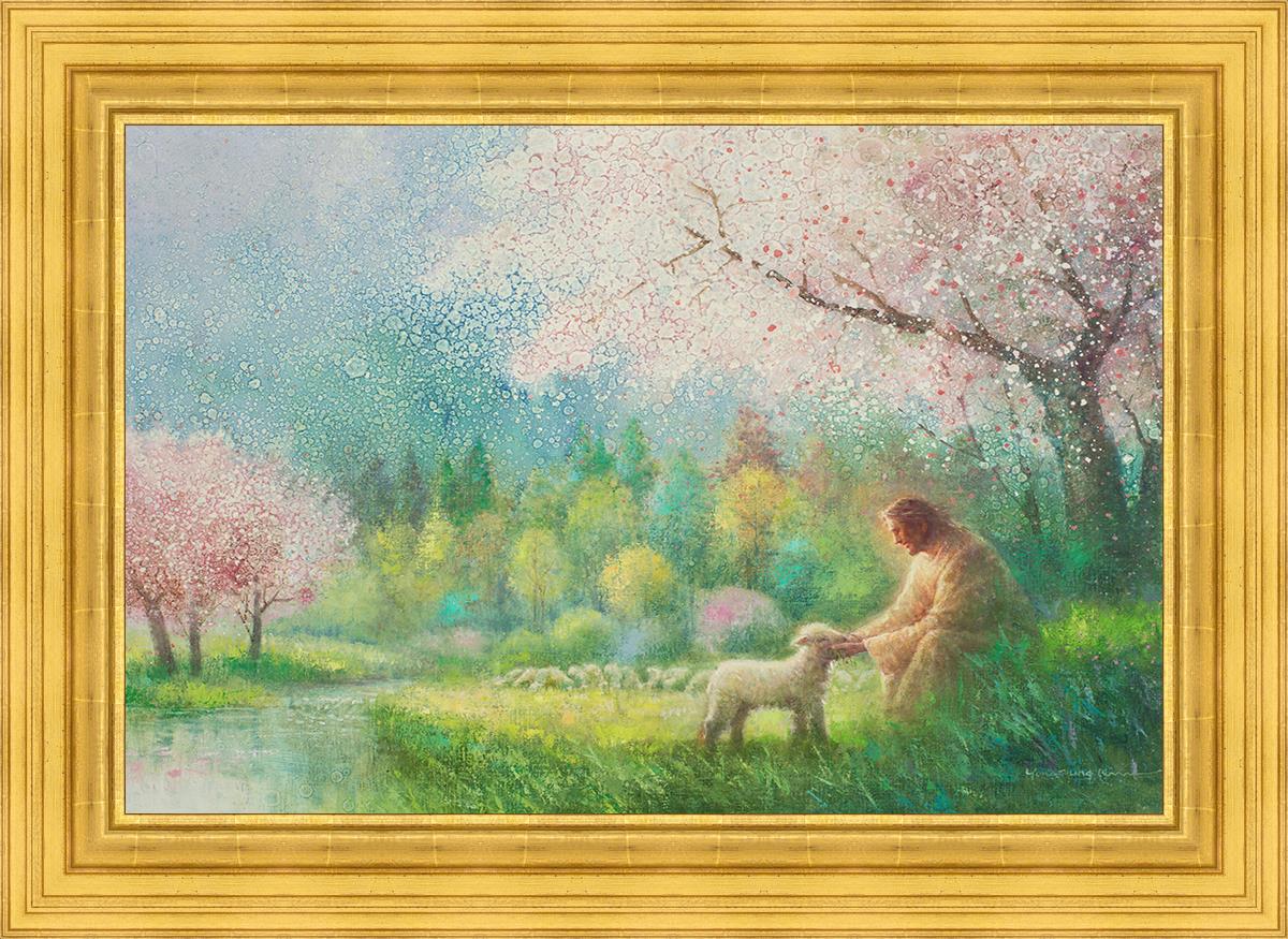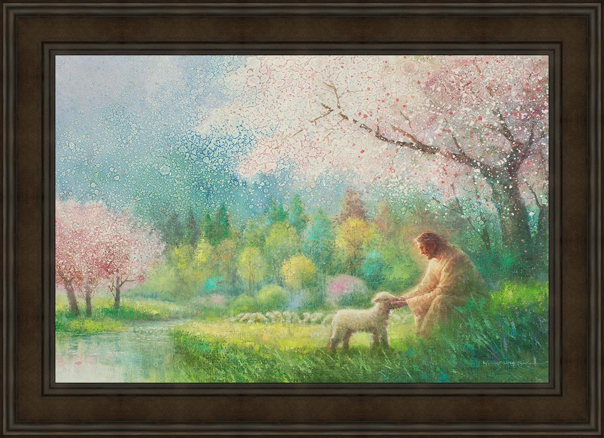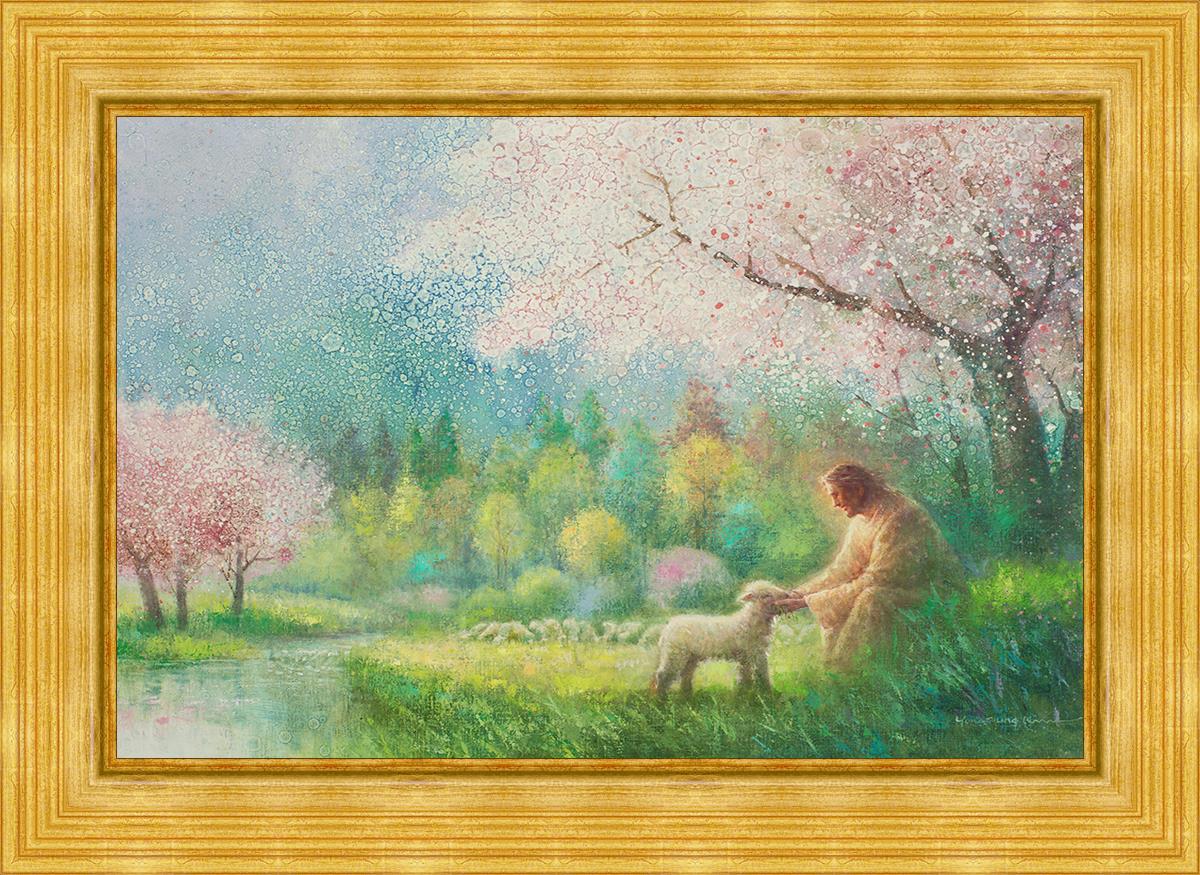 With a compassionate gaze, Jesus sits offering comfort and reassurance to a vulnerable and innocent spring lamb. The surrounding scenery is an explosion of colors and life, where blossoms of every hue blanket the earth, their vibrant petals echoing the joy and renewal of the season. Yongsung Kim invites viewers to find solace and renewal in the tender care of Christ.