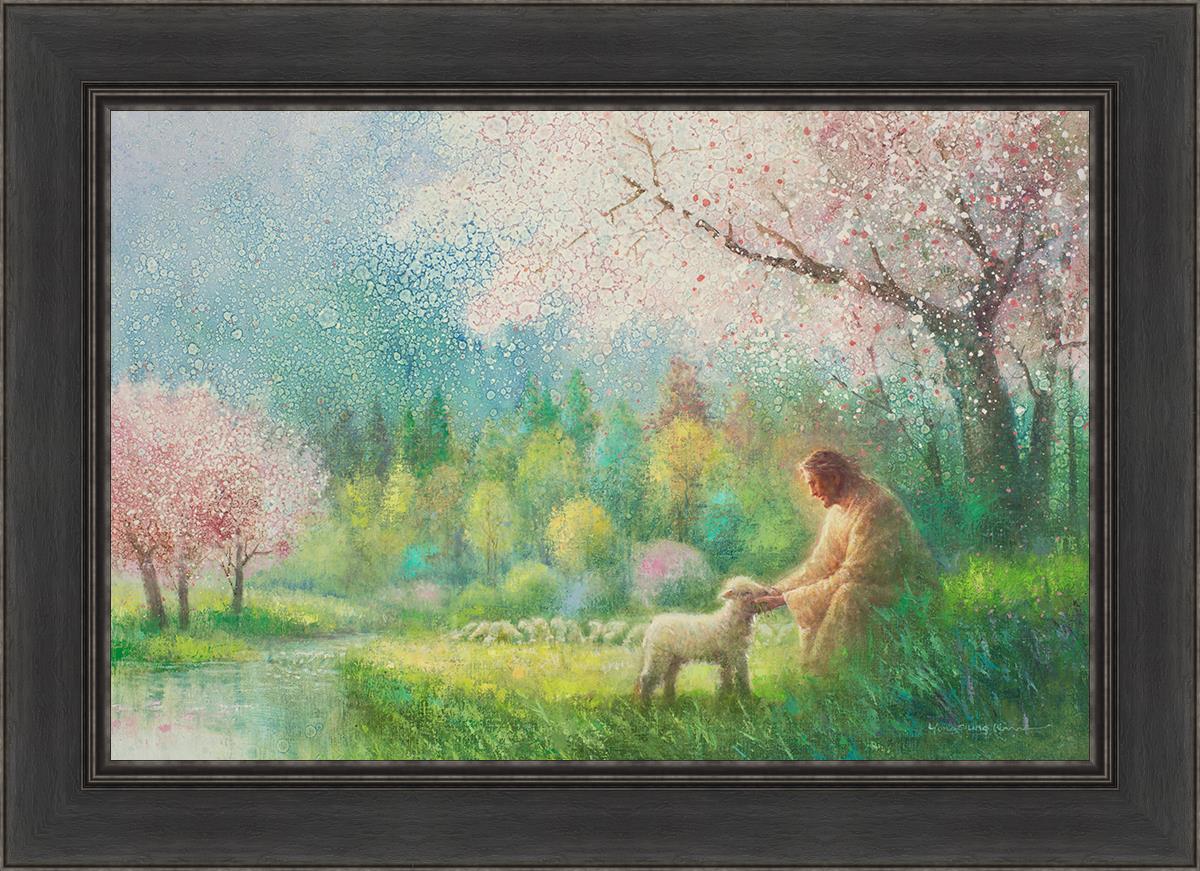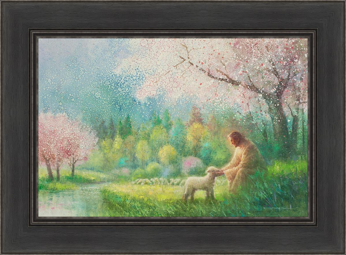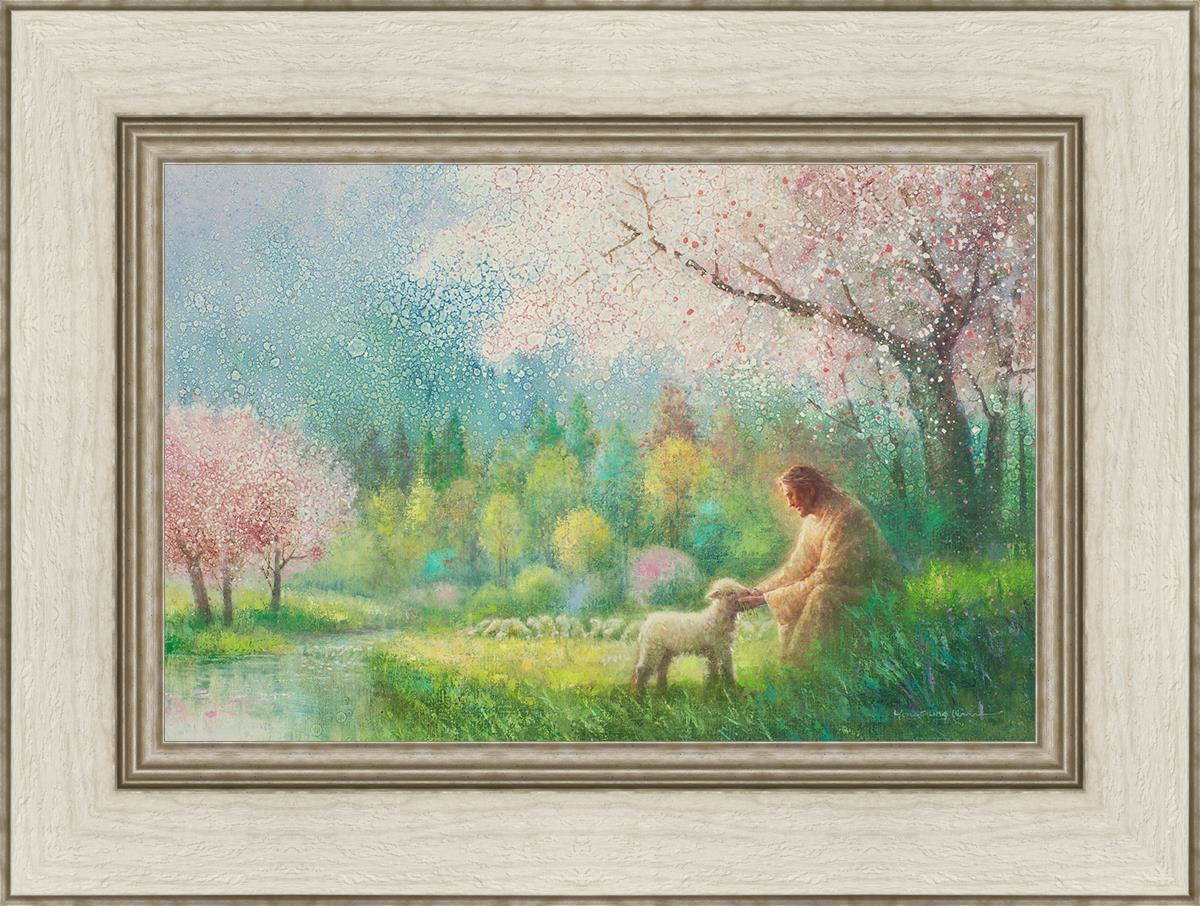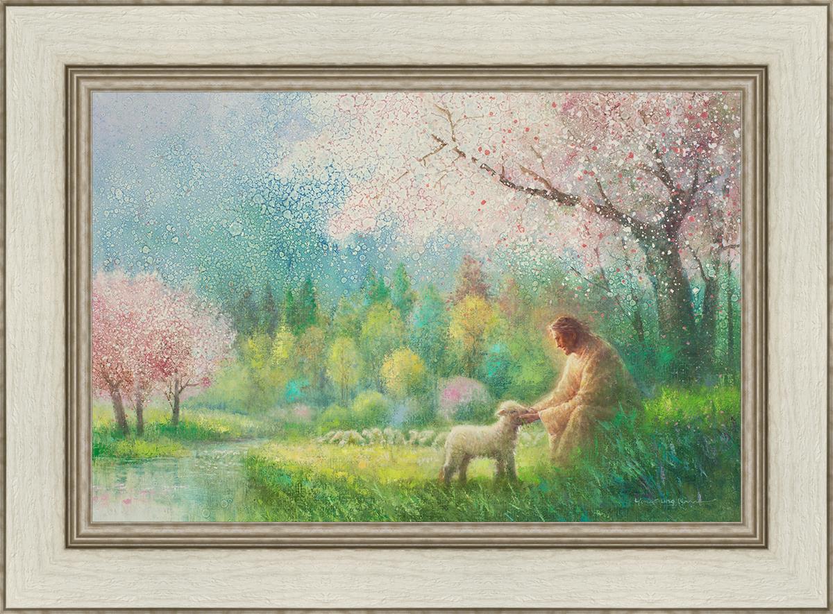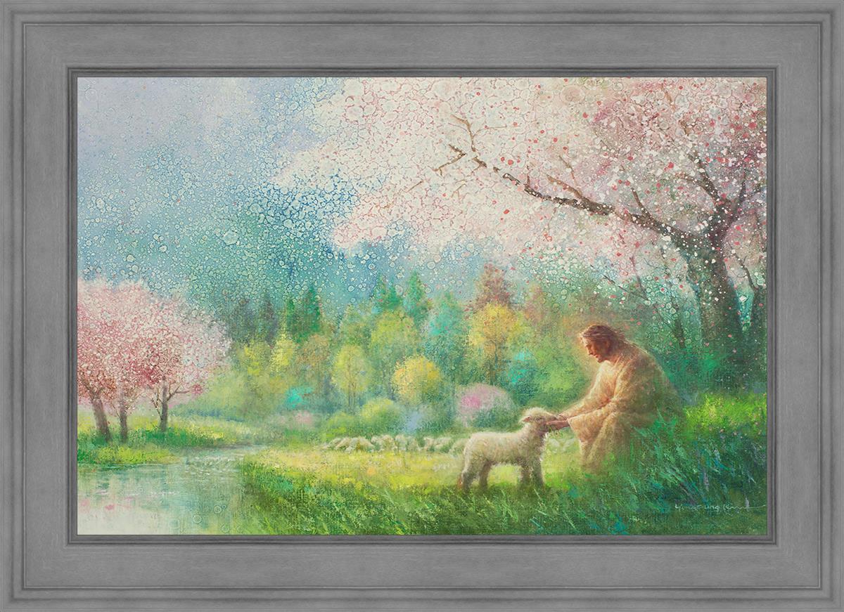 With a compassionate gaze, Jesus sits offering comfort and reassurance to a vulnerable and innocent spring lamb. The surrounding scenery is an explosion of colors and life, where blossoms of every hue blanket the earth, their vibrant petals echoing the joy and renewal of the season. Yongsung Kim invites viewers to find solace and renewal in the tender care of Christ.