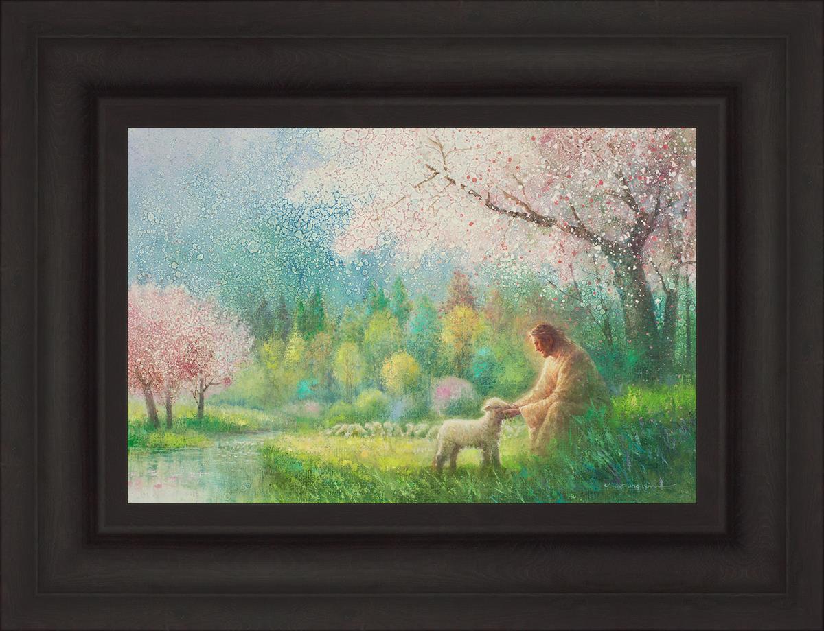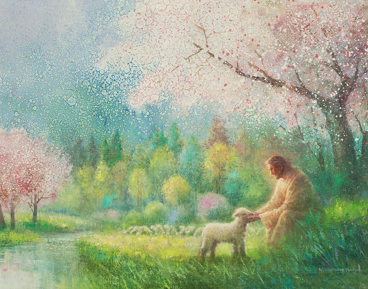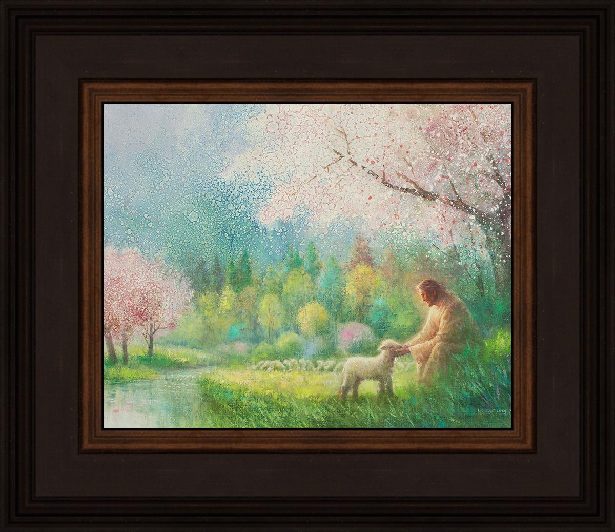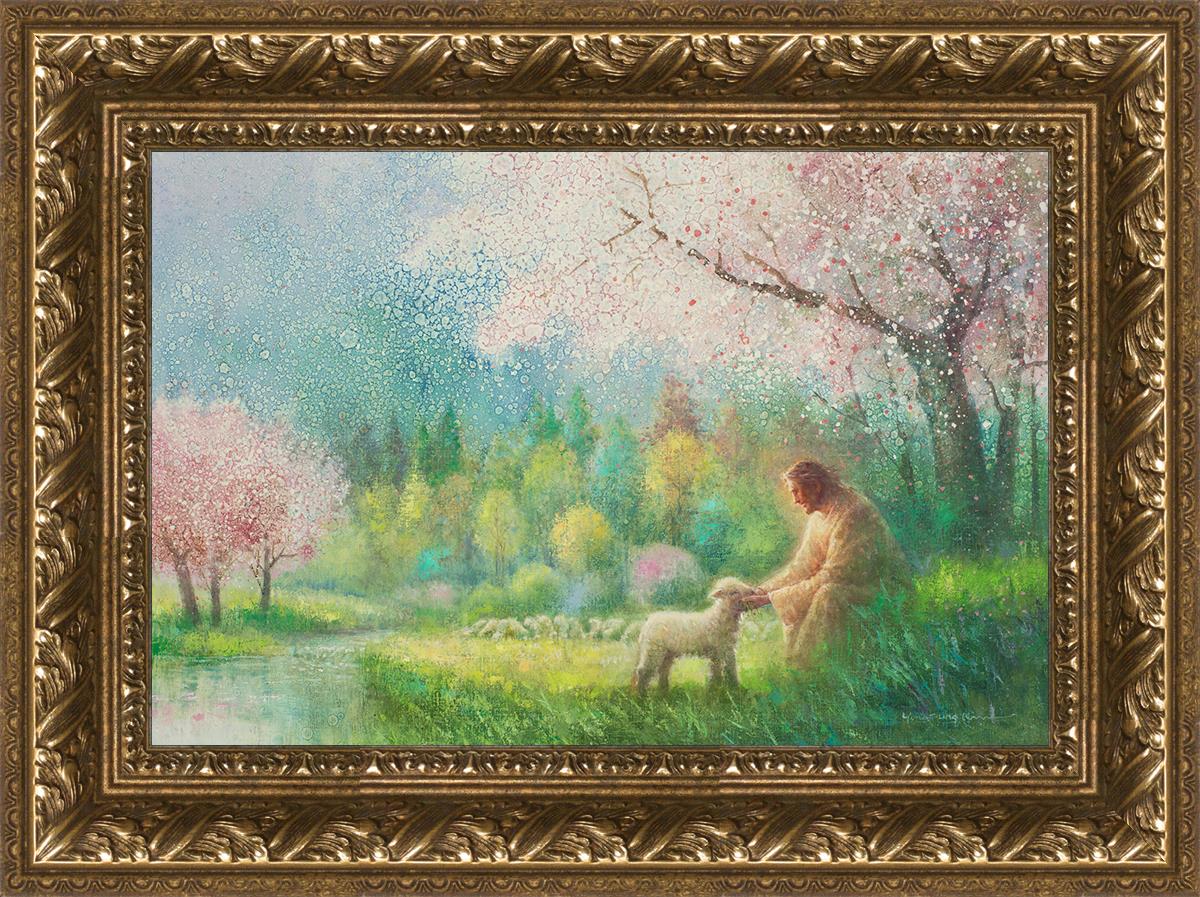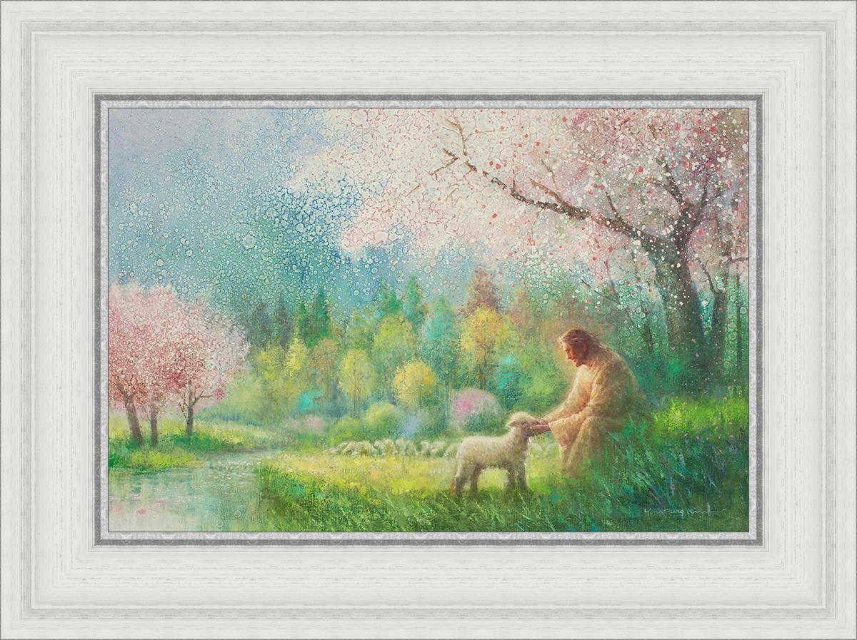 With a compassionate gaze, Jesus sits offering comfort and reassurance to a vulnerable and innocent spring lamb. The surrounding scenery is an explosion of colors and life, where blossoms of every hue blanket the earth, their vibrant petals echoing the joy and renewal of the season. Yongsung Kim invites viewers to find solace and renewal in the tender care of Christ.