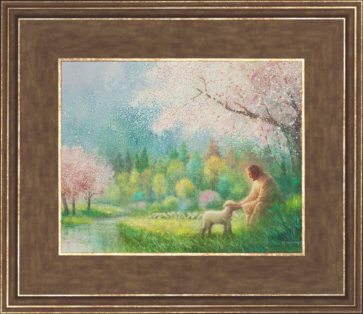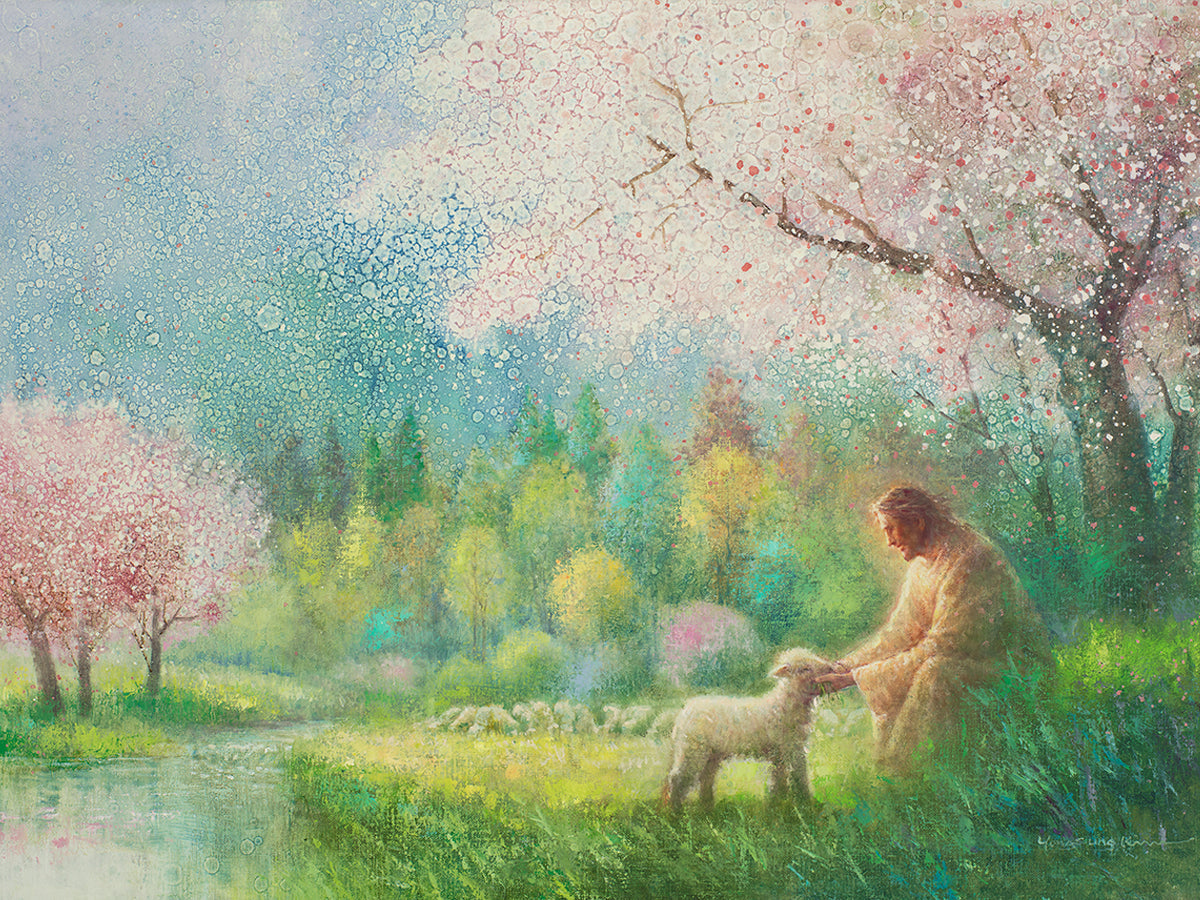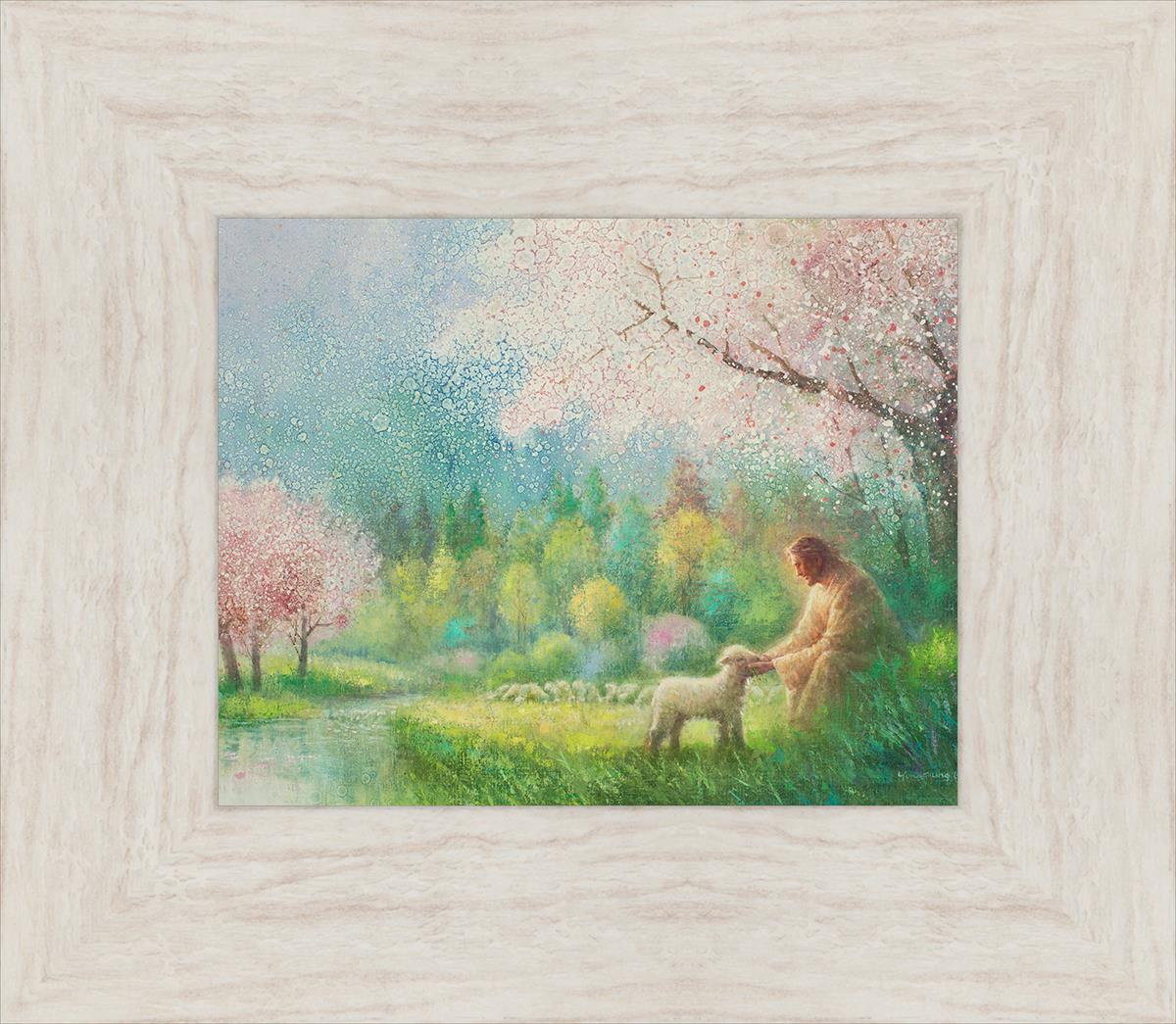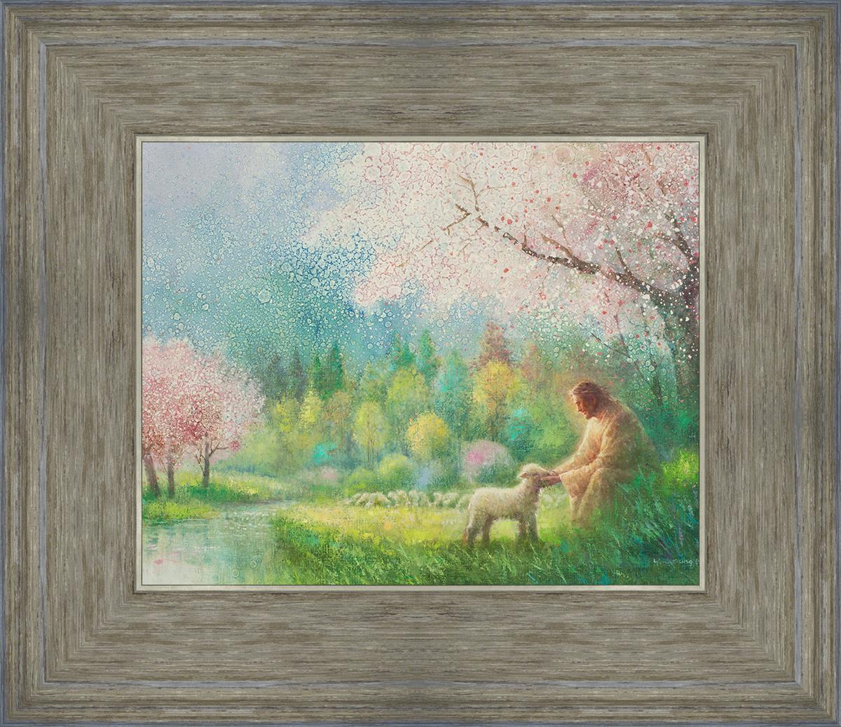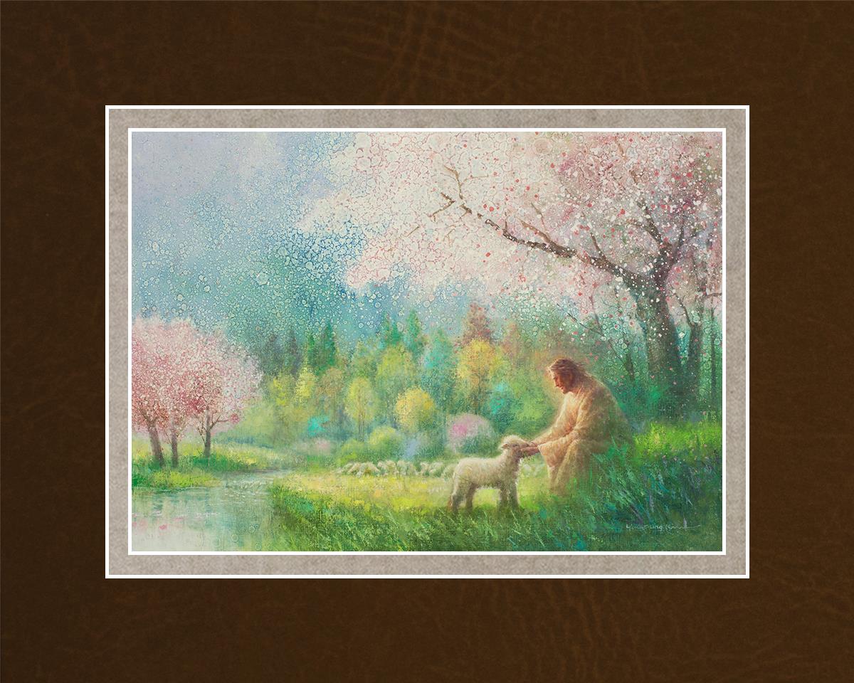With a compassionate gaze, Jesus sits offering comfort and reassurance to a vulnerable and innocent spring lamb. The surrounding scenery is an explosion of colors and life, where blossoms of every hue blanket the earth, their vibrant petals echoing the joy and renewal of the season. Yongsung Kim invites viewers to find solace and renewal in the tender care of Christ.