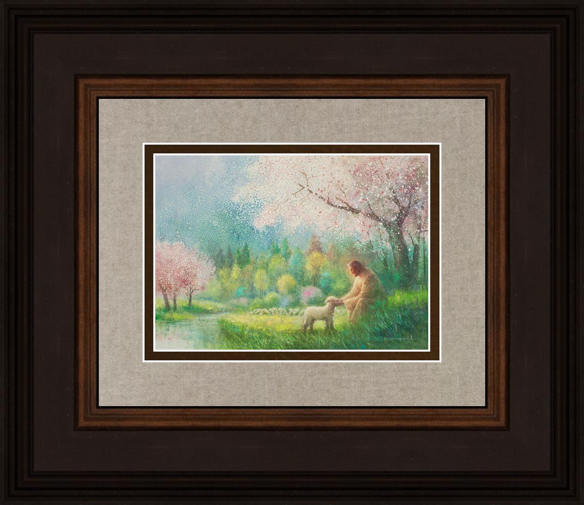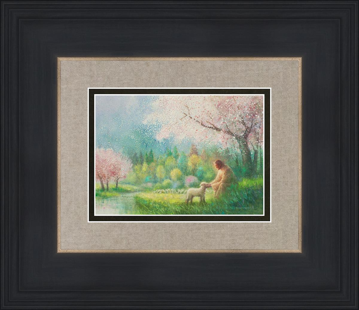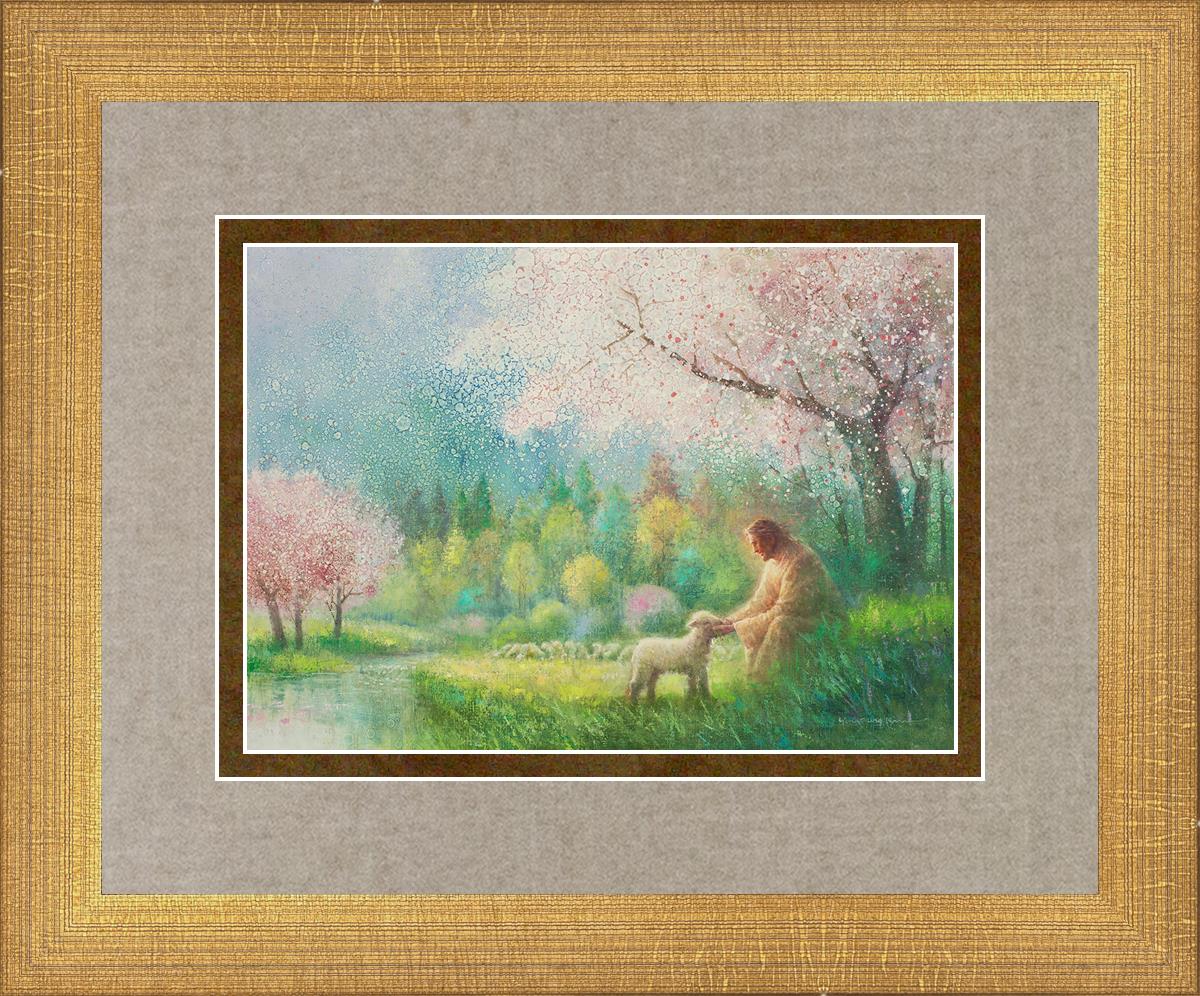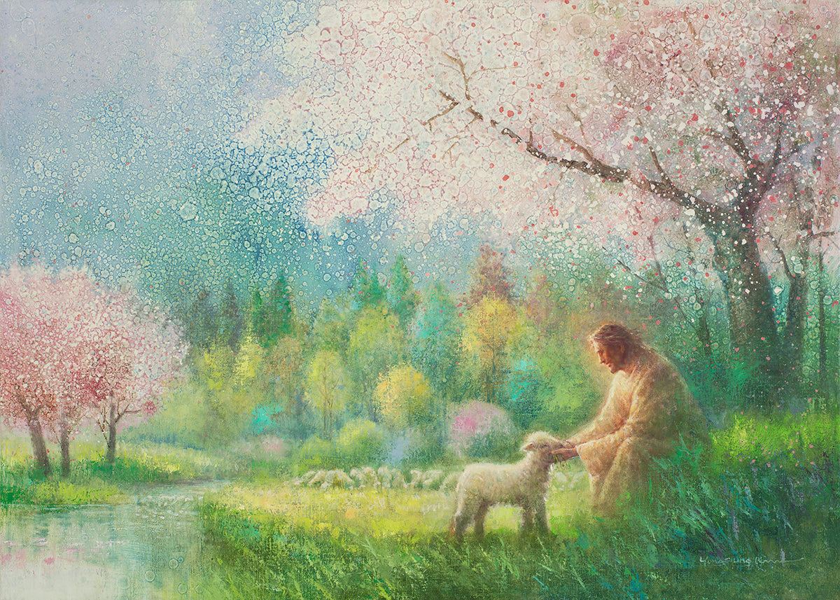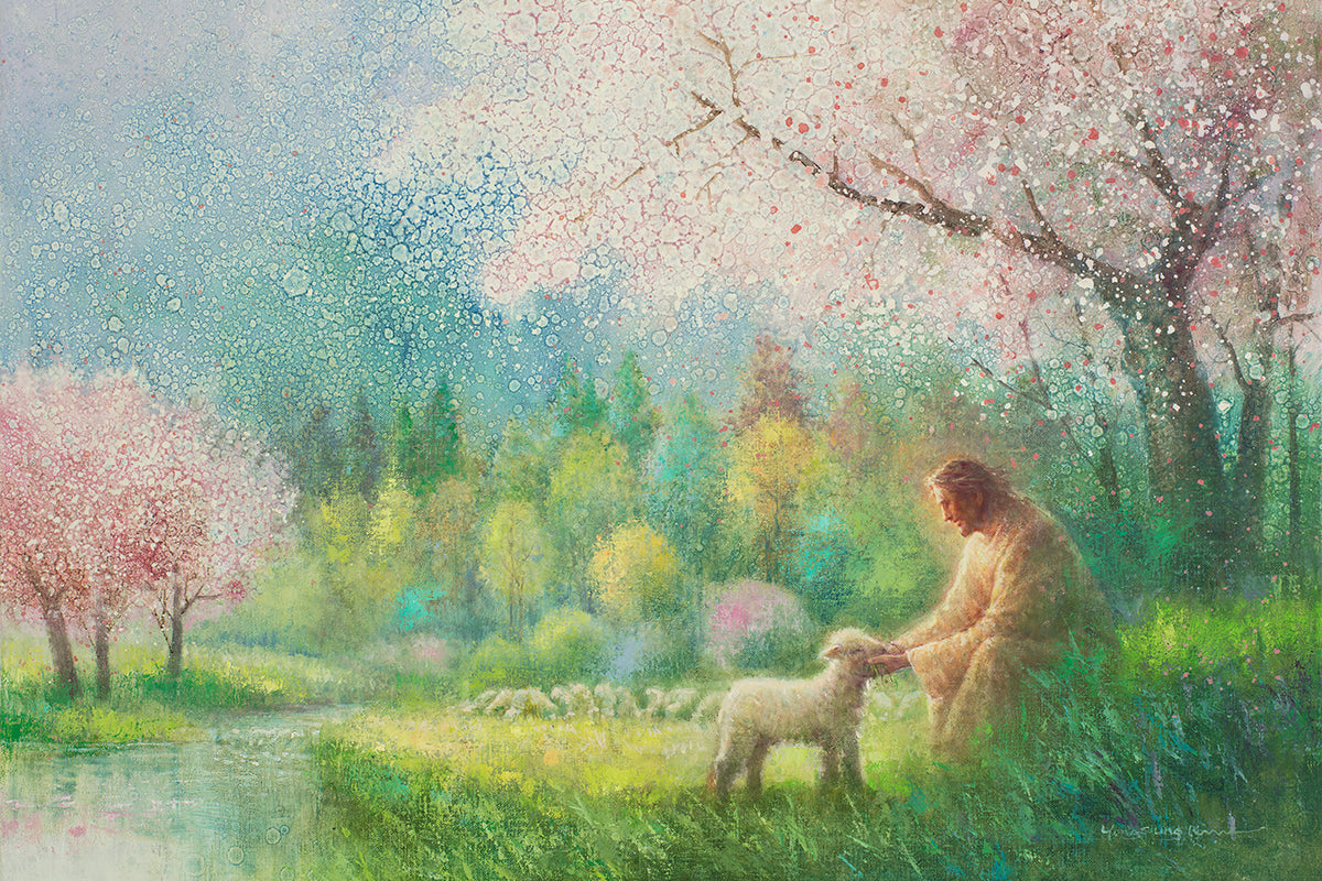 With a compassionate gaze, Jesus sits offering comfort and reassurance to a vulnerable and innocent spring lamb. The surrounding scenery is an explosion of colors and life, where blossoms of every hue blanket the earth, their vibrant petals echoing the joy and renewal of the season. Yongsung Kim invites viewers to find solace and renewal in the tender care of Christ.