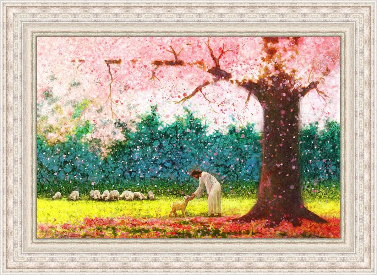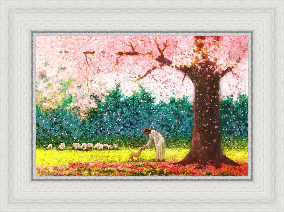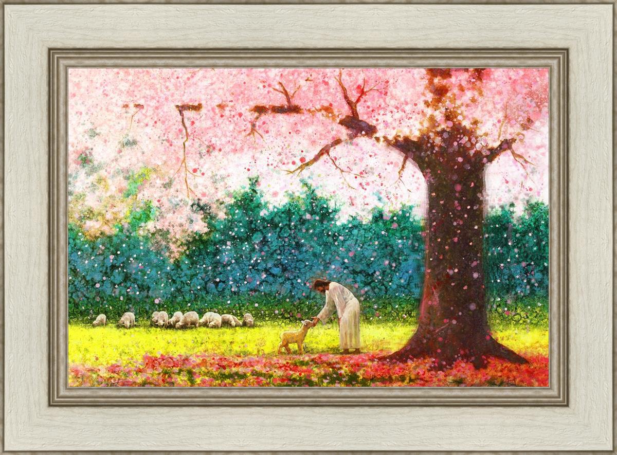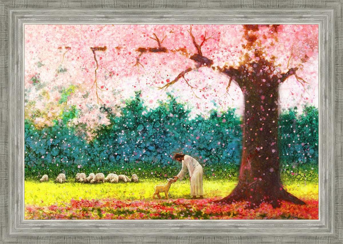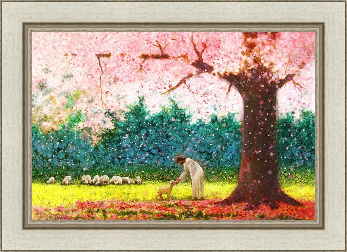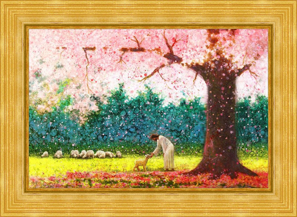 In Green Pastures is a painting by Yongsung Kim. This painting depicts Jesus Christ tending to a lamb under a beautiful pink tree.