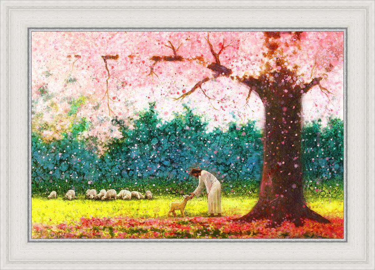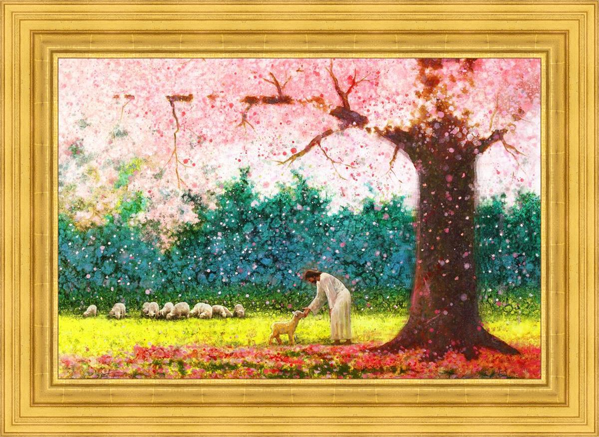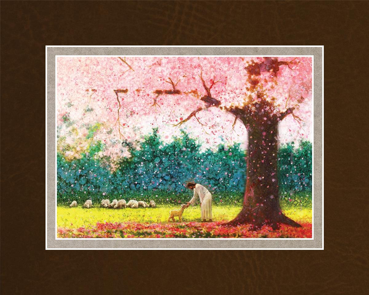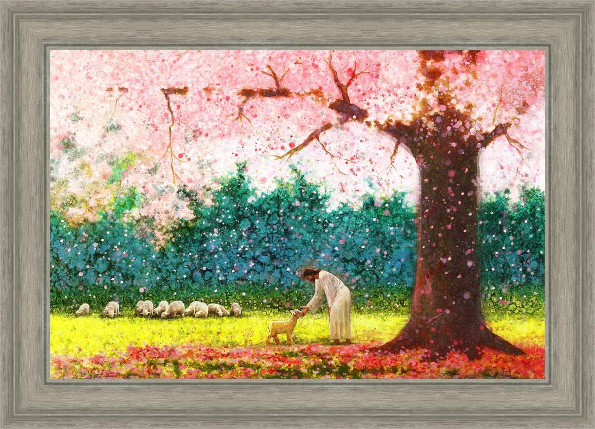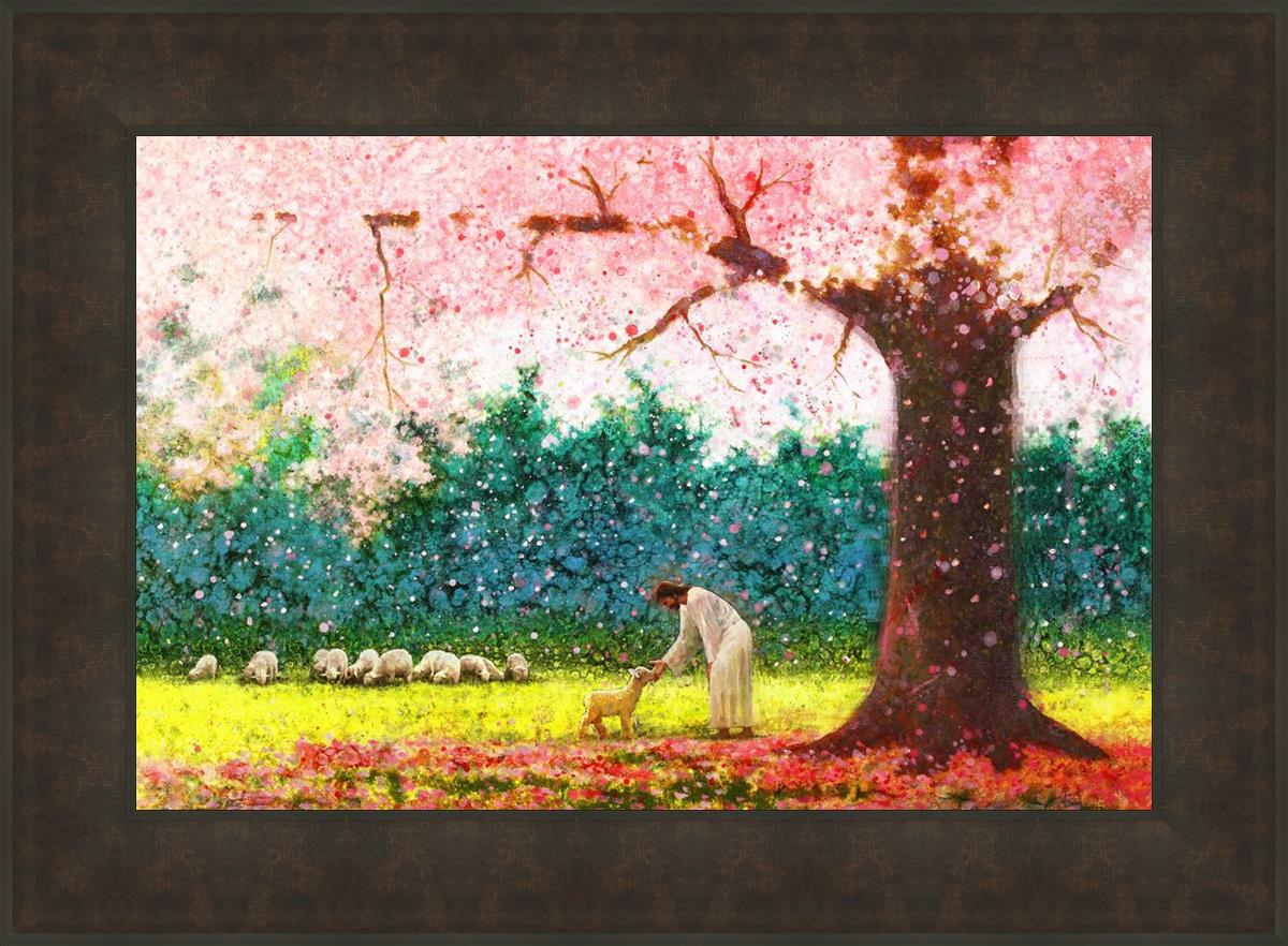 In Green Pastures is a painting by Yongsung Kim. This painting depicts Jesus Christ tending to a lamb under a beautiful pink tree.