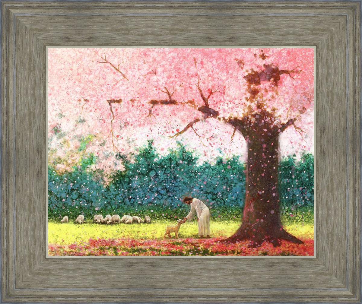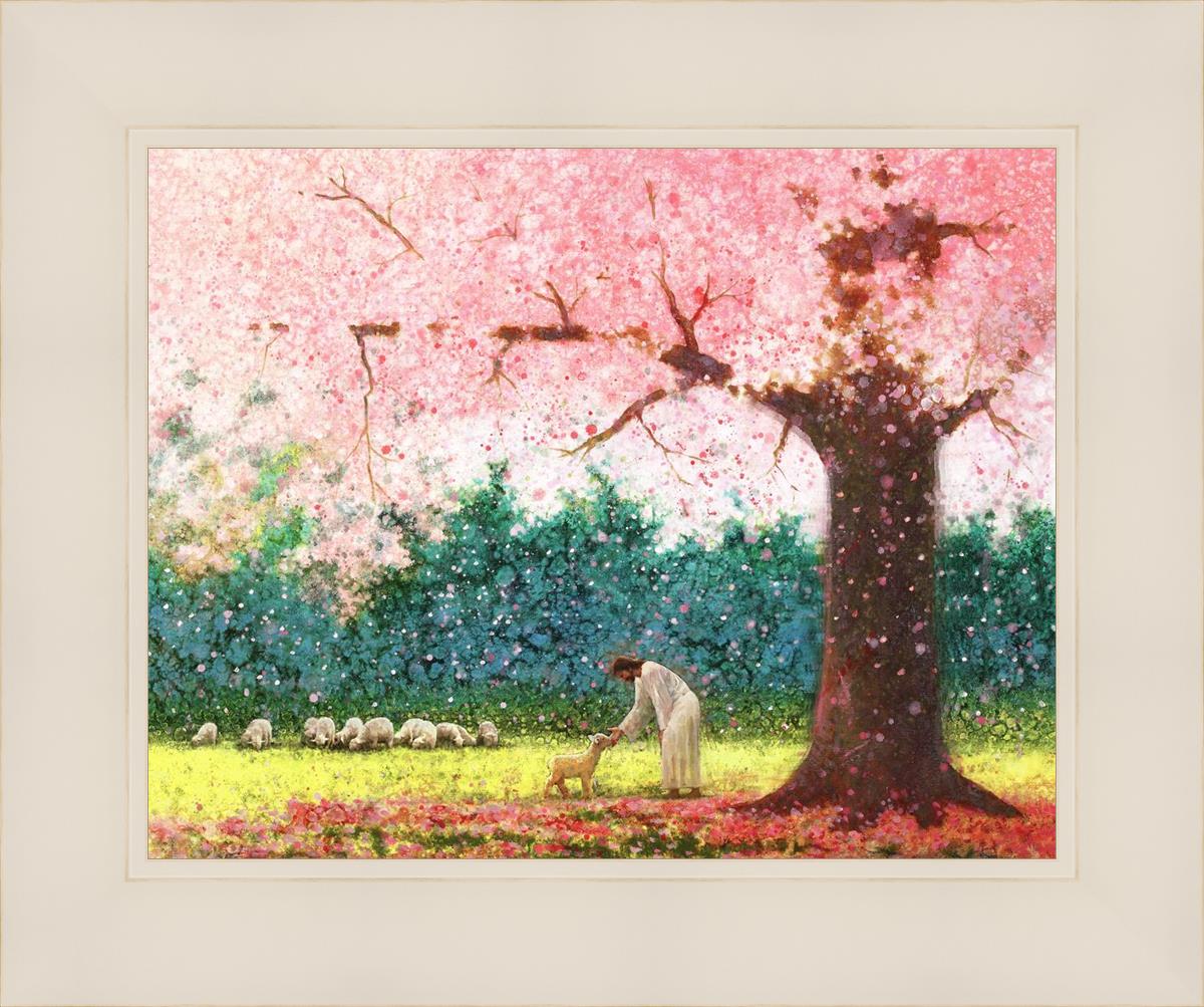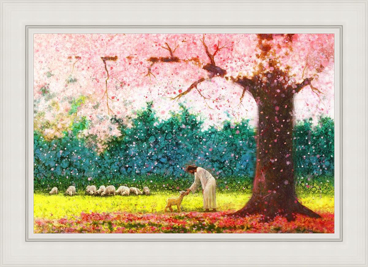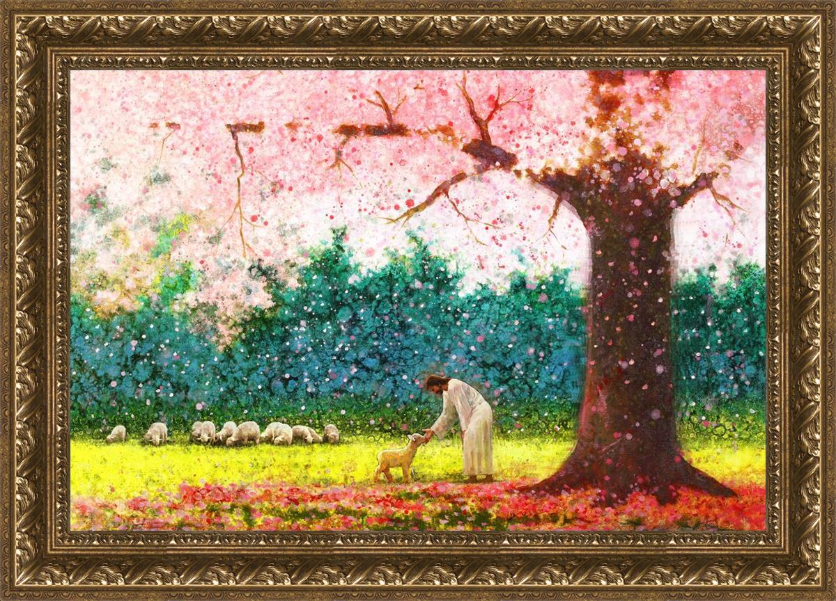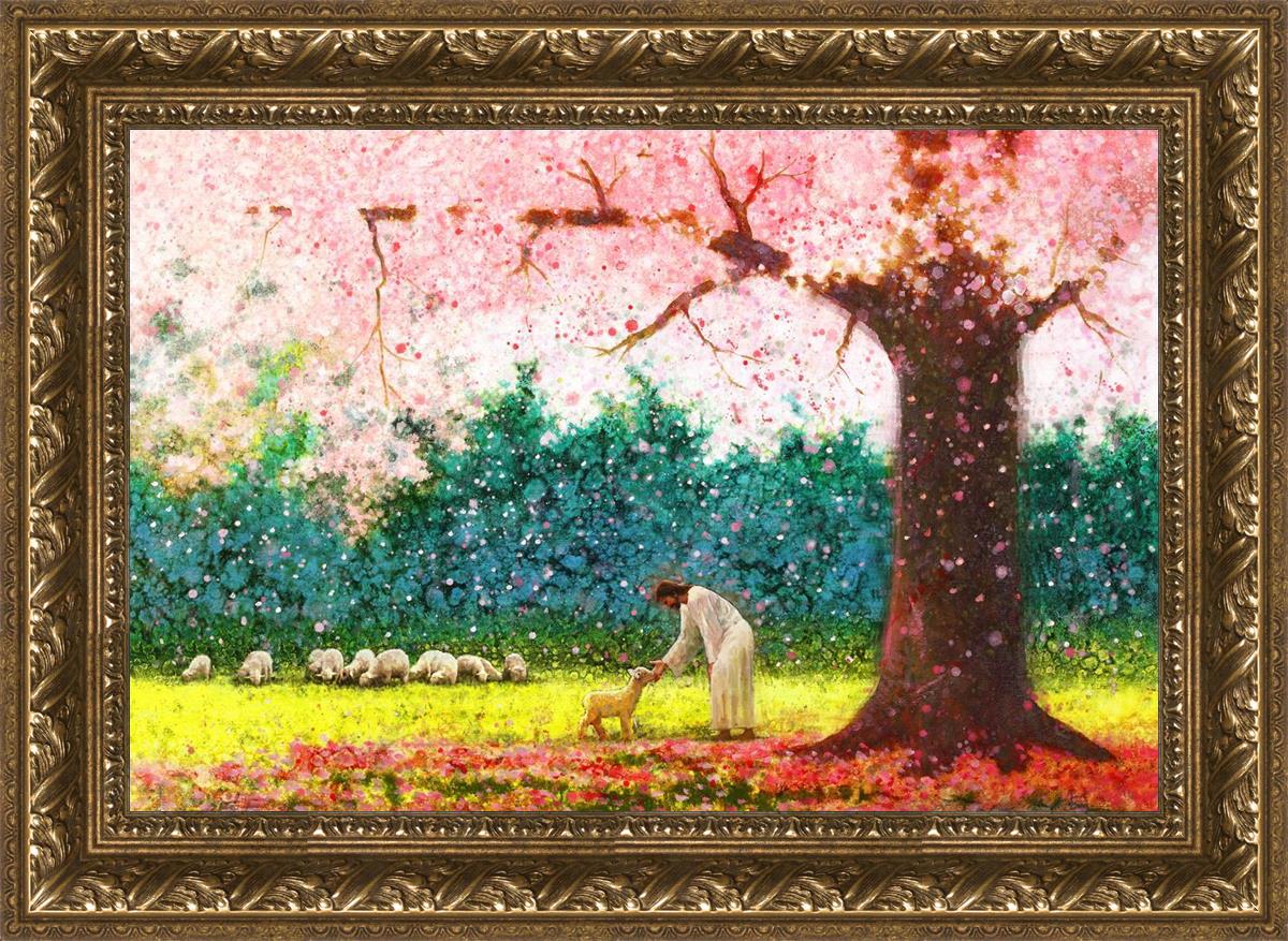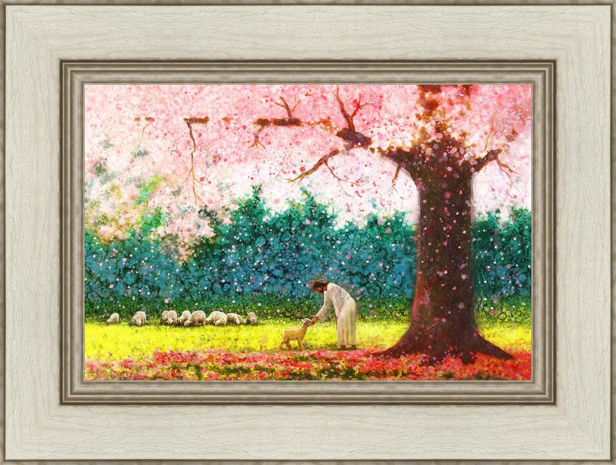 In Green Pastures is a painting by Yongsung Kim. This painting depicts Jesus Christ tending to a lamb under a beautiful pink tree.