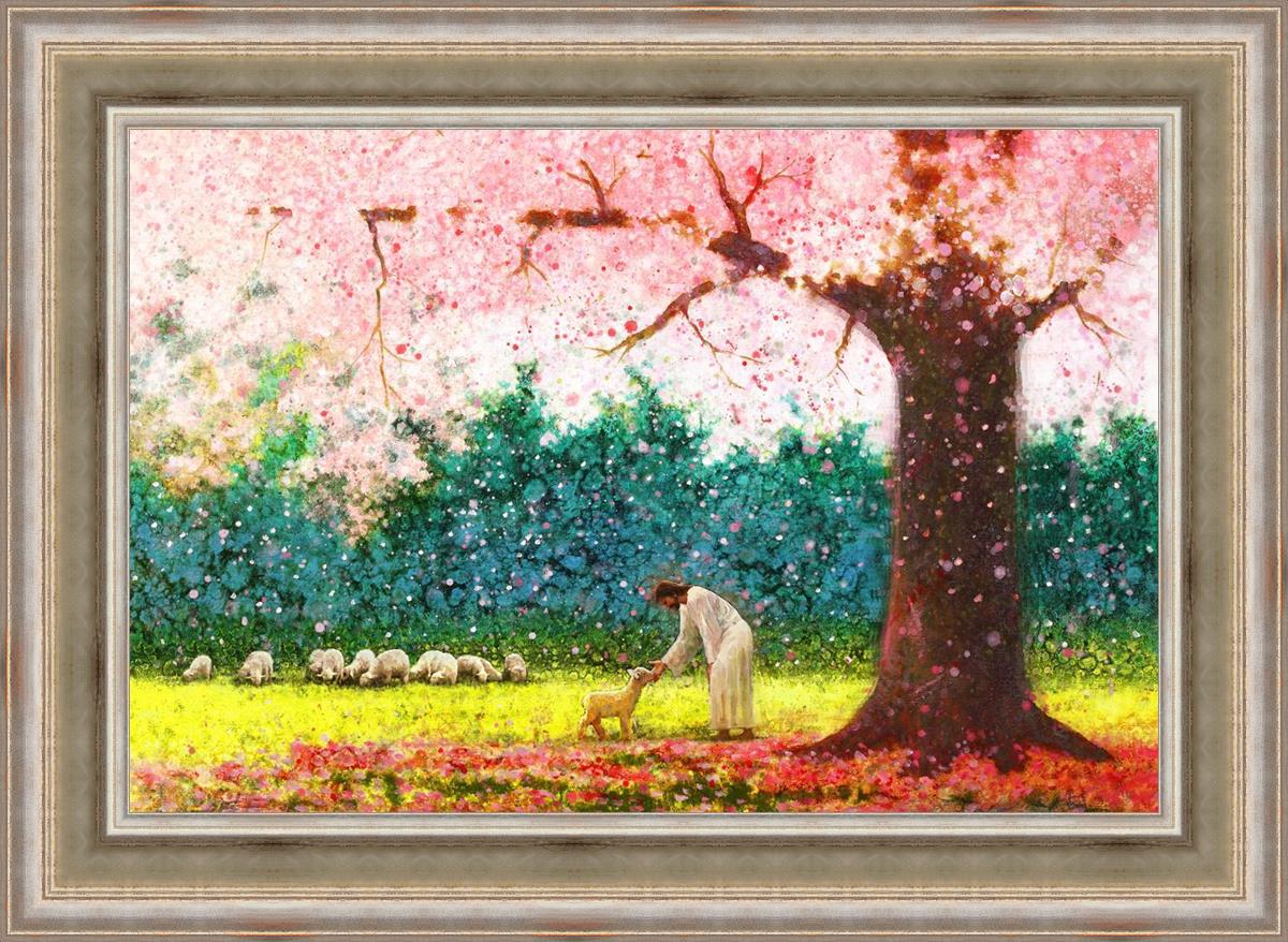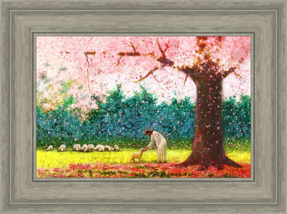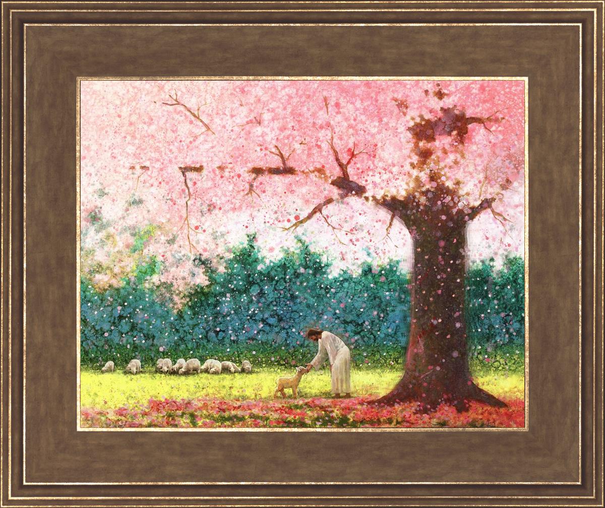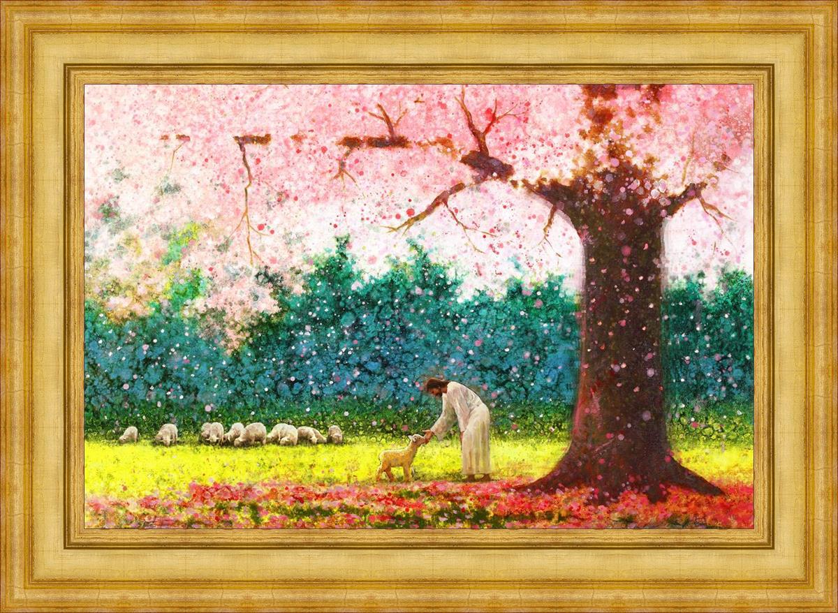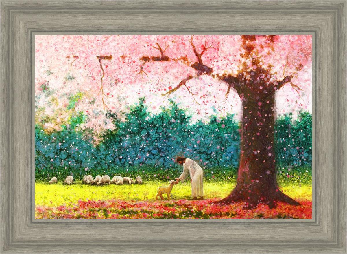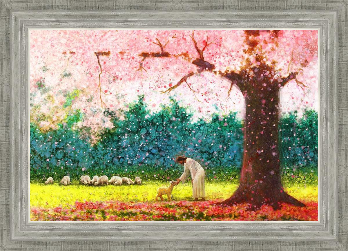 In Green Pastures is a painting by Yongsung Kim. This painting depicts Jesus Christ tending to a lamb under a beautiful pink tree.