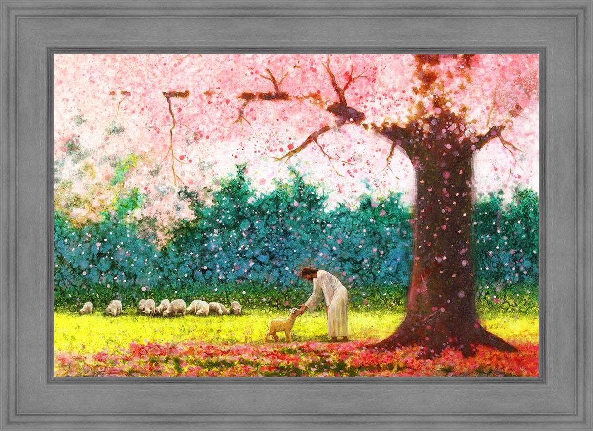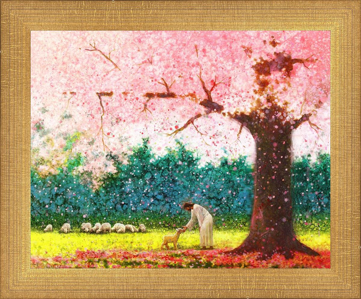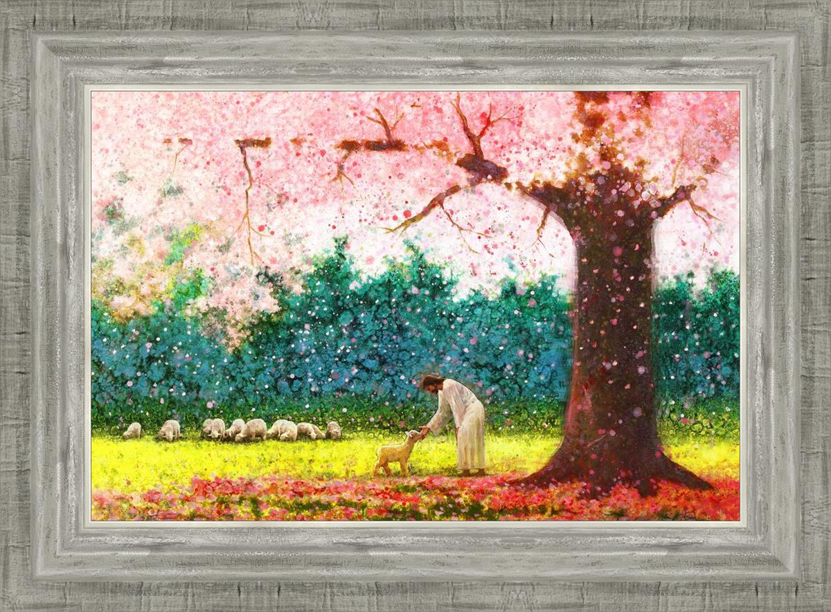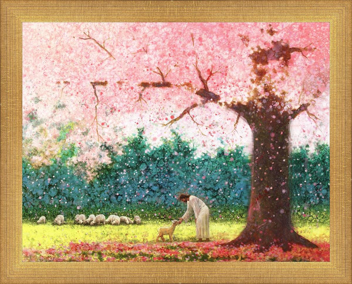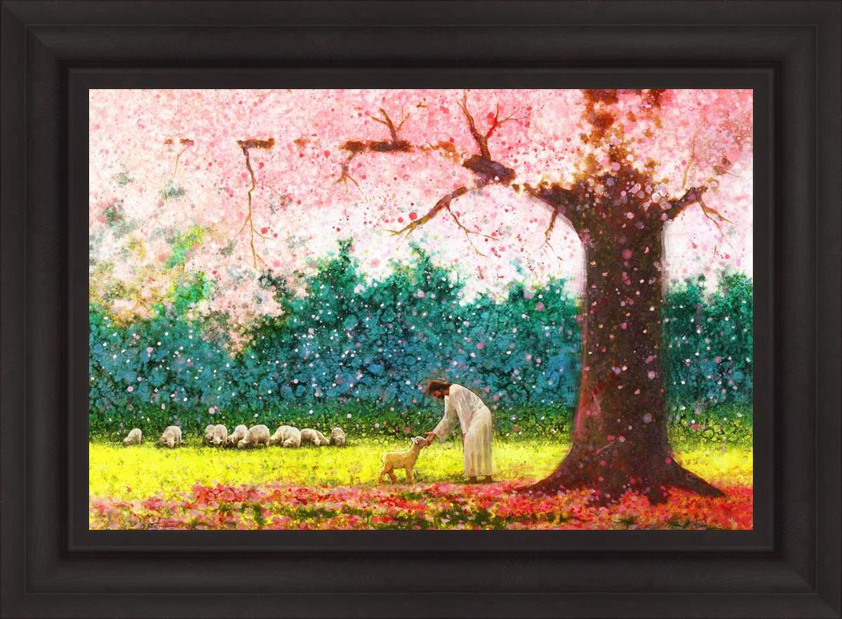 In Green Pastures is a painting by Yongsung Kim. This painting depicts Jesus Christ tending to a lamb under a beautiful pink tree.