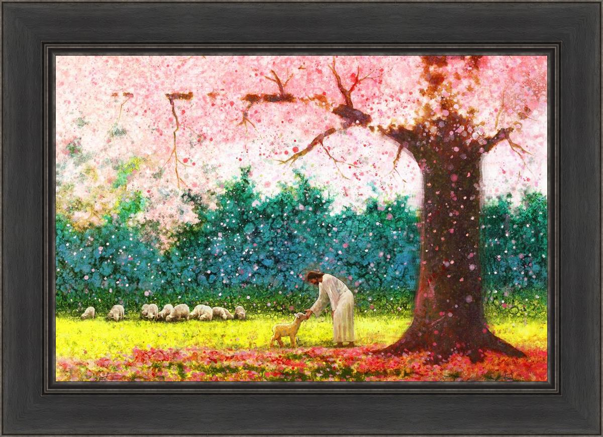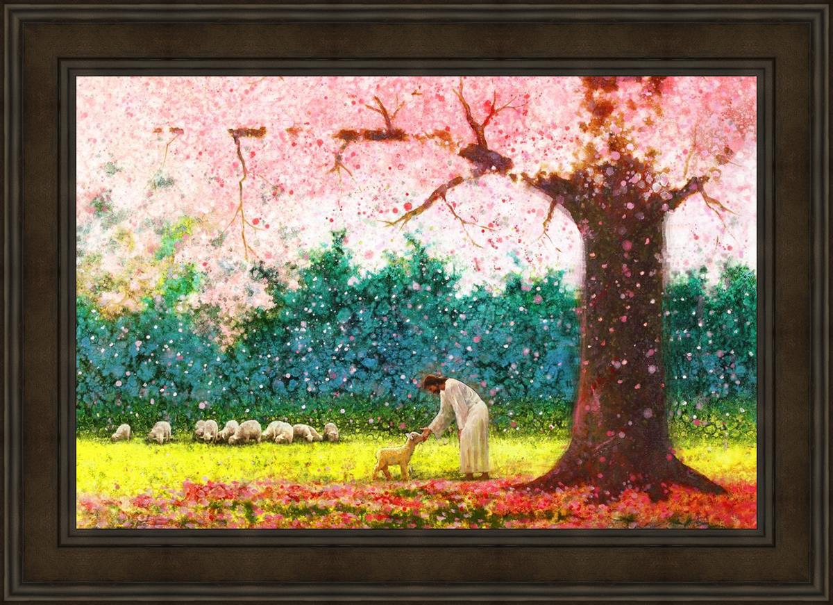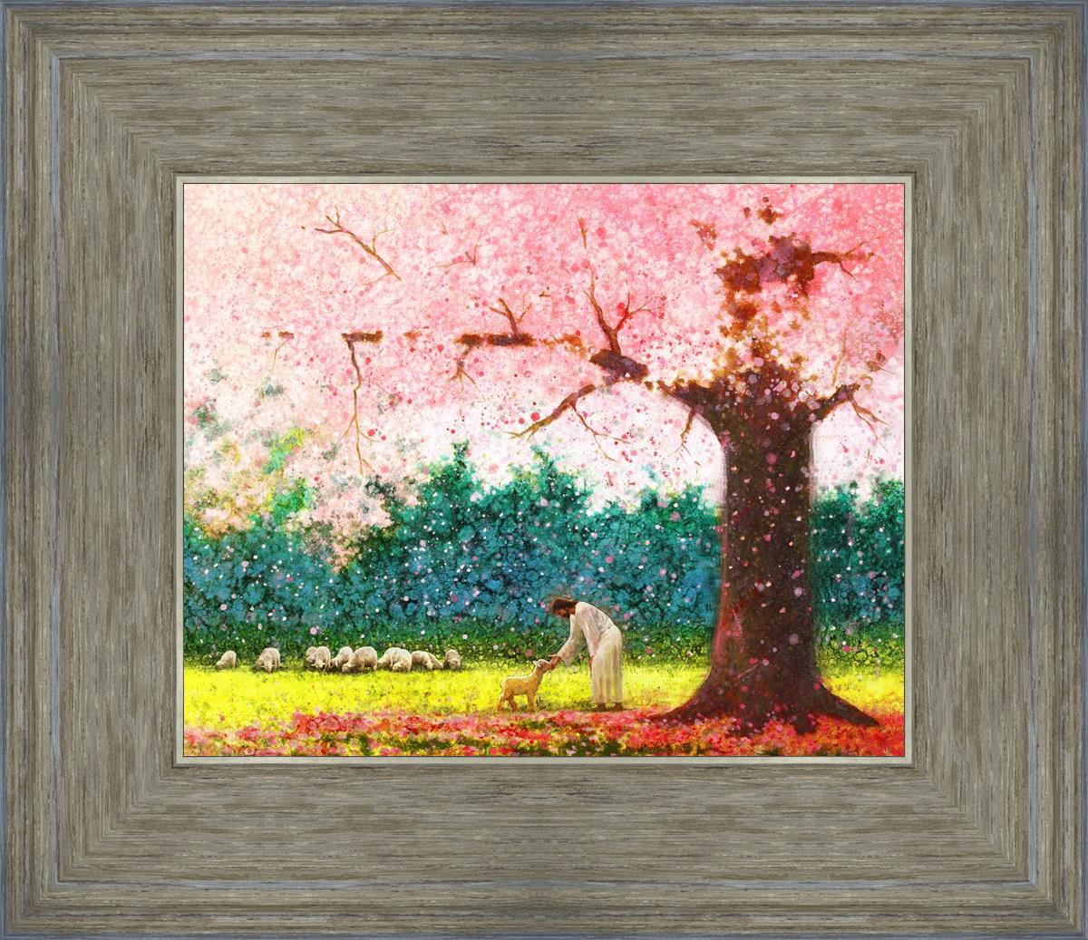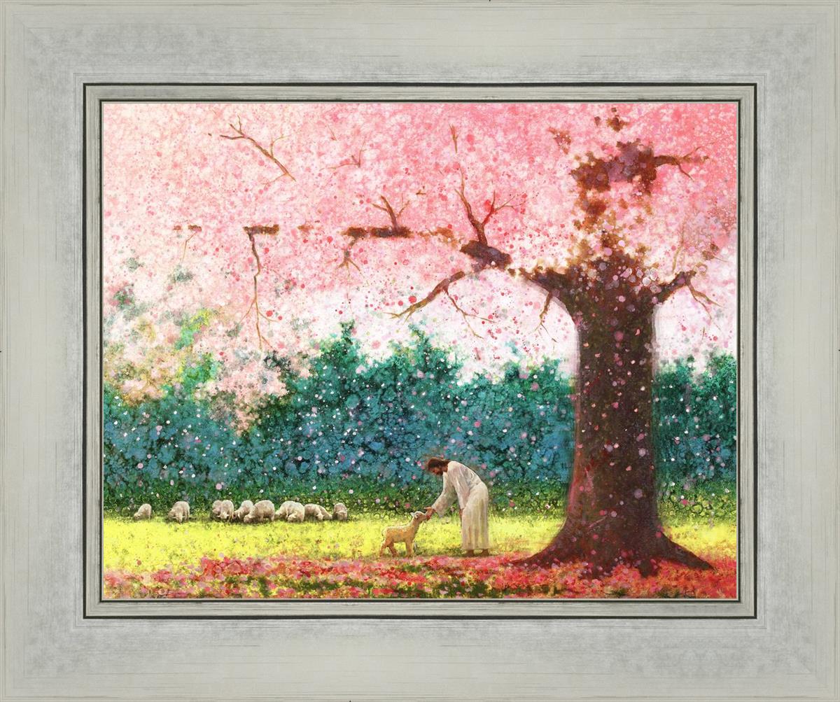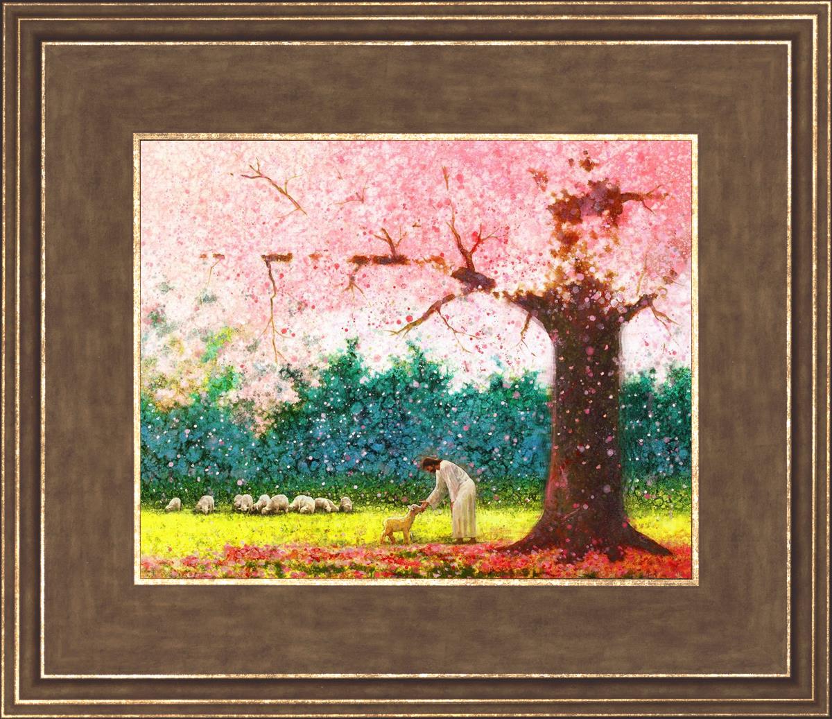 In Green Pastures is a painting by Yongsung Kim. This painting depicts Jesus Christ tending to a lamb under a beautiful pink tree.