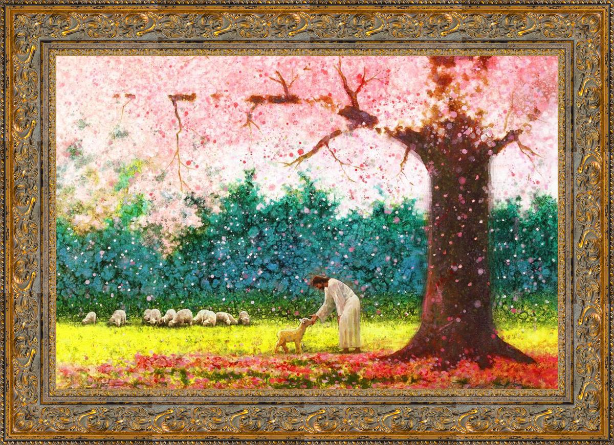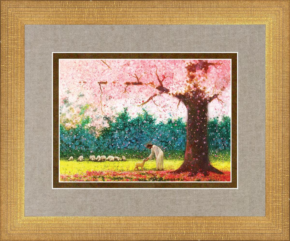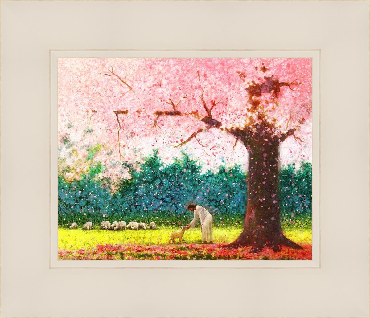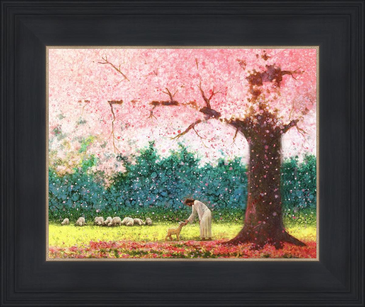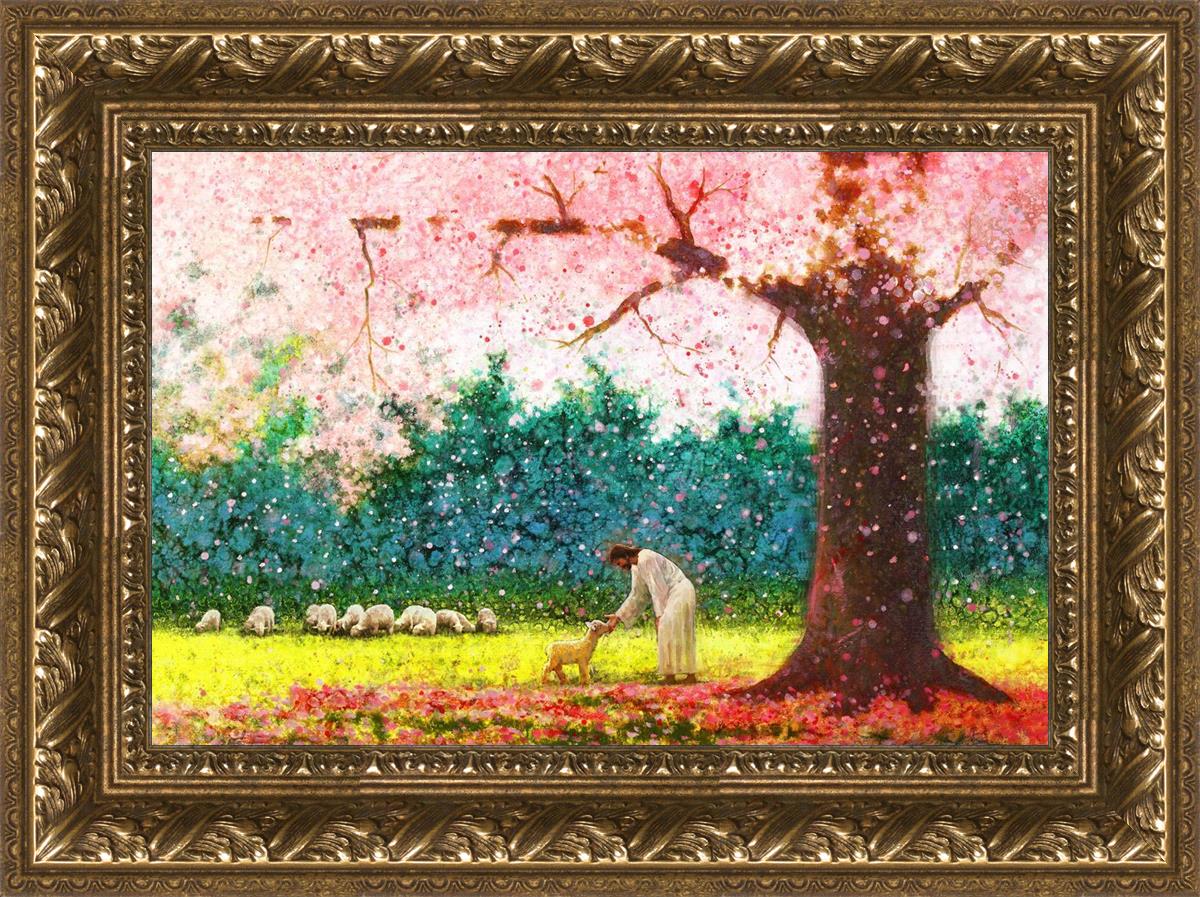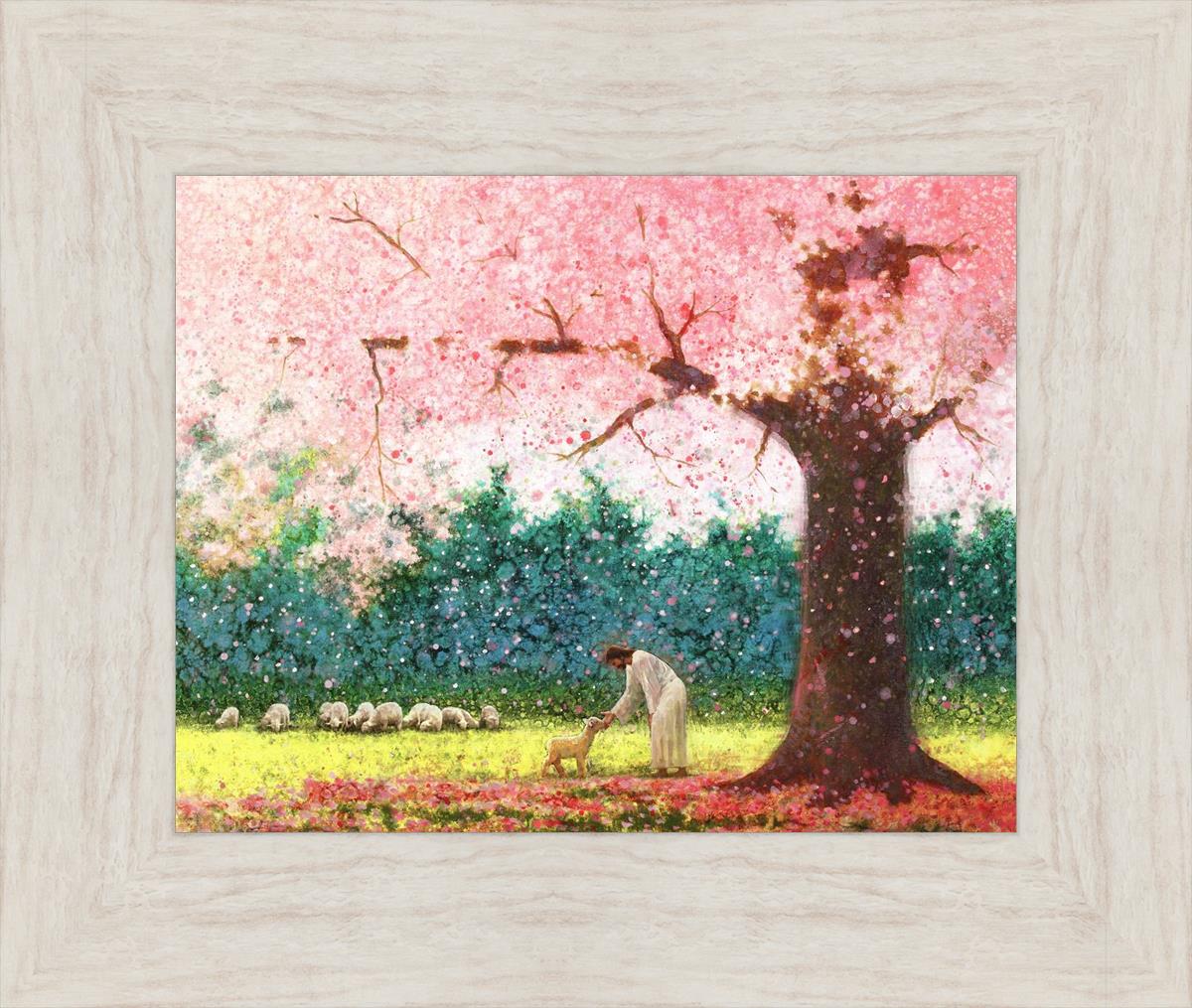 In Green Pastures is a painting by Yongsung Kim. This painting depicts Jesus Christ tending to a lamb under a beautiful pink tree.
