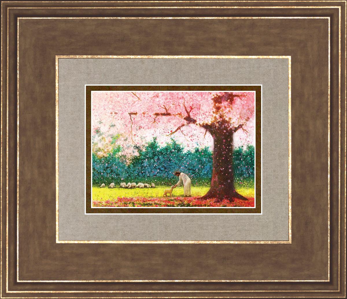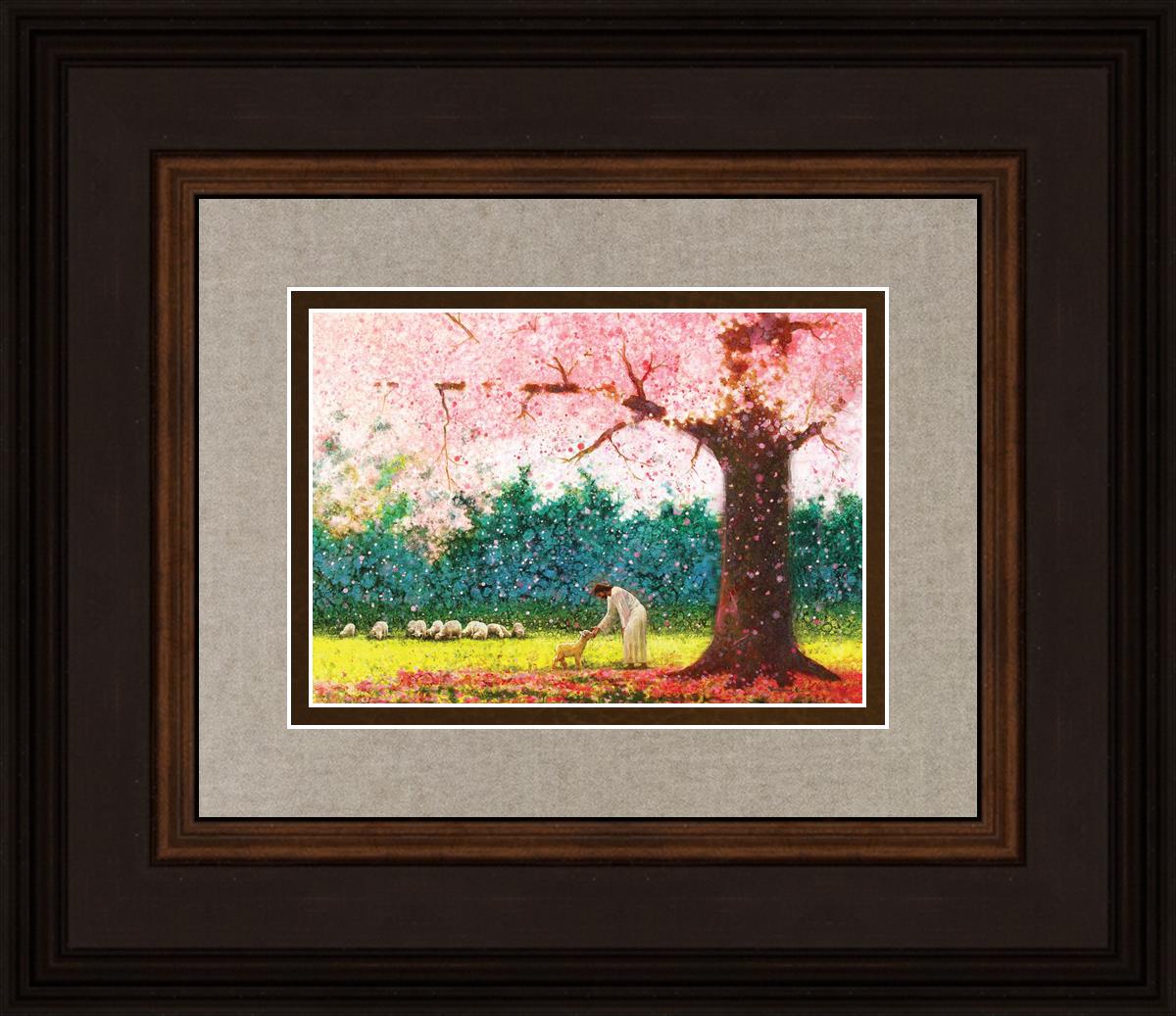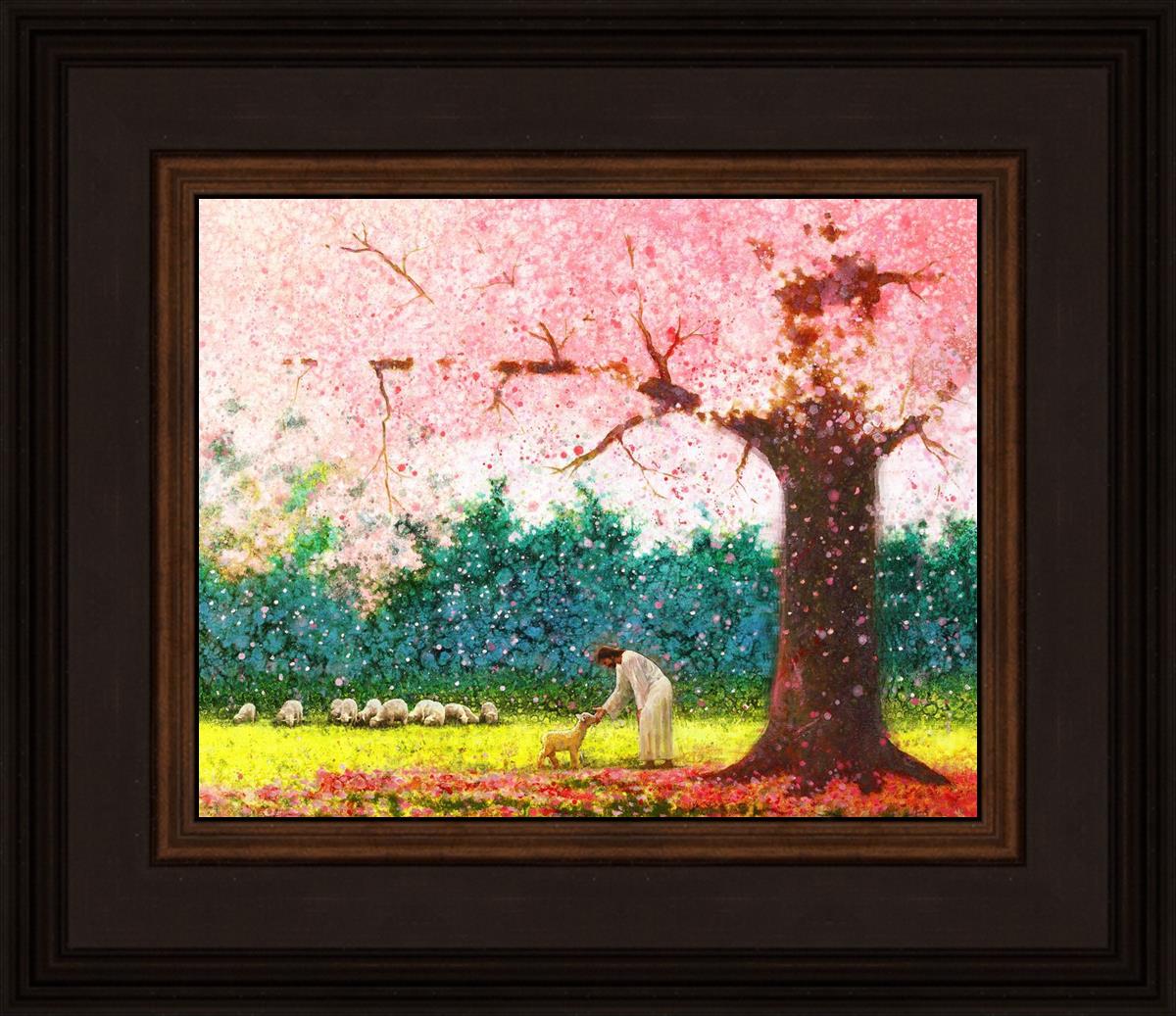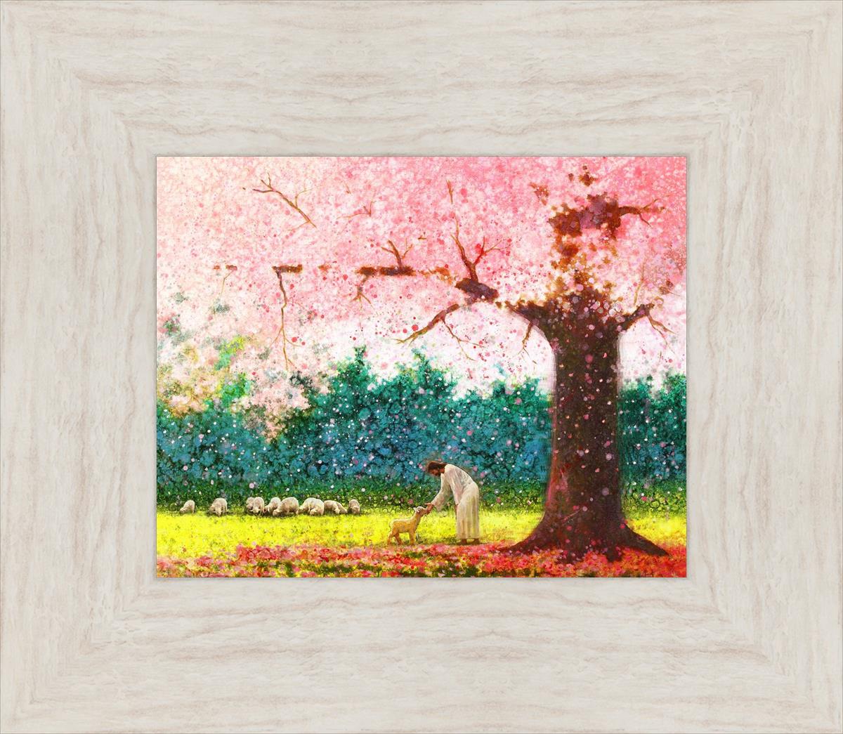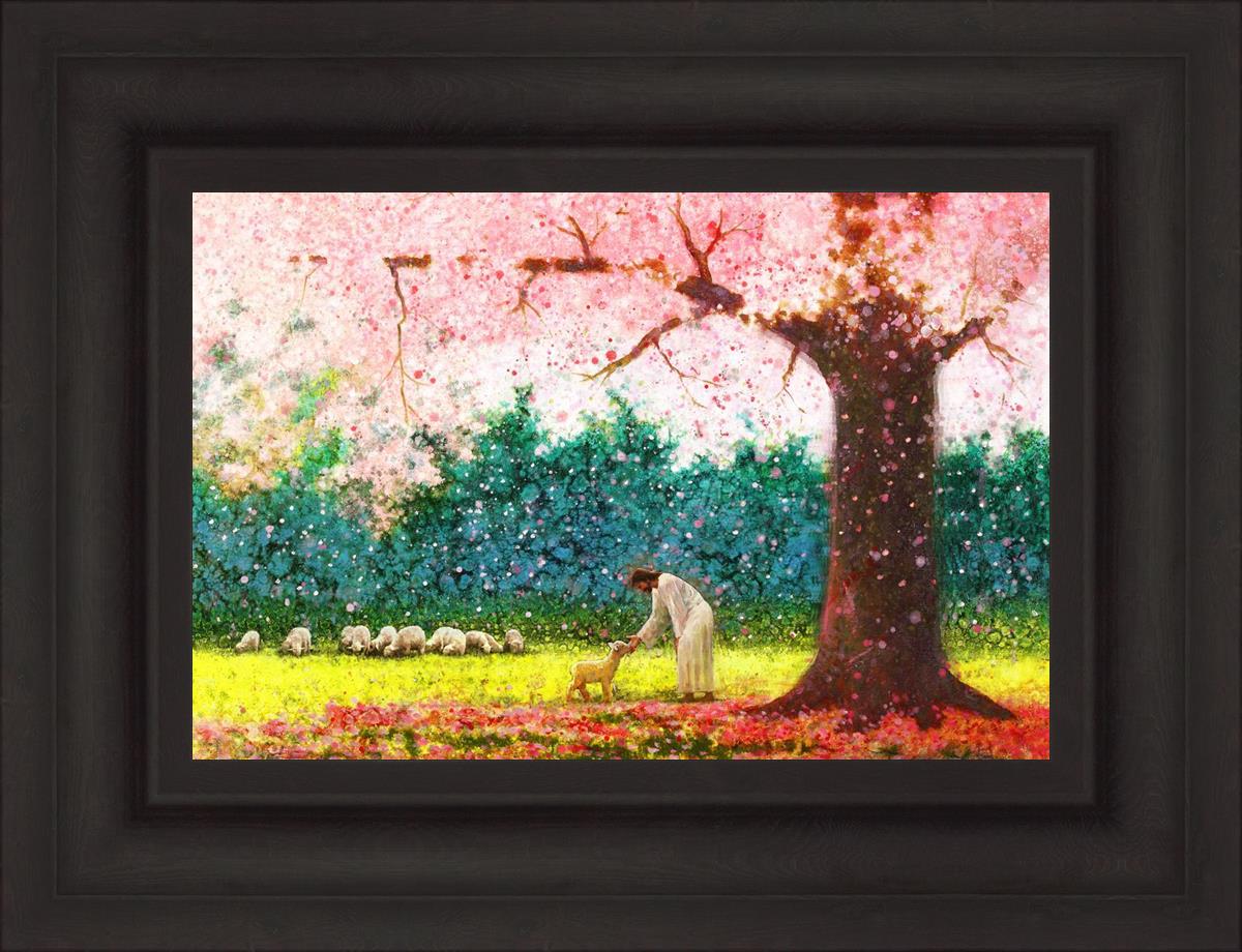 In Green Pastures is a painting by Yongsung Kim. This painting depicts Jesus Christ tending to a lamb under a beautiful pink tree.