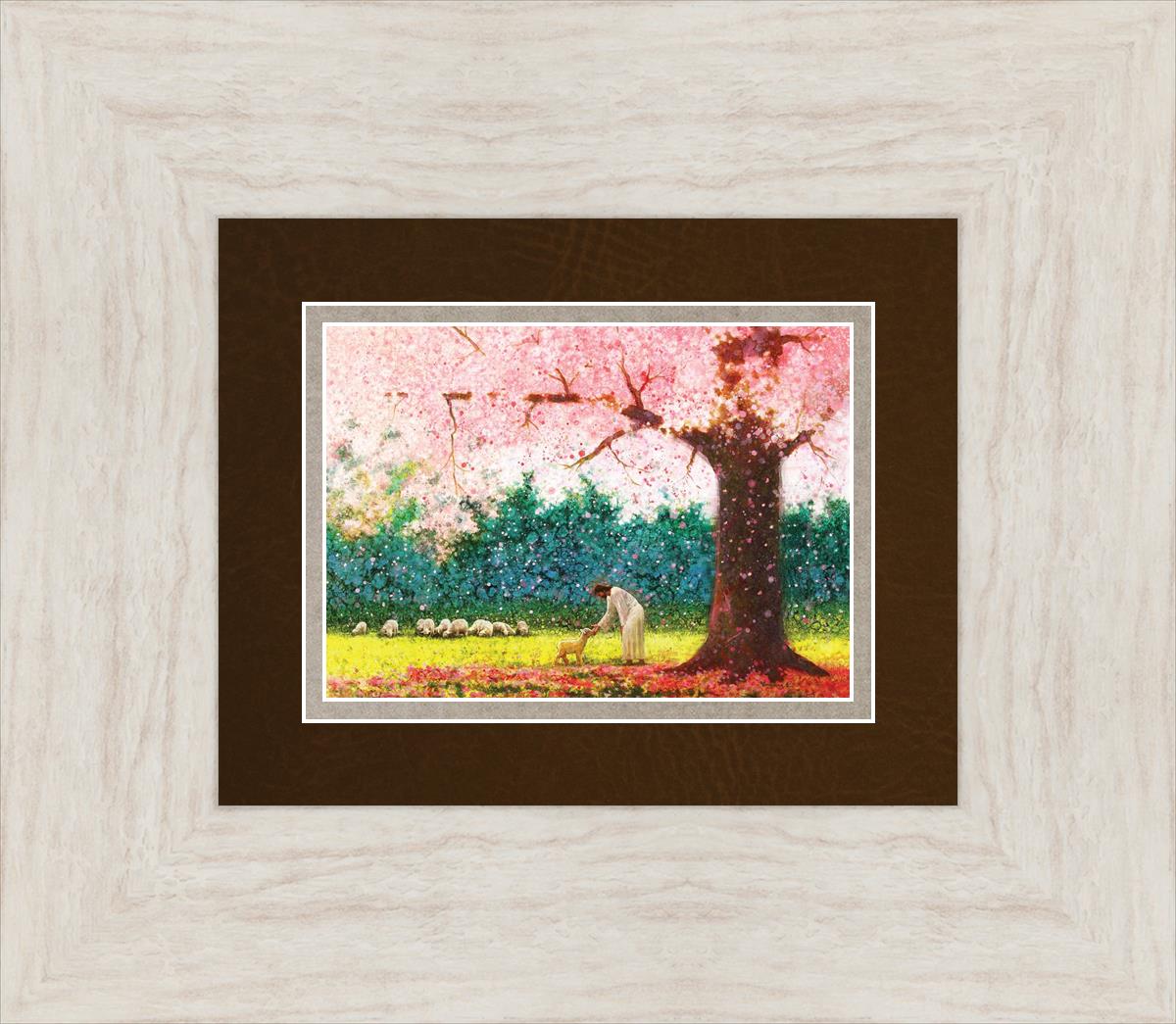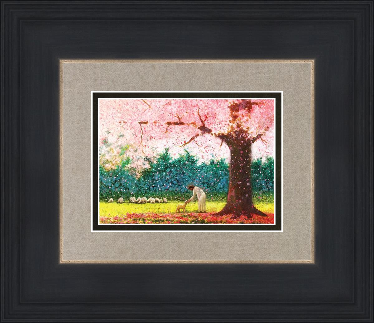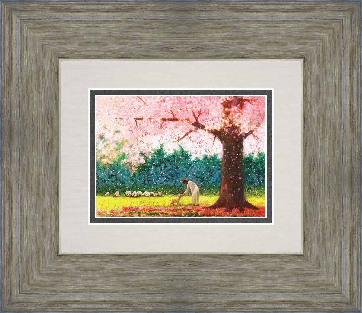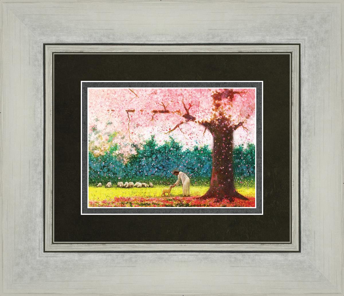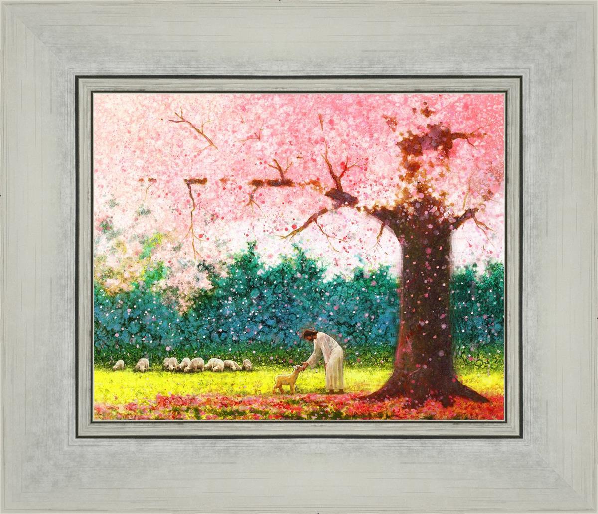 In Green Pastures is a painting by Yongsung Kim. This painting depicts Jesus Christ tending to a lamb under a beautiful pink tree.