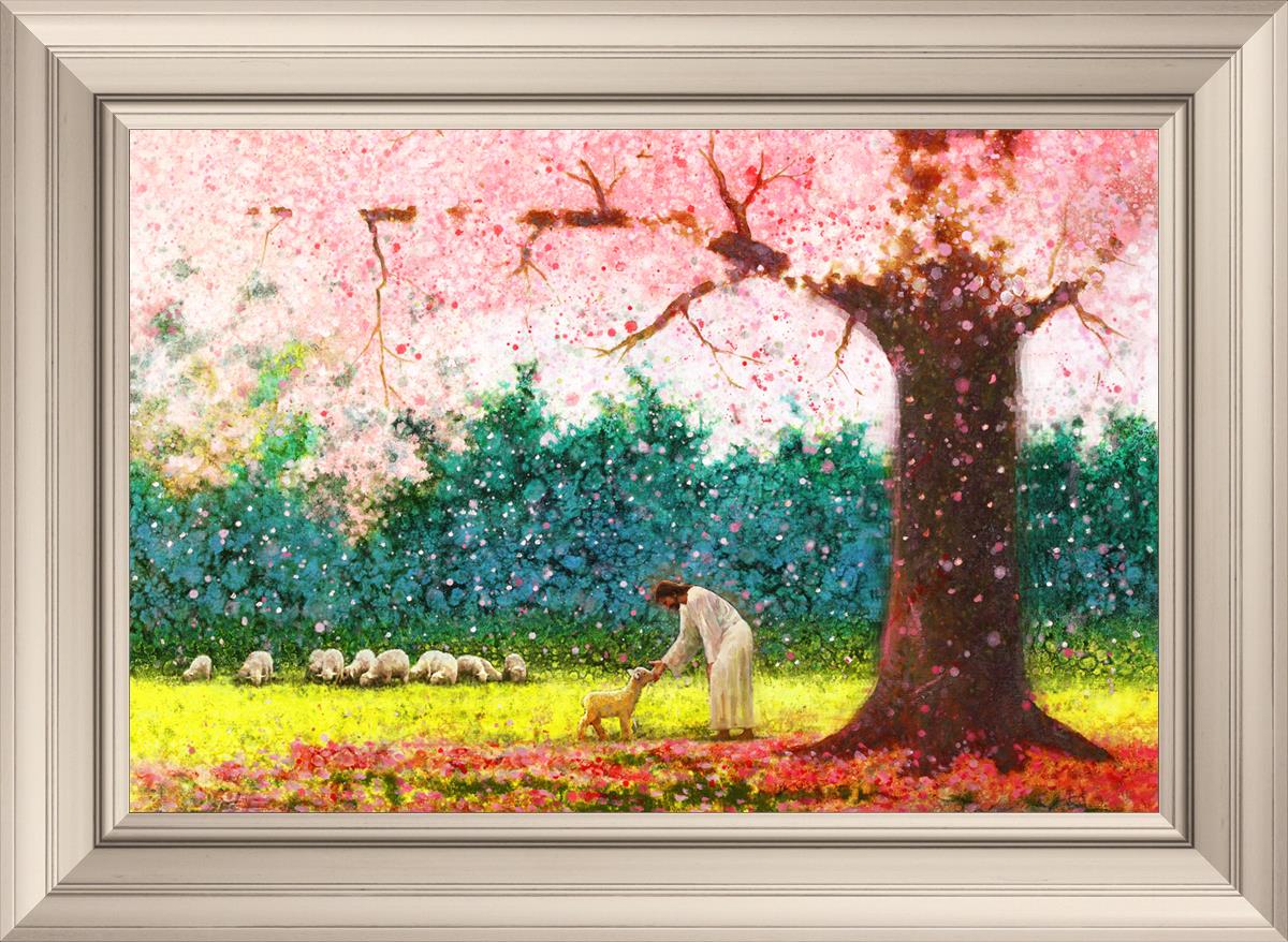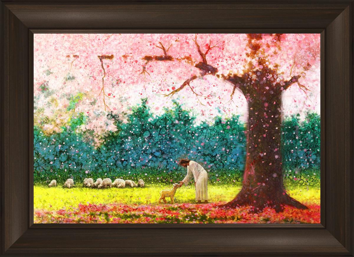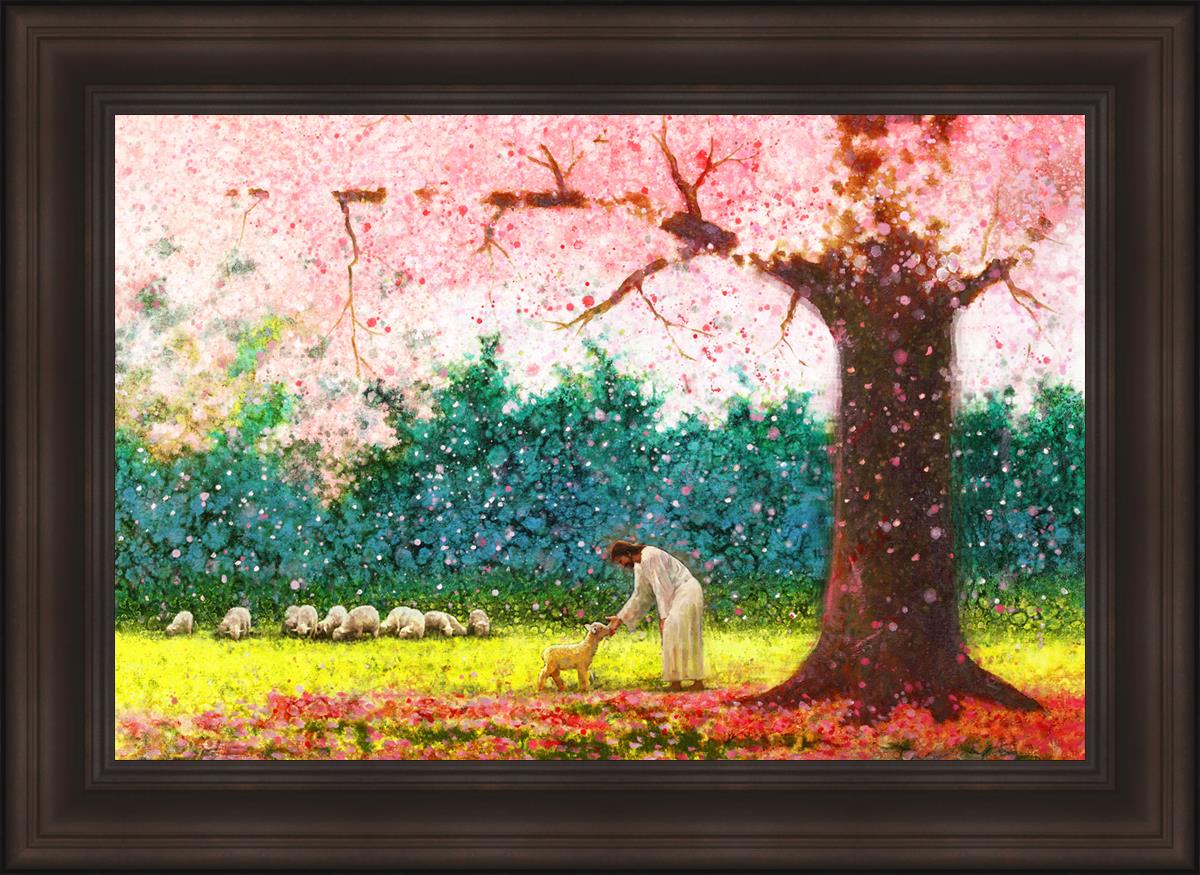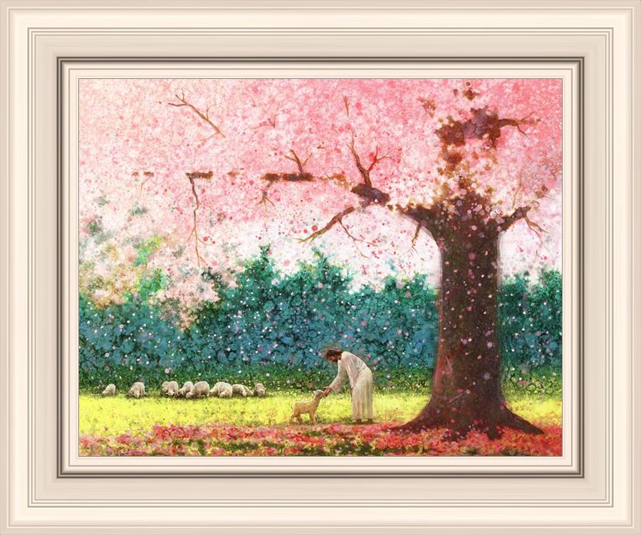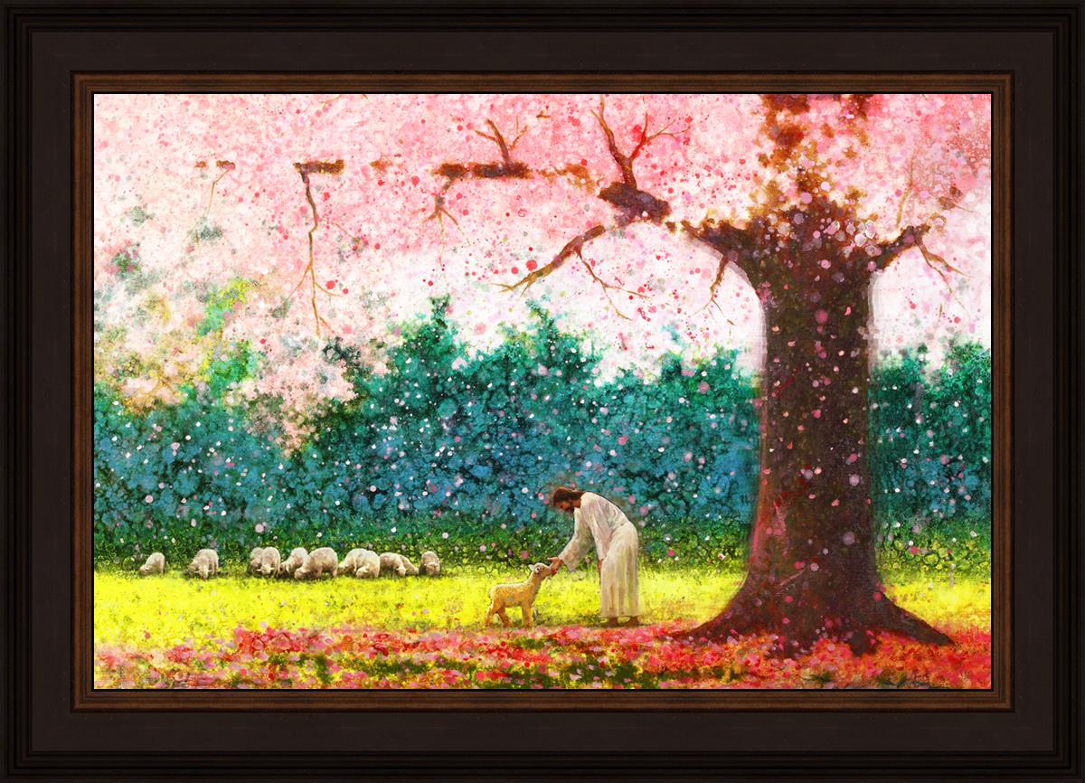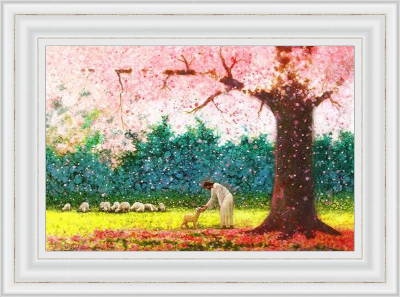 In Green Pastures by Yongsung Kim depicts Jesus Christ under a pink blossoming tree reaching out to a lamb with a flock of sheep in the background. This painting is available in print and canvas.