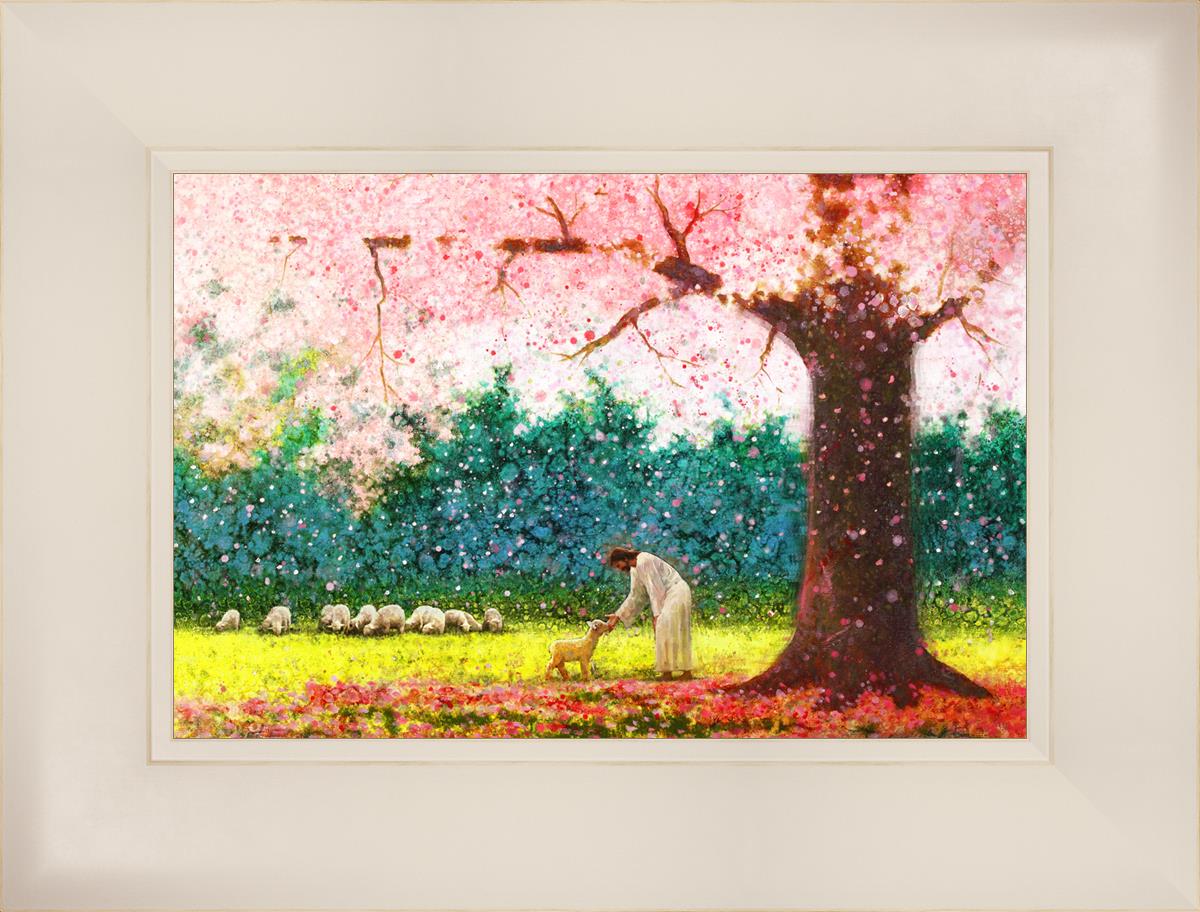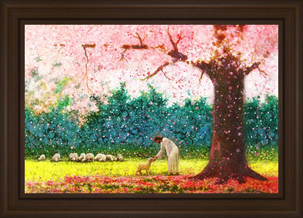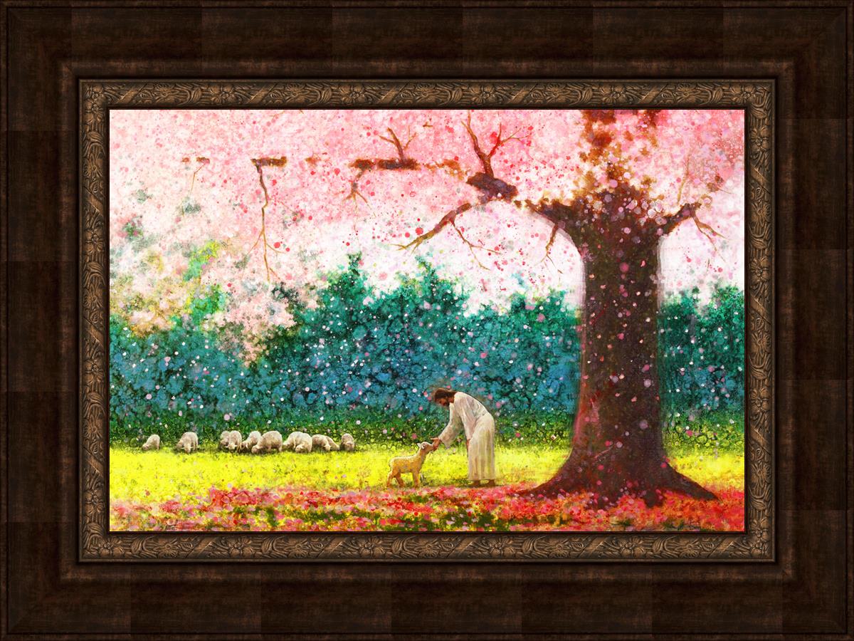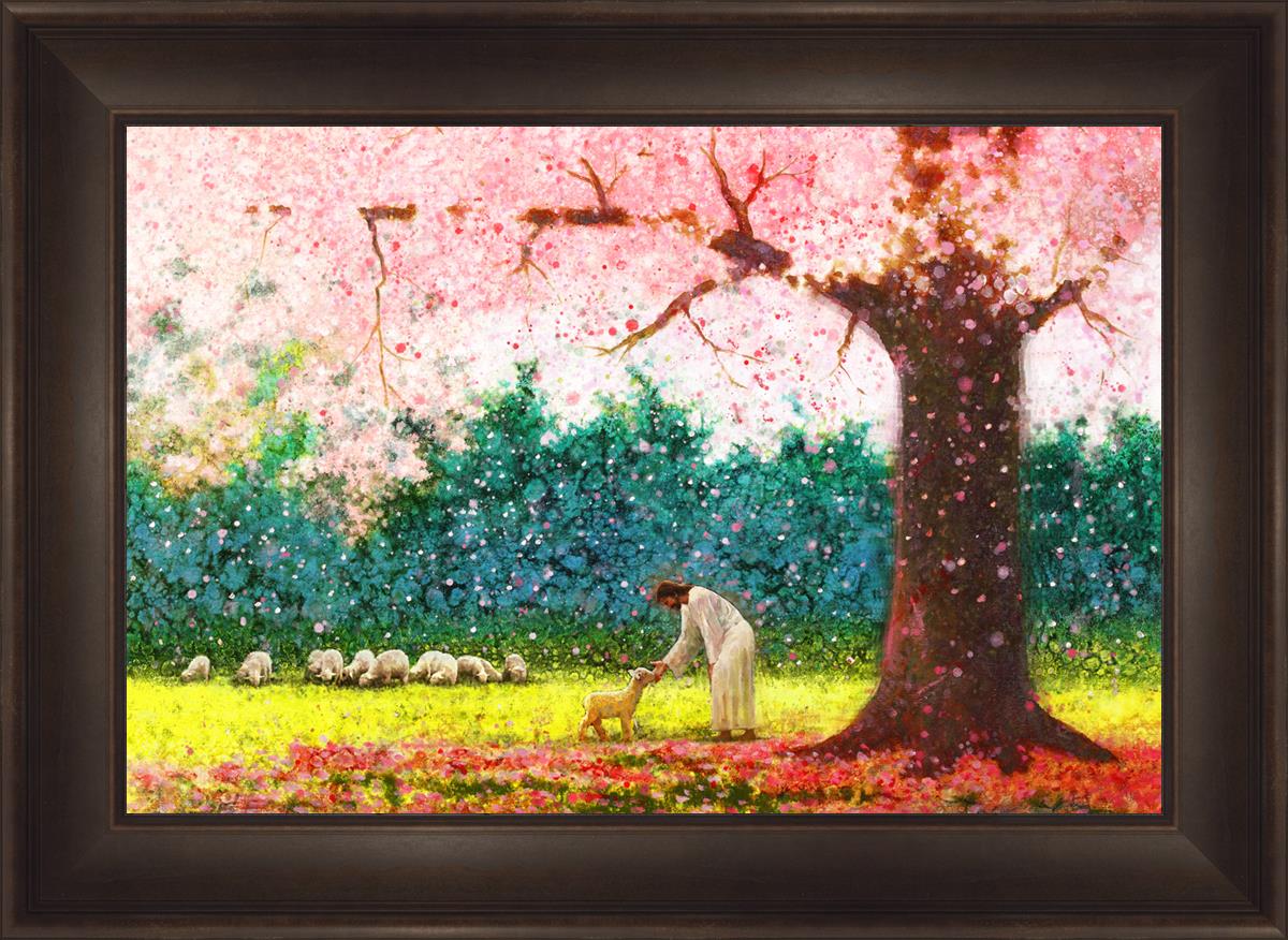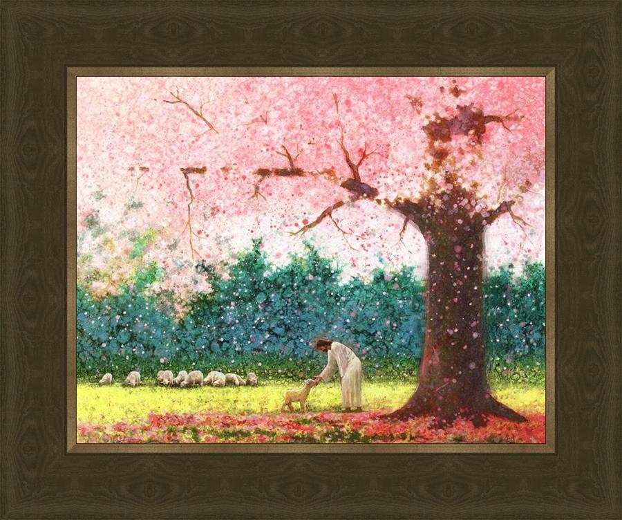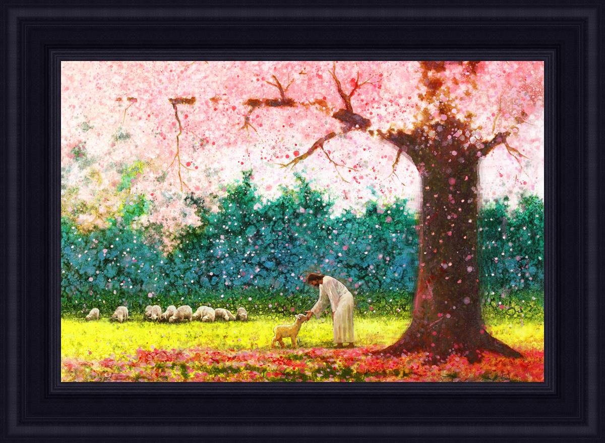 In Green Pastures by Yongsung Kim depicts Jesus Christ under a pink blossoming tree reaching out to a lamb with a flock of sheep in the background. This painting is available in print and canvas.