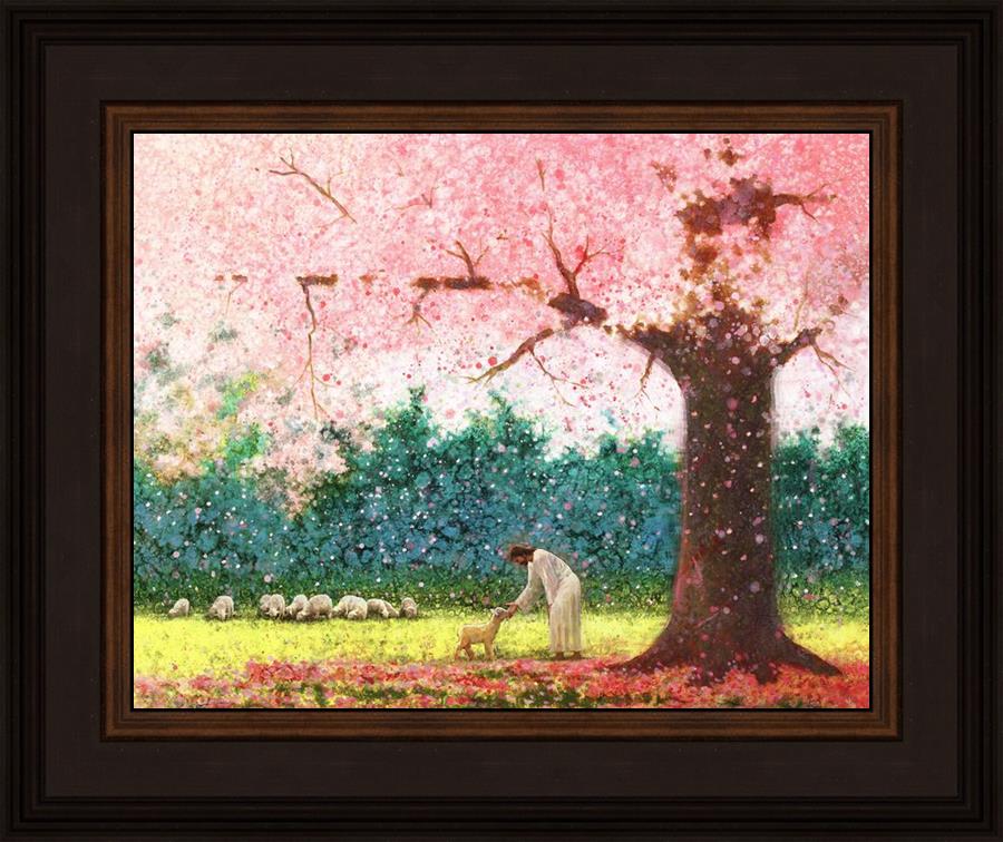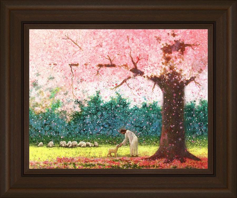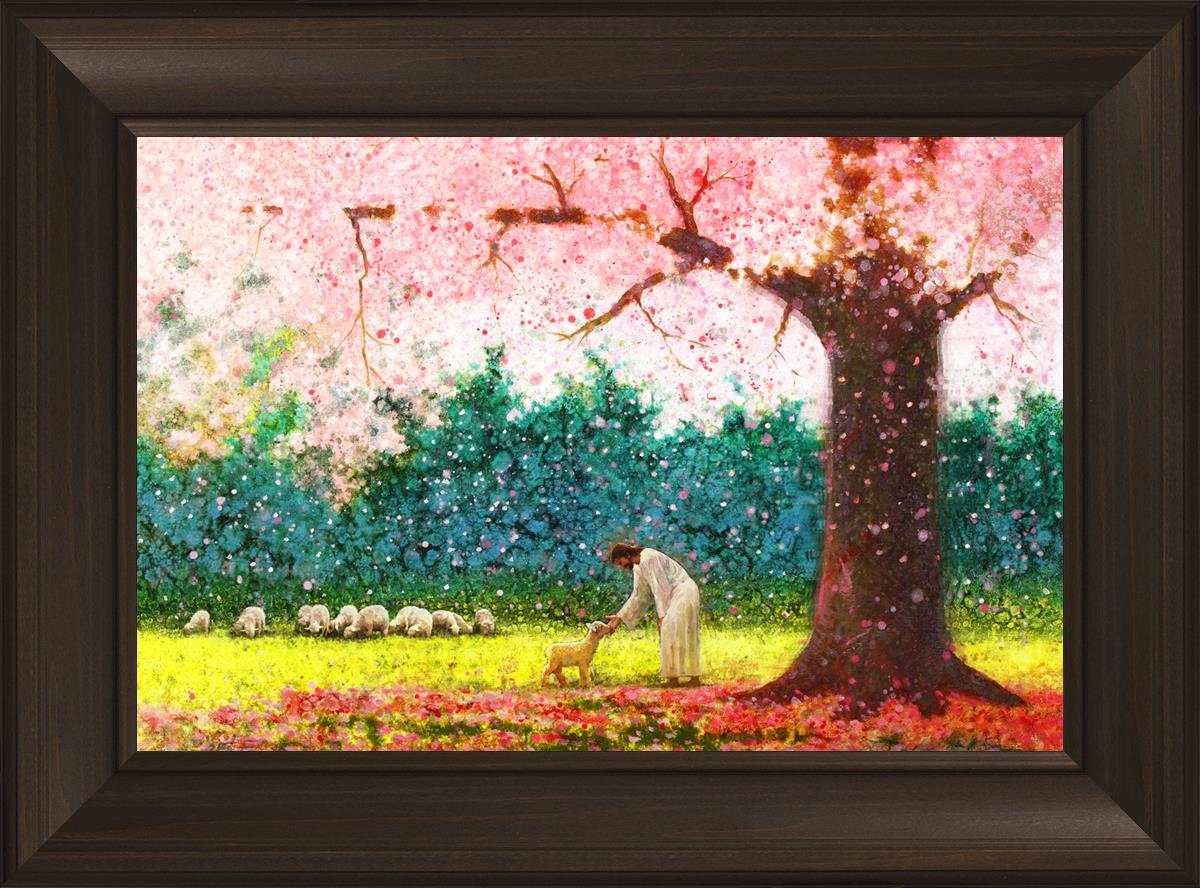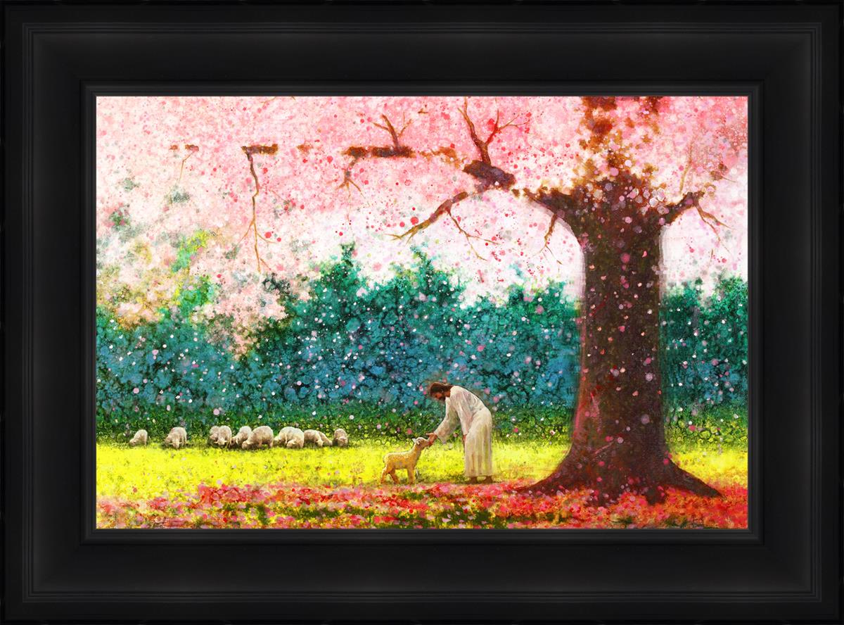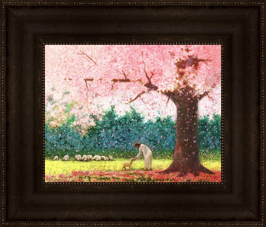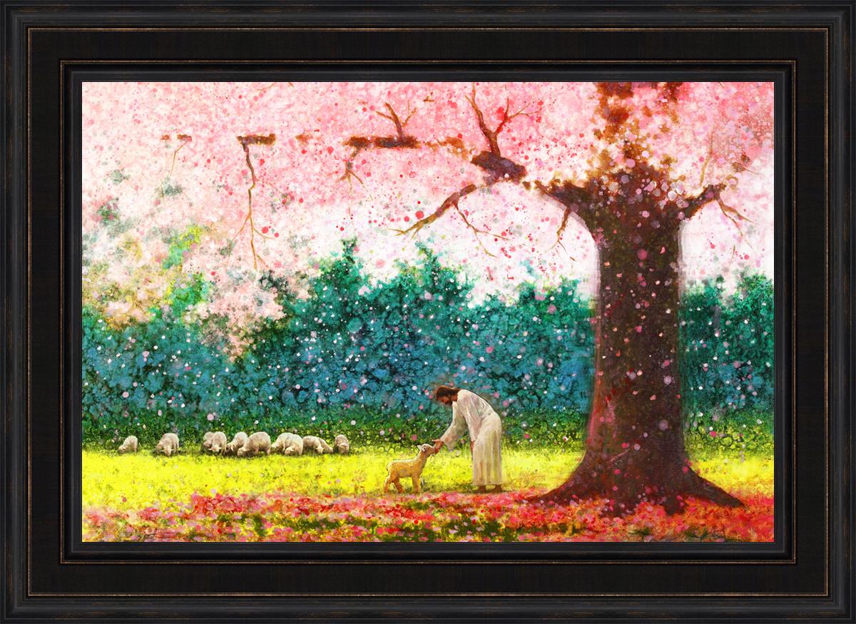 In Green Pastures by Yongsung Kim depicts Jesus Christ under a pink blossoming tree reaching out to a lamb with a flock of sheep in the background. This painting is available in print and canvas.