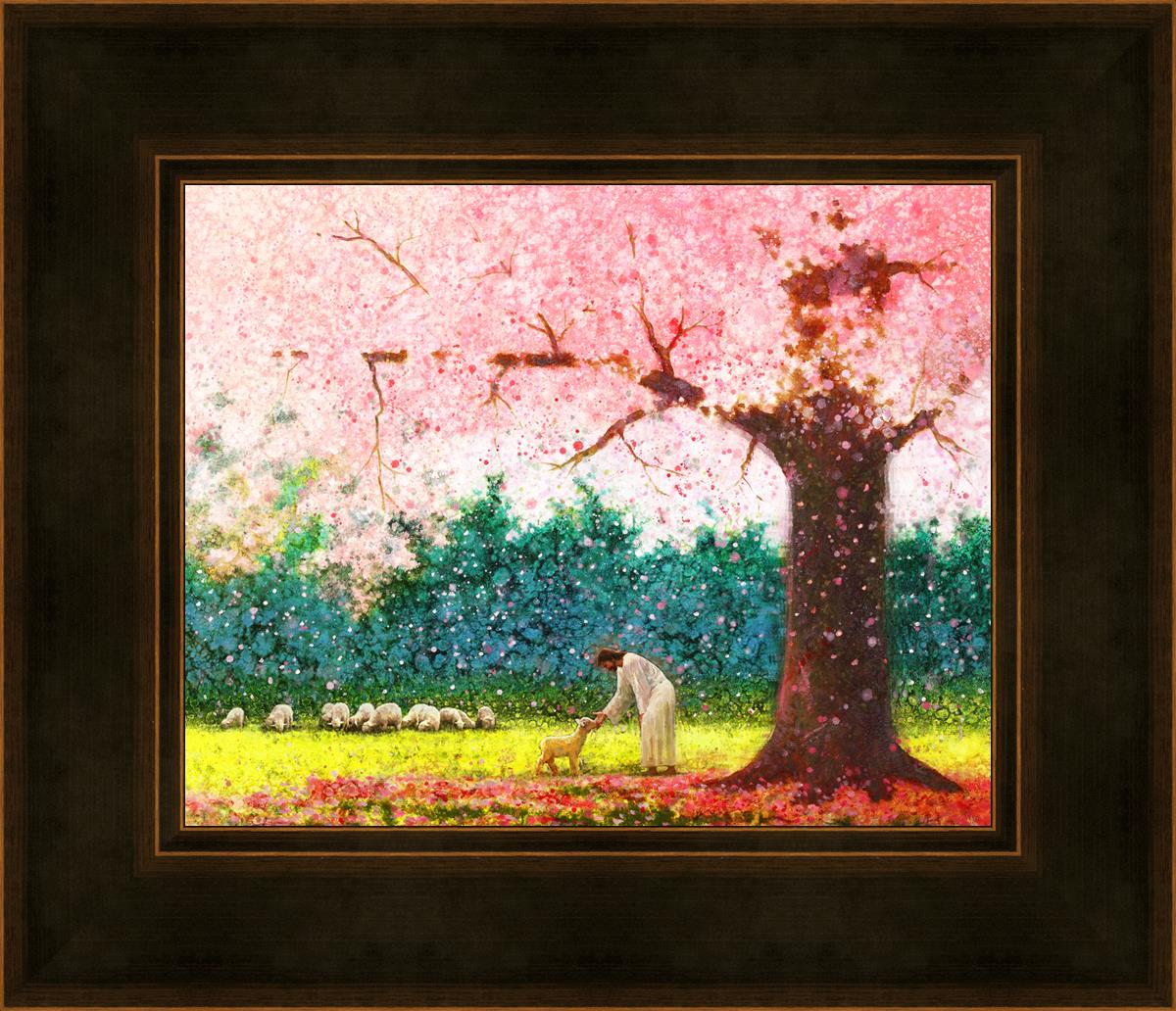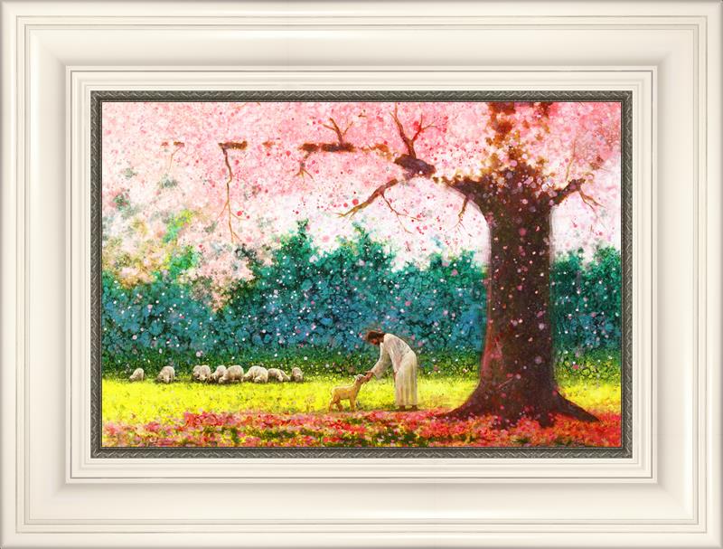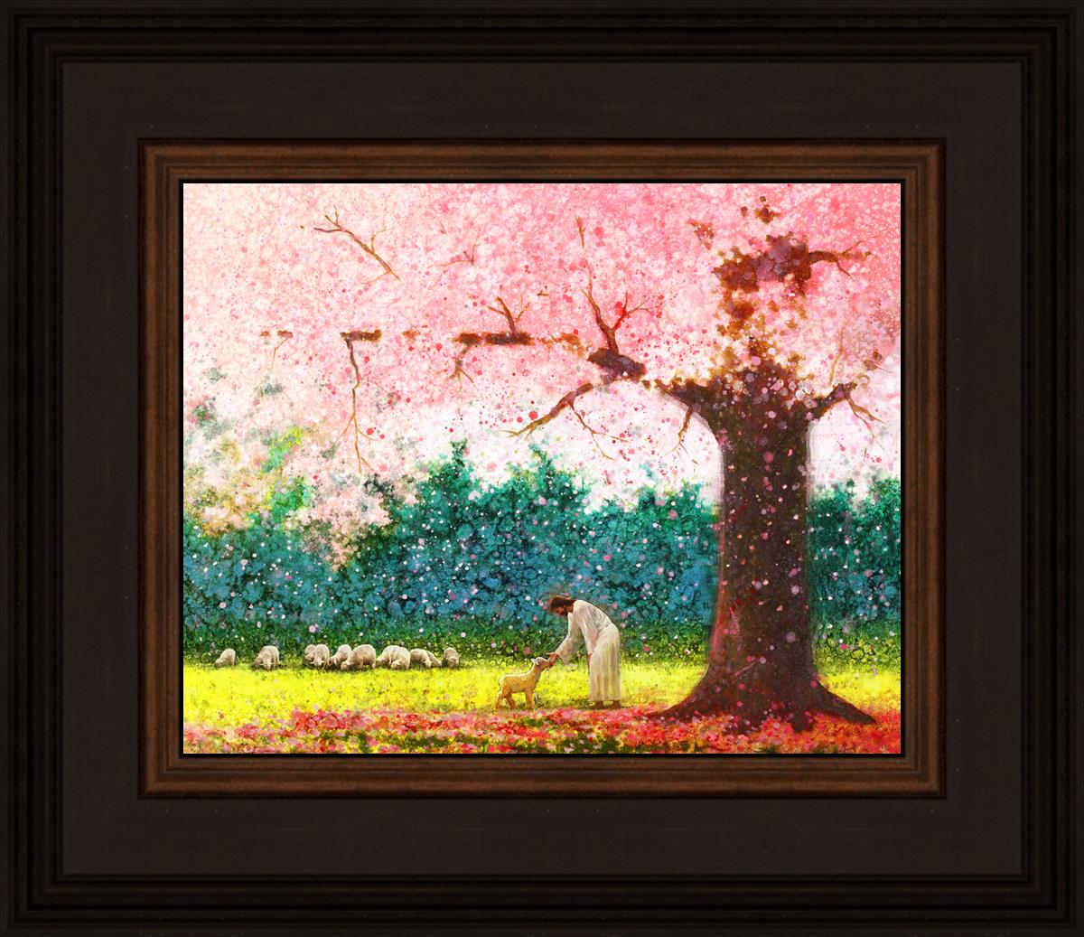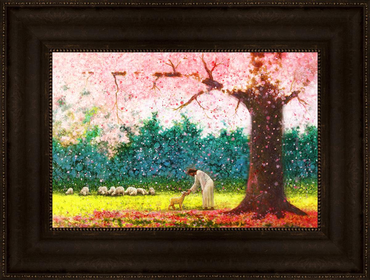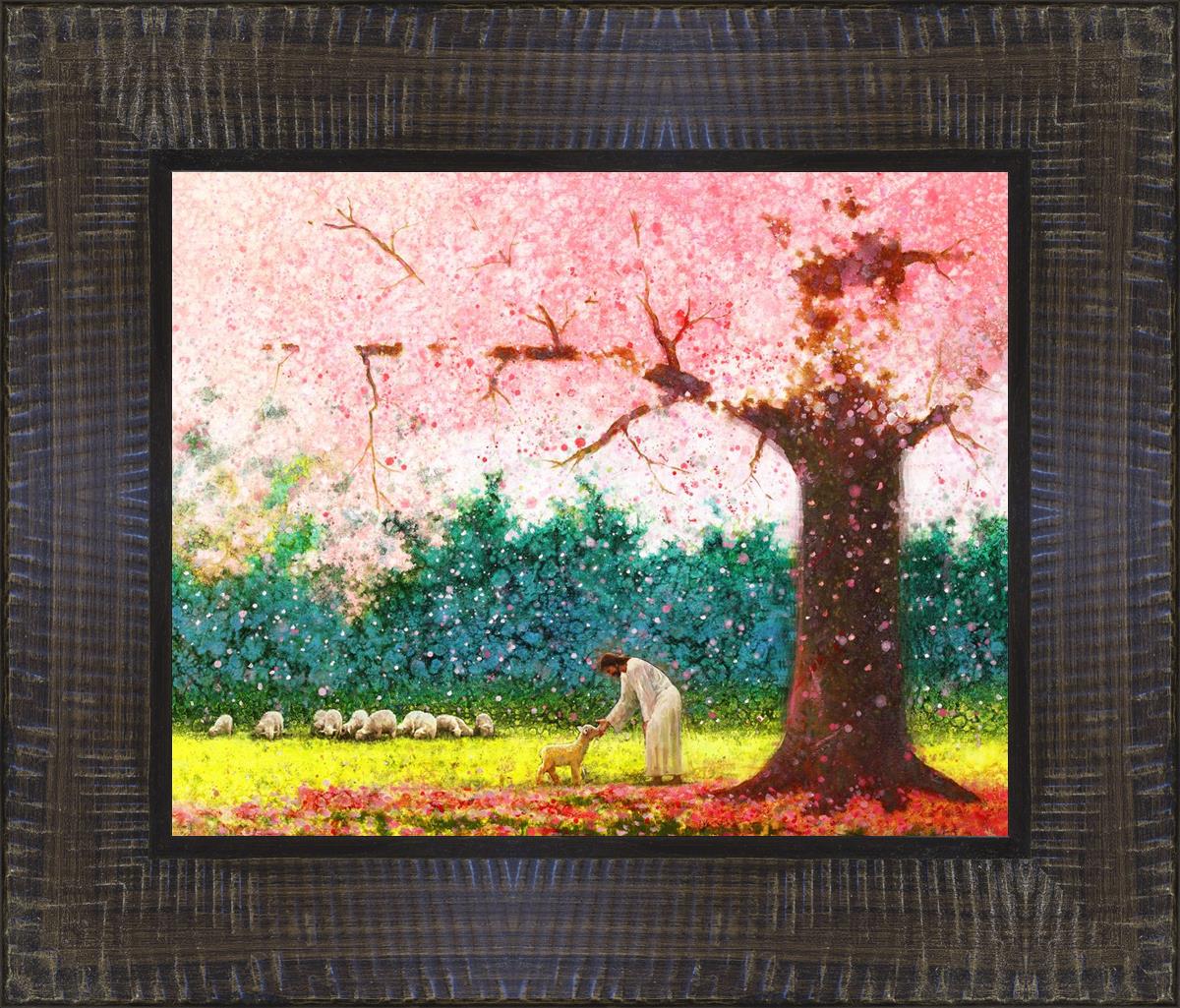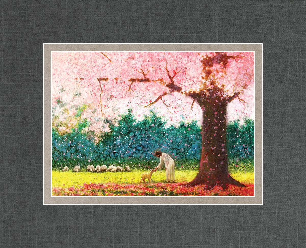 In Green Pastures by Yongsung Kim depicts Jesus Christ under a pink blossoming tree reaching out to a lamb with a flock of sheep in the background. This painting is available in print and canvas.