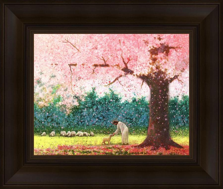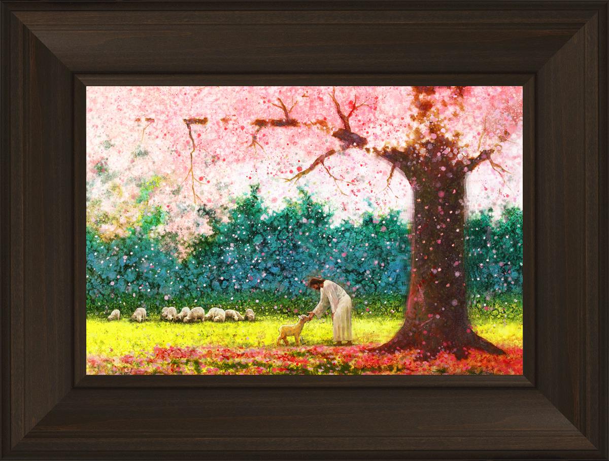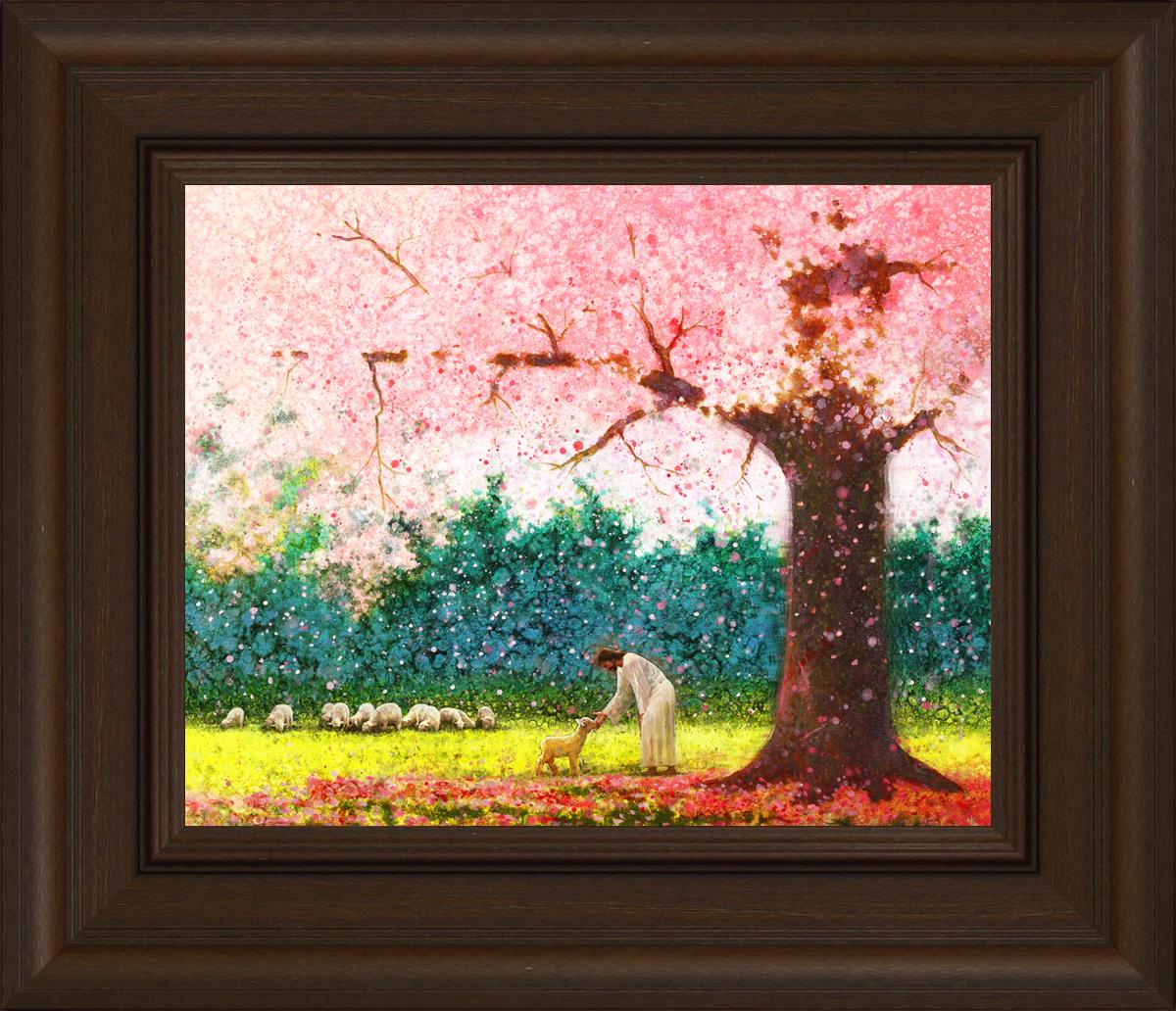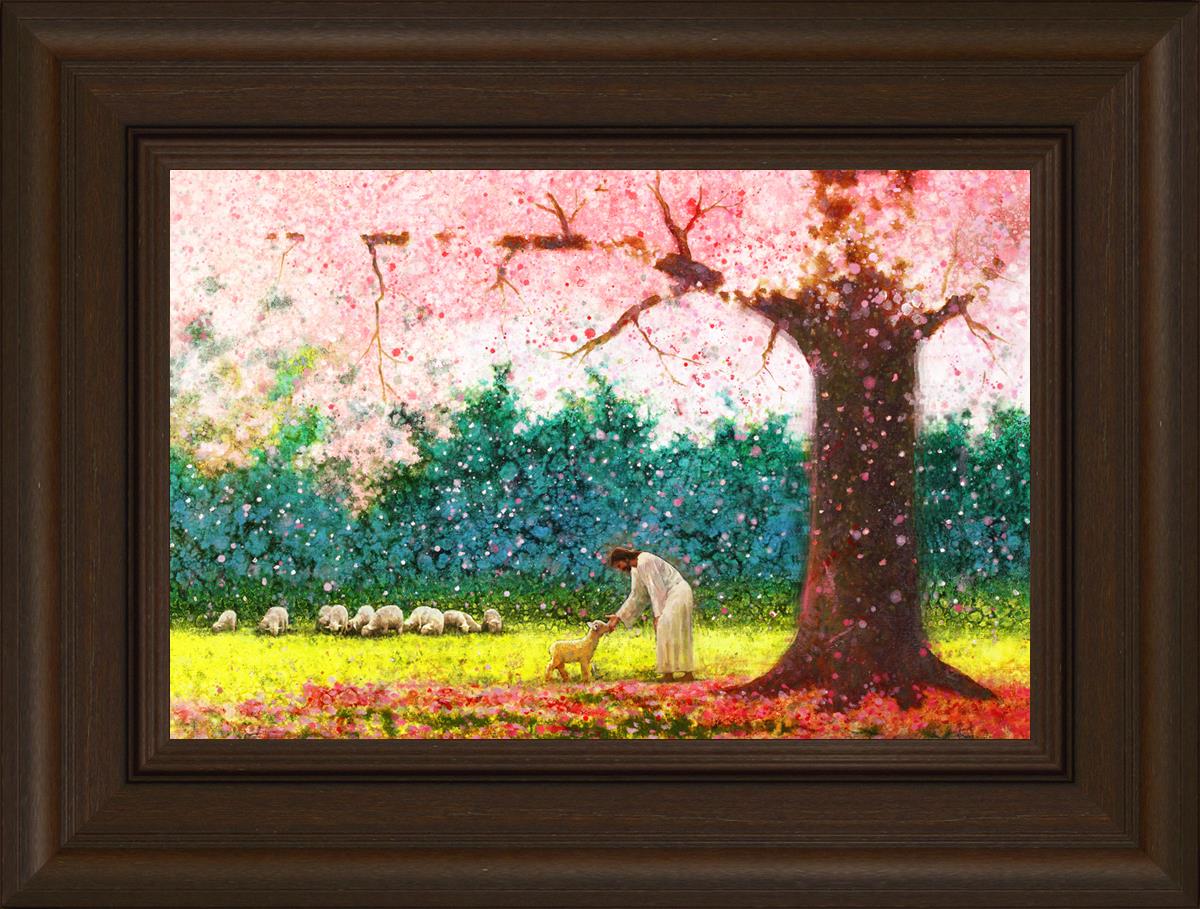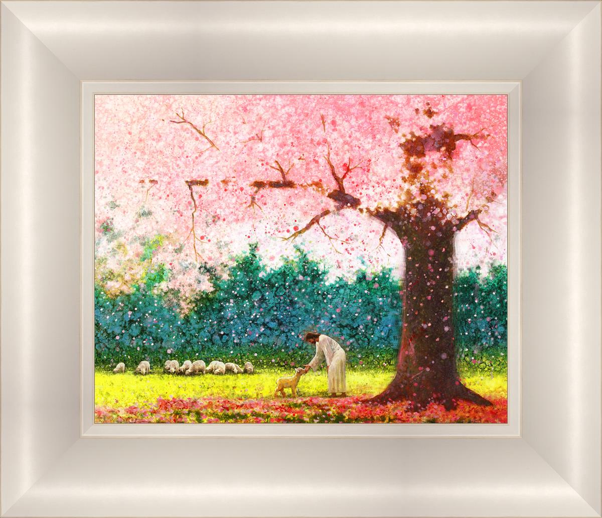 In Green Pastures by Yongsung Kim depicts Jesus Christ under a pink blossoming tree reaching out to a lamb with a flock of sheep in the background. This painting is available in print and canvas.