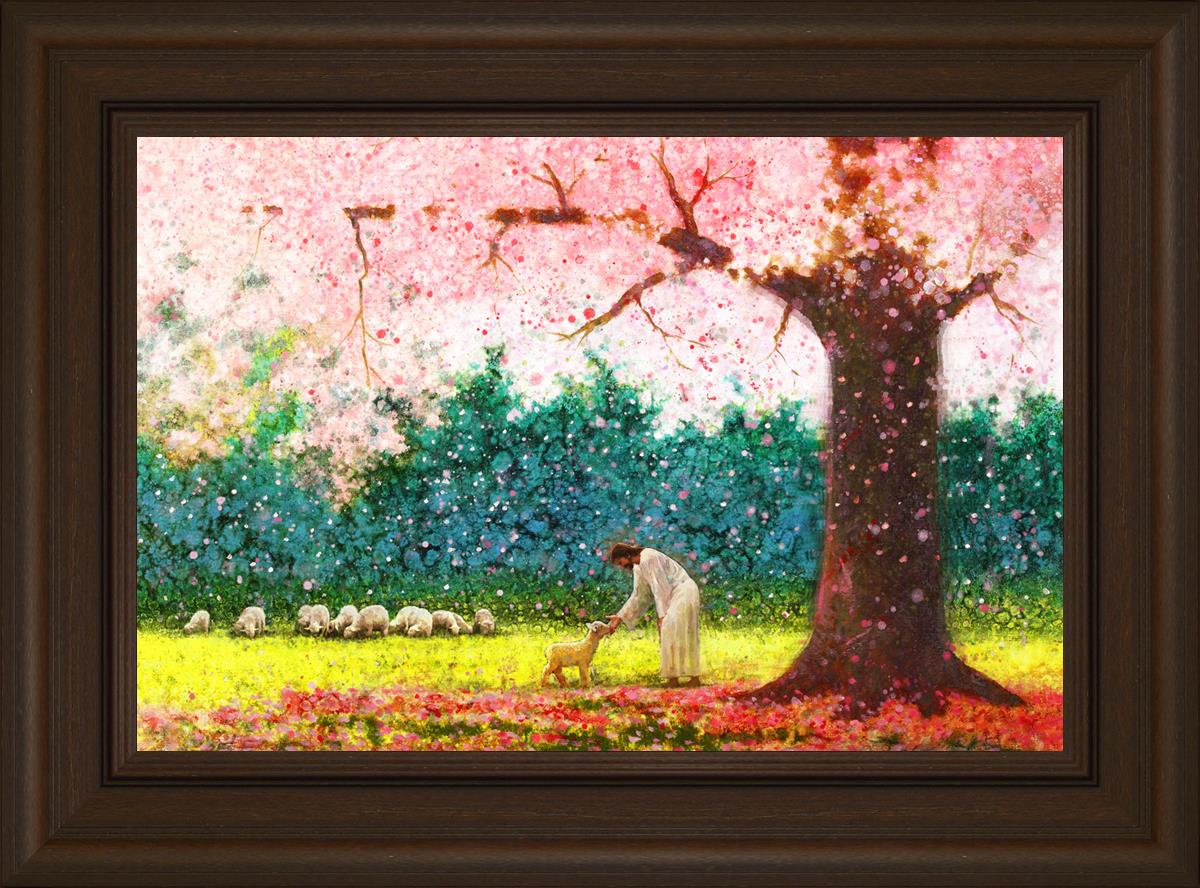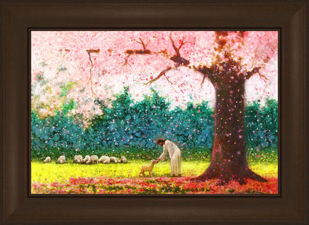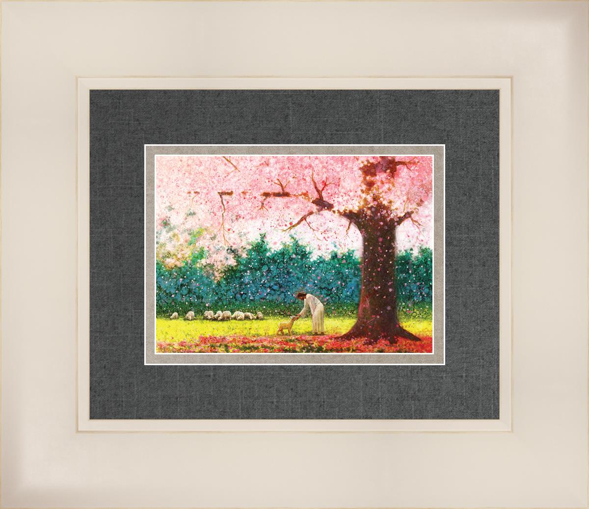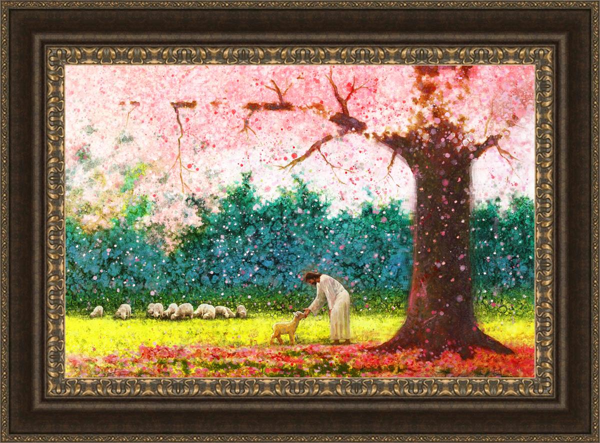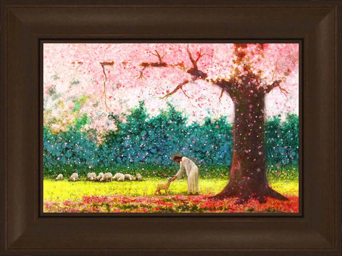 In Green Pastures by Yongsung Kim depicts Jesus Christ under a pink blossoming tree reaching out to a lamb with a flock of sheep in the background. This painting is available in print and canvas.