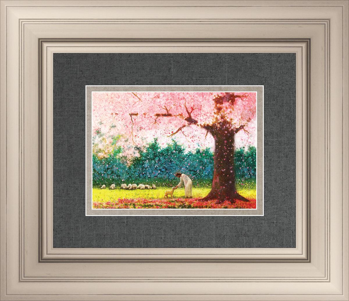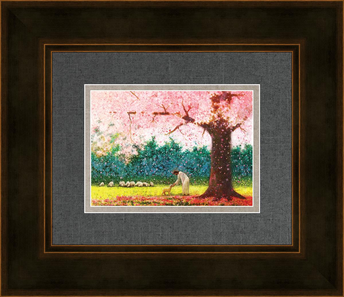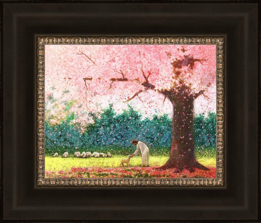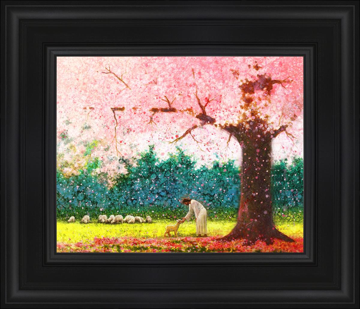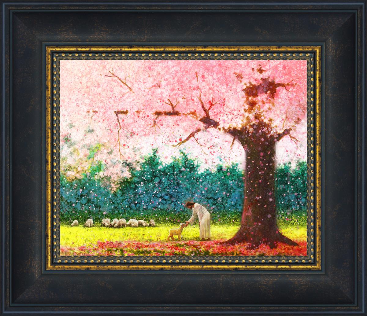 In Green Pastures by Yongsung Kim depicts Jesus Christ under a pink blossoming tree reaching out to a lamb with a flock of sheep in the background. This painting is available in print and canvas.