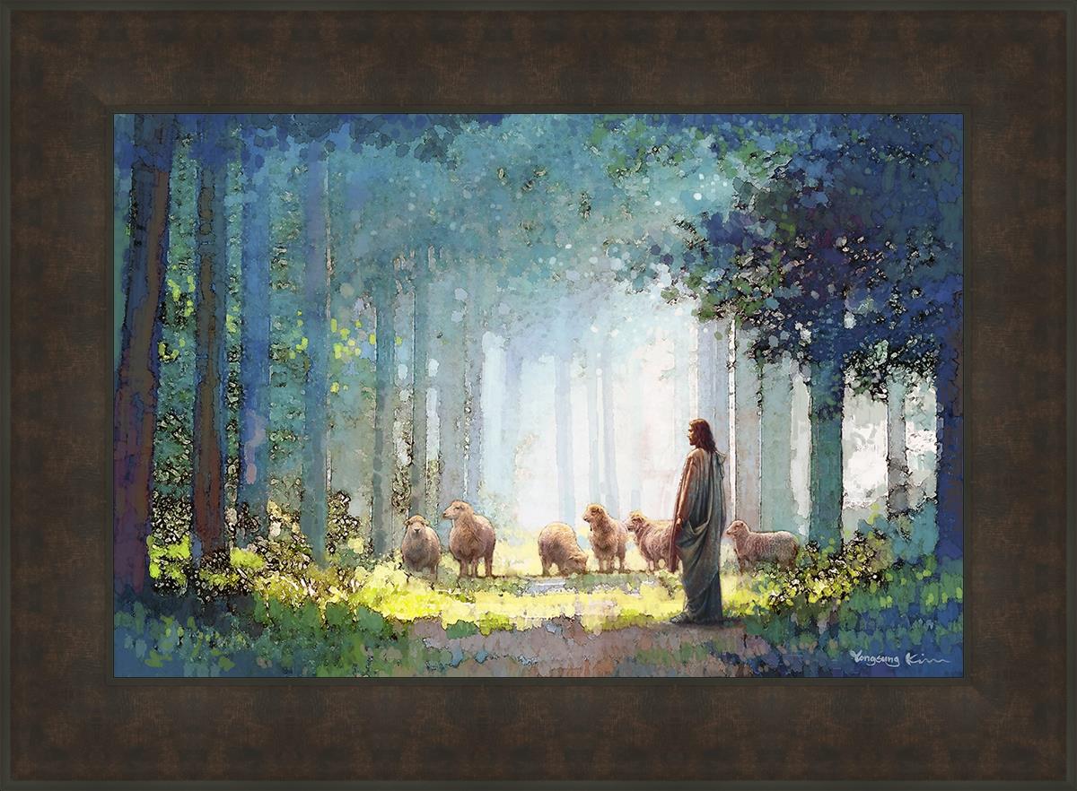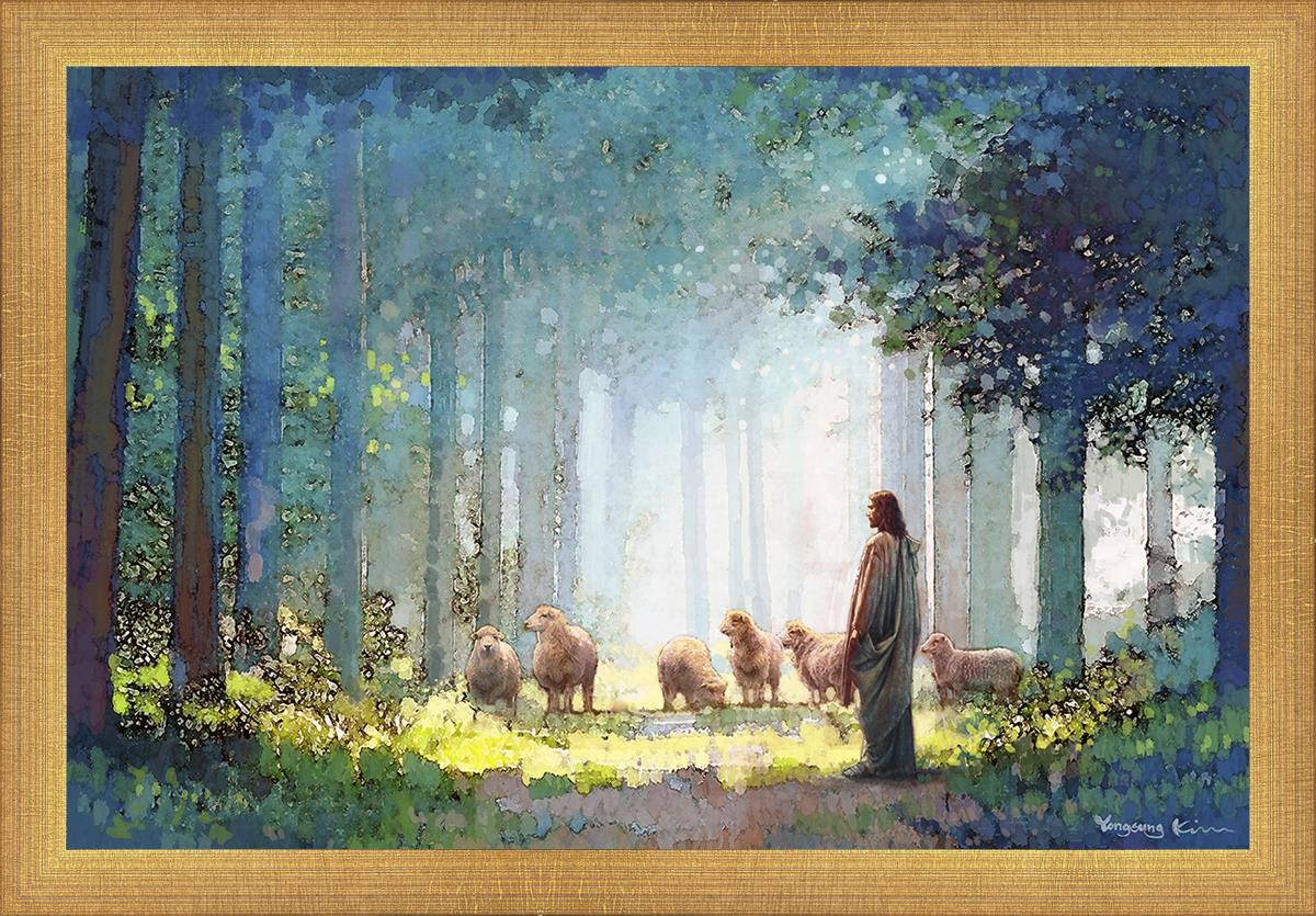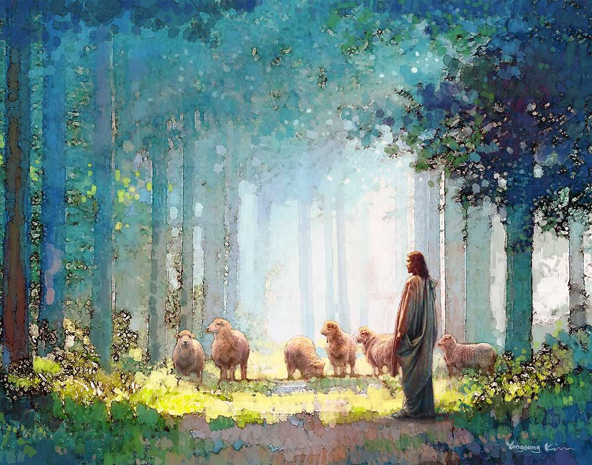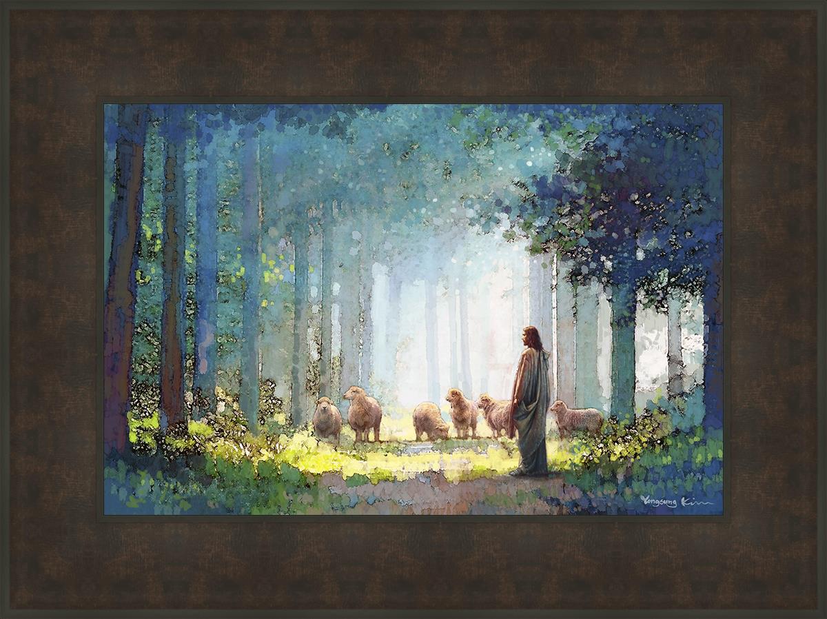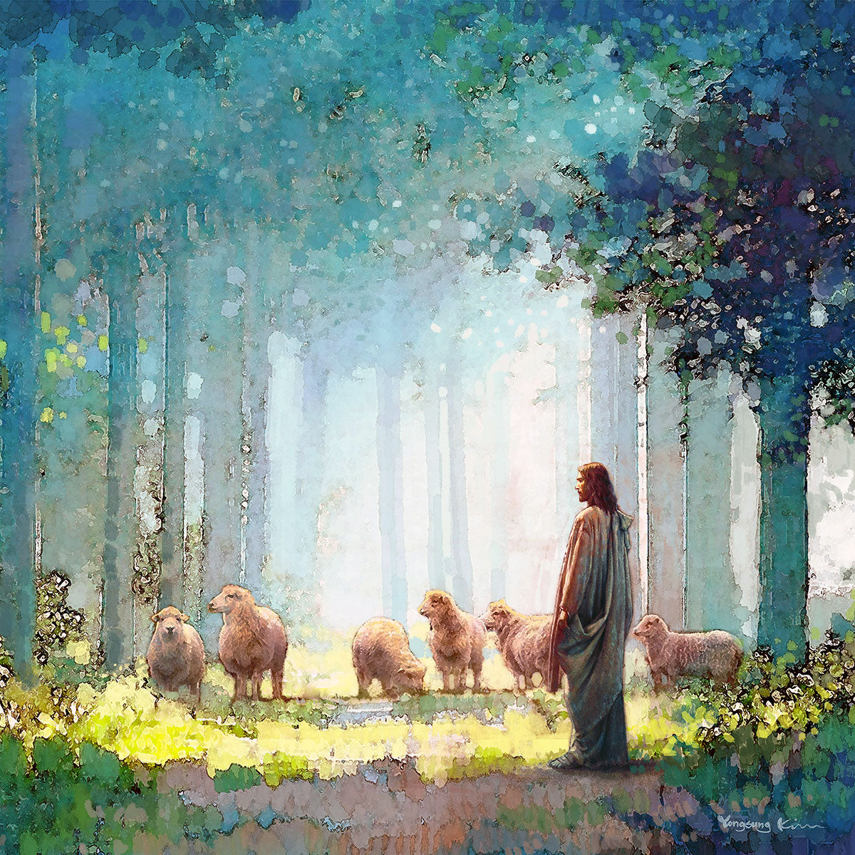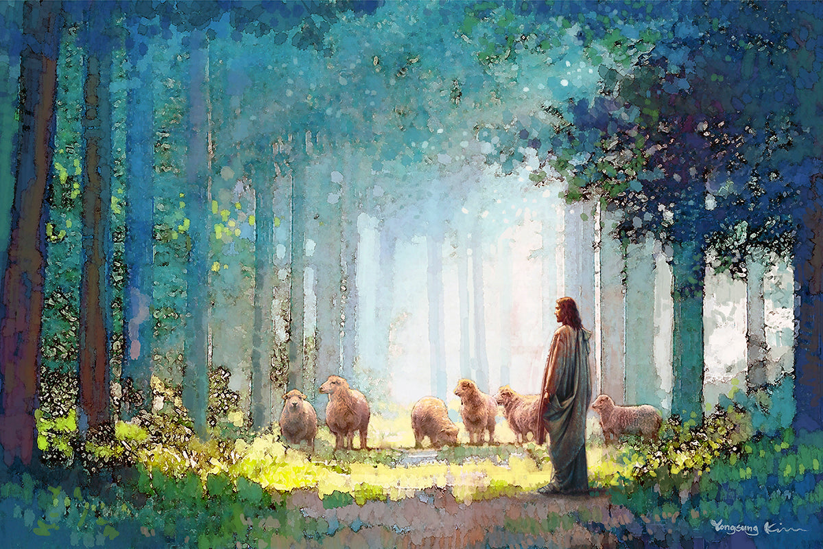 Painting of Keeping Watch by Yongsung Kim featuring Jesus Christ guiding His flock of sheep through a deep blue wilderness