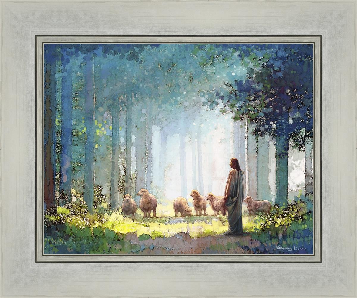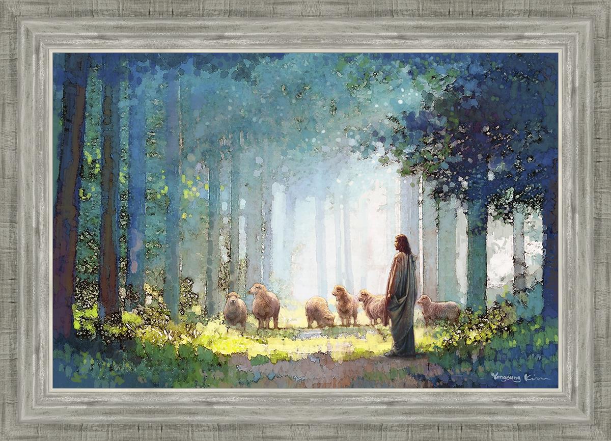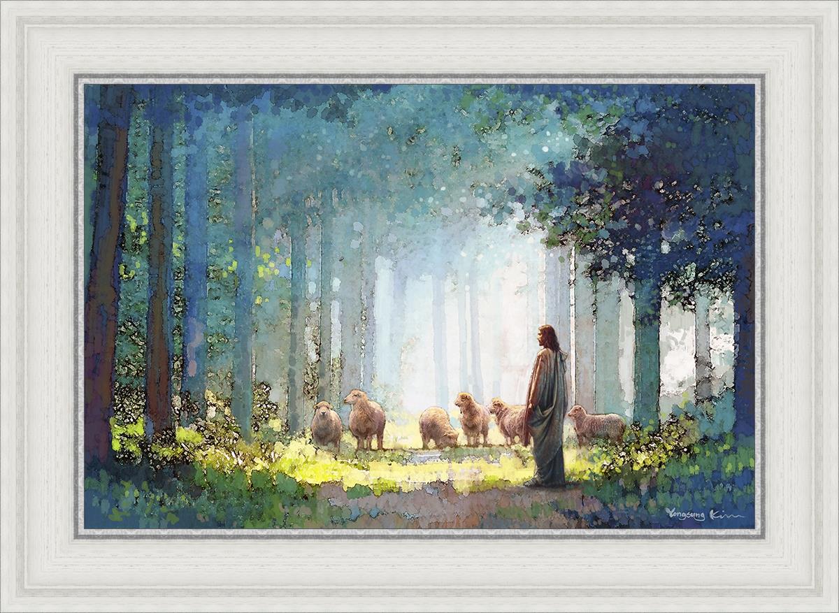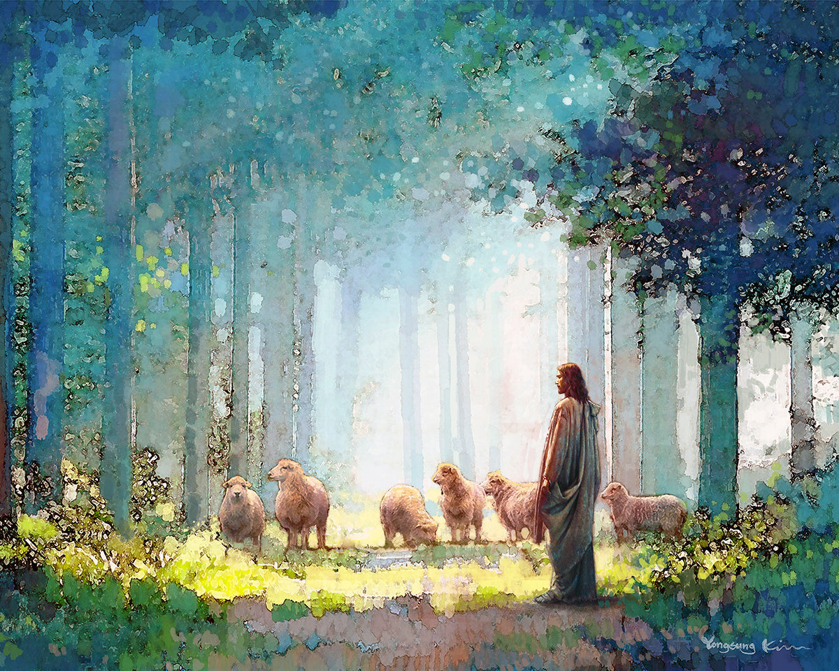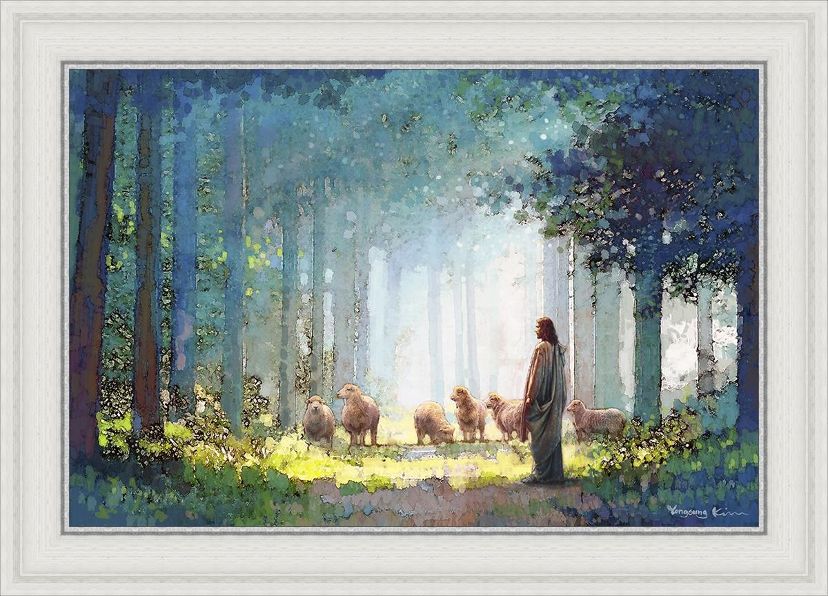 Painting of Keeping Watch by Yongsung Kim featuring Jesus Christ guiding His flock of sheep through a deep blue wilderness
