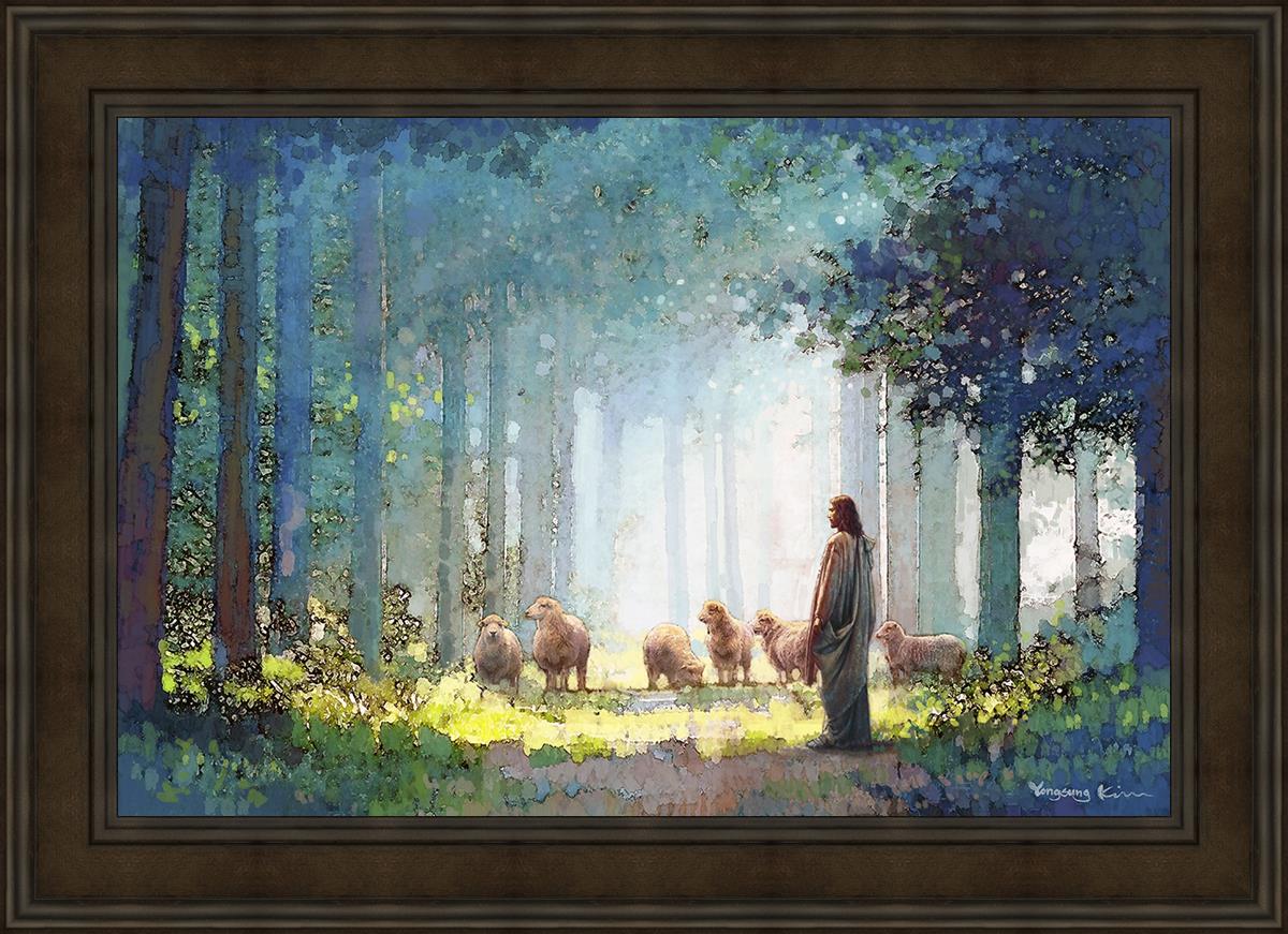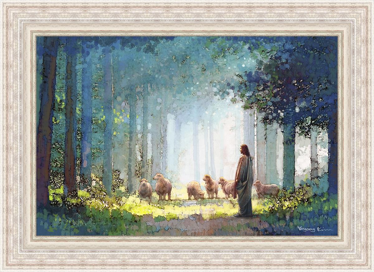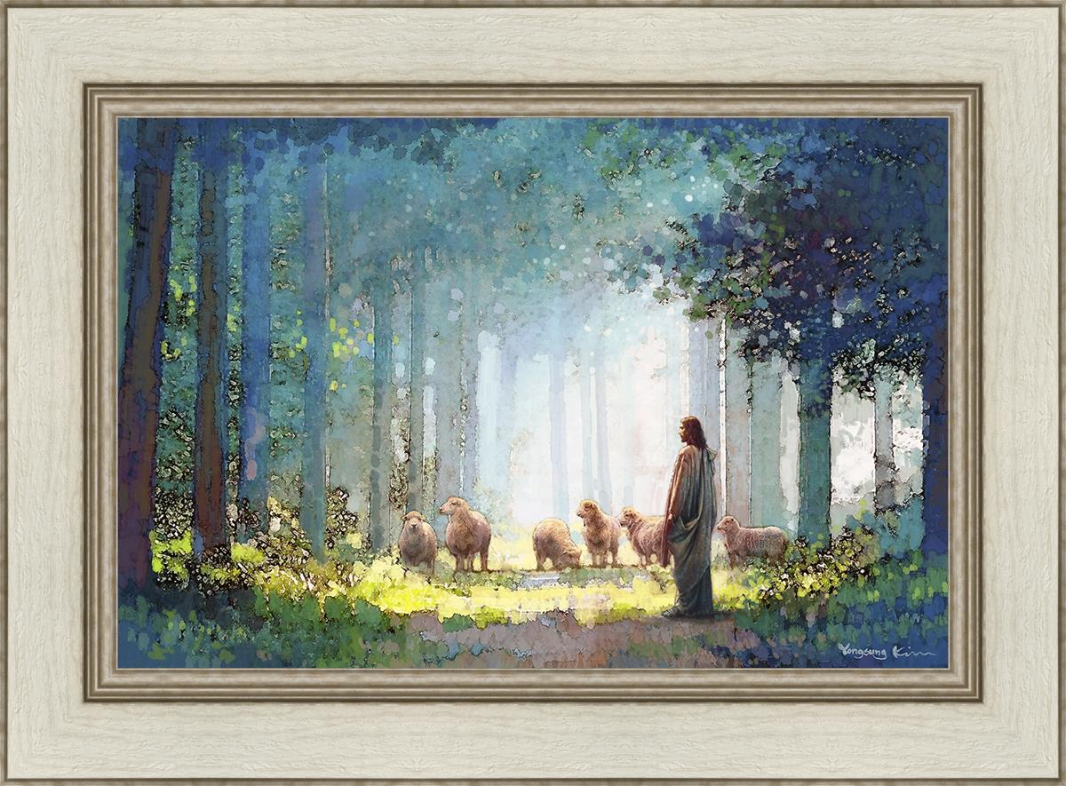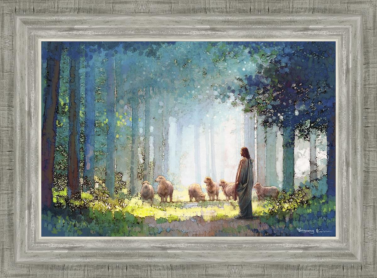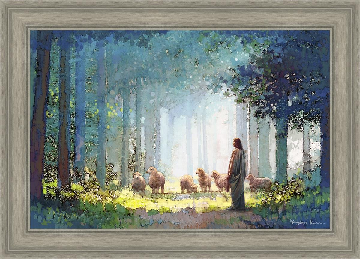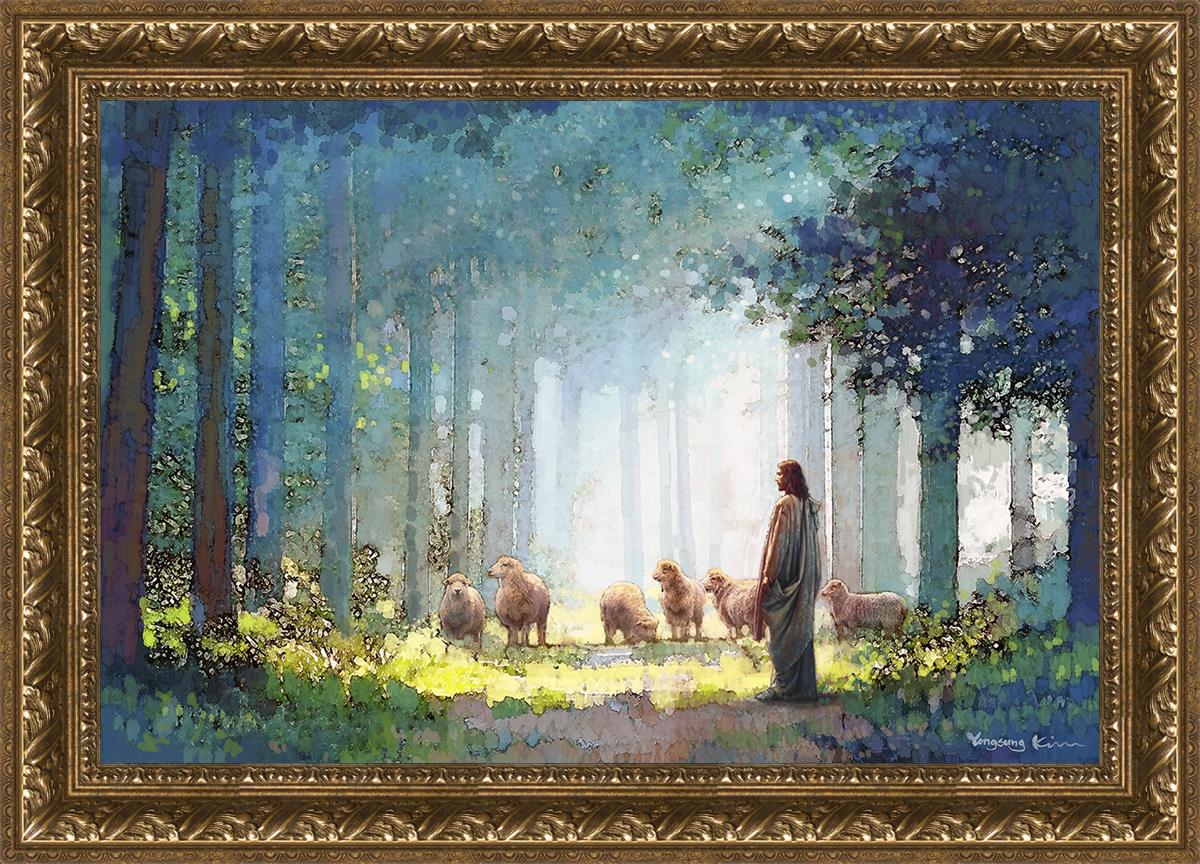 Painting of Keeping Watch by Yongsung Kim featuring Jesus Christ guiding His flock of sheep through a deep blue wilderness