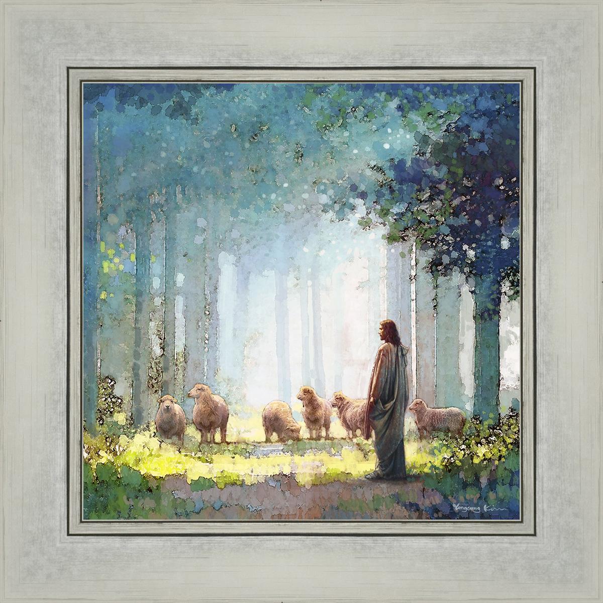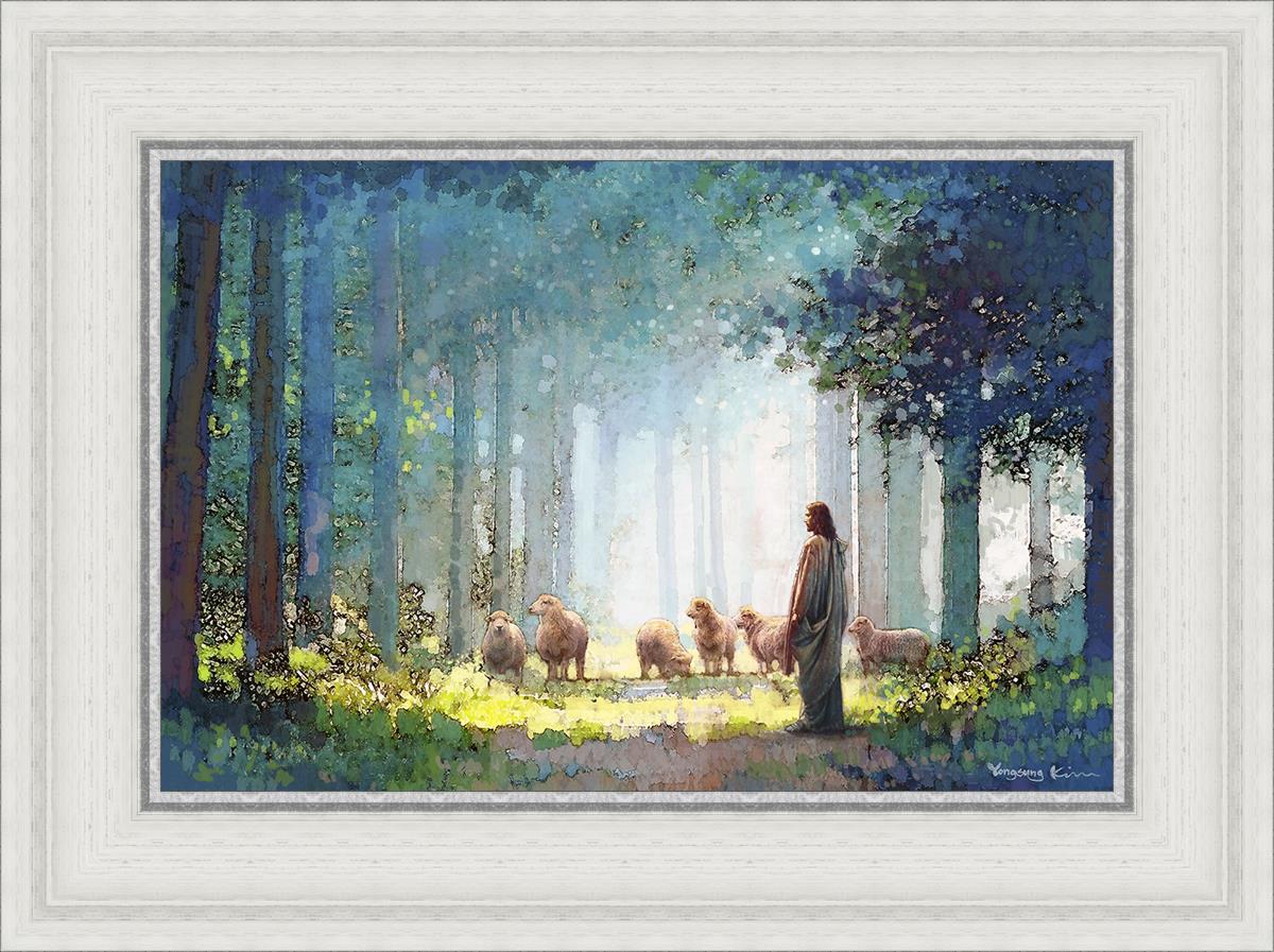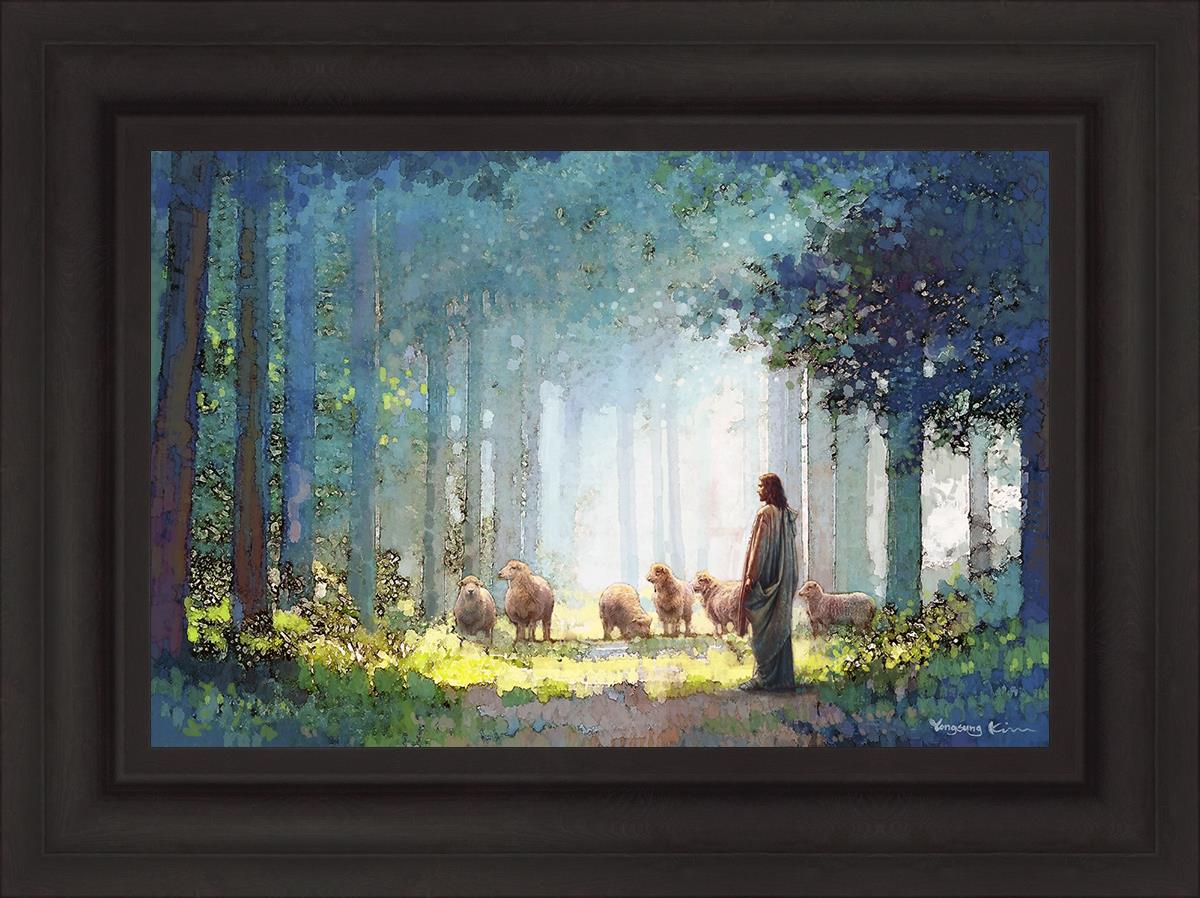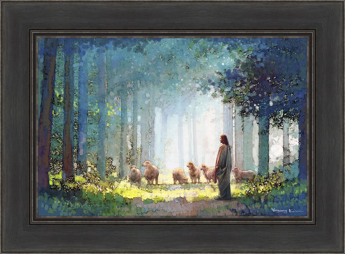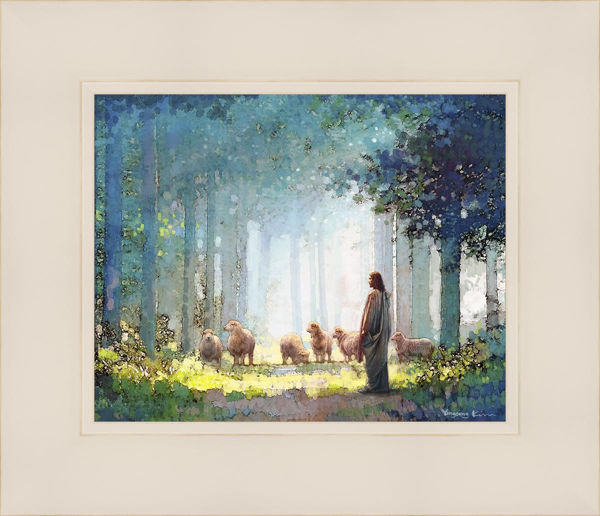 Painting of Keeping Watch by Yongsung Kim featuring Jesus Christ guiding His flock of sheep through a deep blue wilderness
