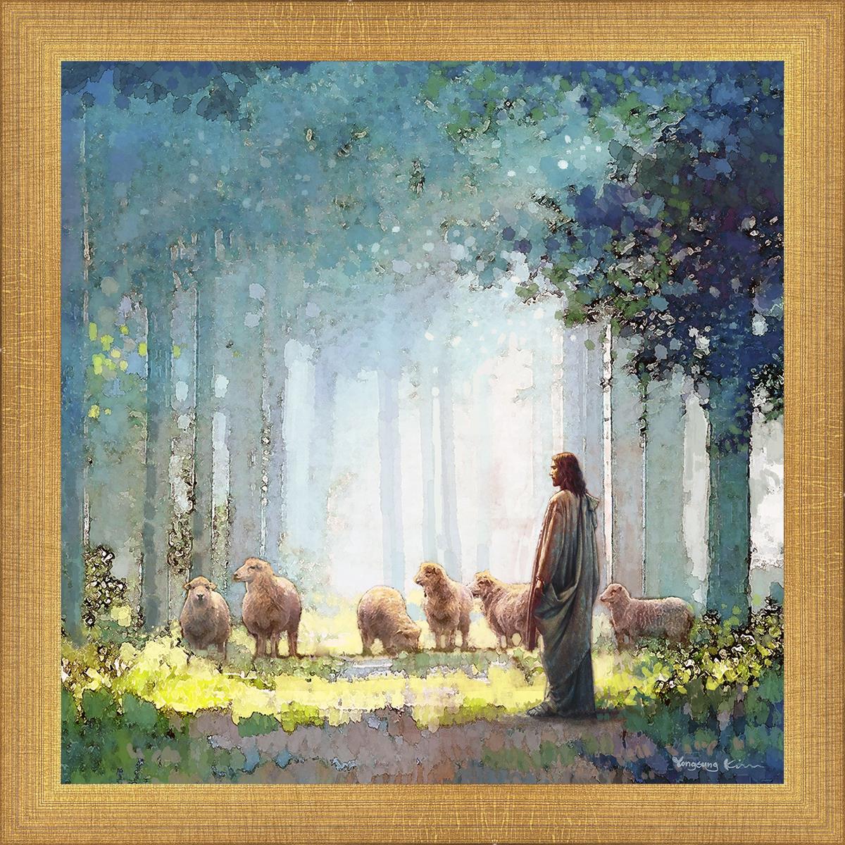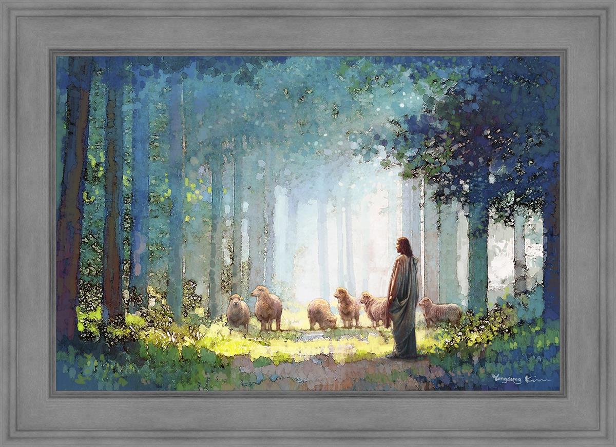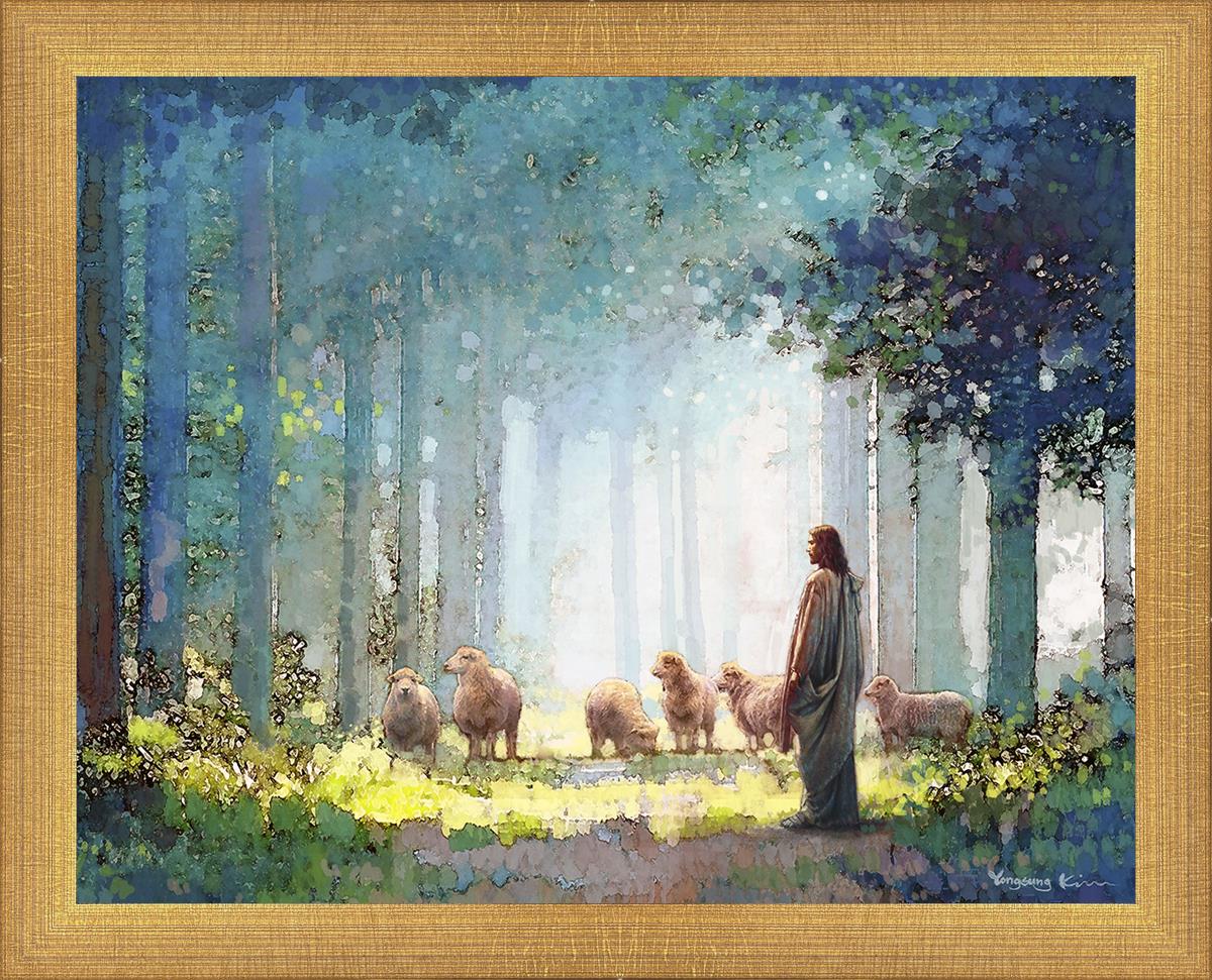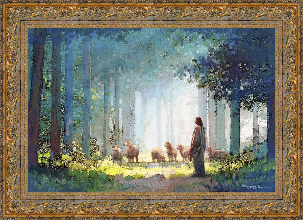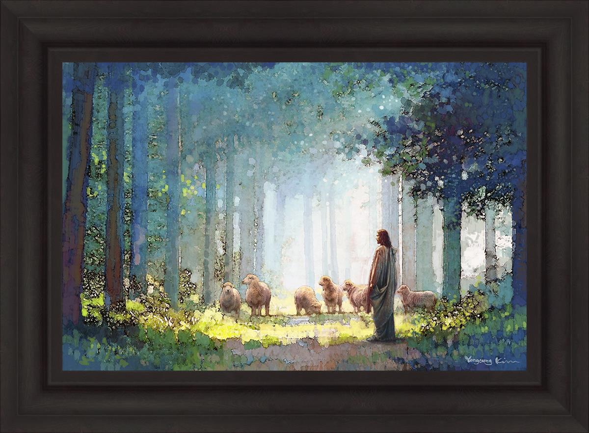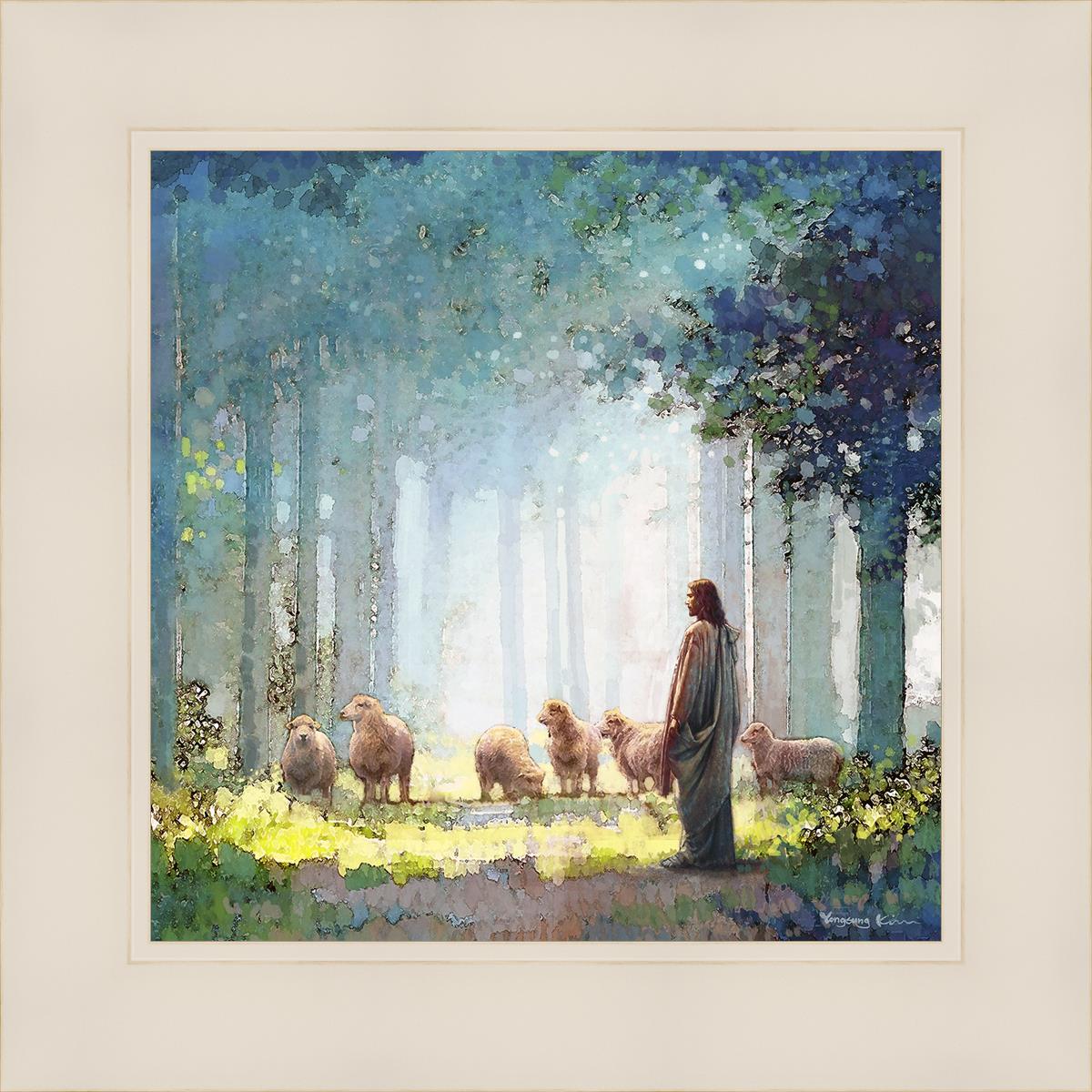 Painting of Keeping Watch by Yongsung Kim featuring Jesus Christ guiding His flock of sheep through a deep blue wilderness